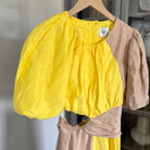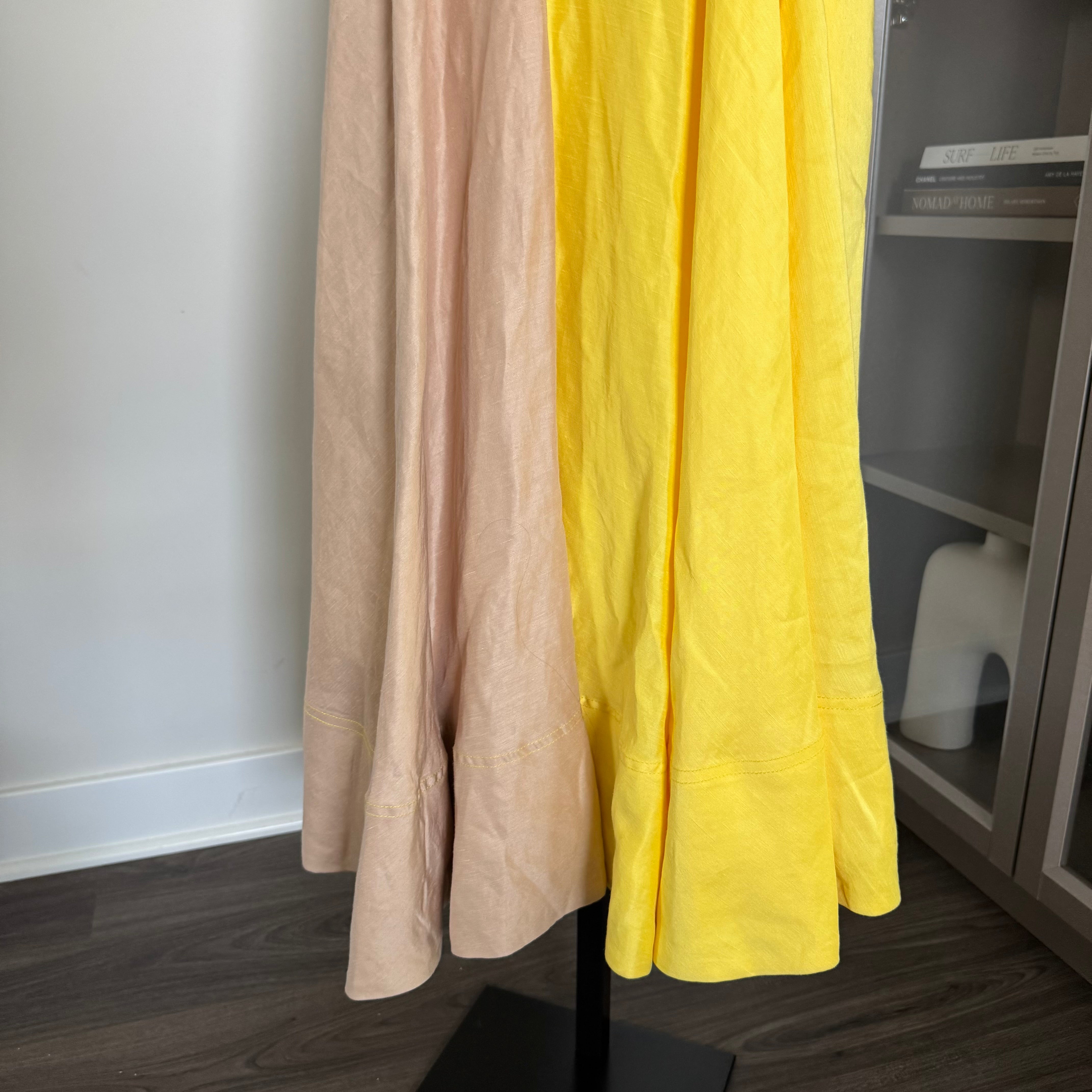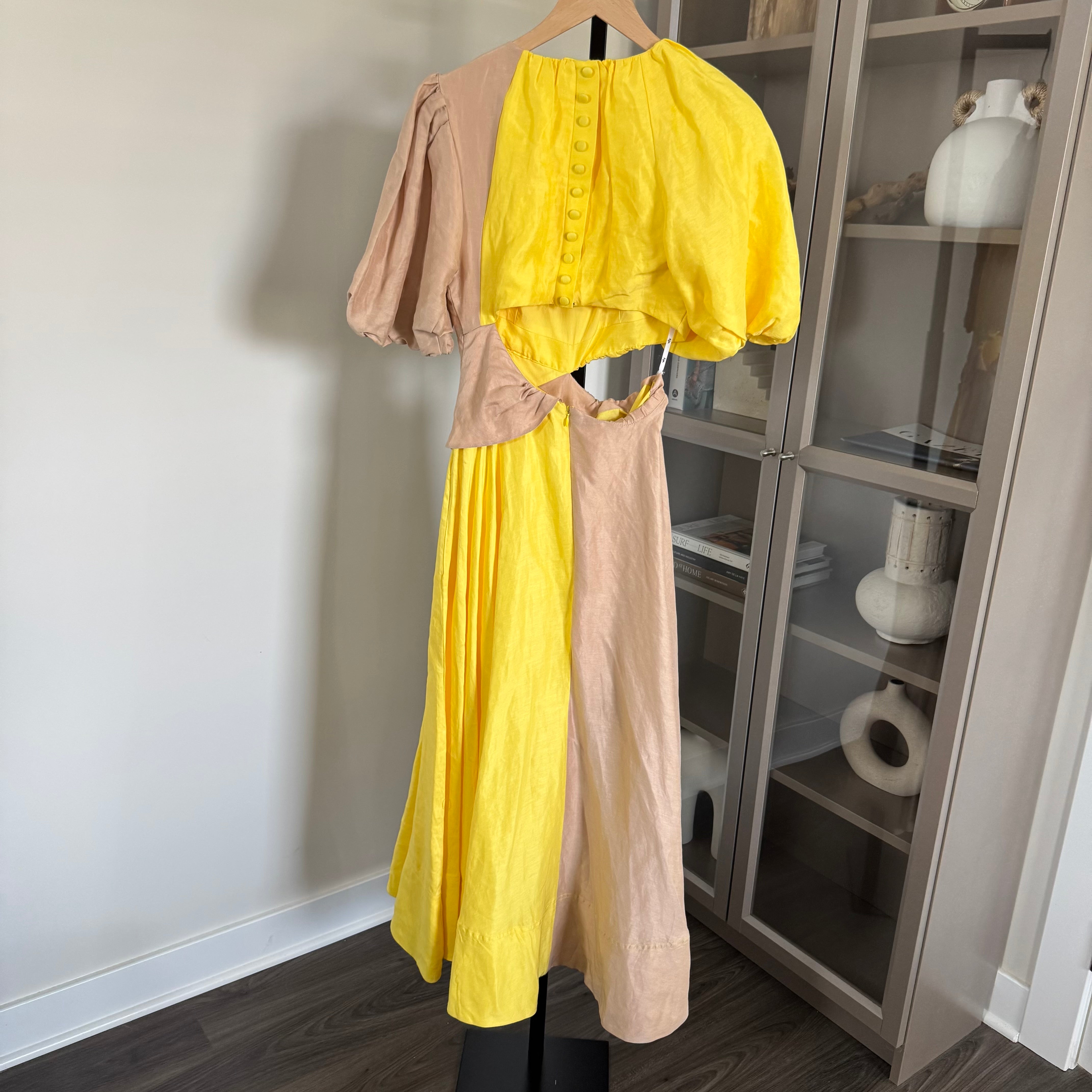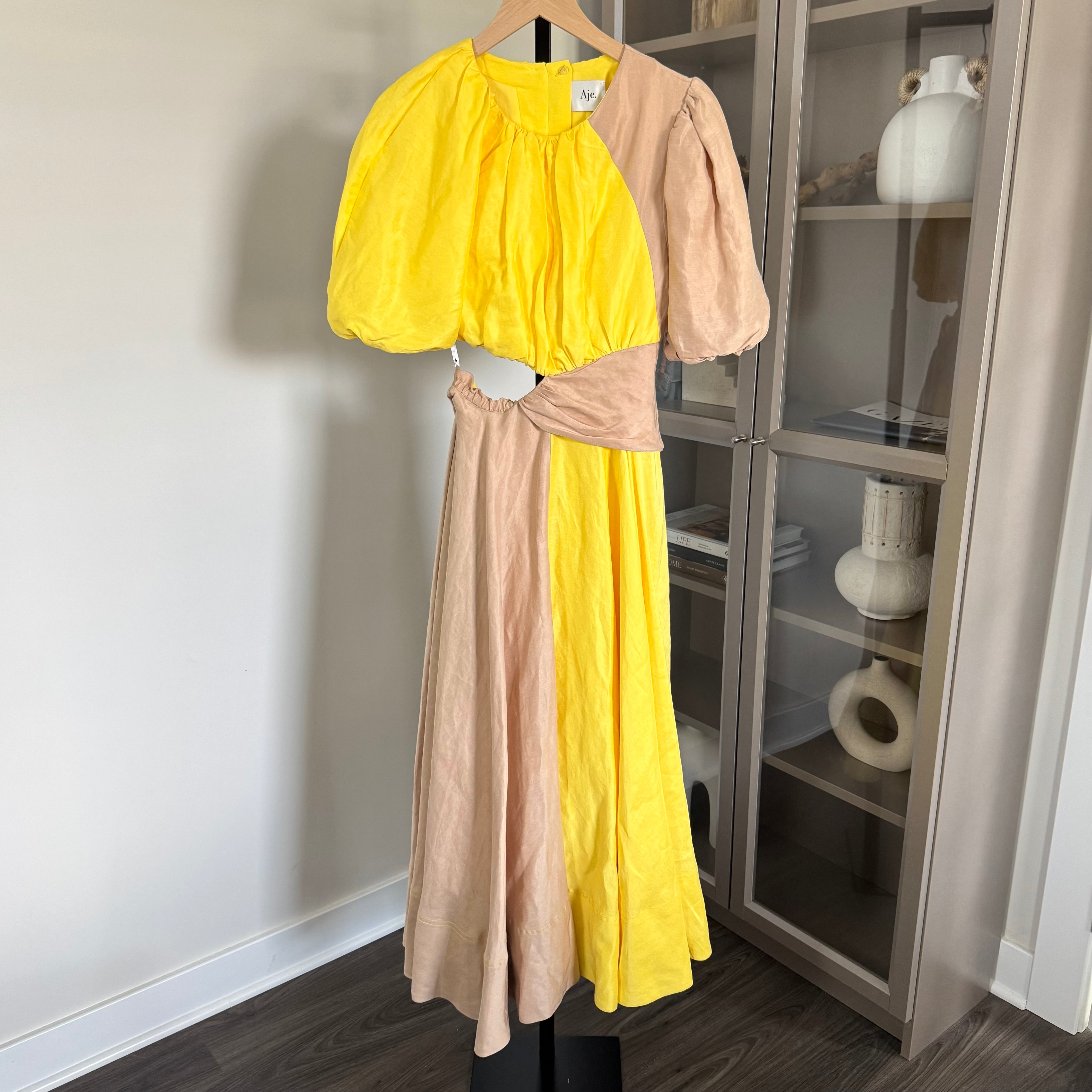 Aje Caliente Two Tone Daisy Yellow Bleach Coast Beige Puff Sleeve Midi Dress