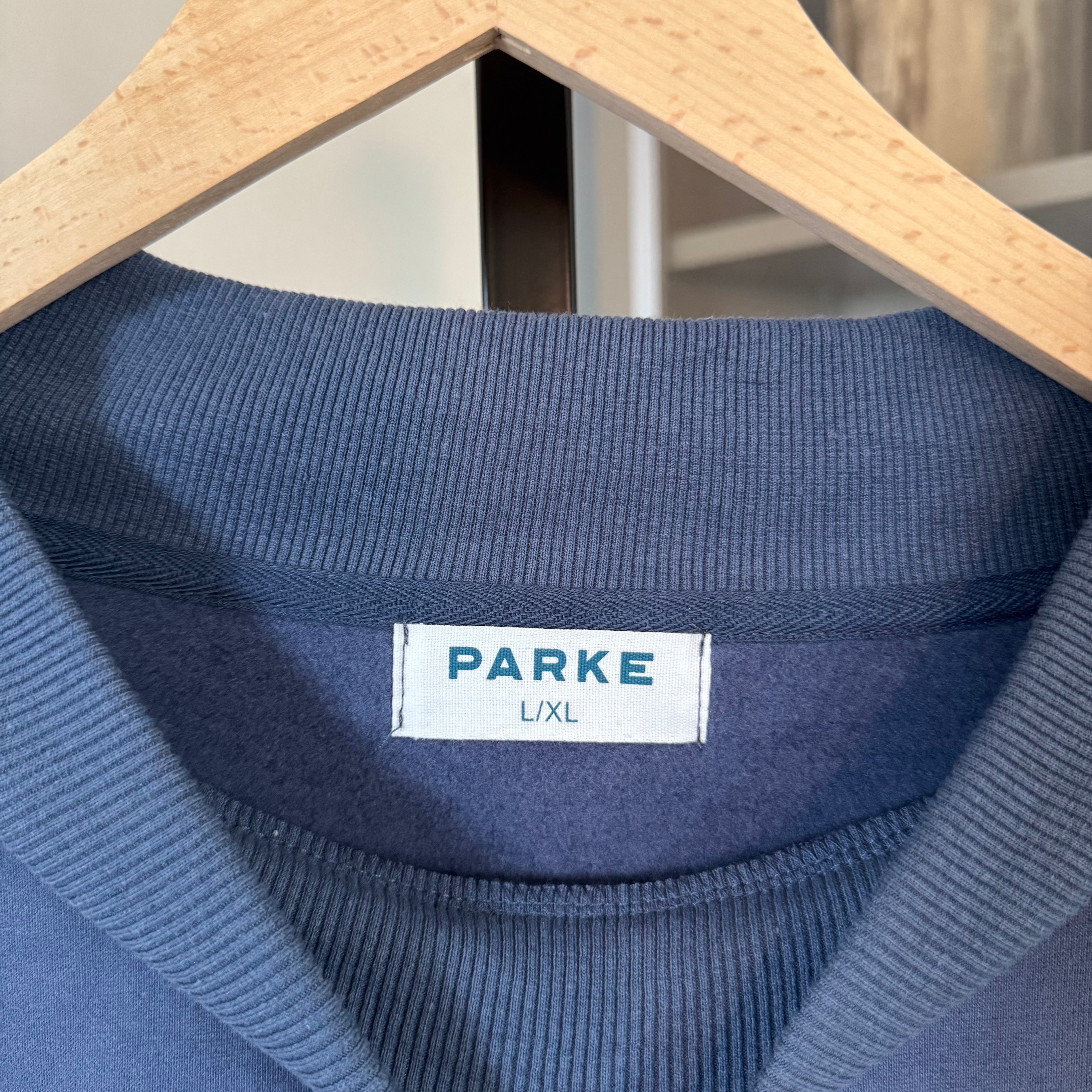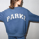 Parke Varsity Mock Neck Blue White Logo Patch Sweatshirt