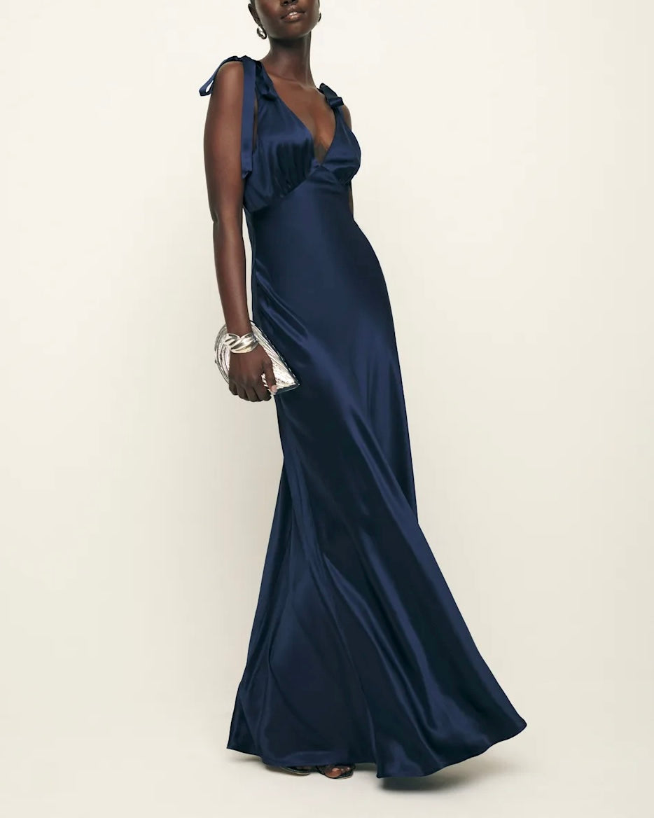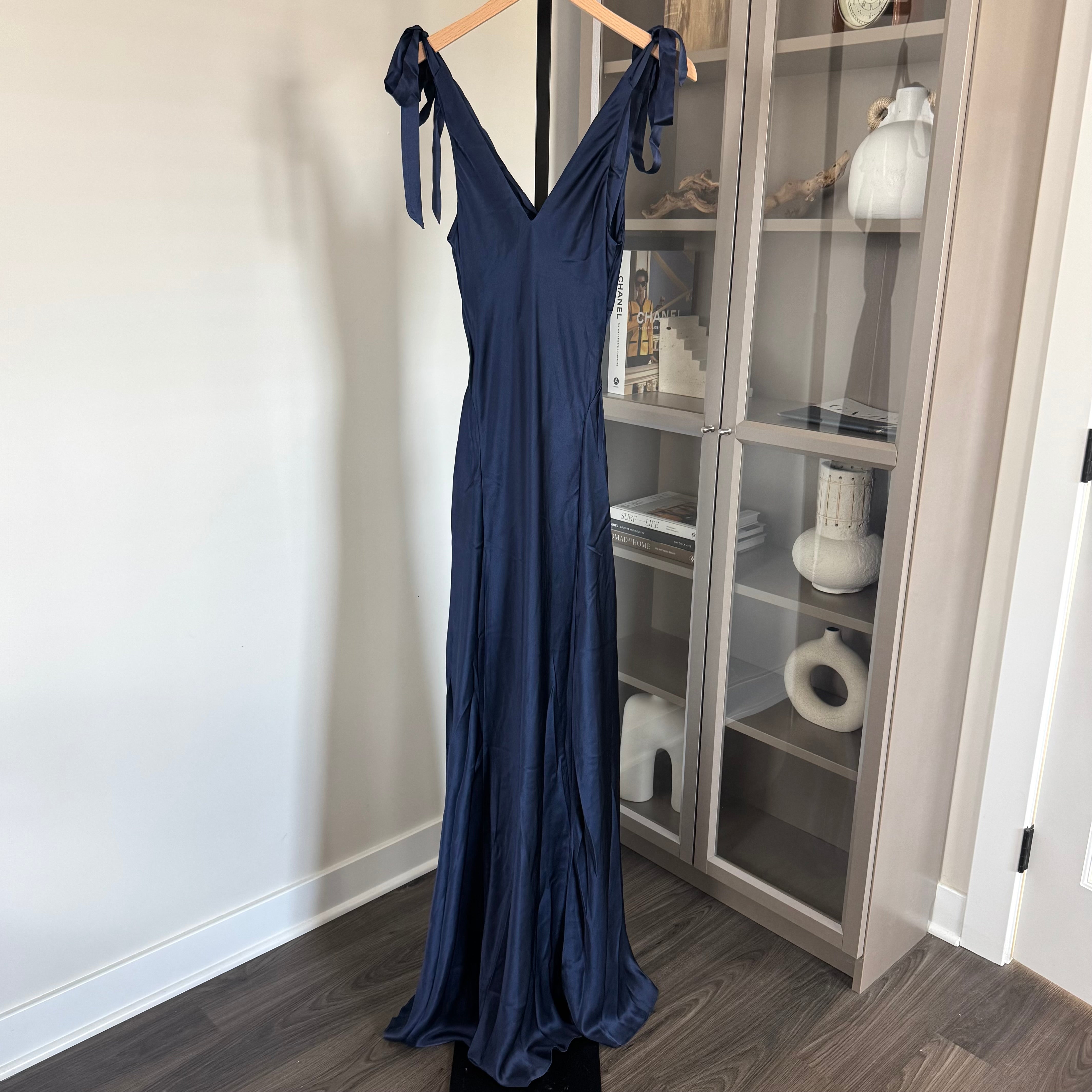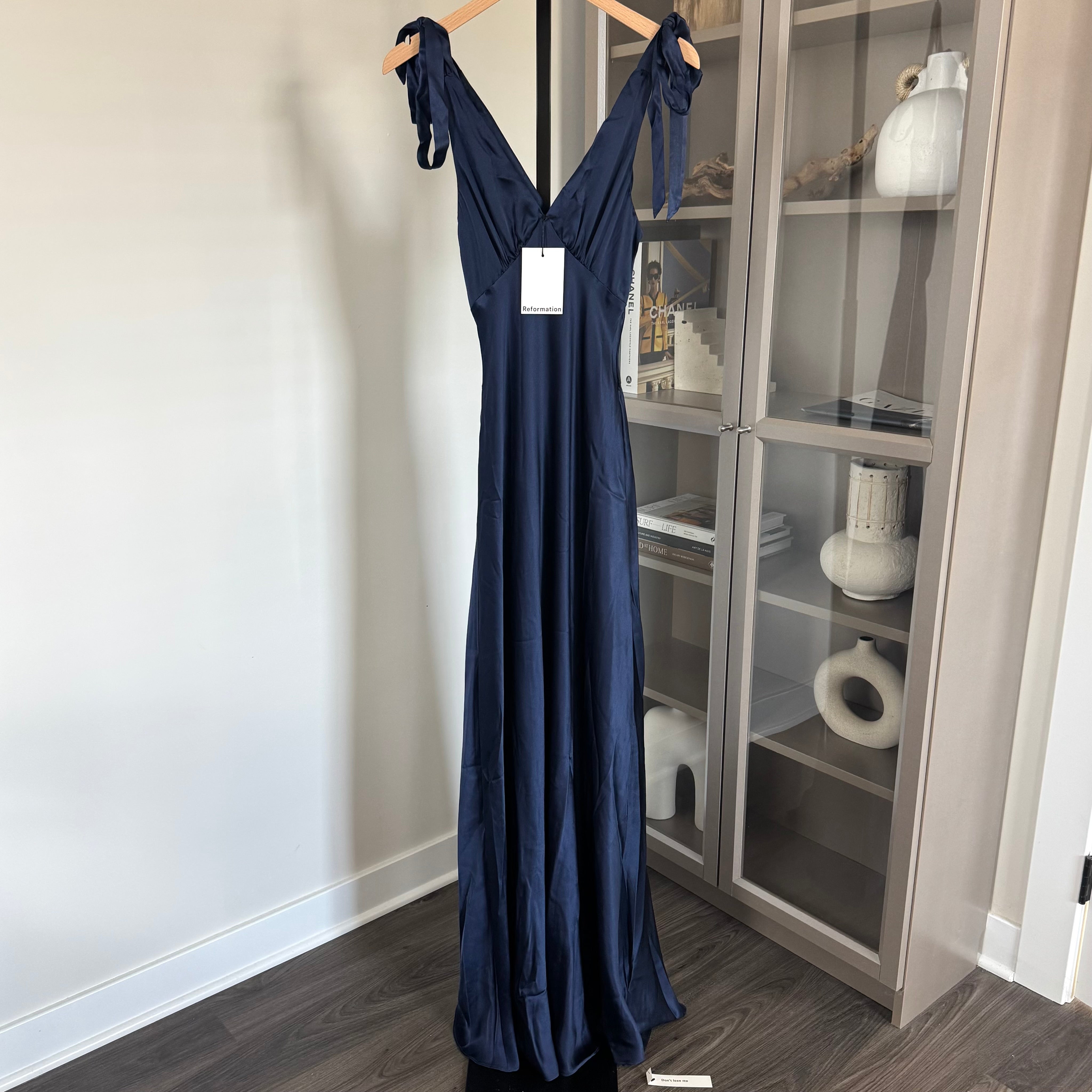 Reformation Pernille Silk Navy Blue Sleeveless V-Cut Shoulder Tie Maxi Dress