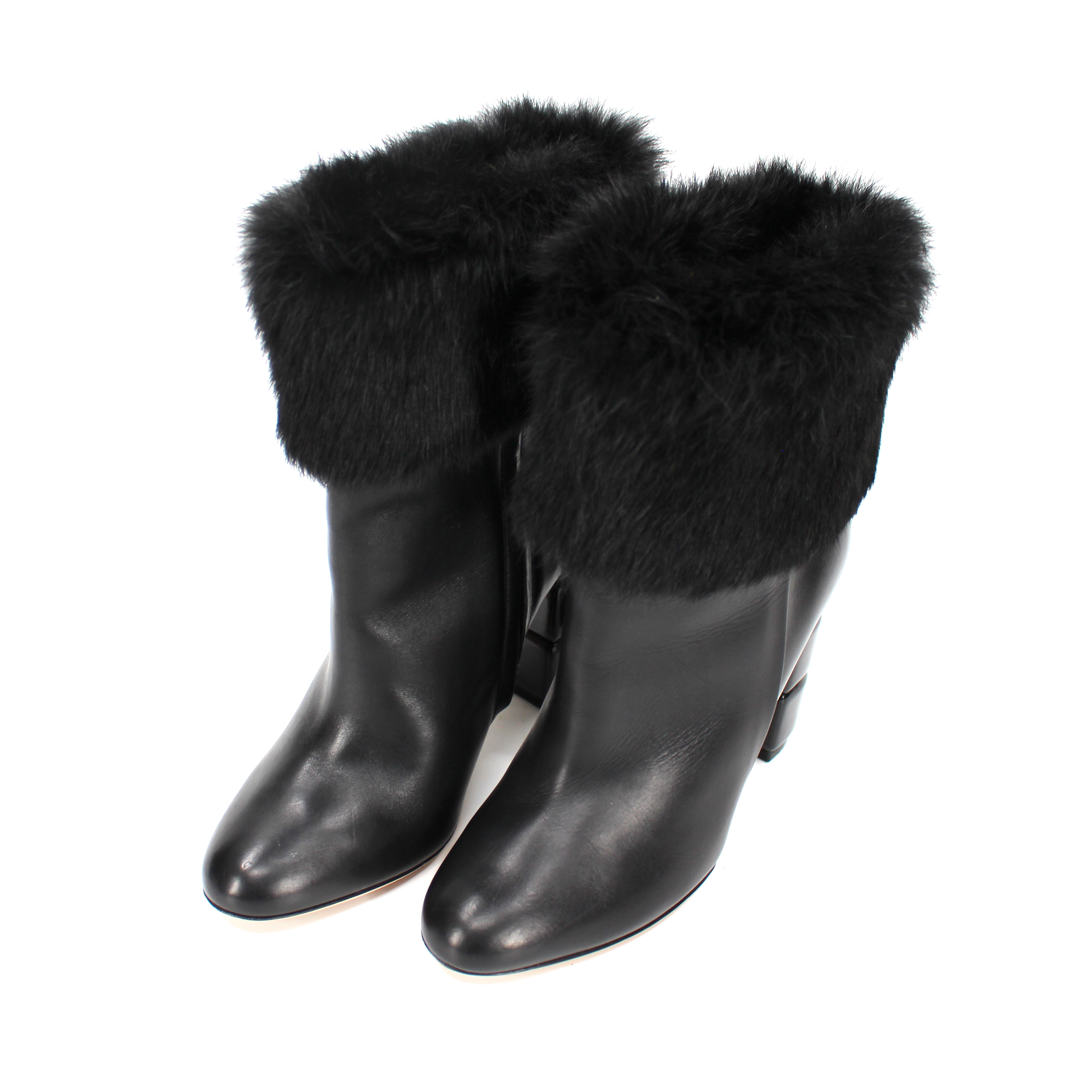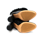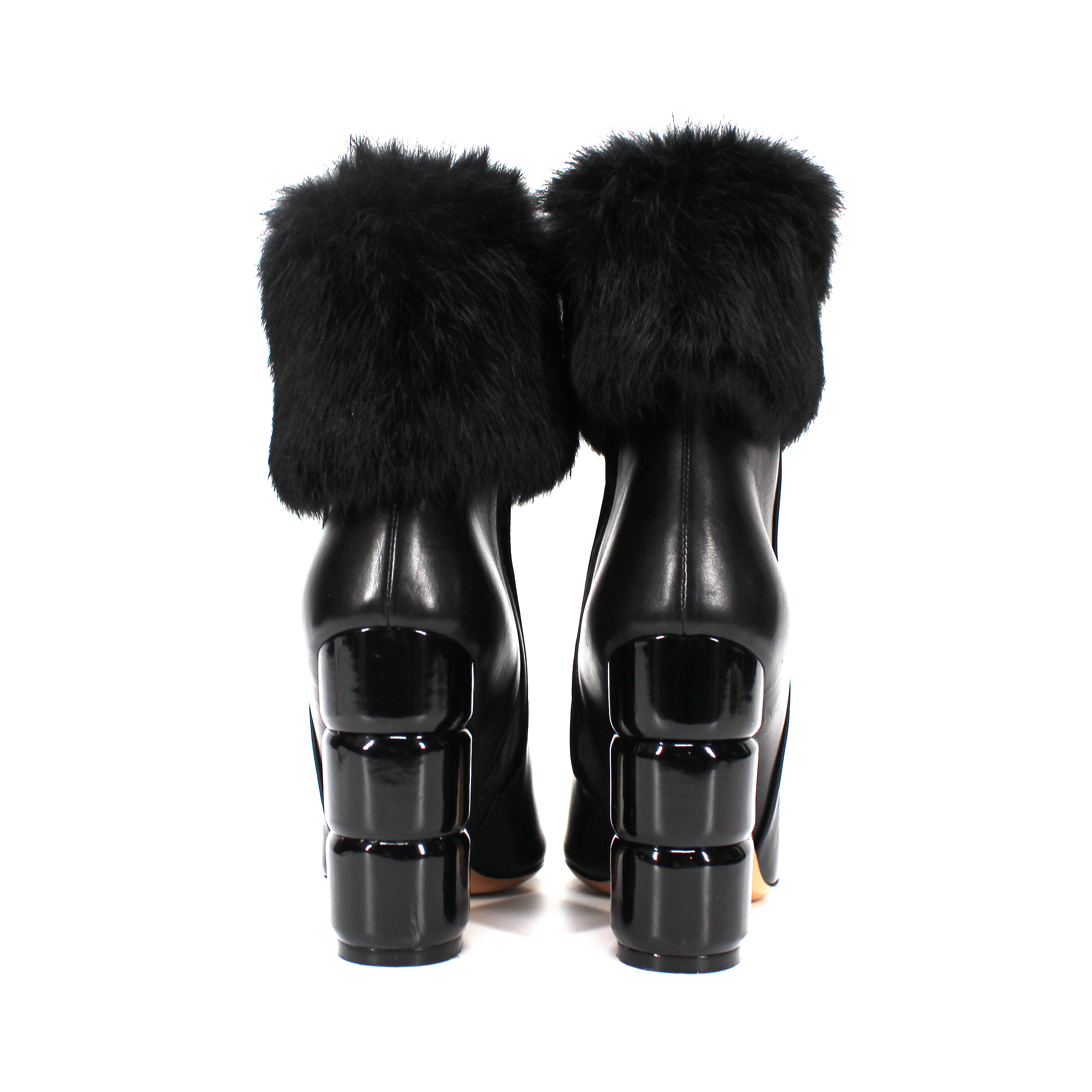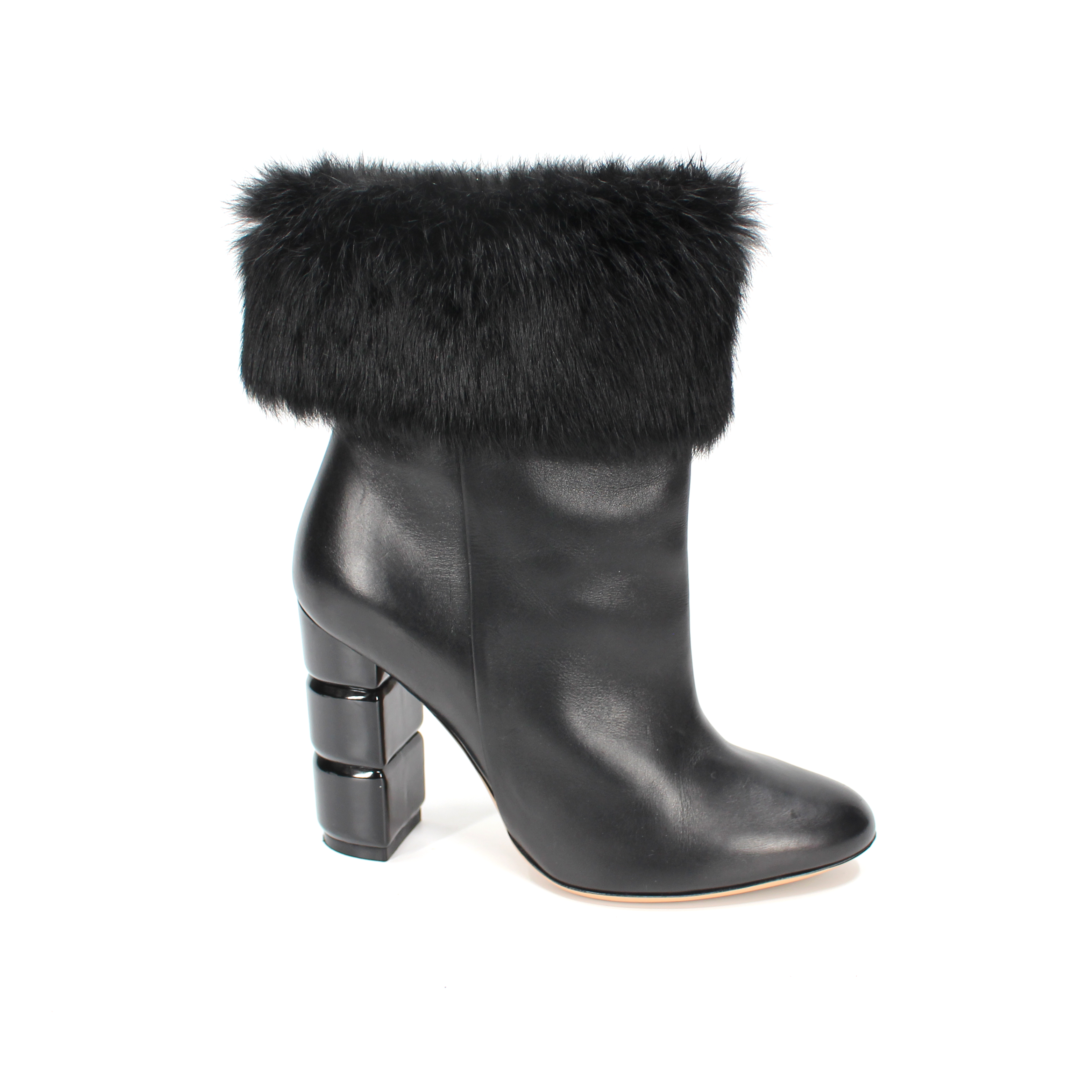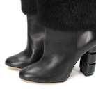 Salvatore Ferragamo Loris Black Leather Rabbit Fur Trim Heeled Ankle Bootie