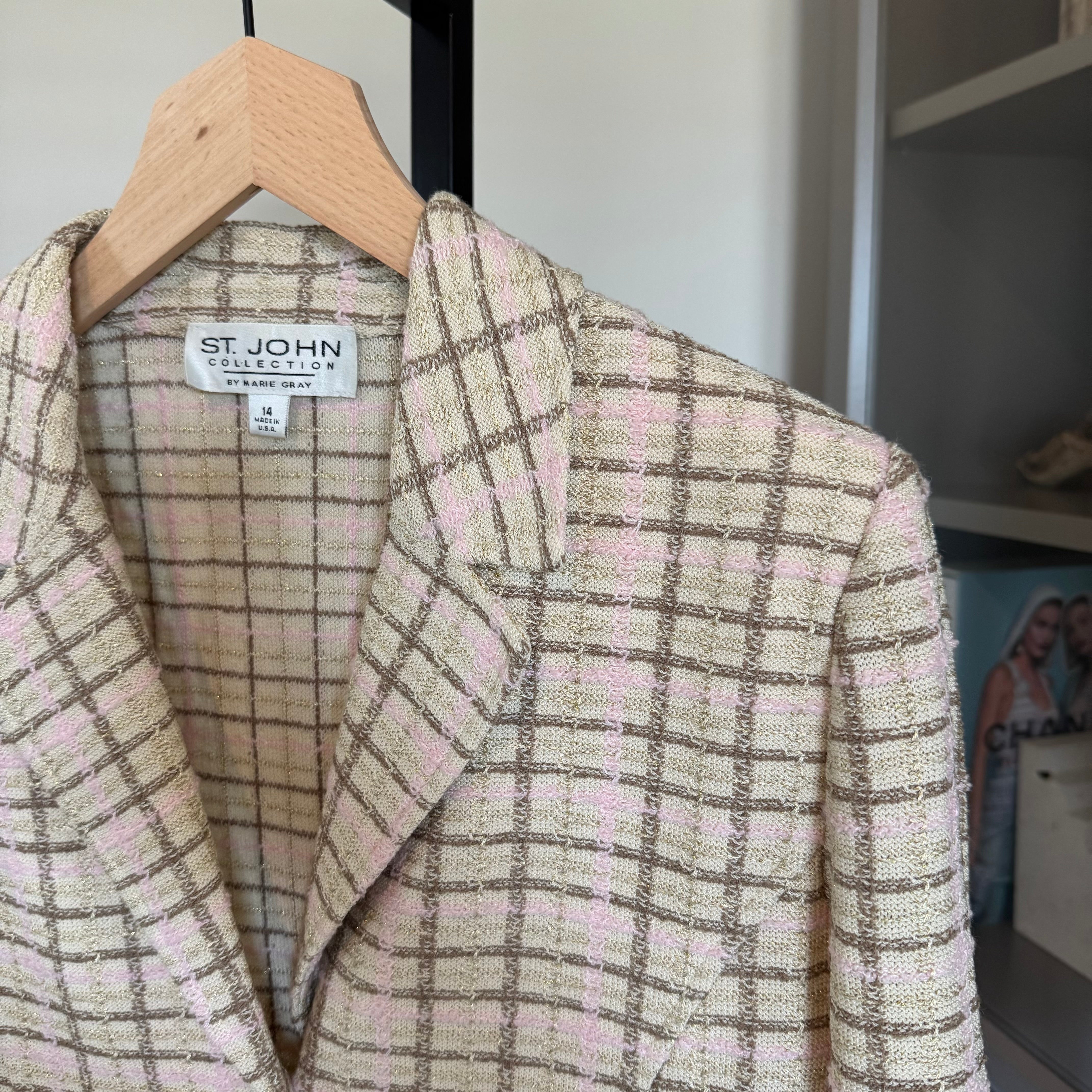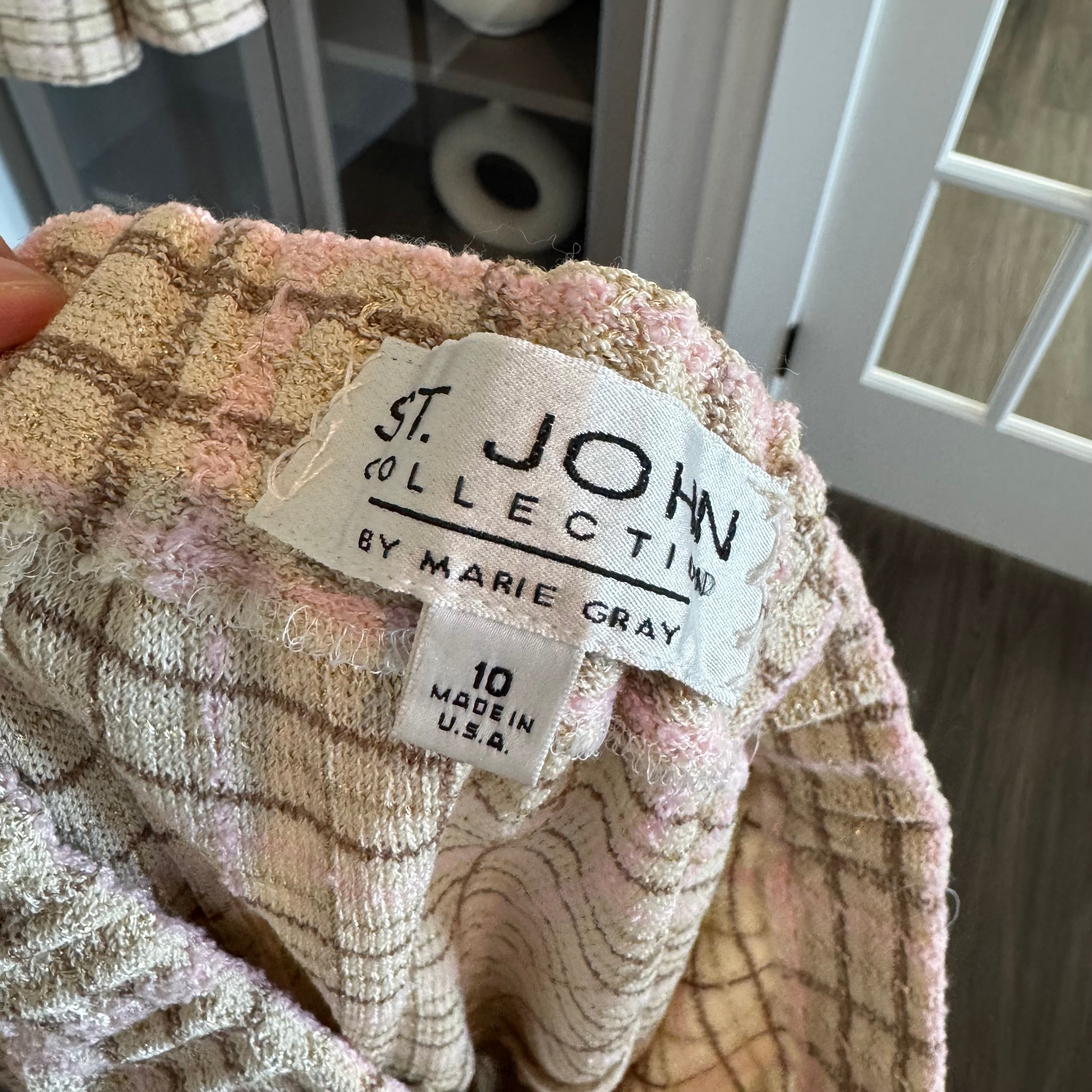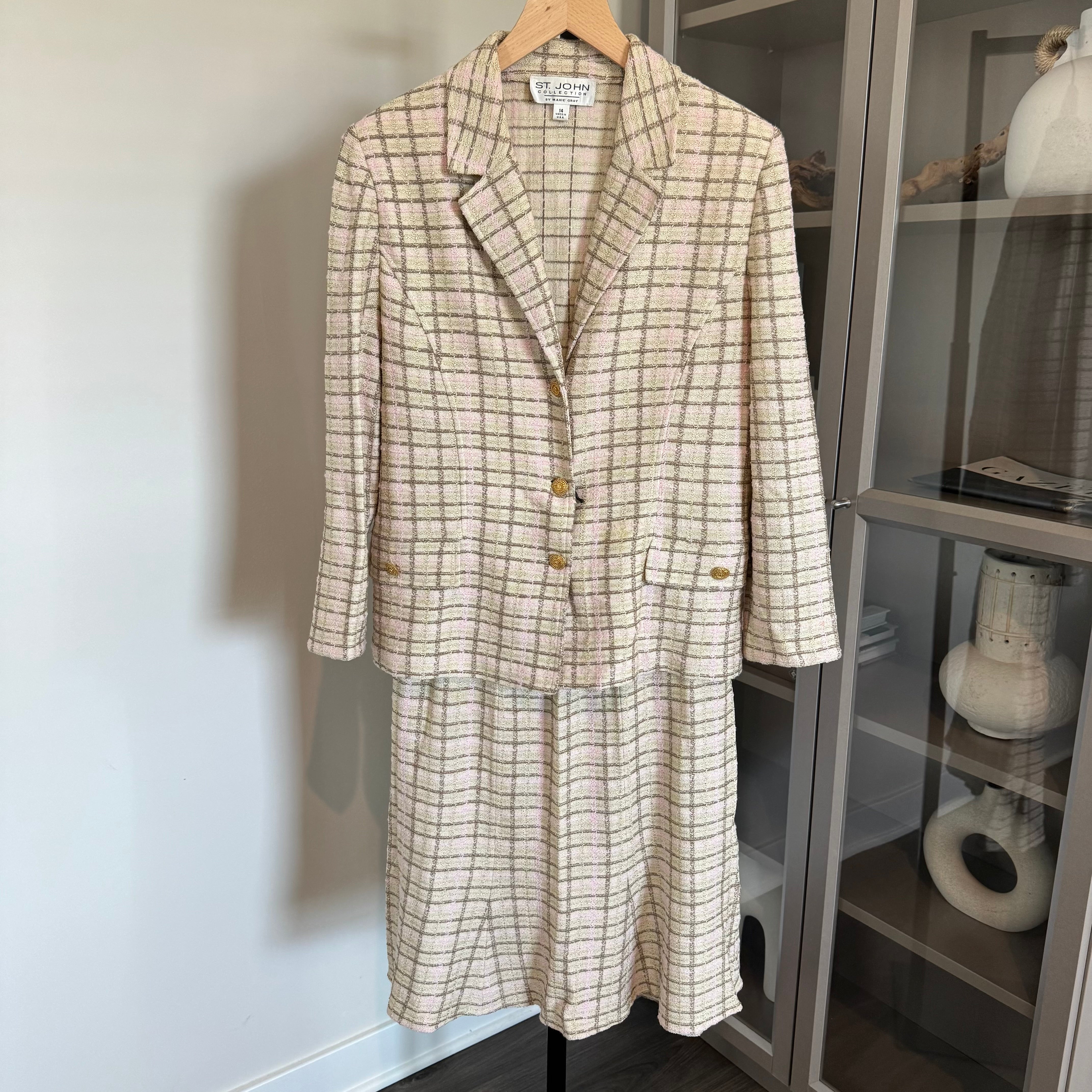 St. John Collection Beige Pink Plaid Metallic Blazer Trumpet Hem Skirt Outfit