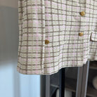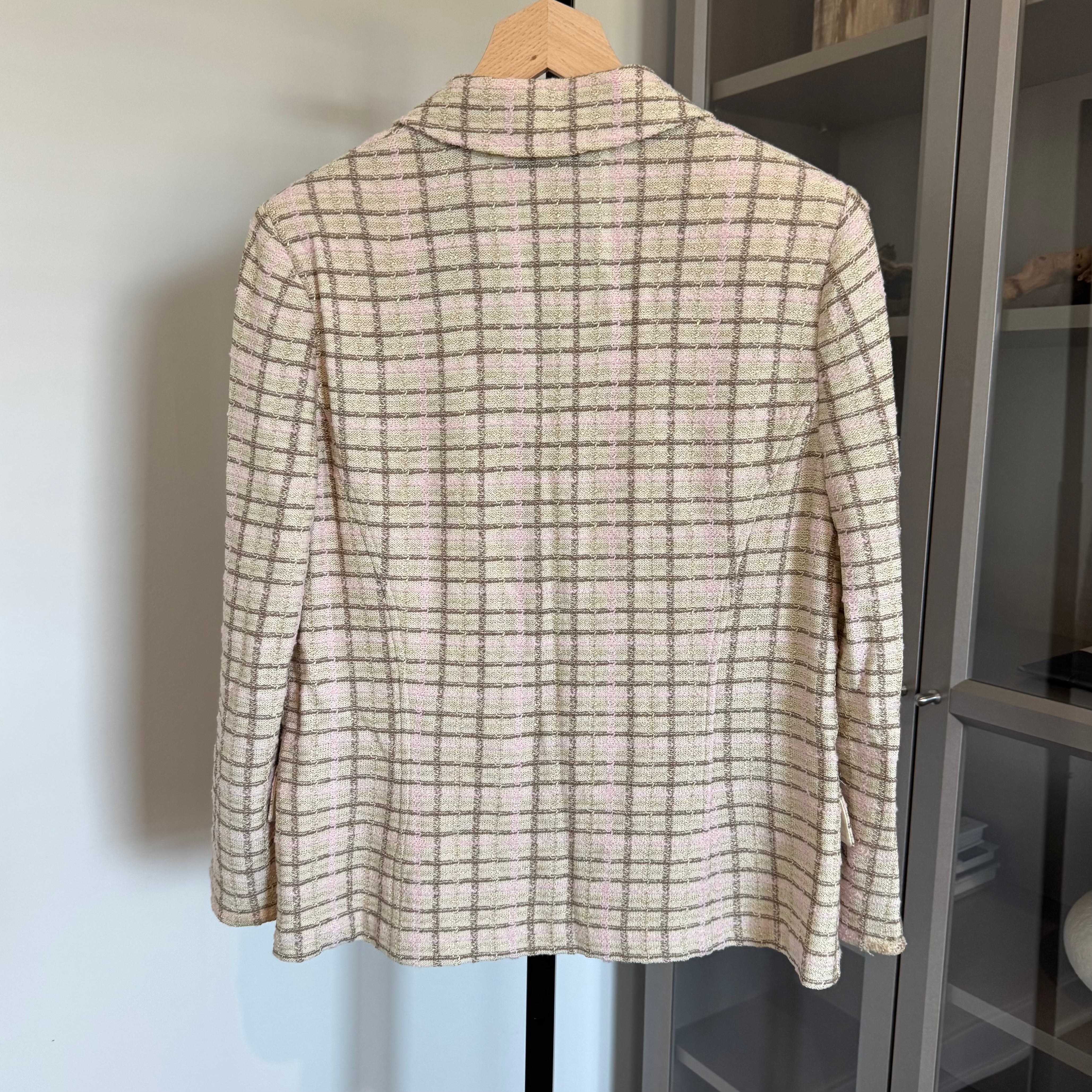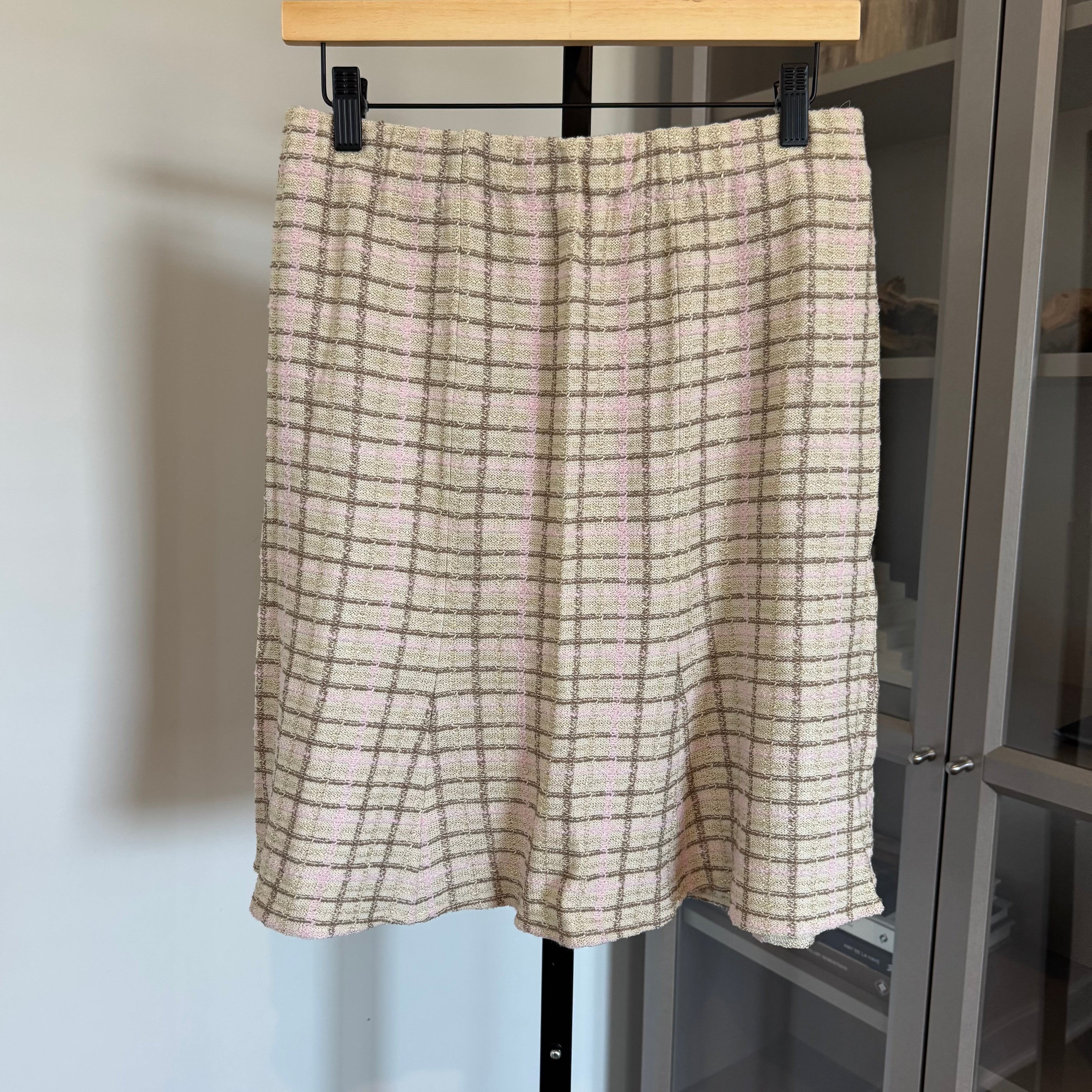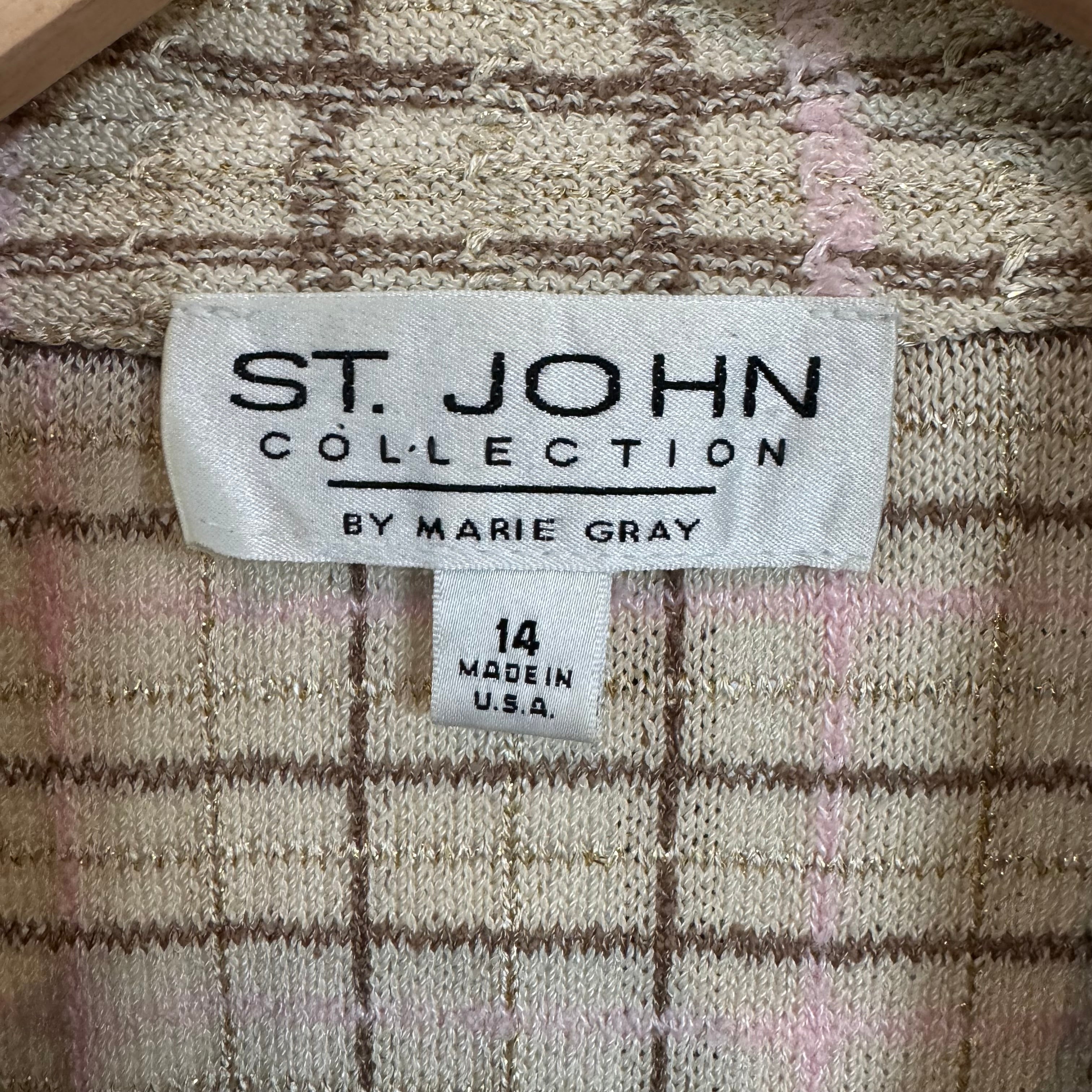 St. John Collection Beige Pink Plaid Metallic Blazer Trumpet Hem Skirt Outfit