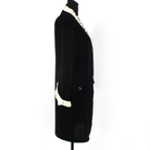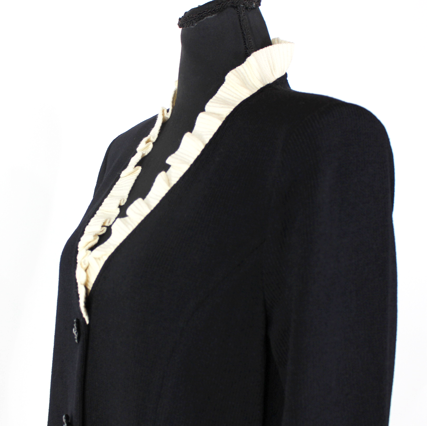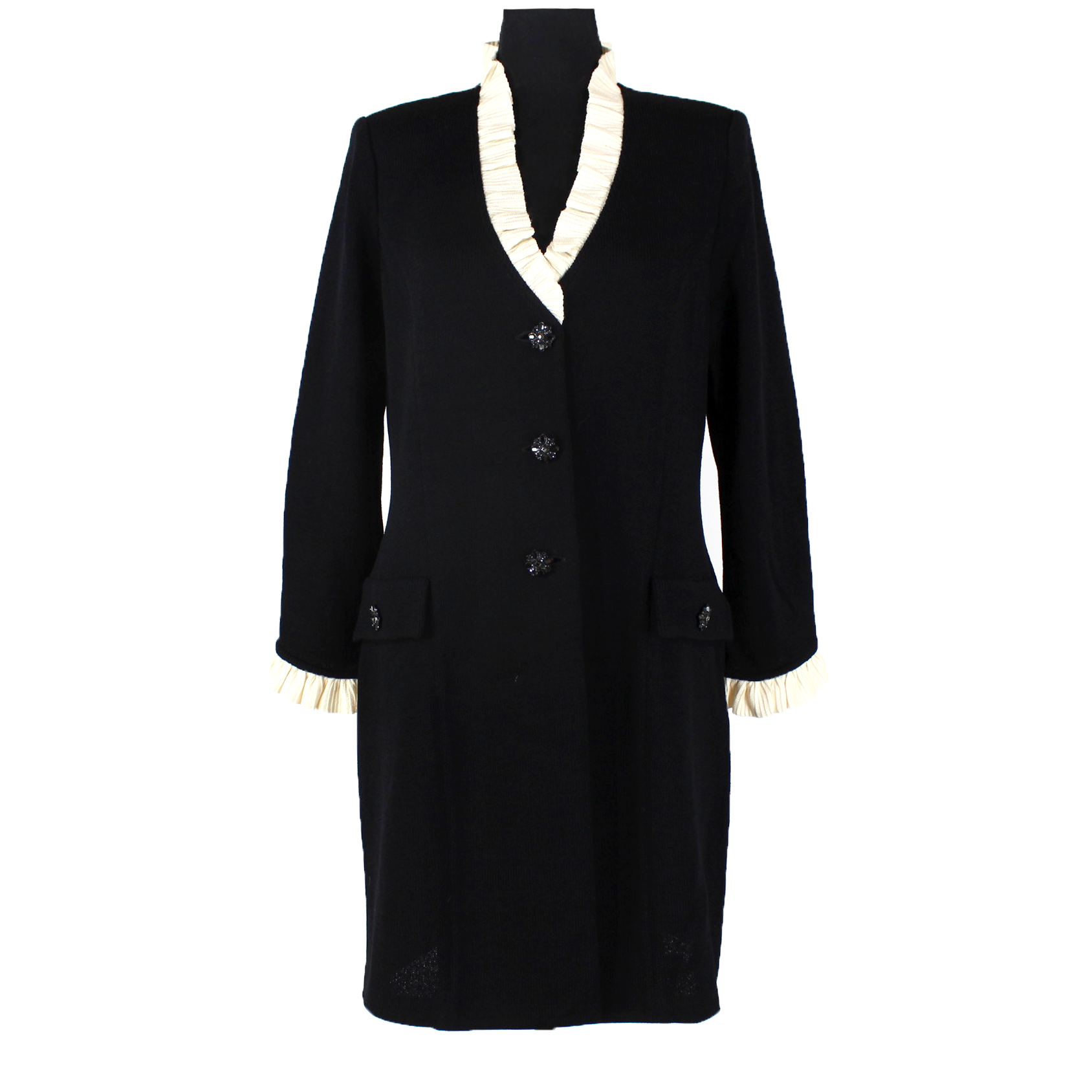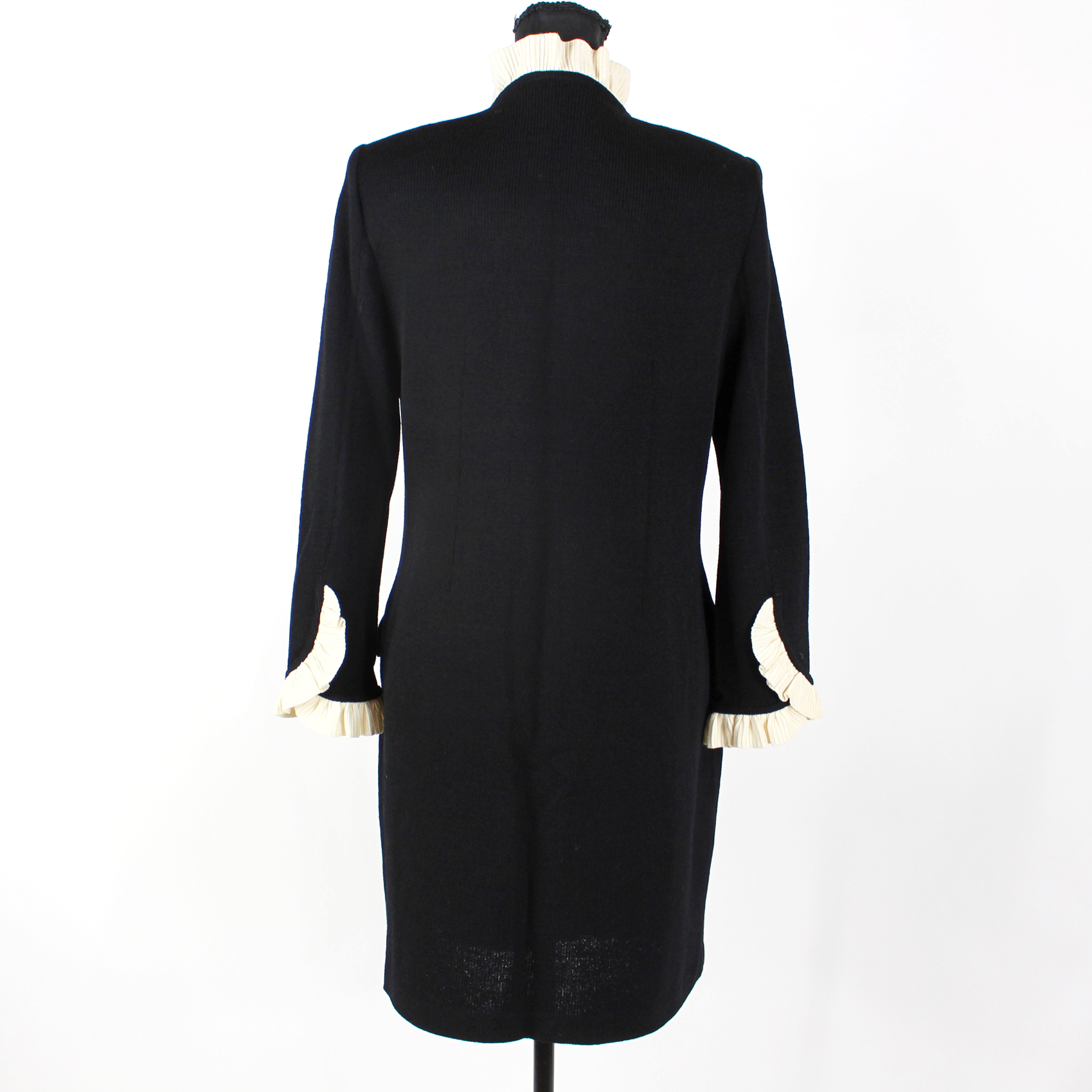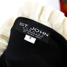 St. John Black Santana Knit Ivory Ruffle Trim Rhinestone Button Dress