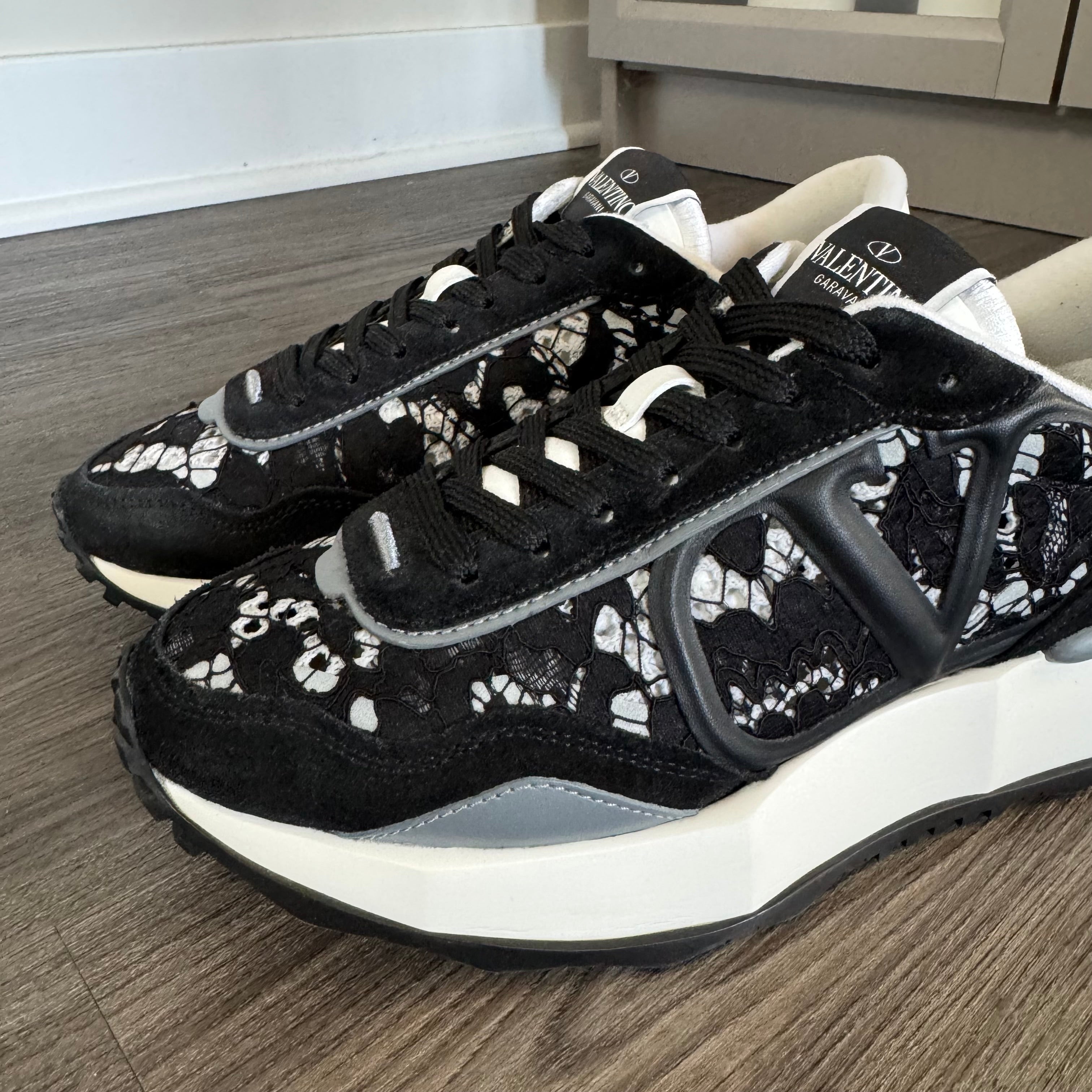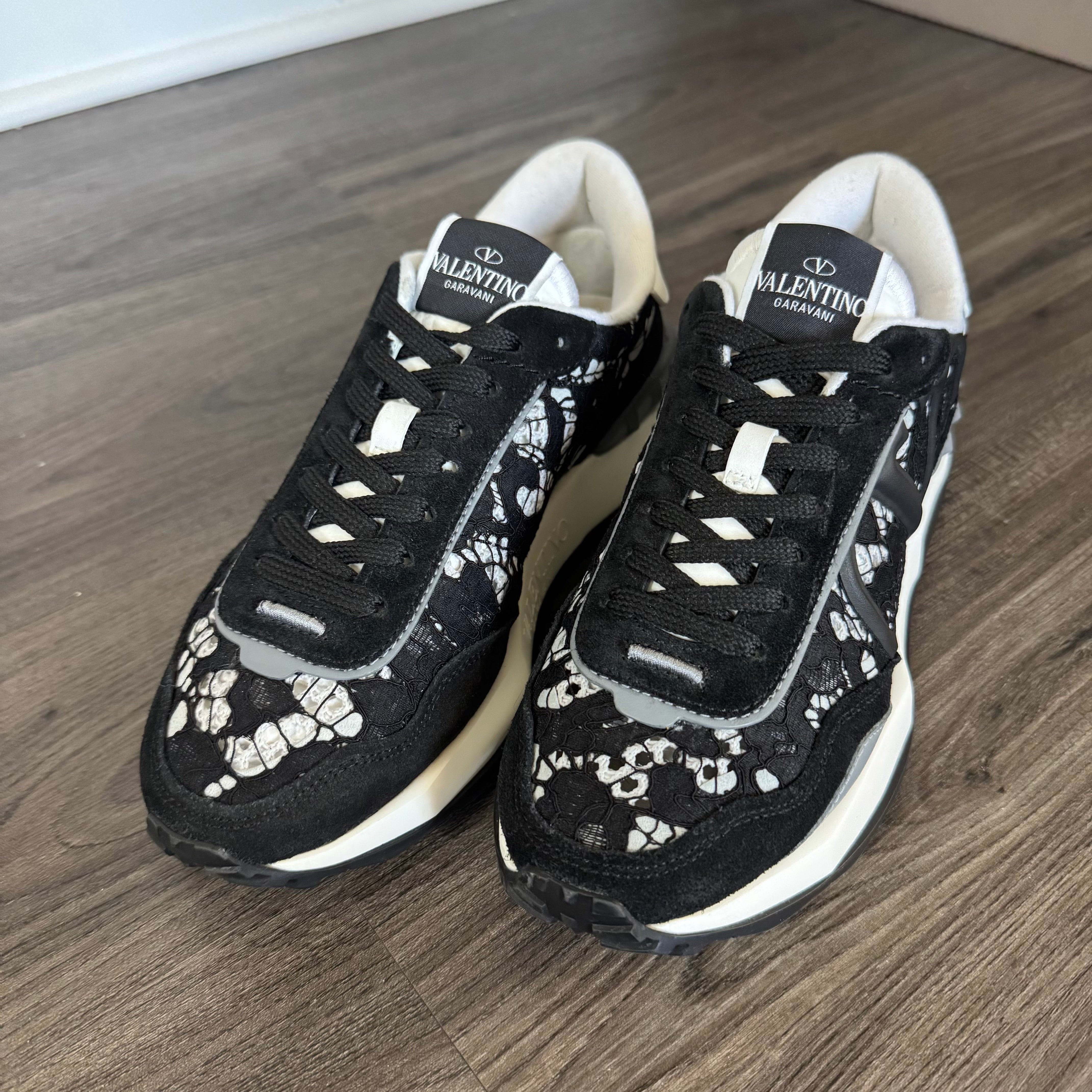 Valentino Garavani Lacerunner Black White Lace Suede Low Top Sneakers