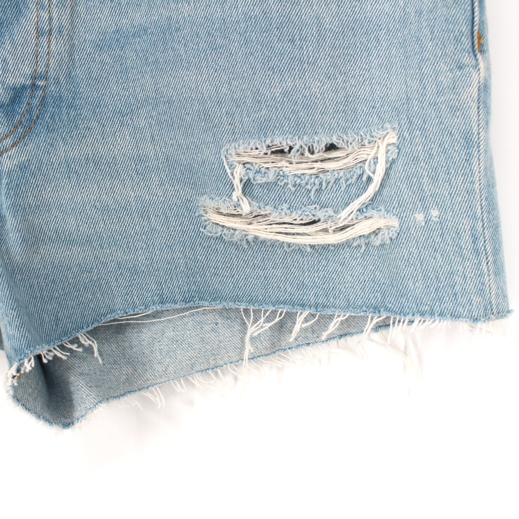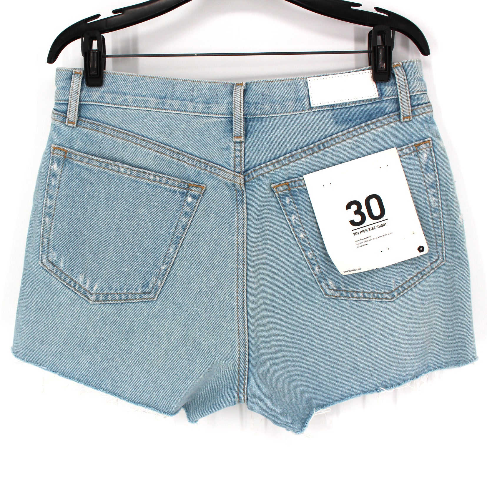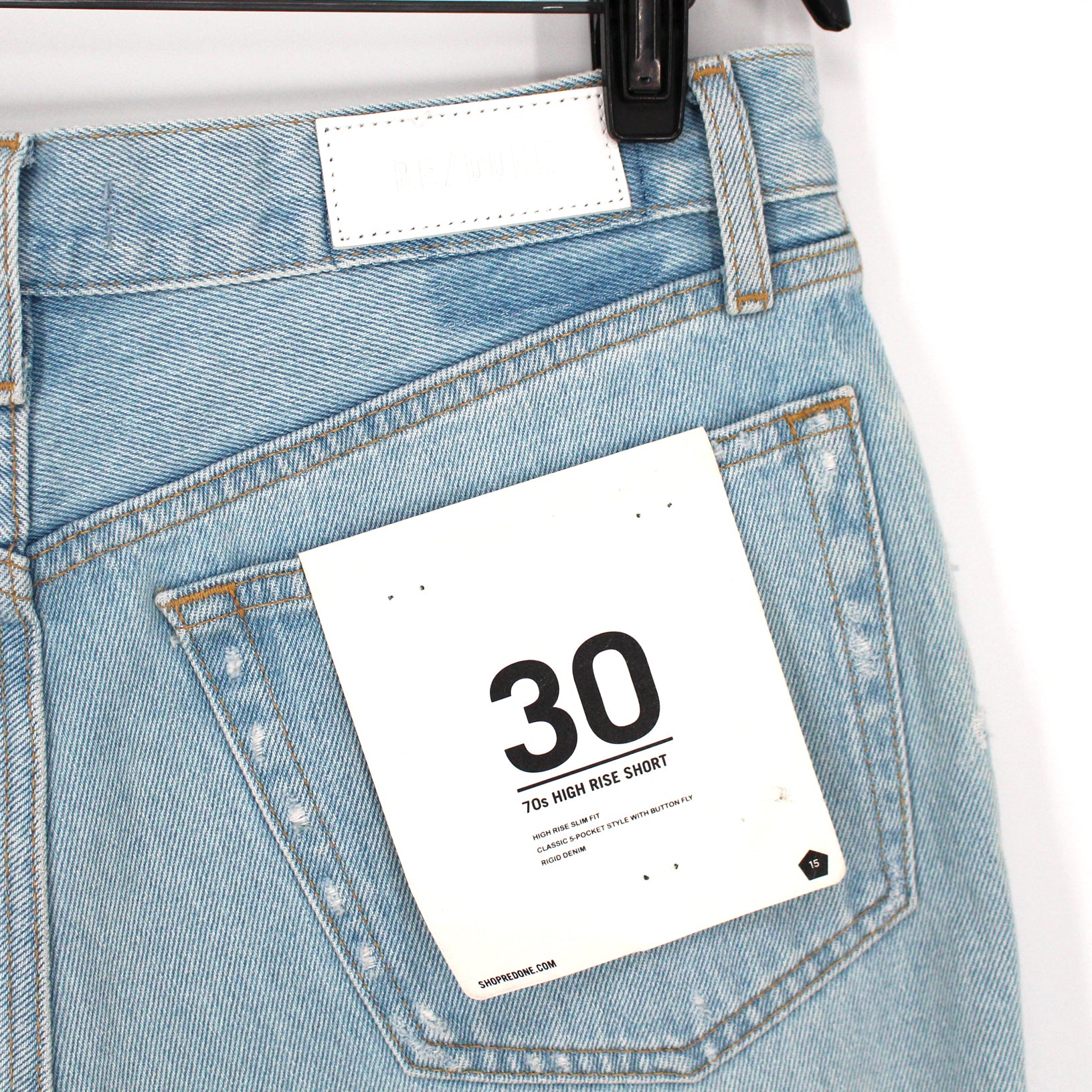 Re/Done 70s High Rise Sim Distressed Rigid Light Denim Shorts.