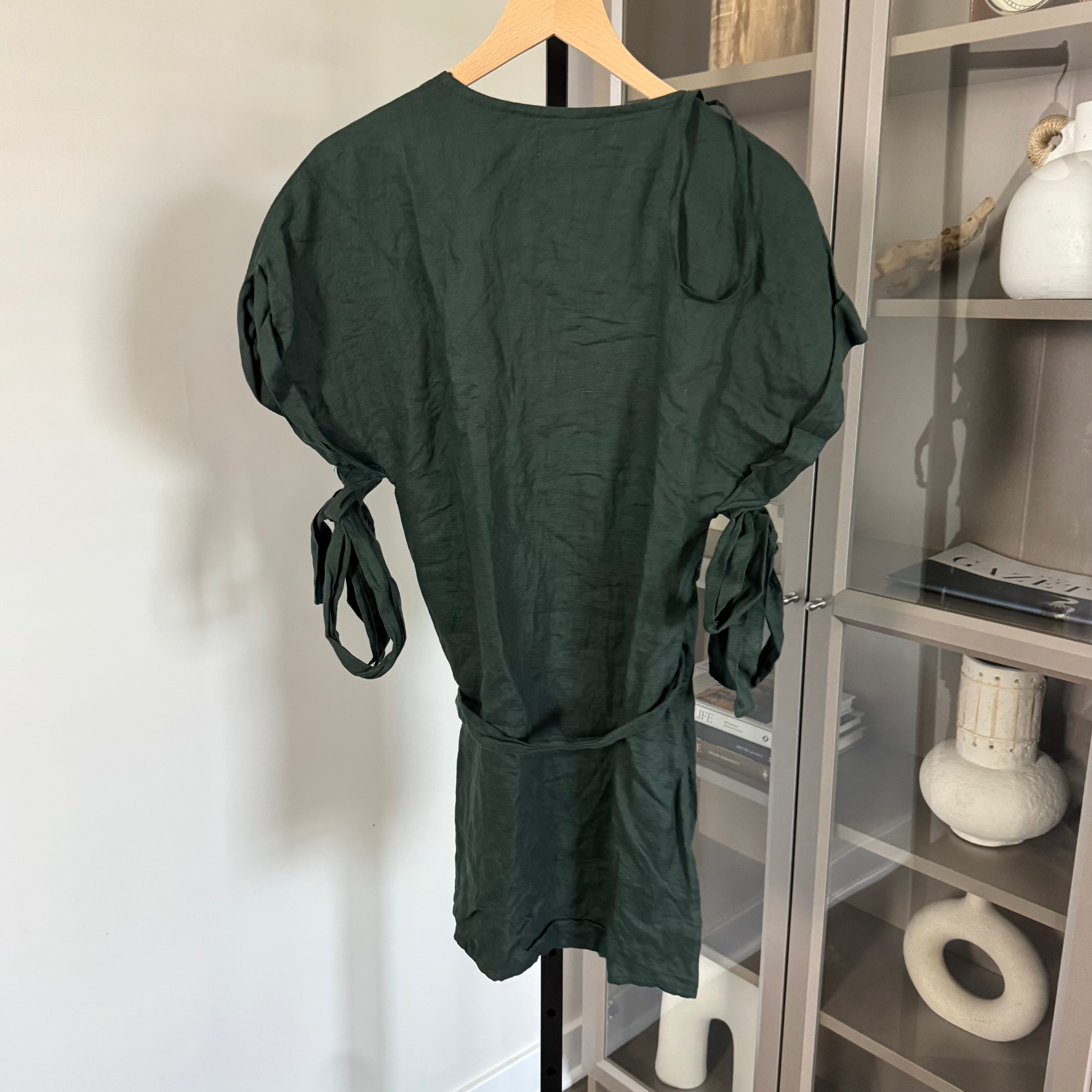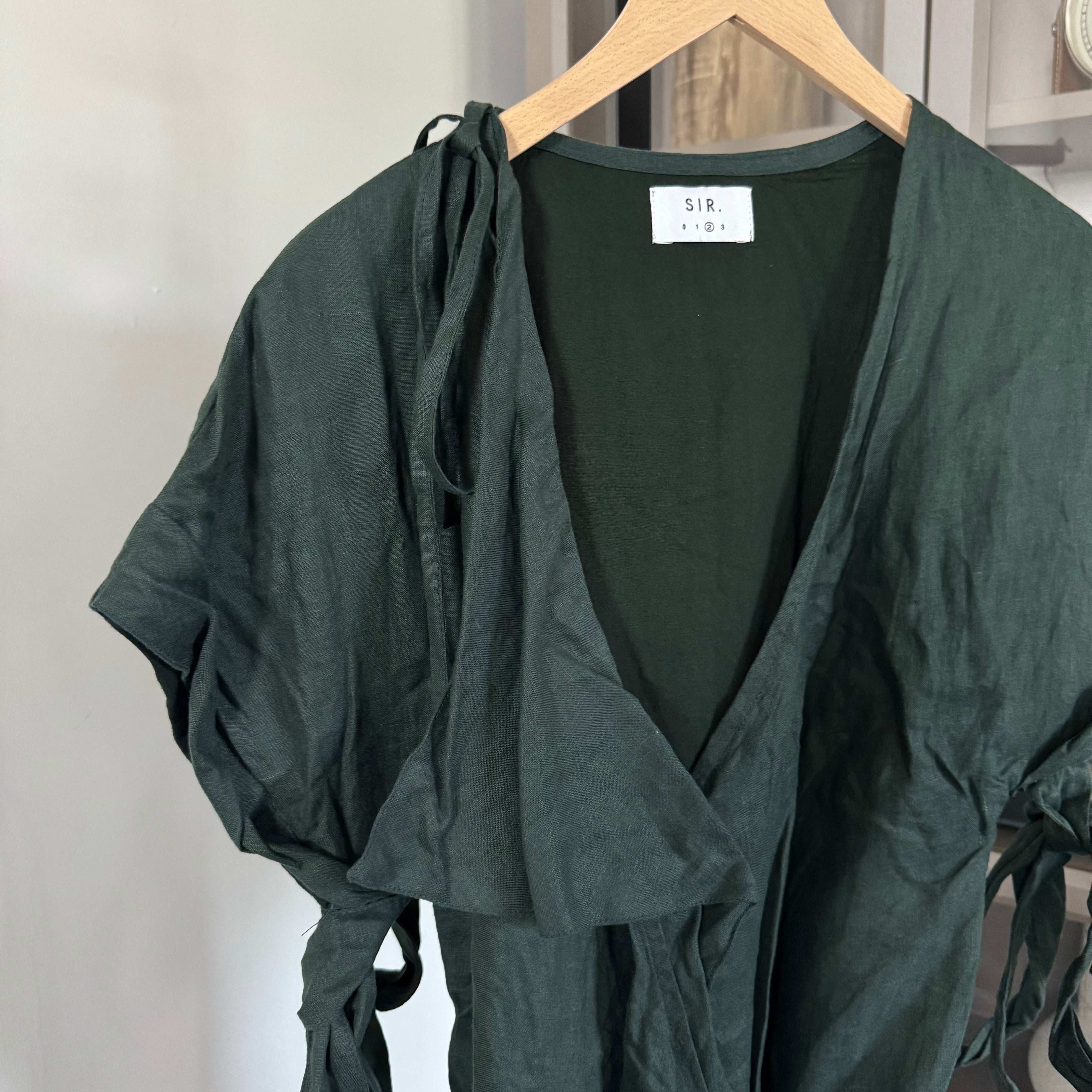 SIR. The Label Linen Forest Green Tie Detail Wrap Short Sleeve Mini Dress