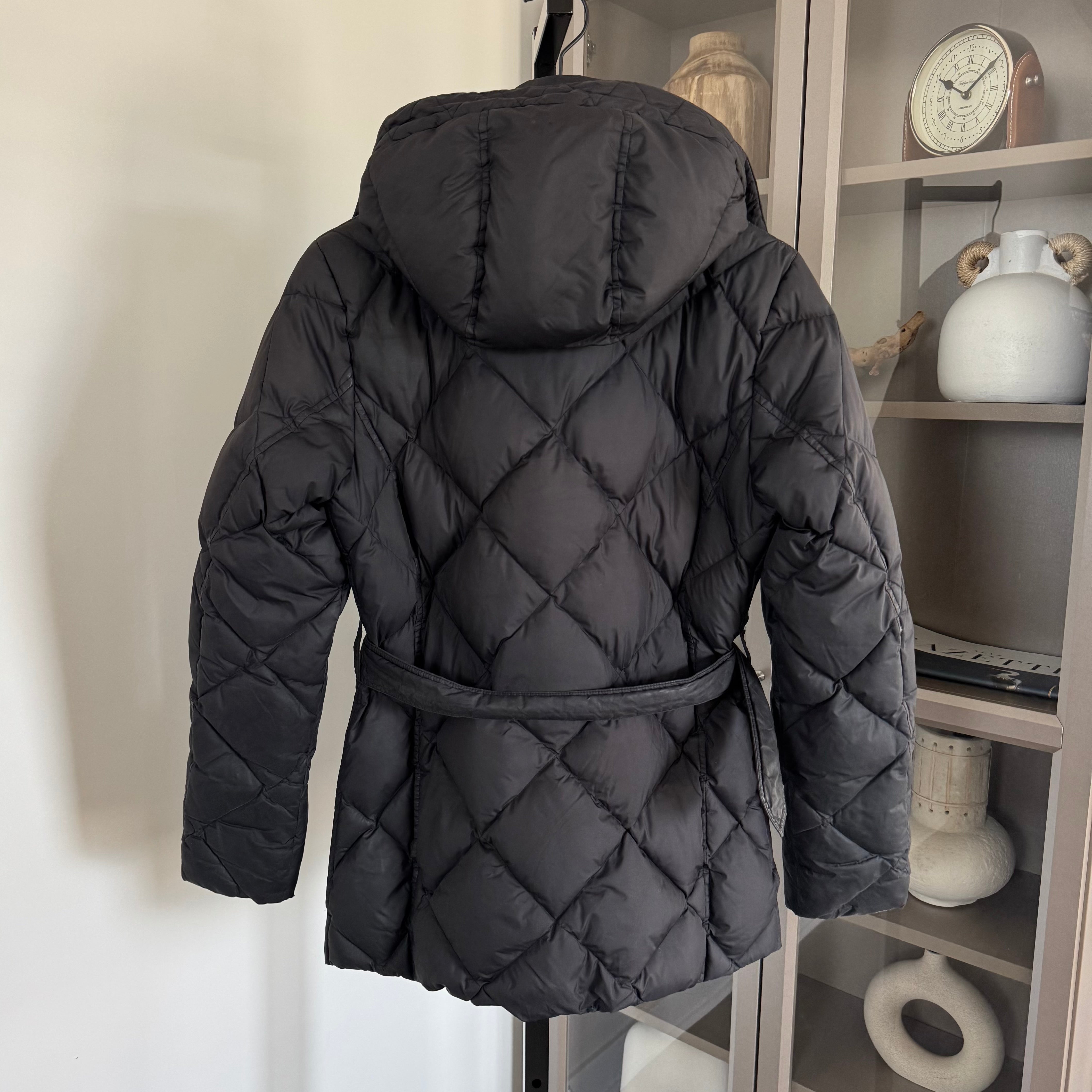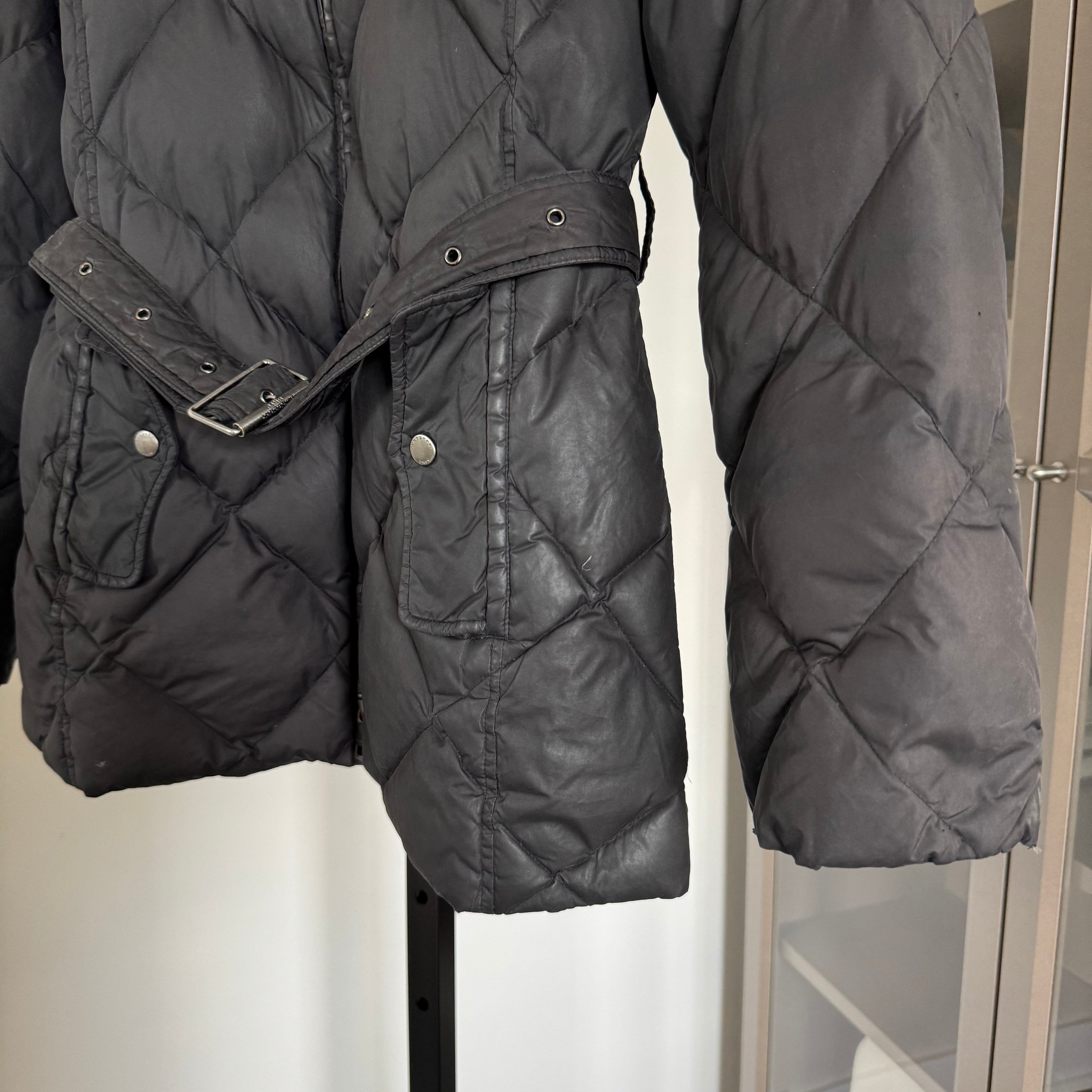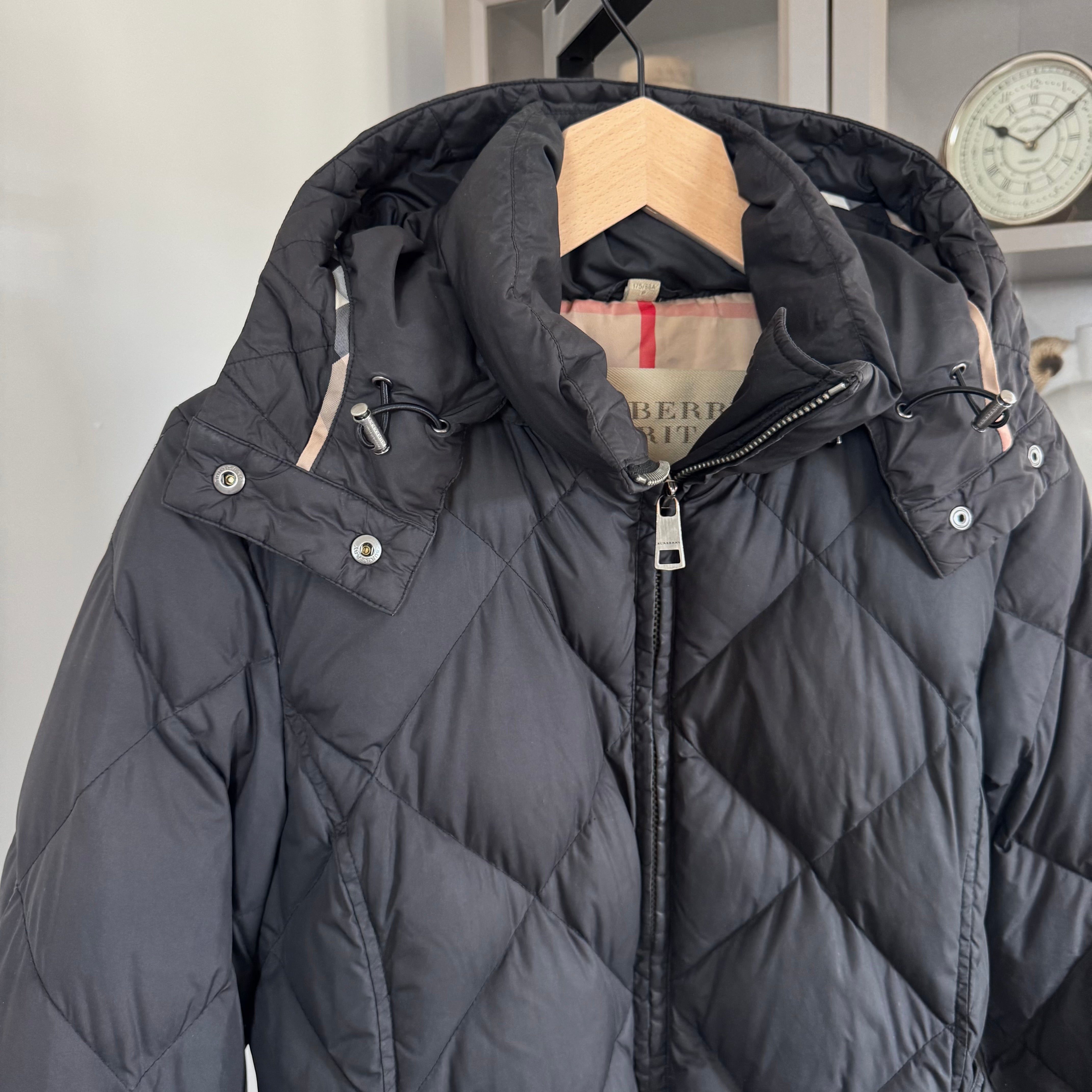 Burberry Black Quilted Goose Down Hooded Tartan Plaid Lined Belted Coat