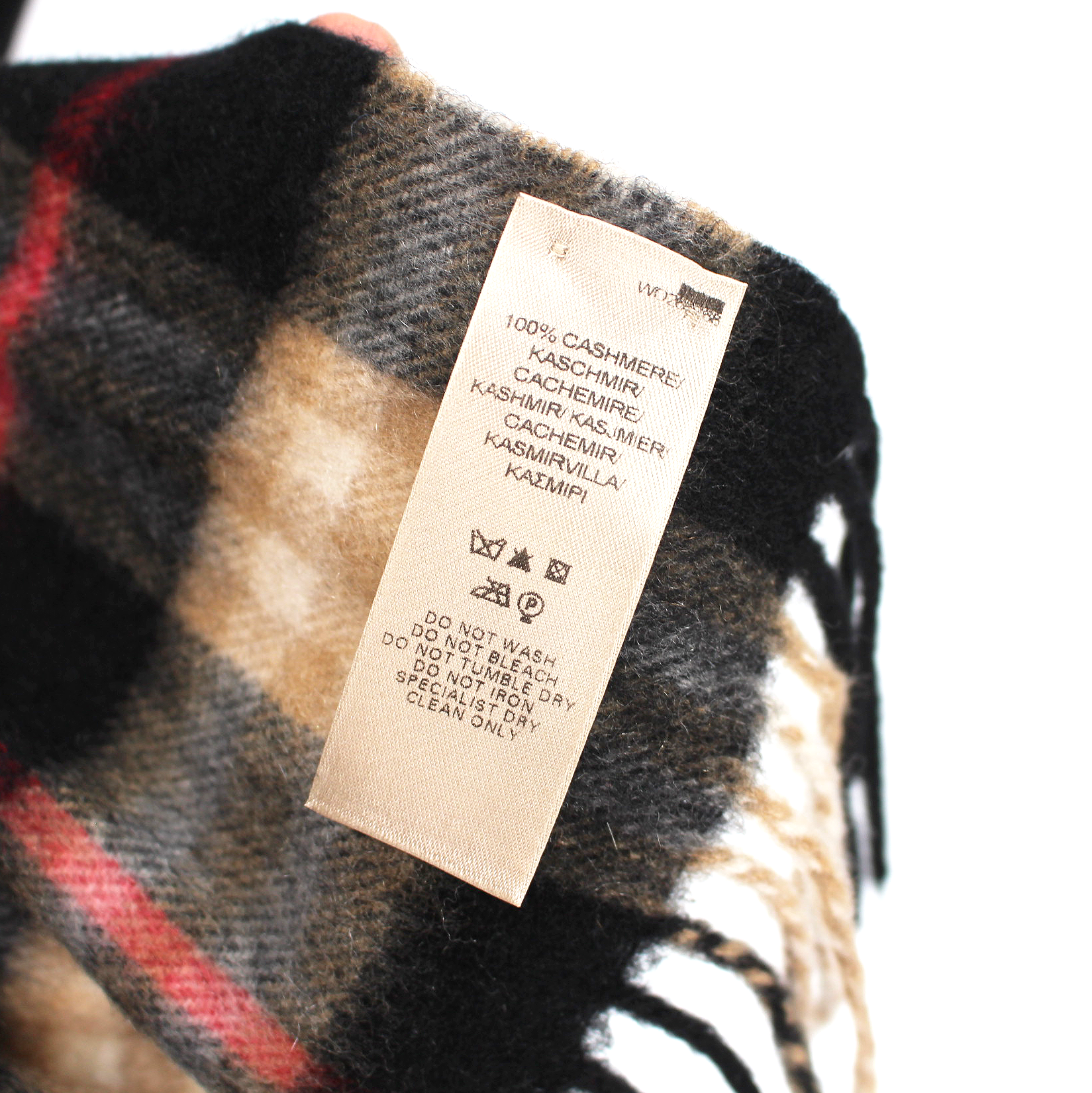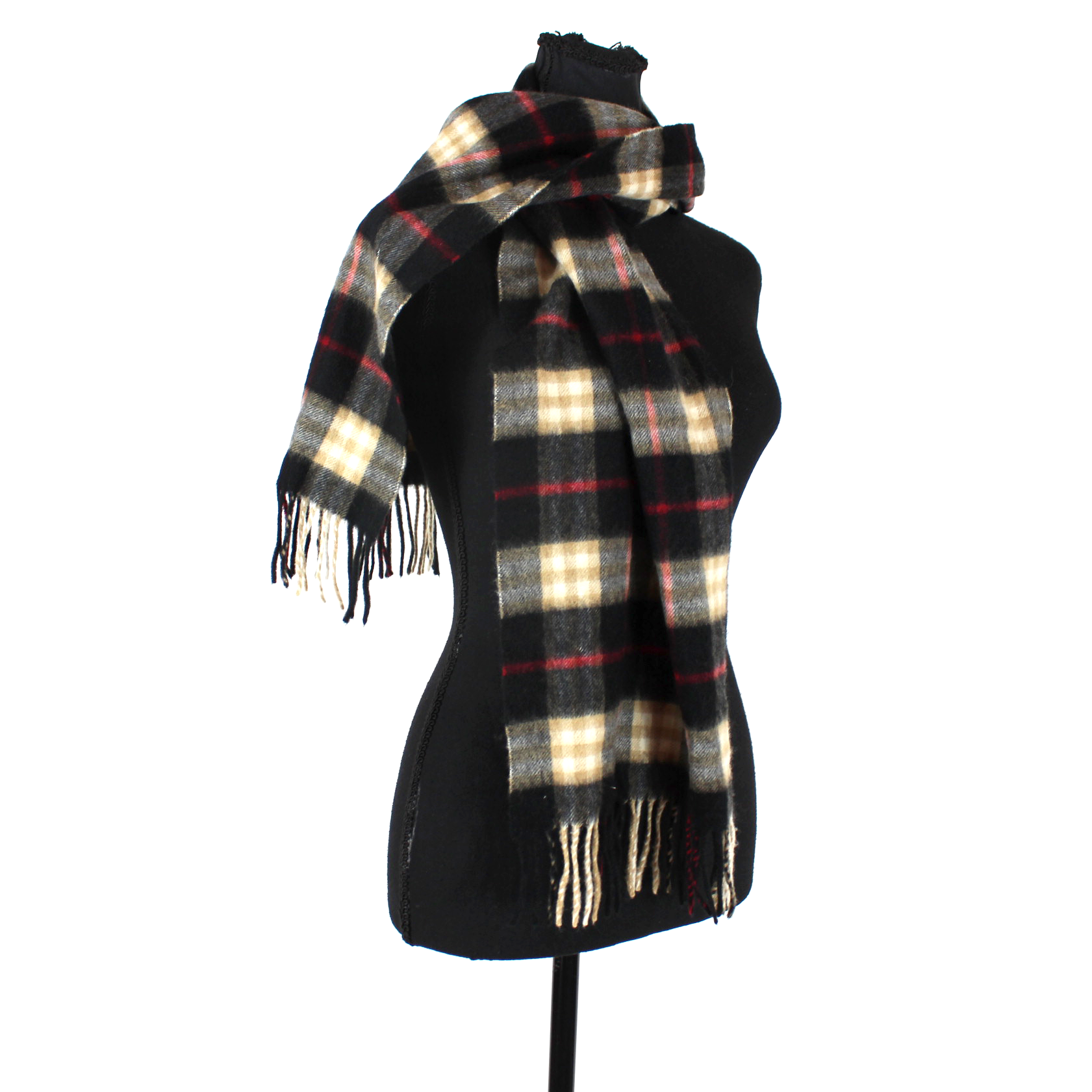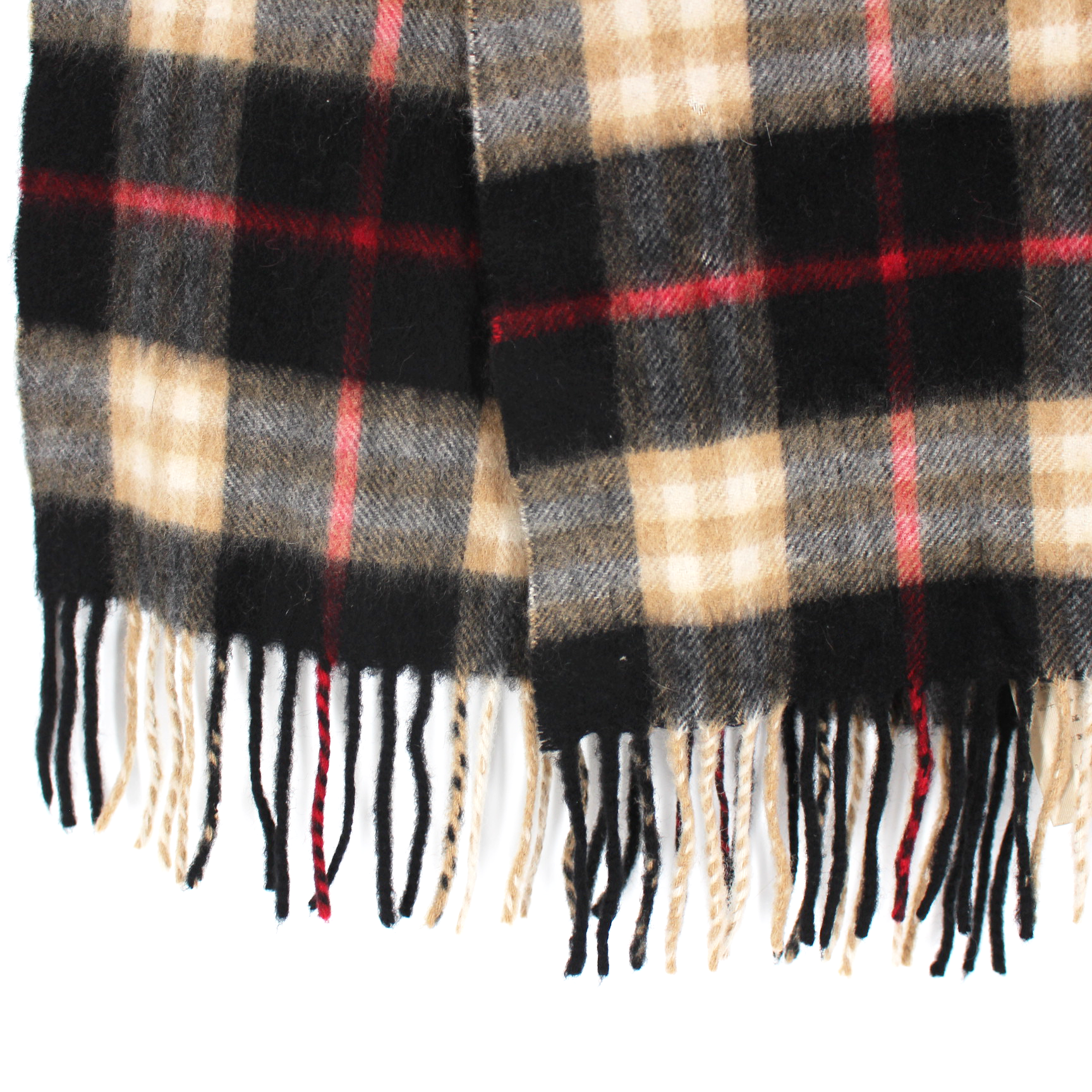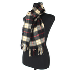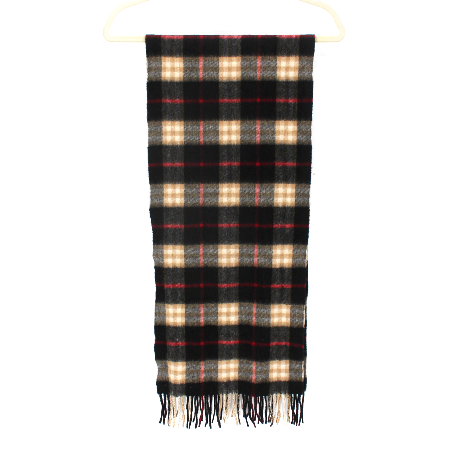 Burberry Cashmere Black Tan Red Nova Check Plaid Fringe Trim Neck Scarf