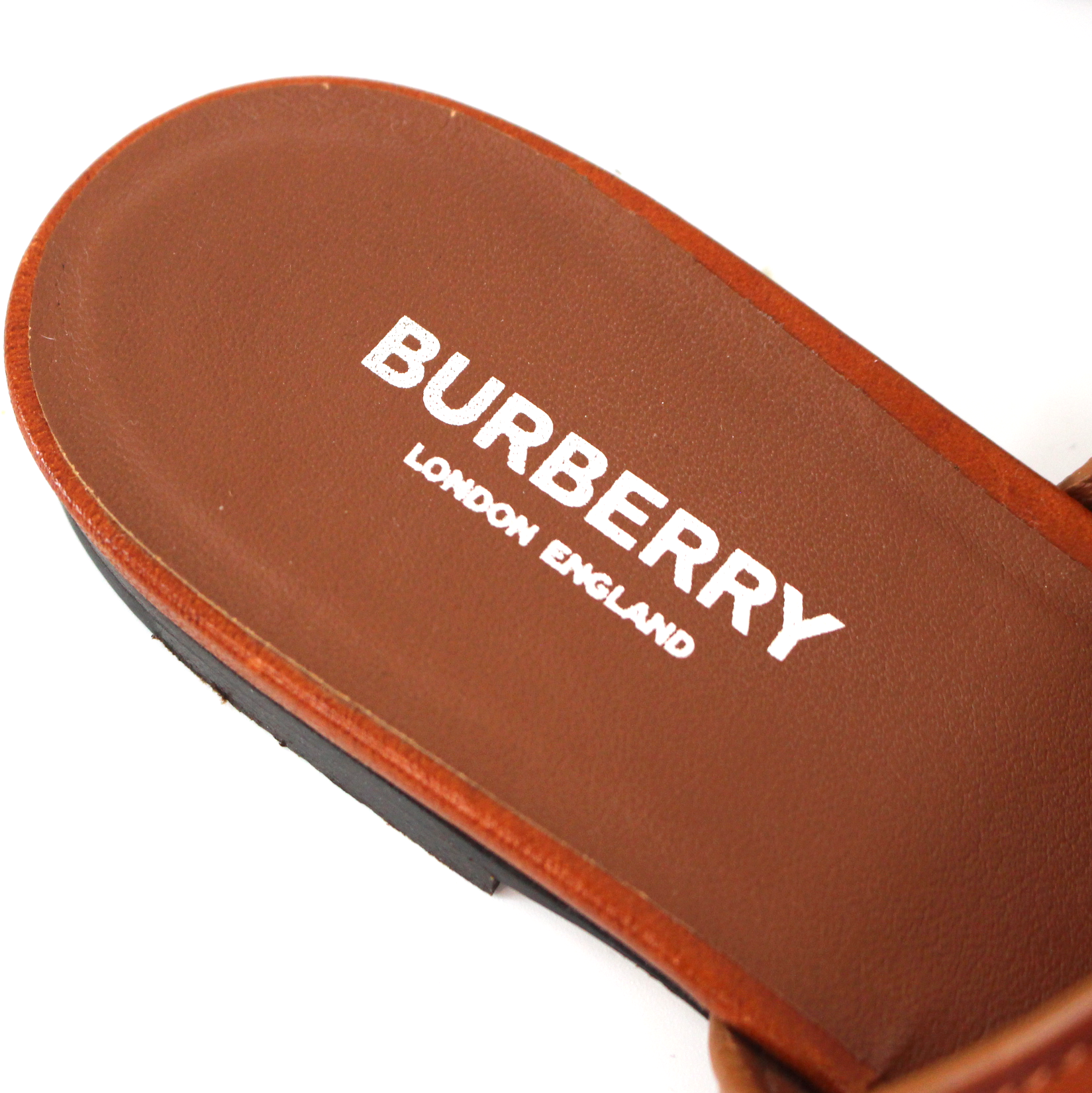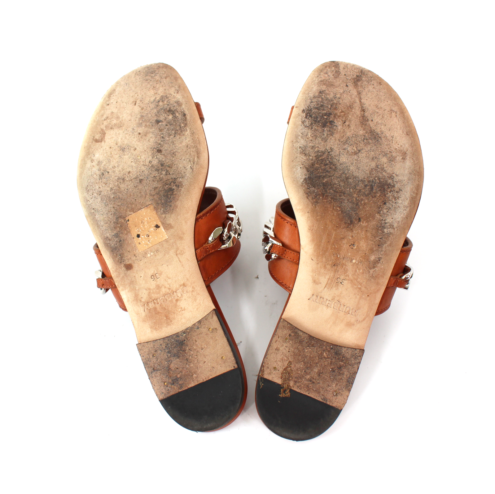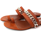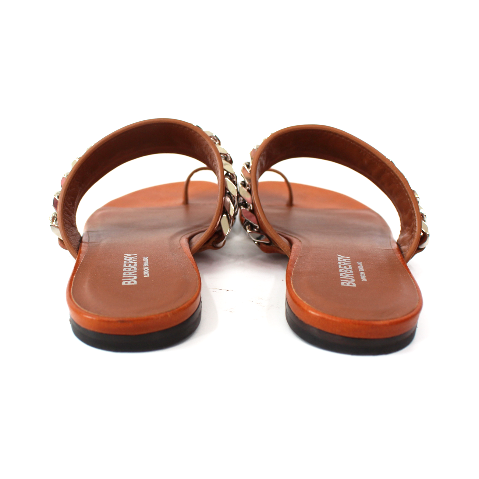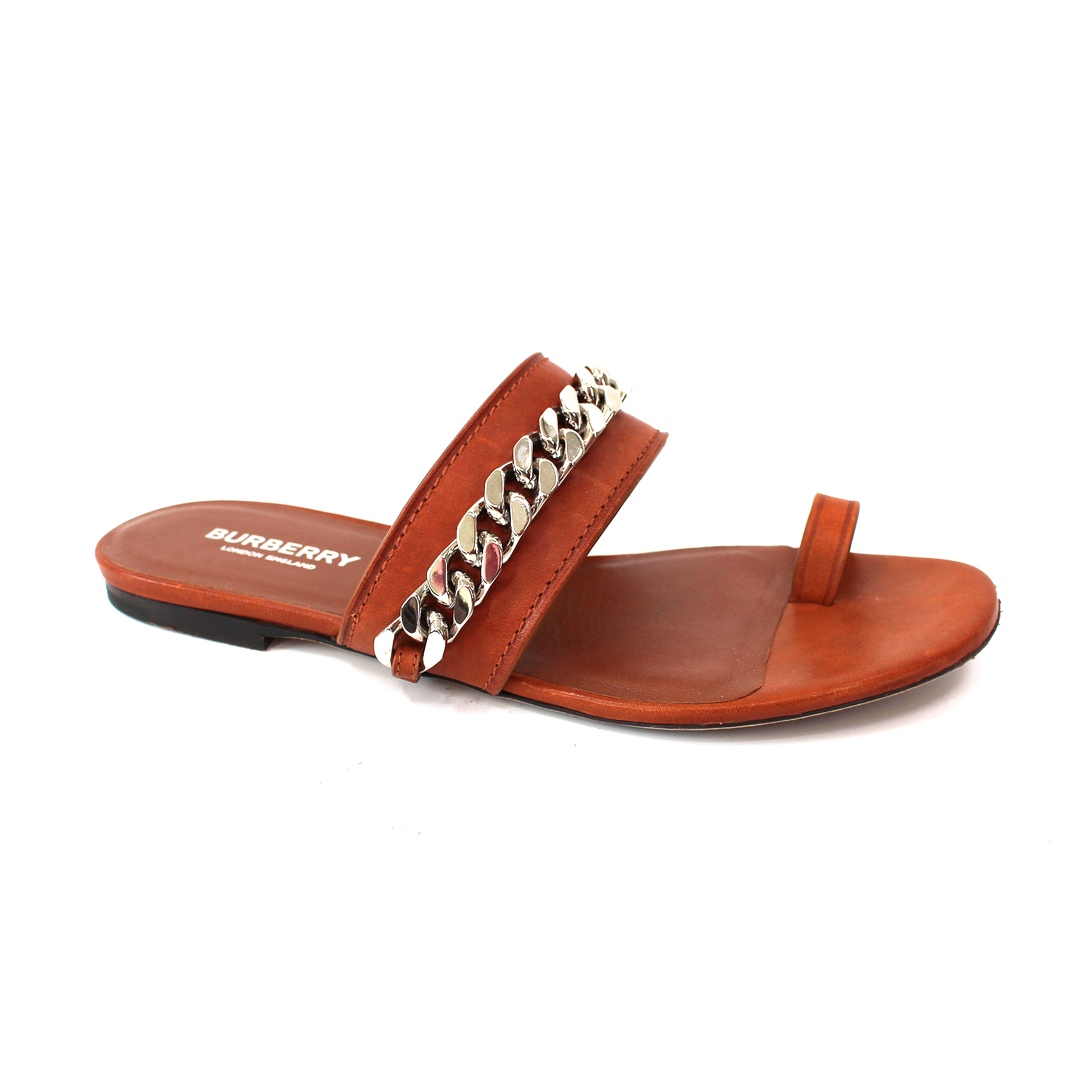 Burberry Heidi Amber Brown Leather Toe Ring Silver Chain Slide Sandals