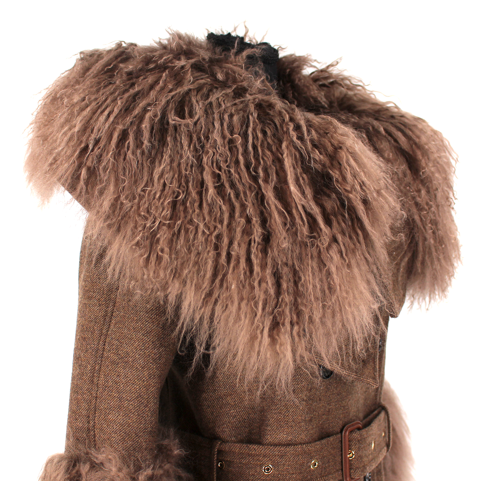 - Sleeves with loose lamb shearling trim w/belt cuff