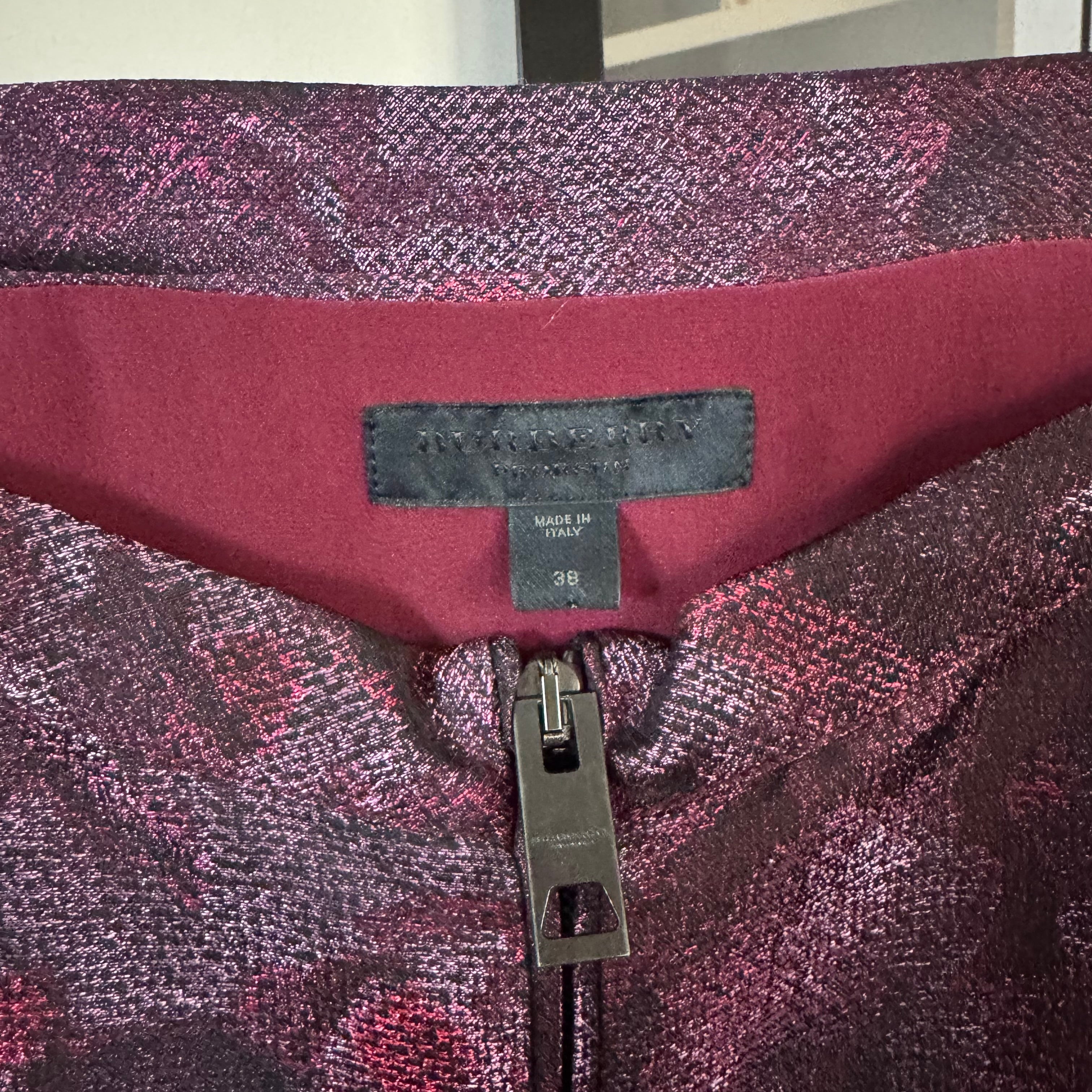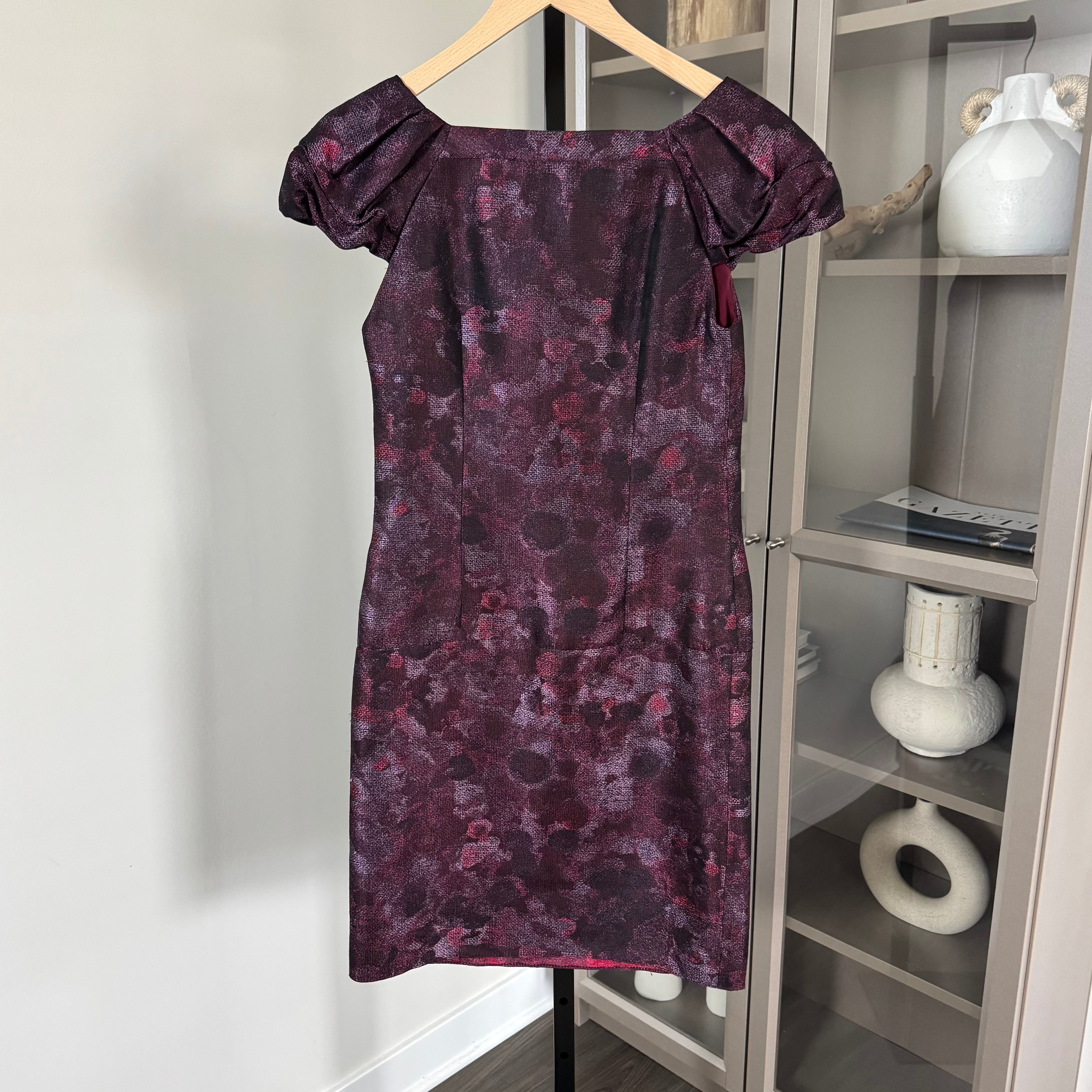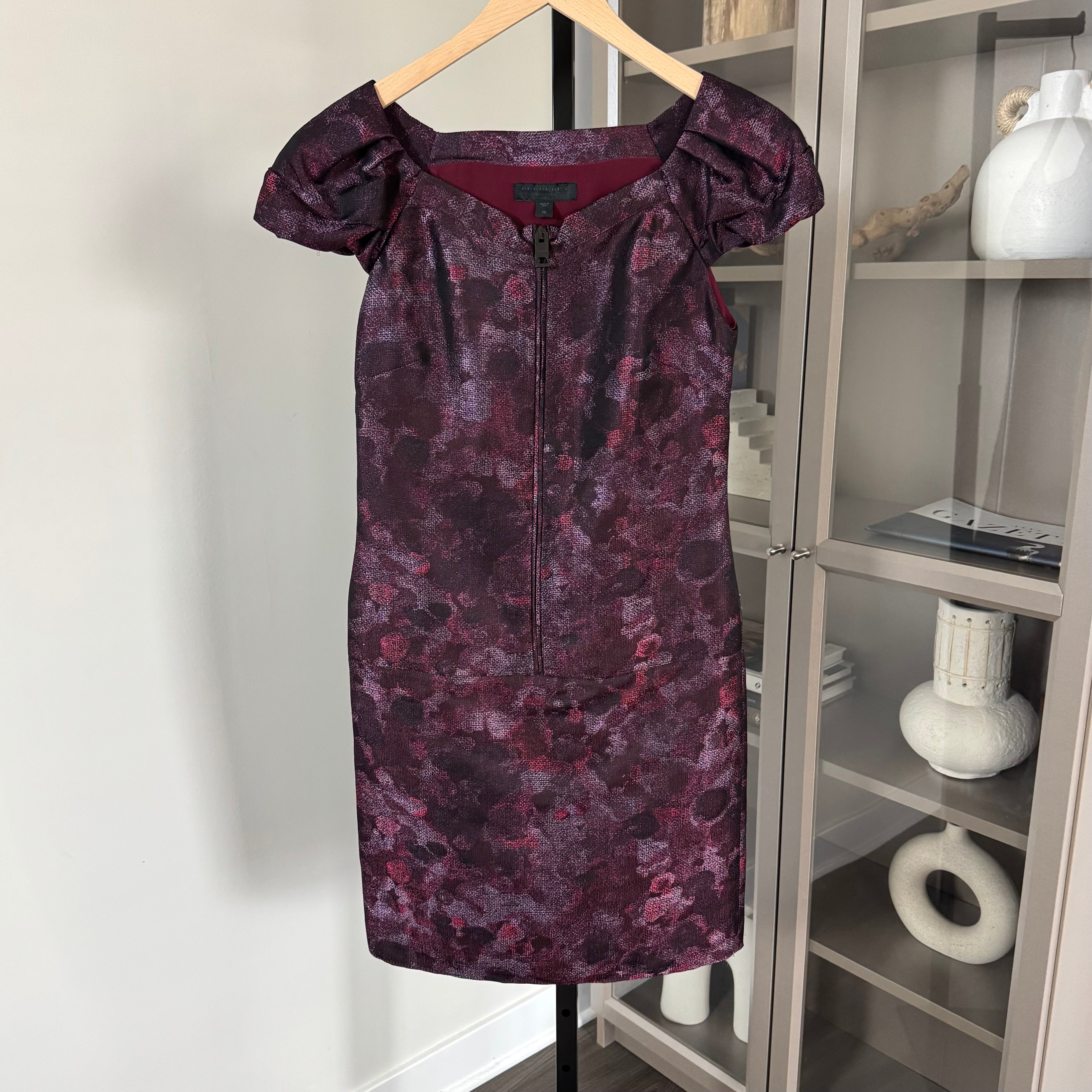 Burberry Prorsum Burgundy Shimmer Abstract Front Zip Puff Sleeve Sheath Dress
