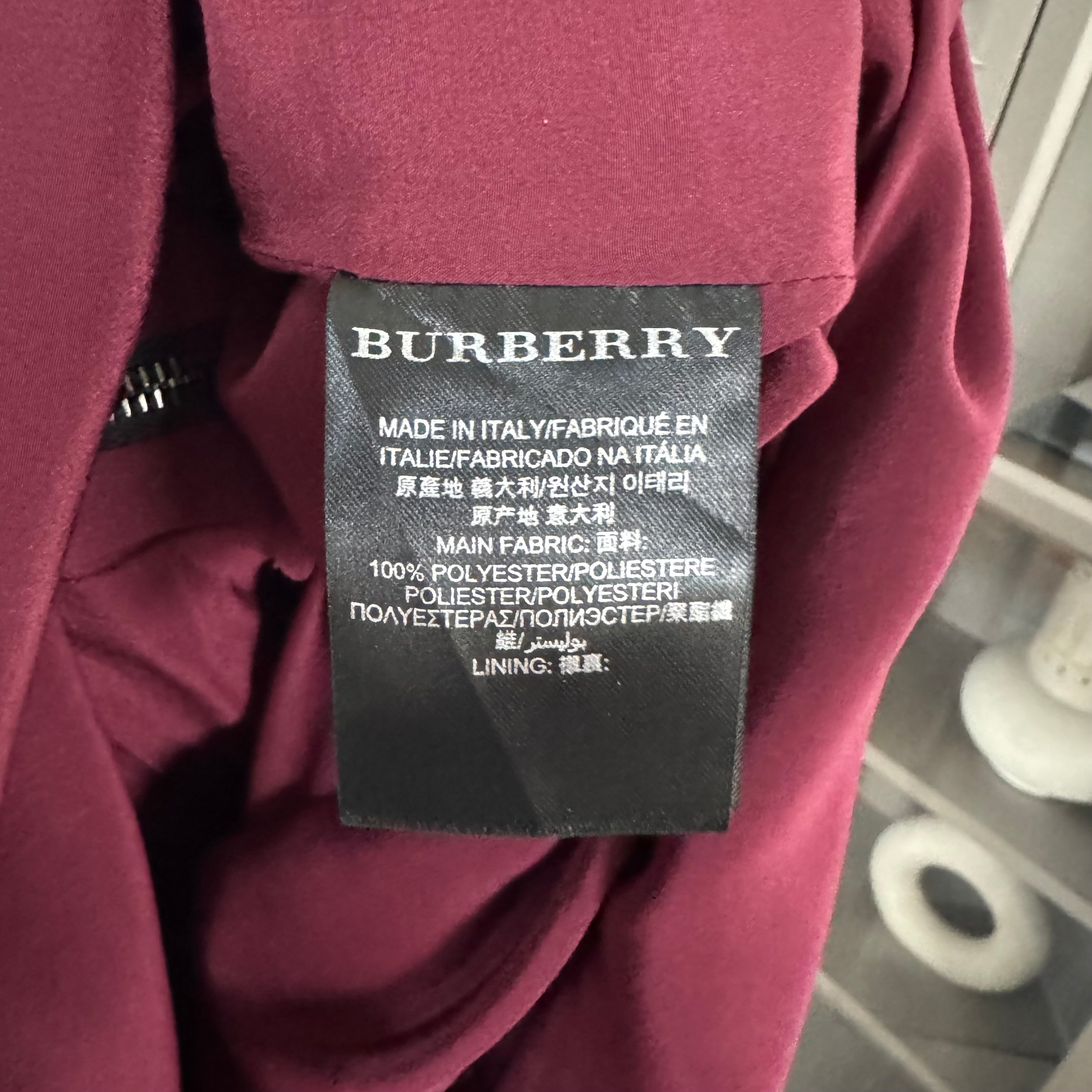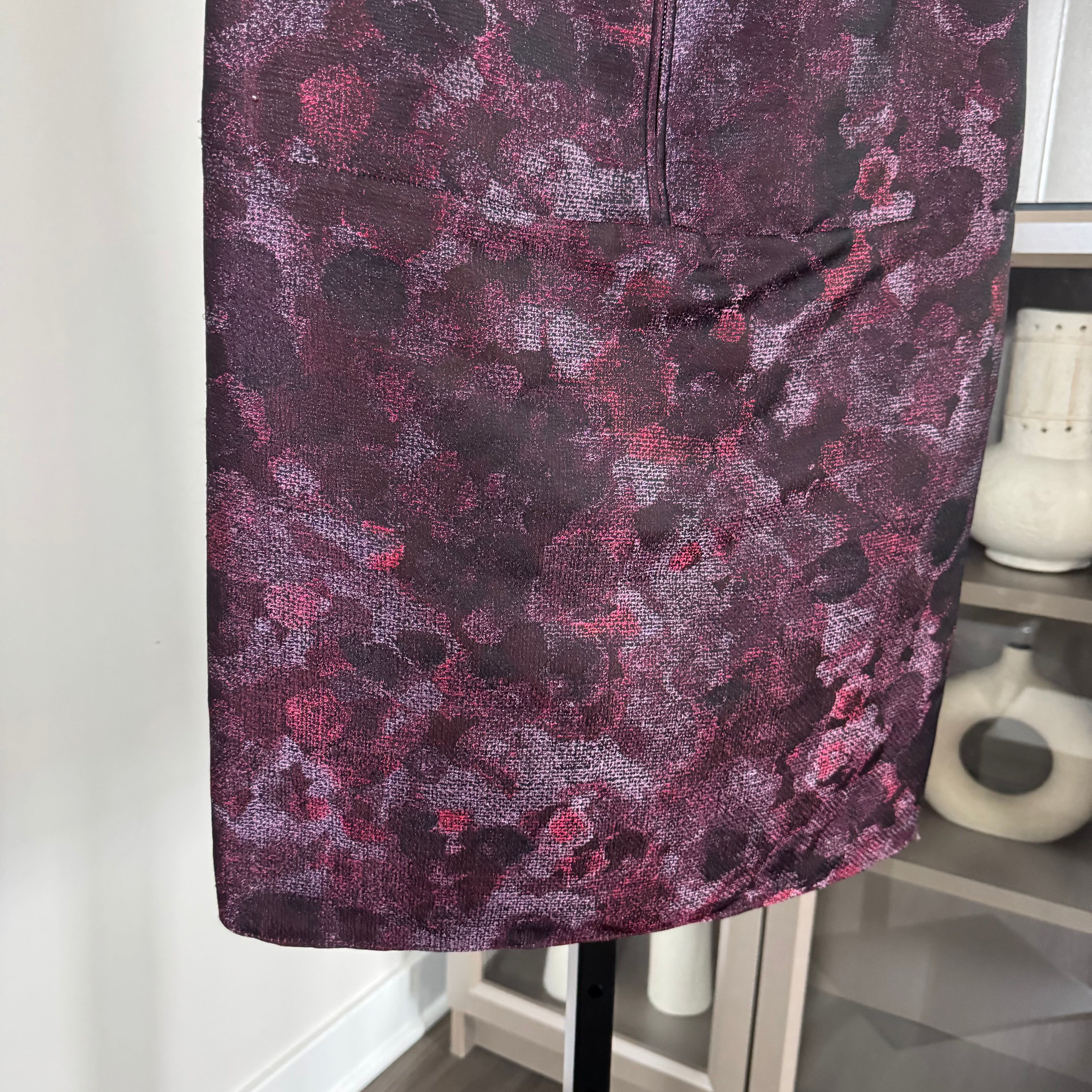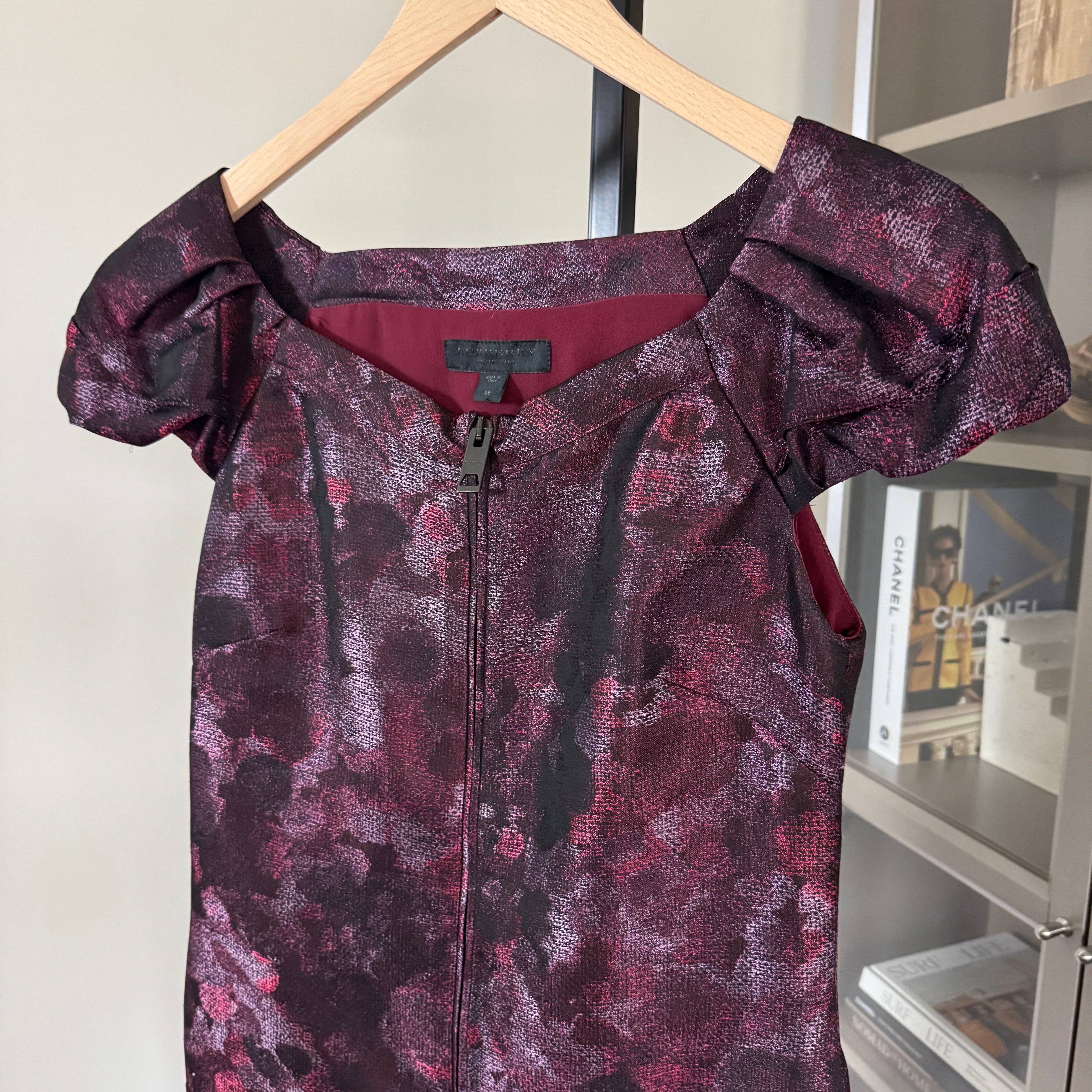 Burberry Prorsum Burgundy Shimmer Abstract Front Zip Puff Sleeve Sheath Dress