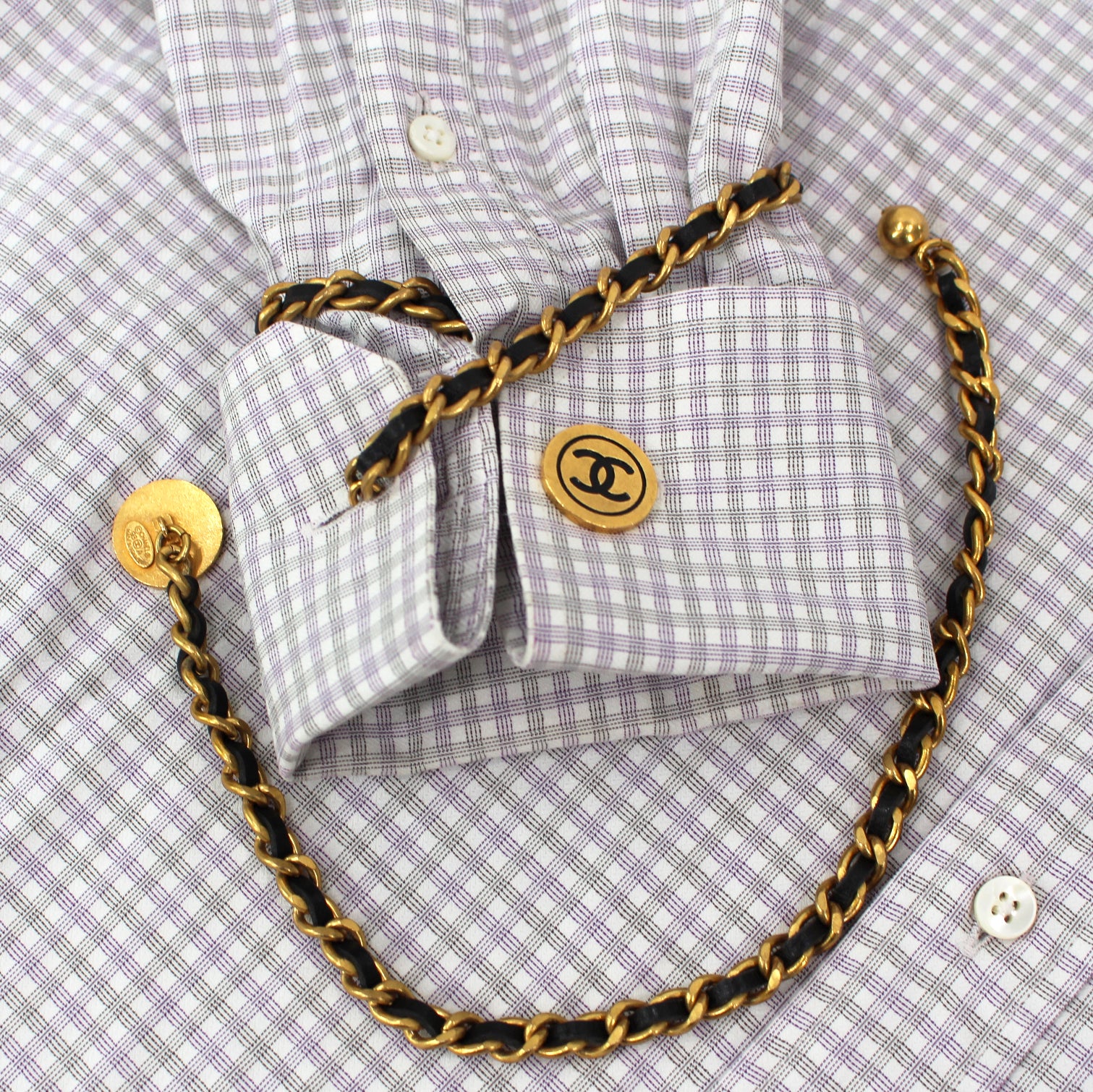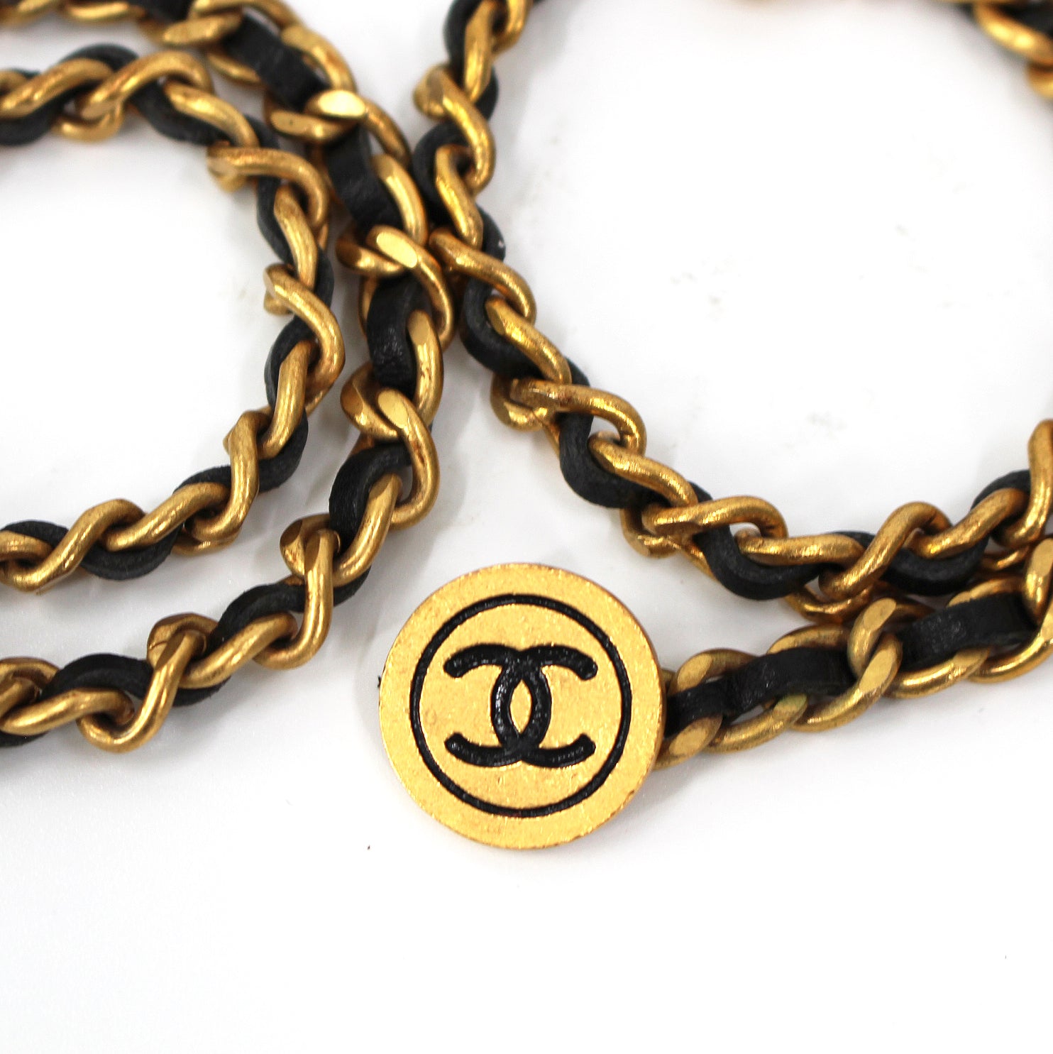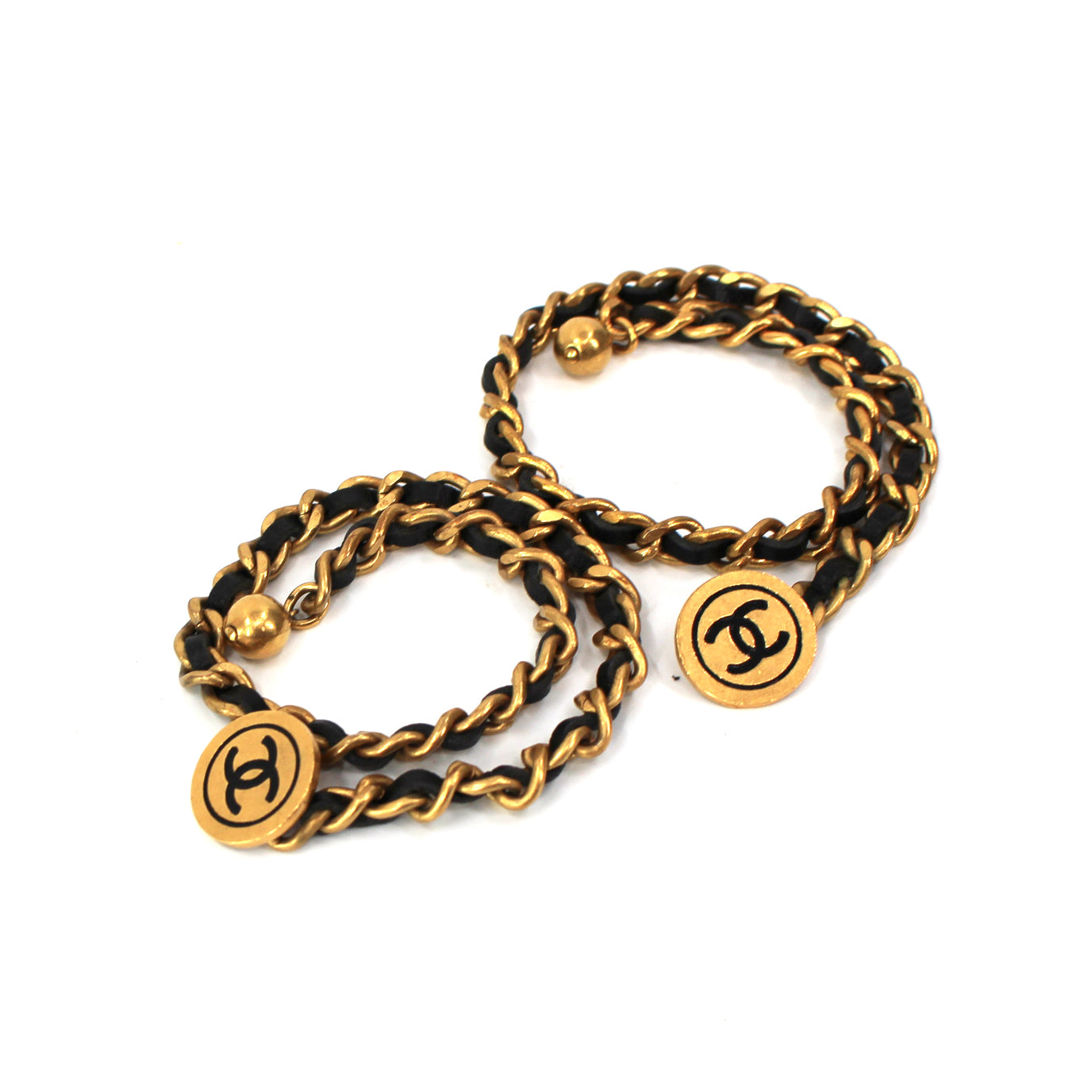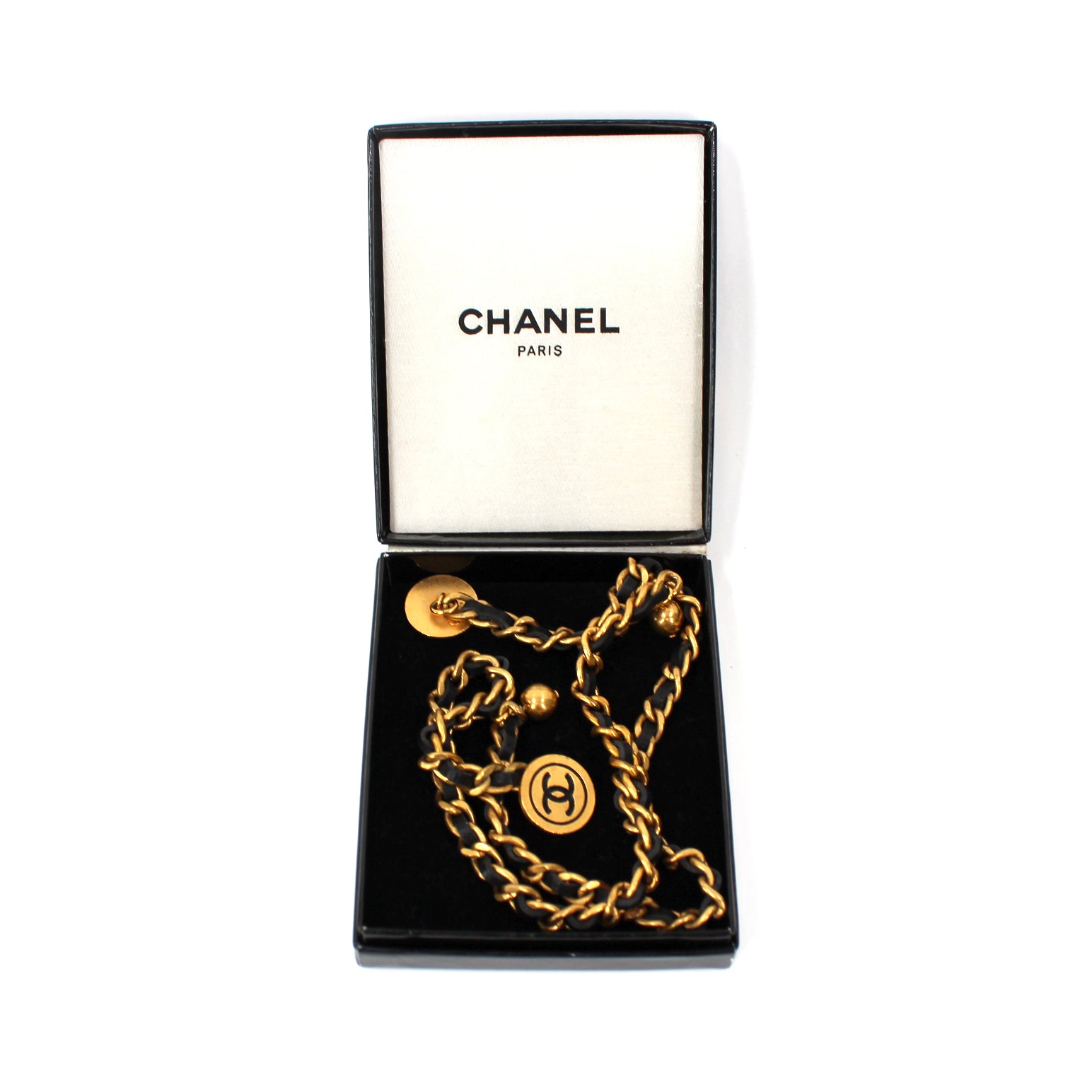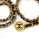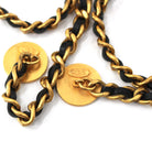 Chanel Paris Vintage Gold Chainlink Black Leather Medallion Cufflinks