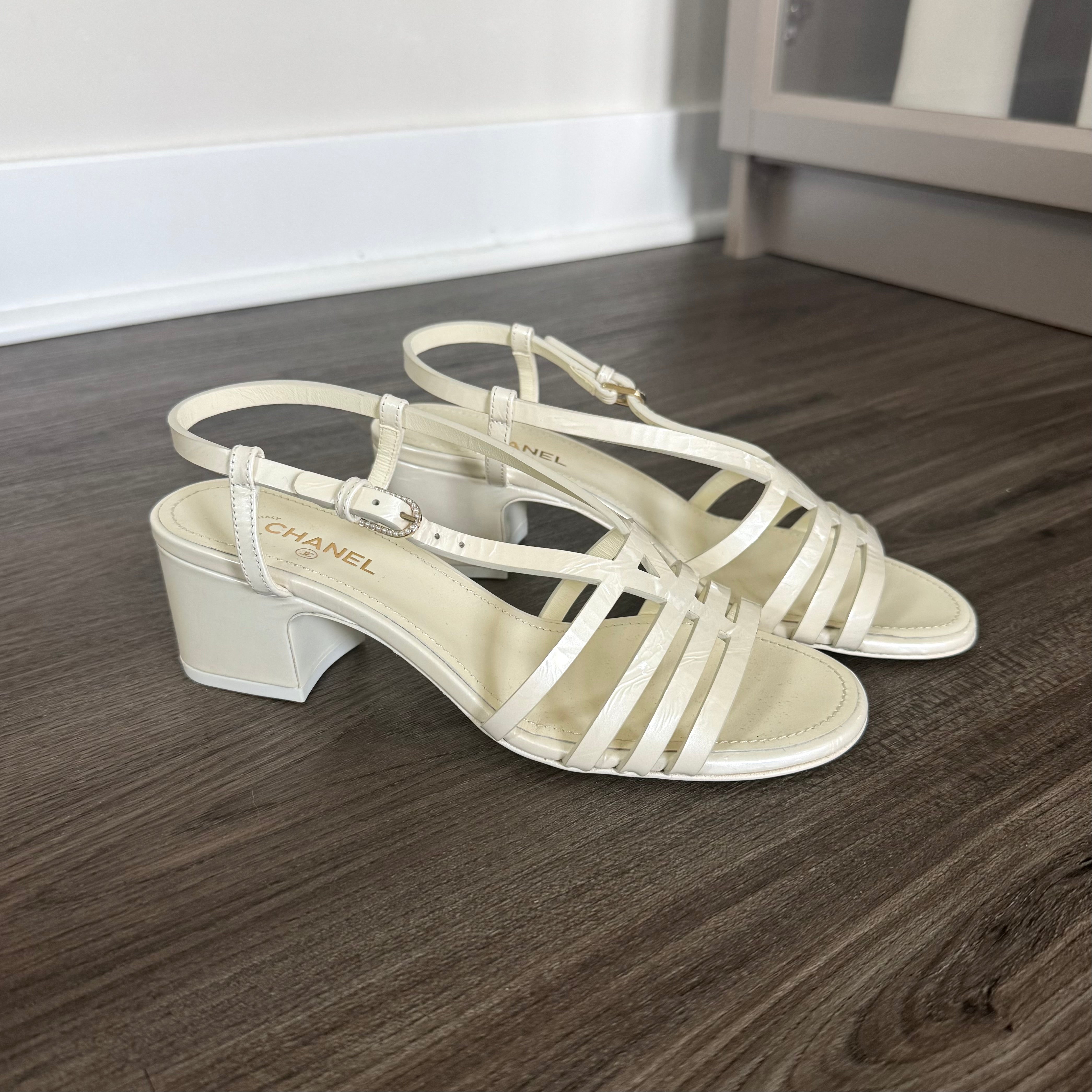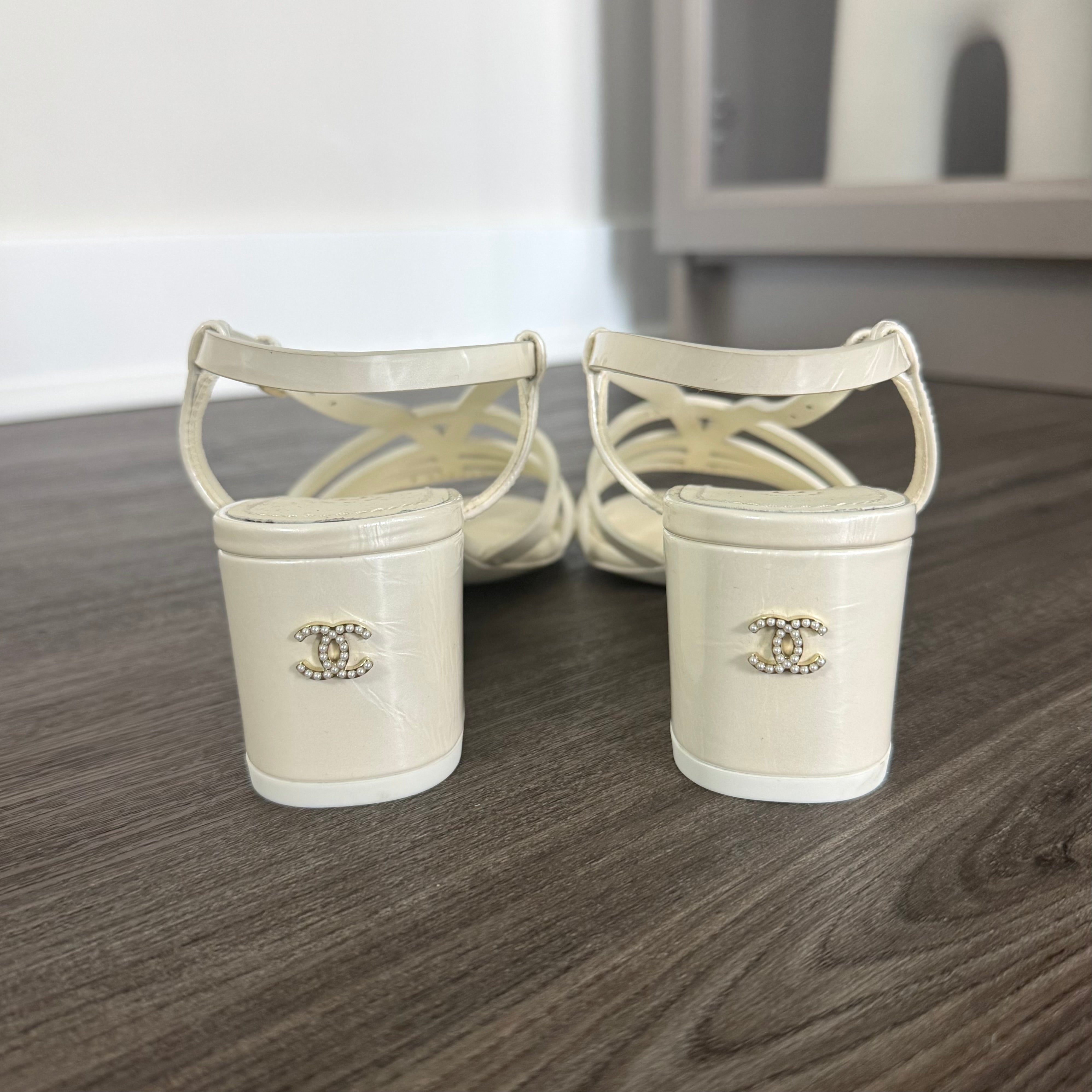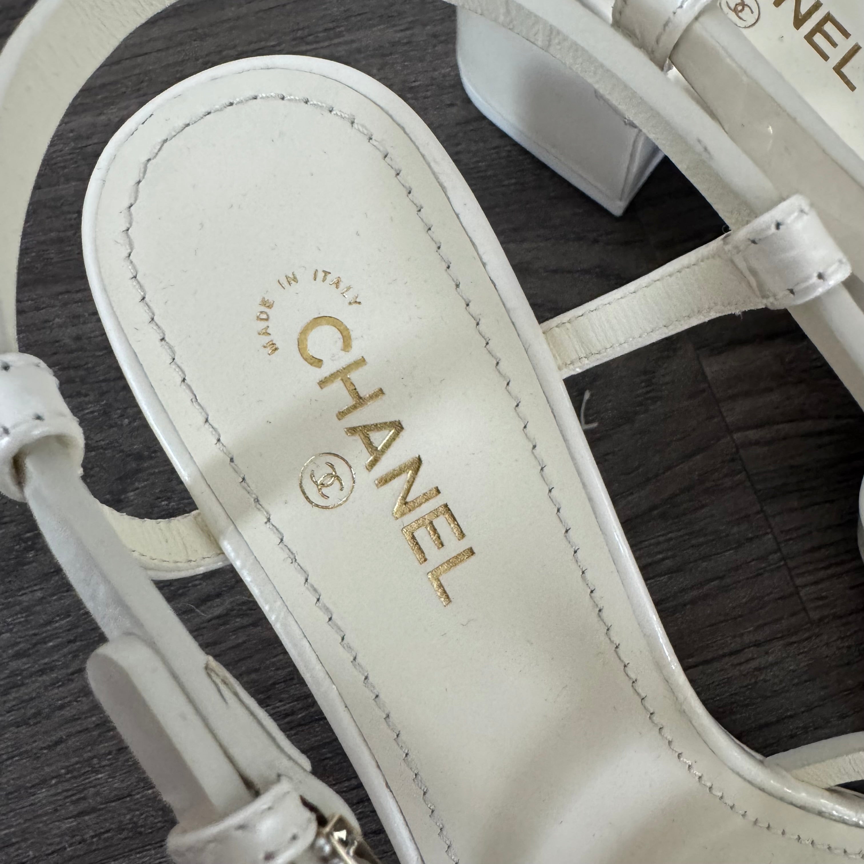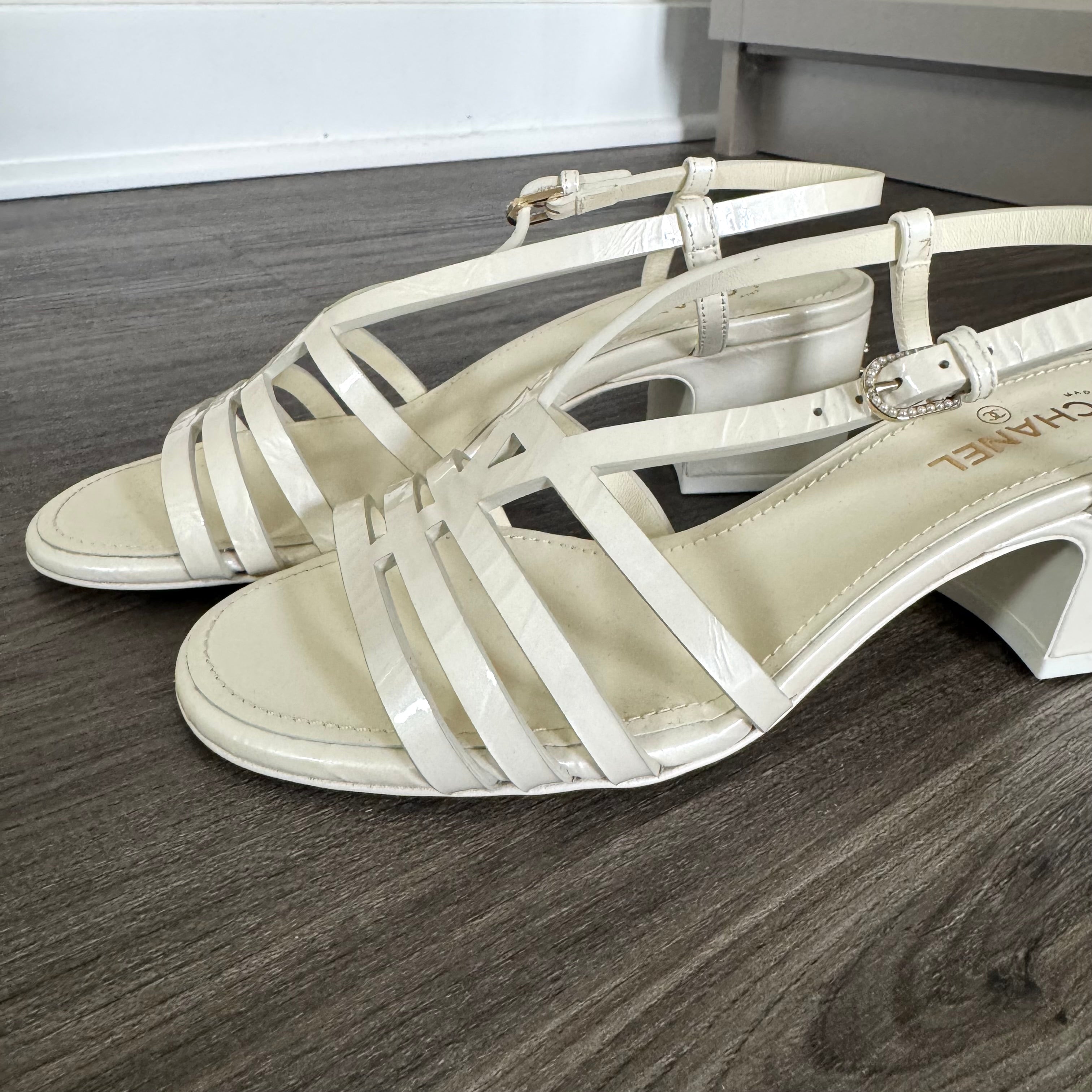 Chanel White Gloss Covered Leather Rhinestone Detail Block Heel Sandals