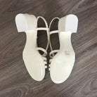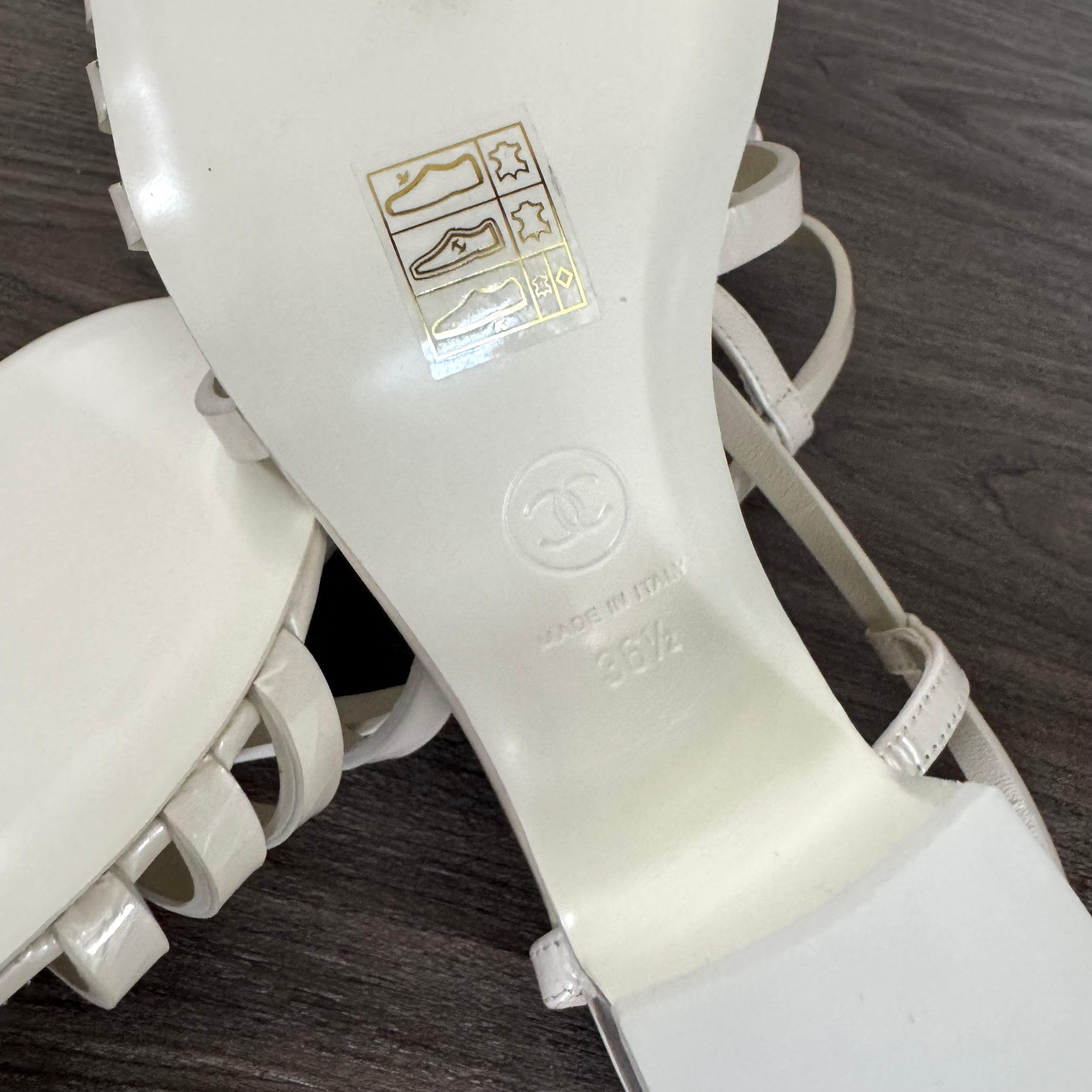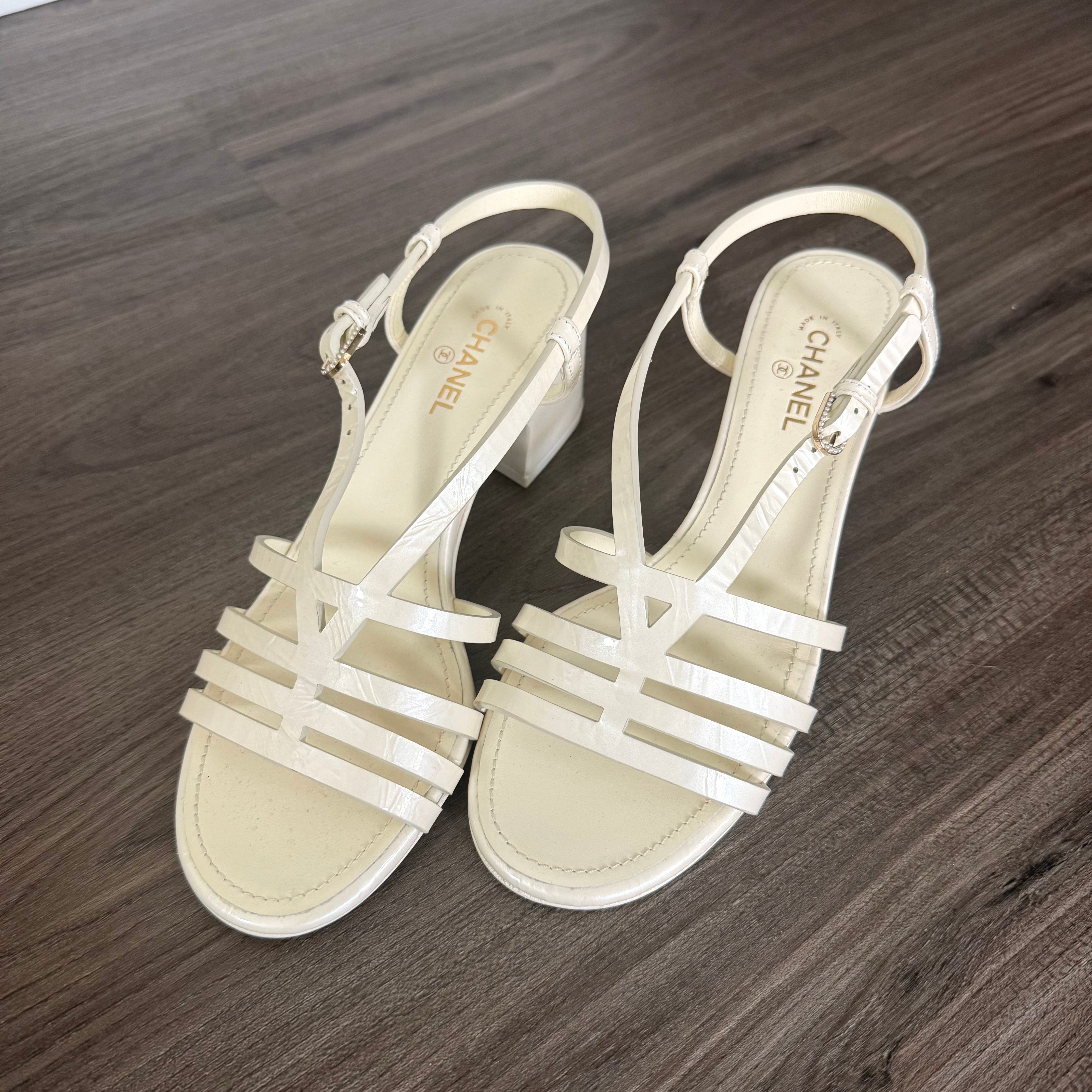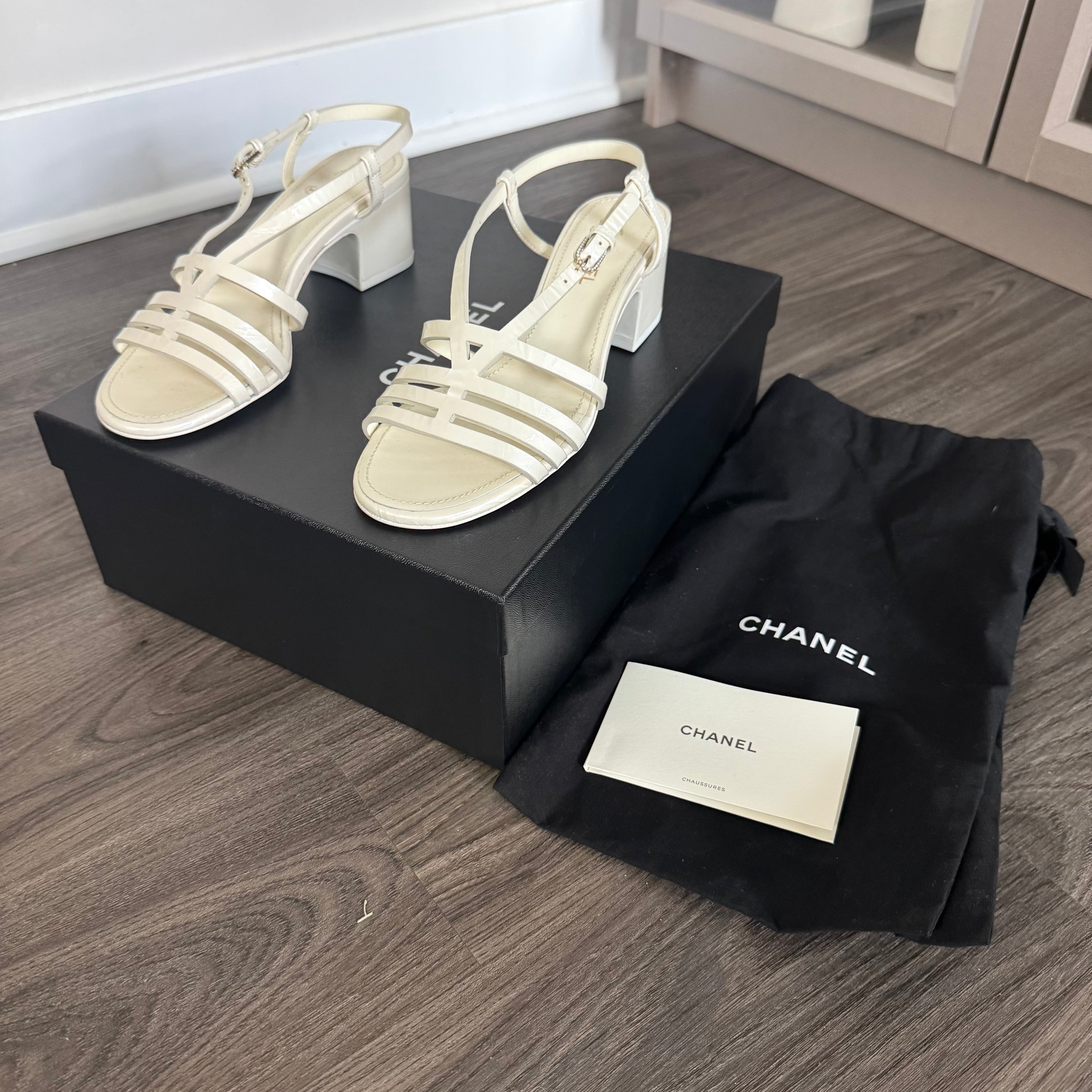 Chanel White Gloss Covered Leather Rhinestone Detail Block Heel Sandals