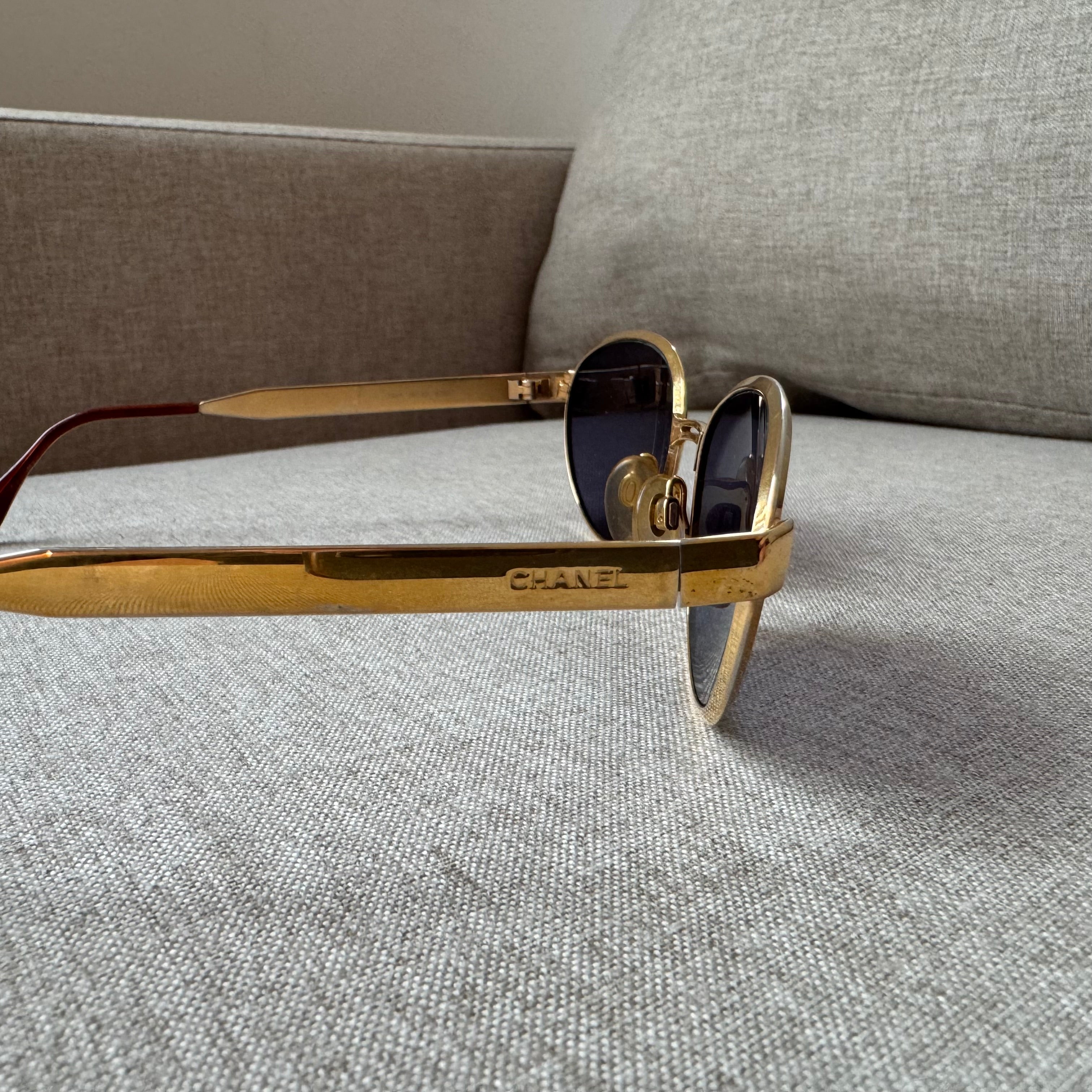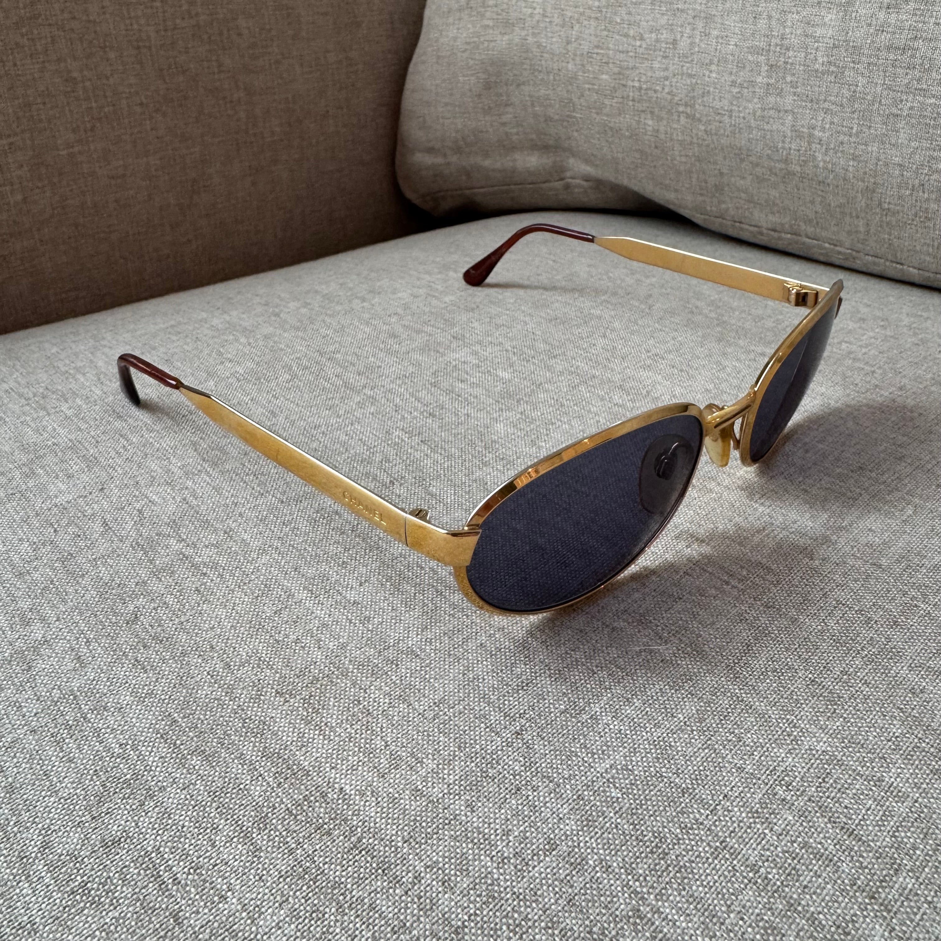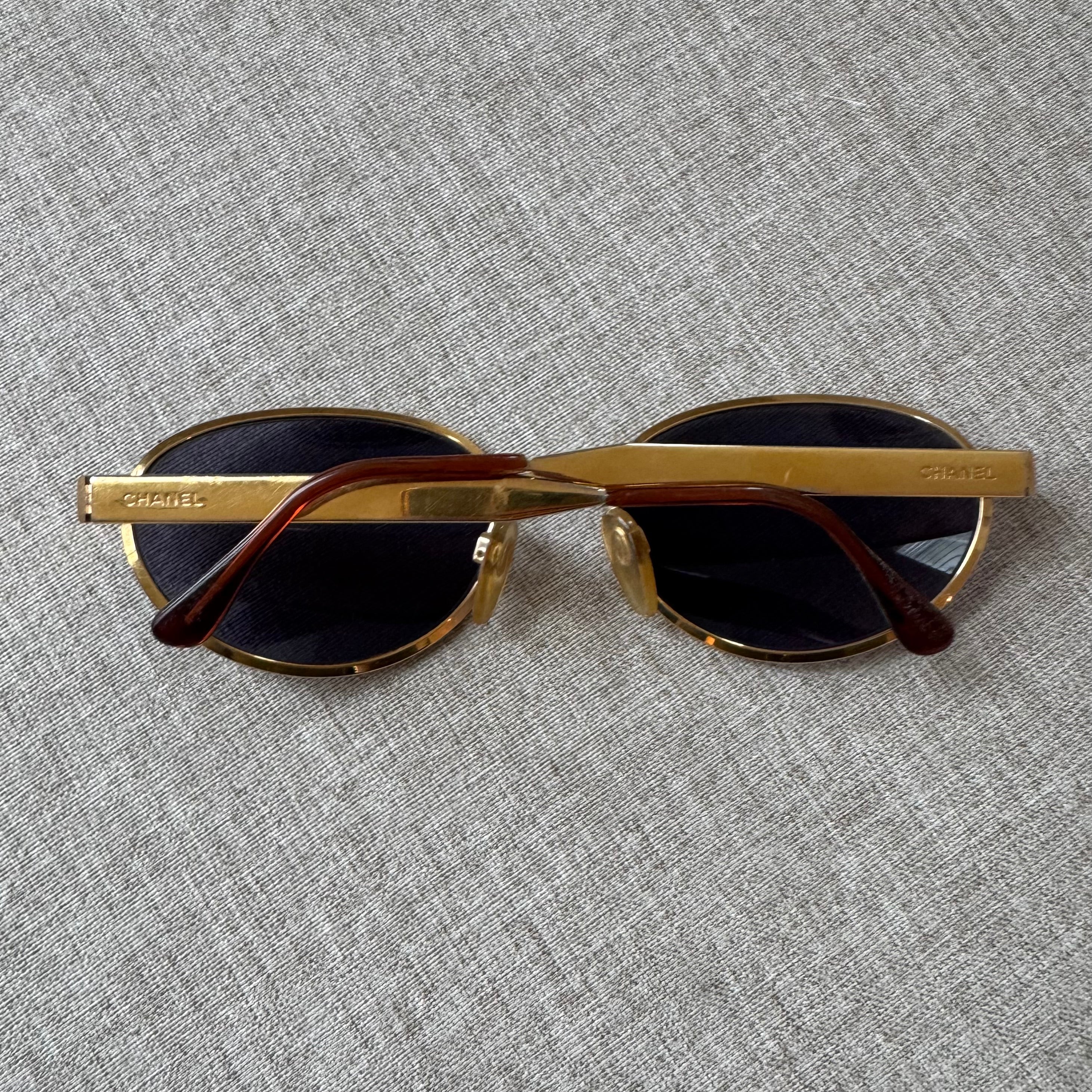 Vintage Chanel Gold Tone Oval Rim Blue Lens Sunglasses