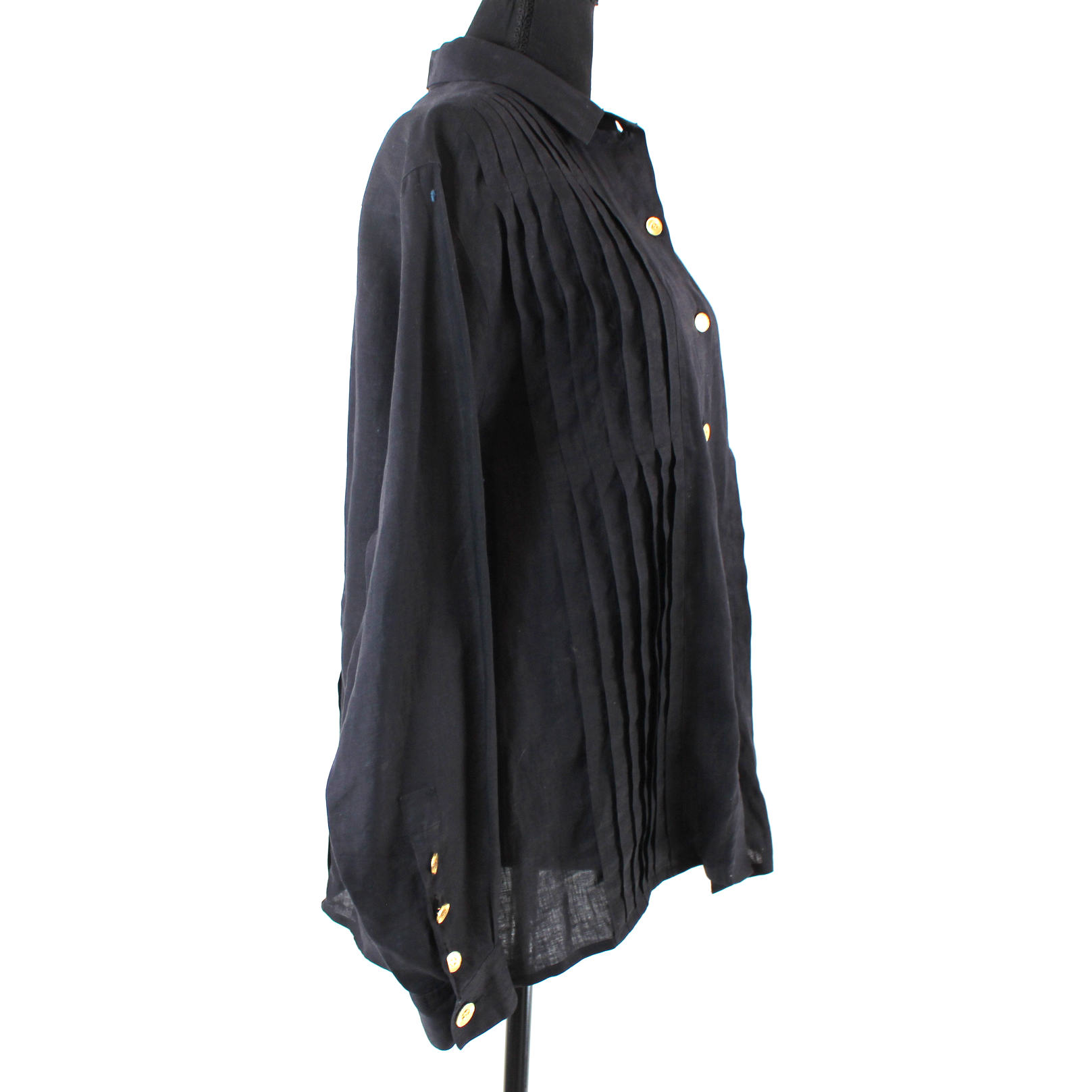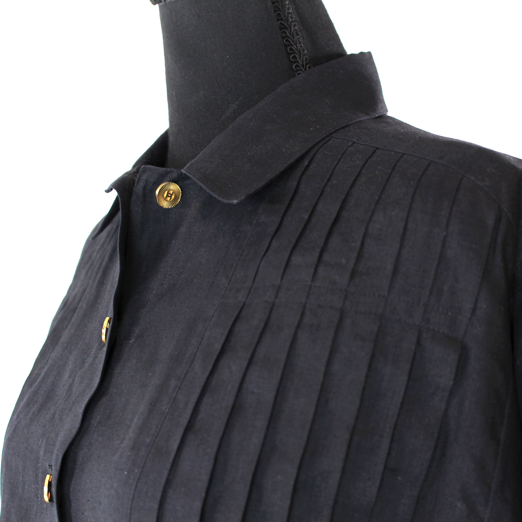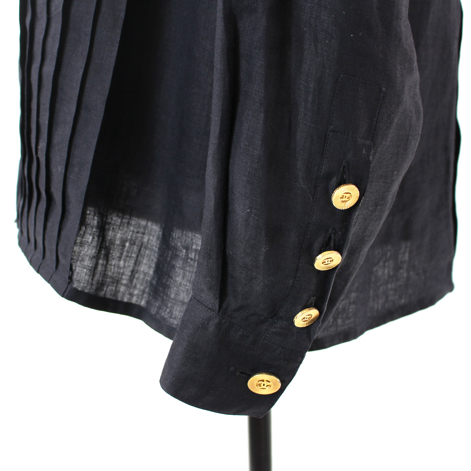Chanel Black Linen Pintuck Gold CC Logo Button-Up Tunic Blouse