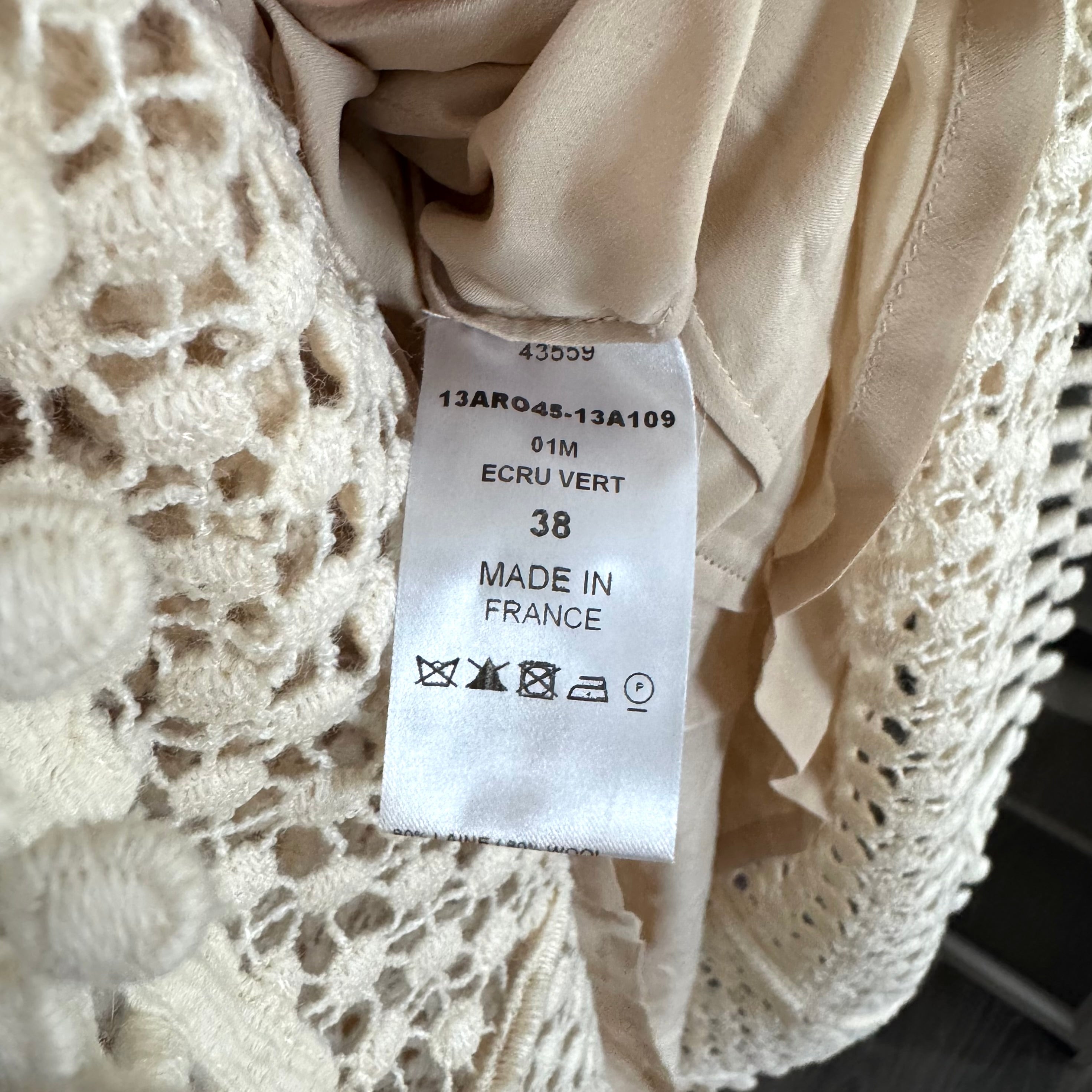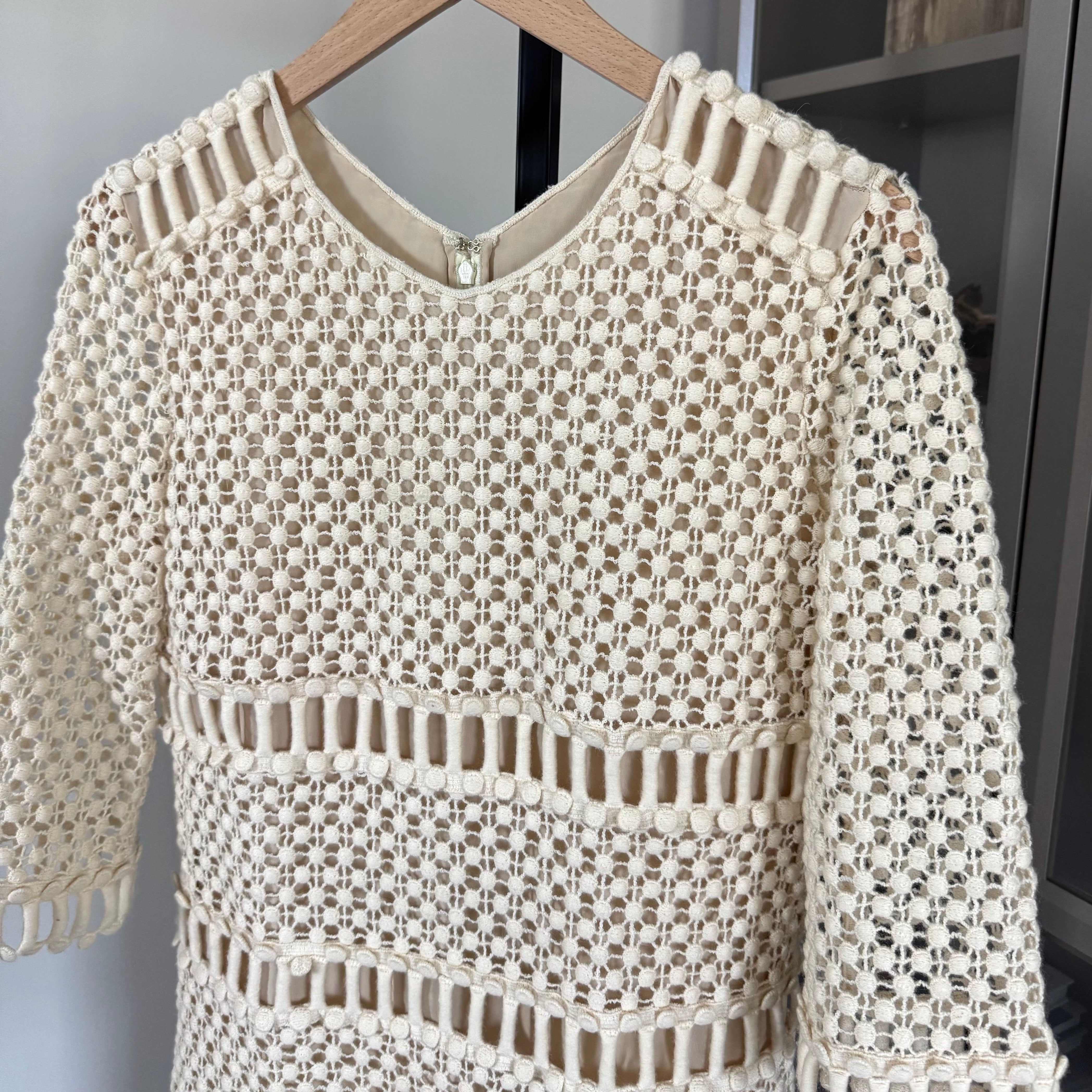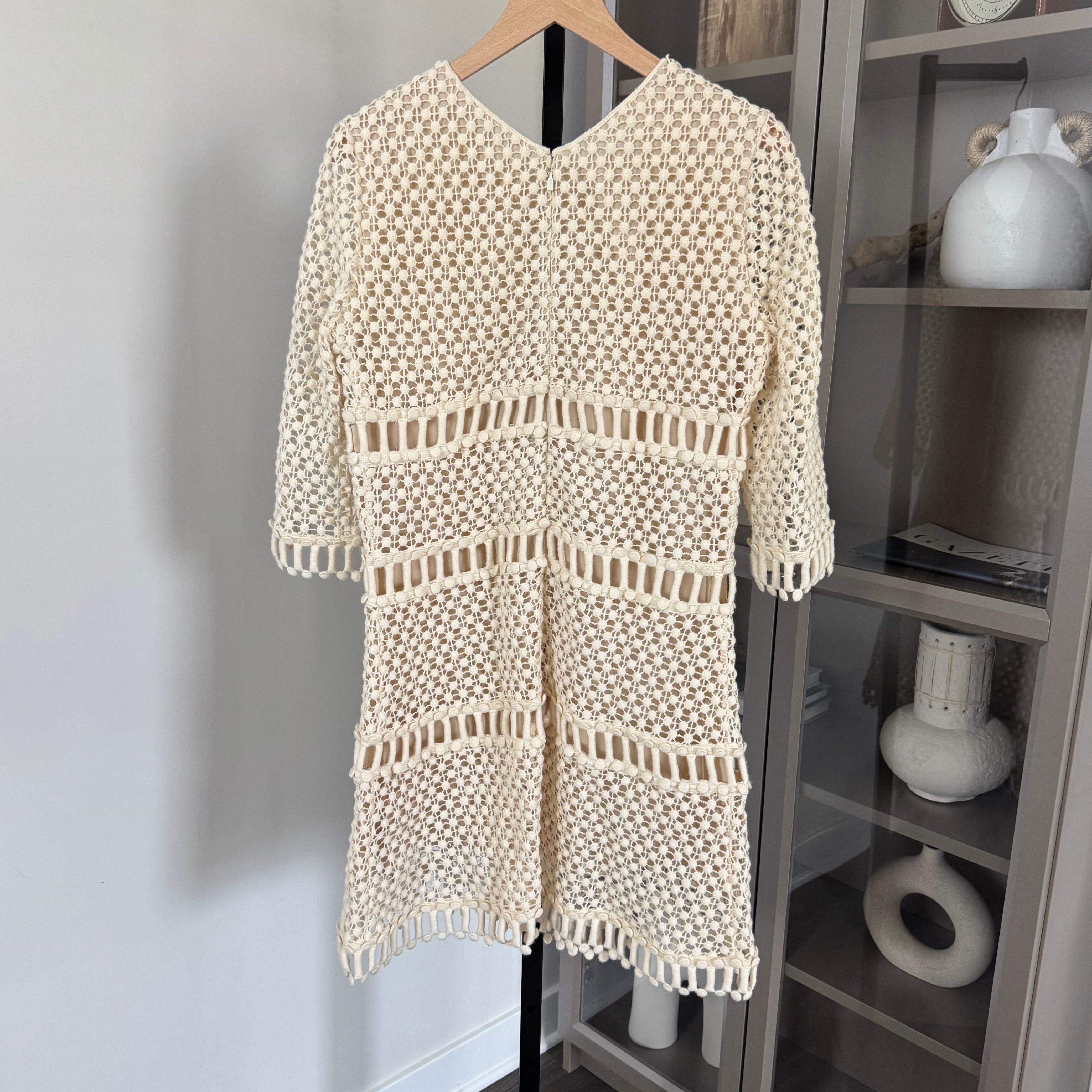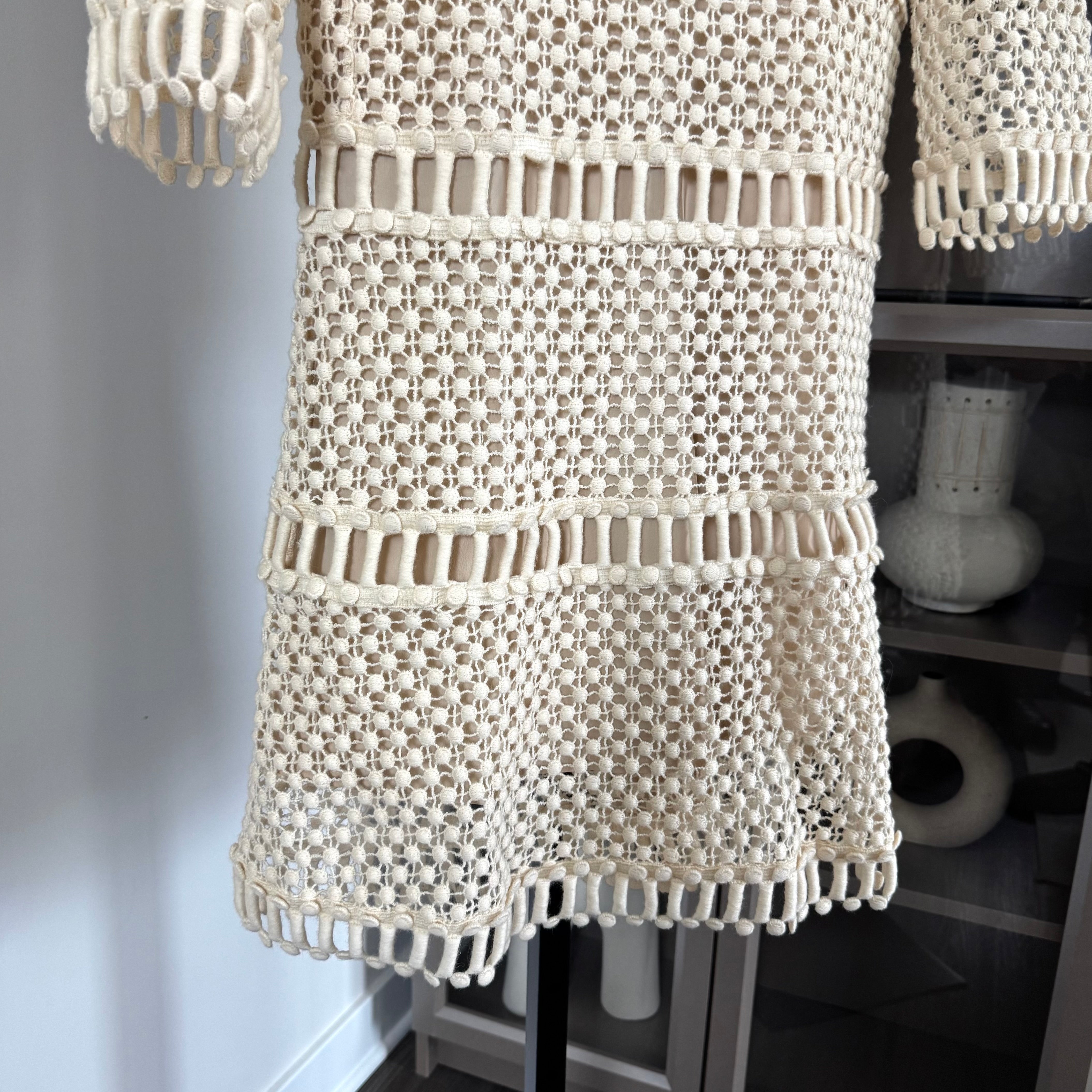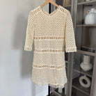 Chloe Ecru Vert Crochet Textured Pattern Knit V-Neckline Mini Dress