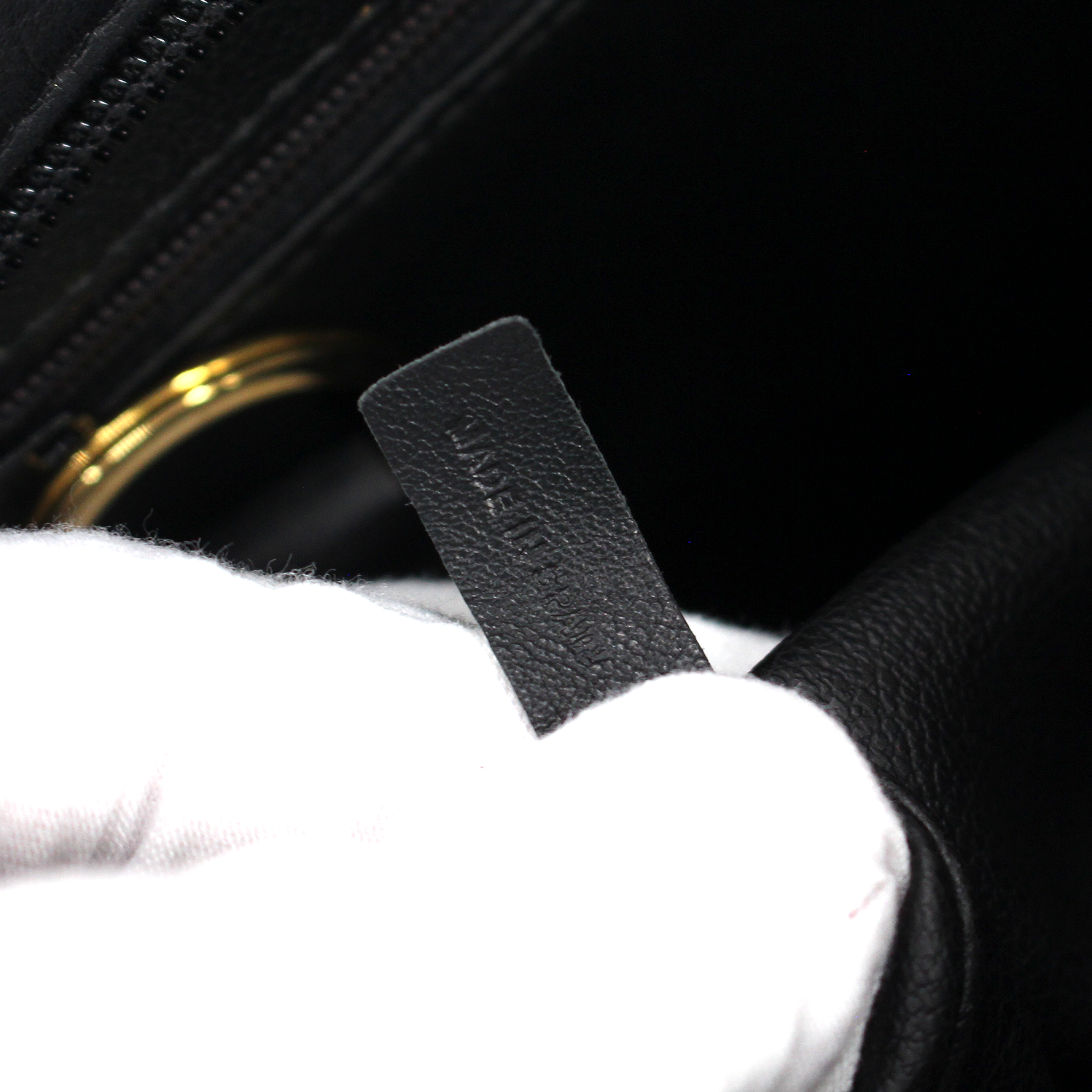 - Zipper top closure with gold logo charm pull
