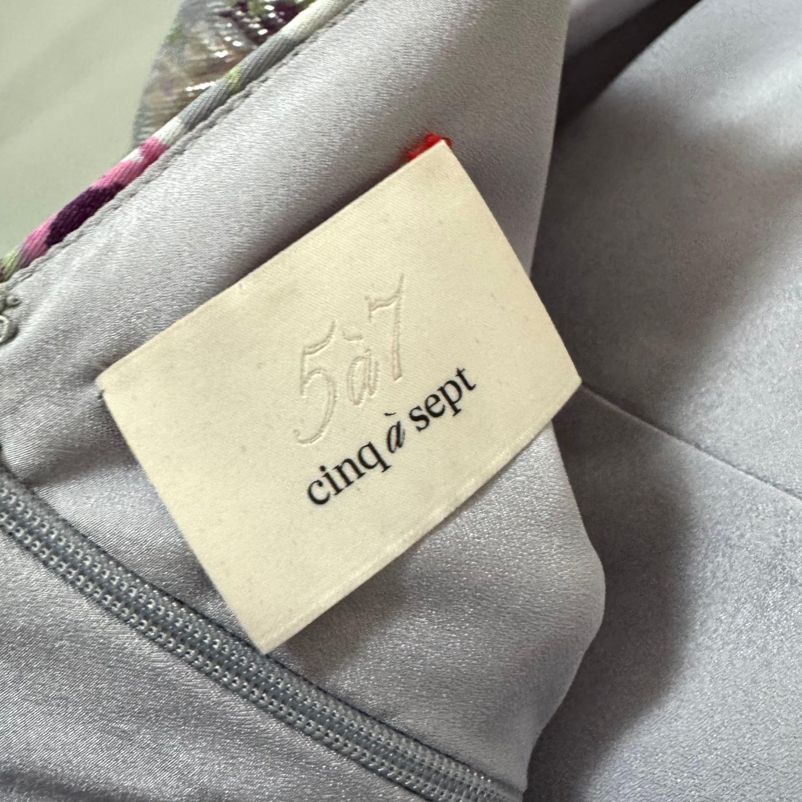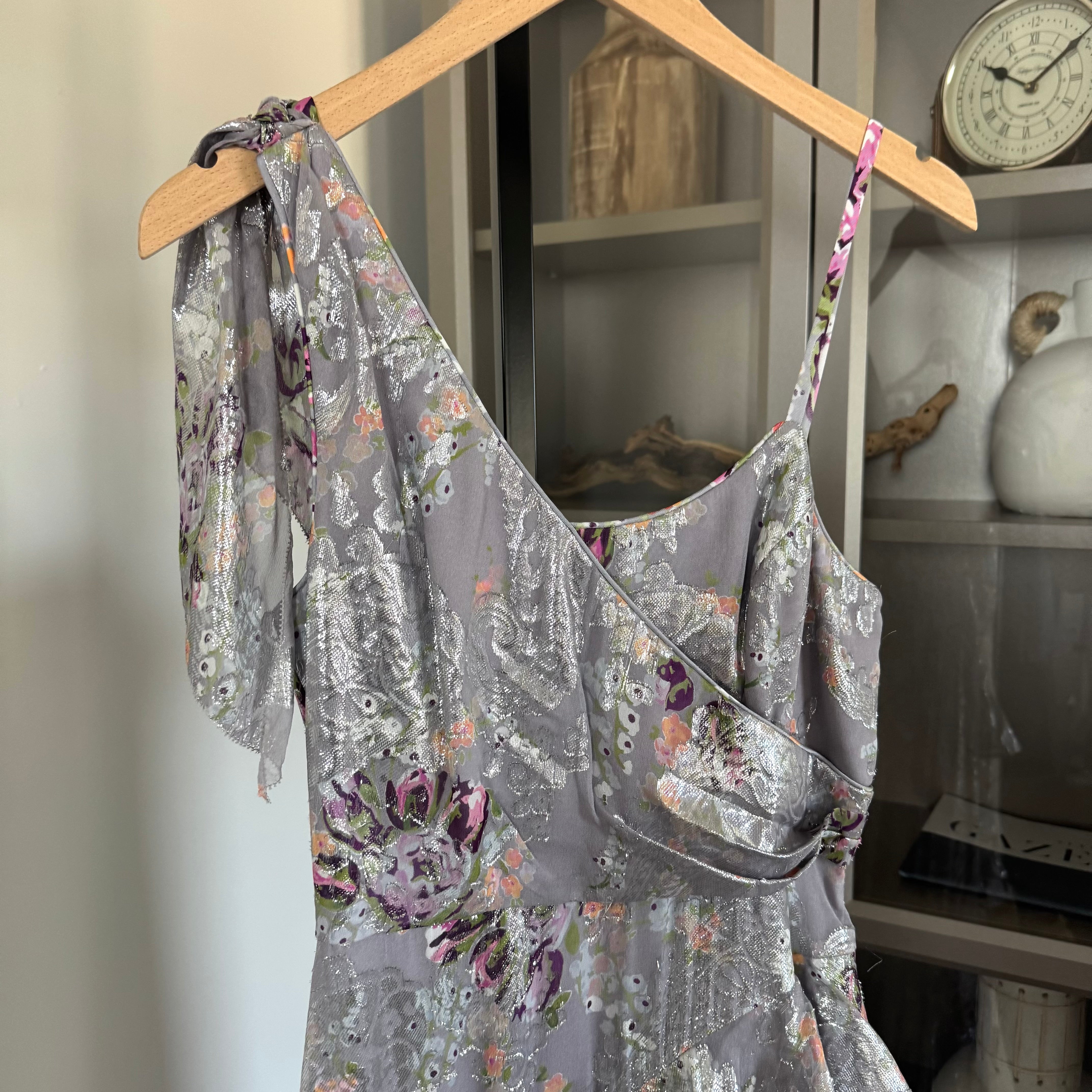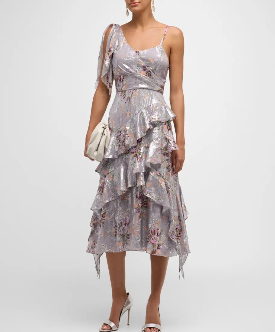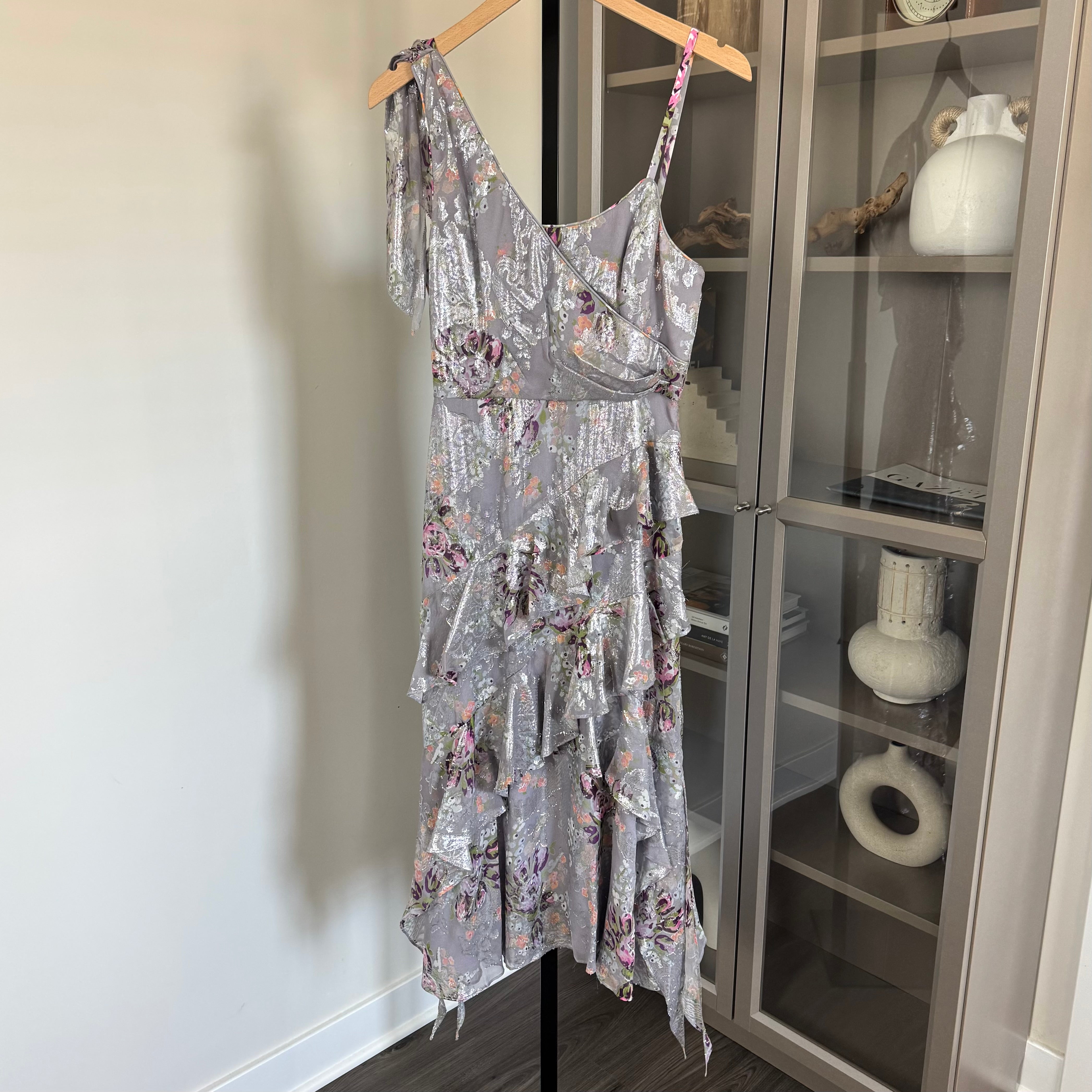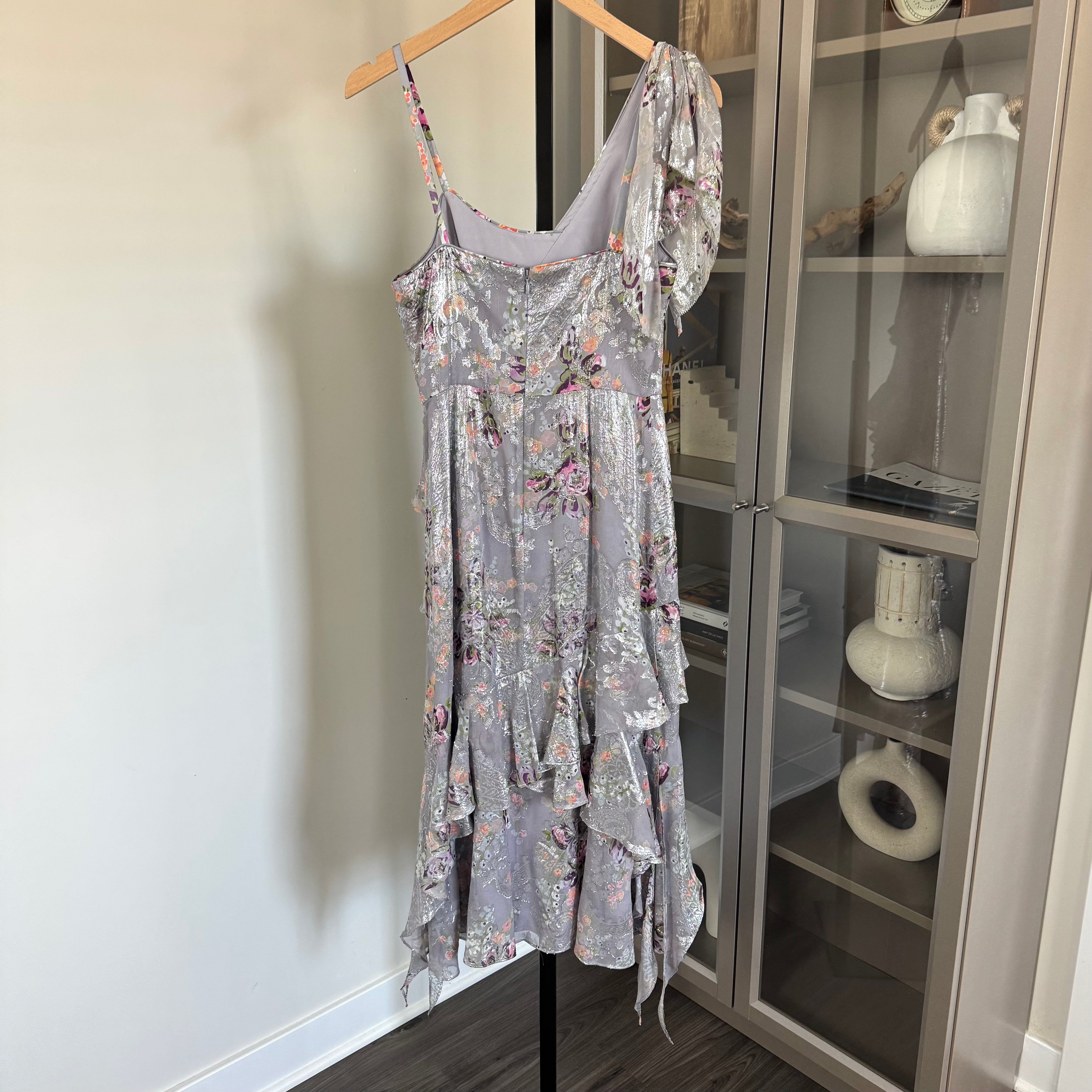 Cinq A Sept Trevor Silver Metallic Floral Print Ruffle Asymmetrical Hem Midi Dress