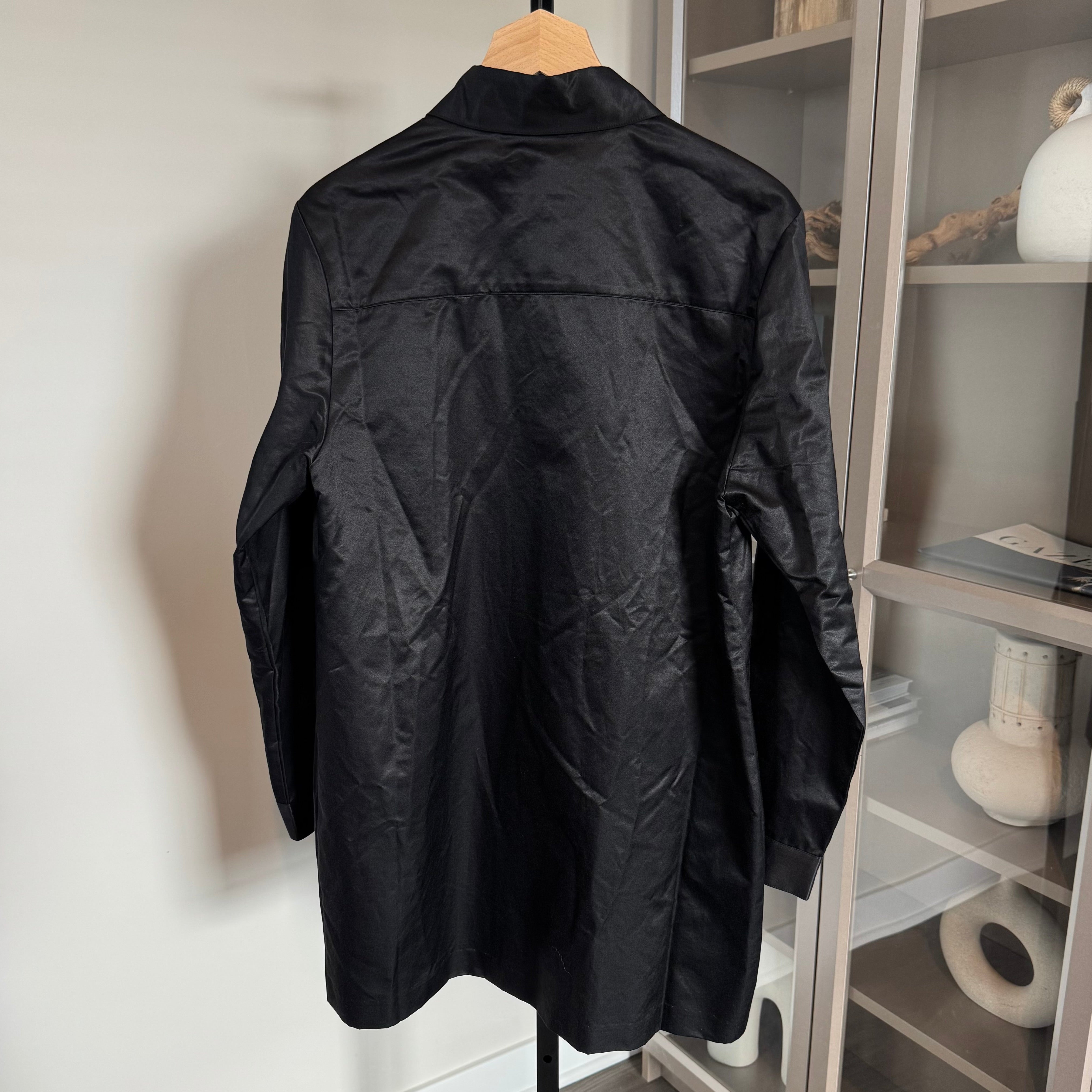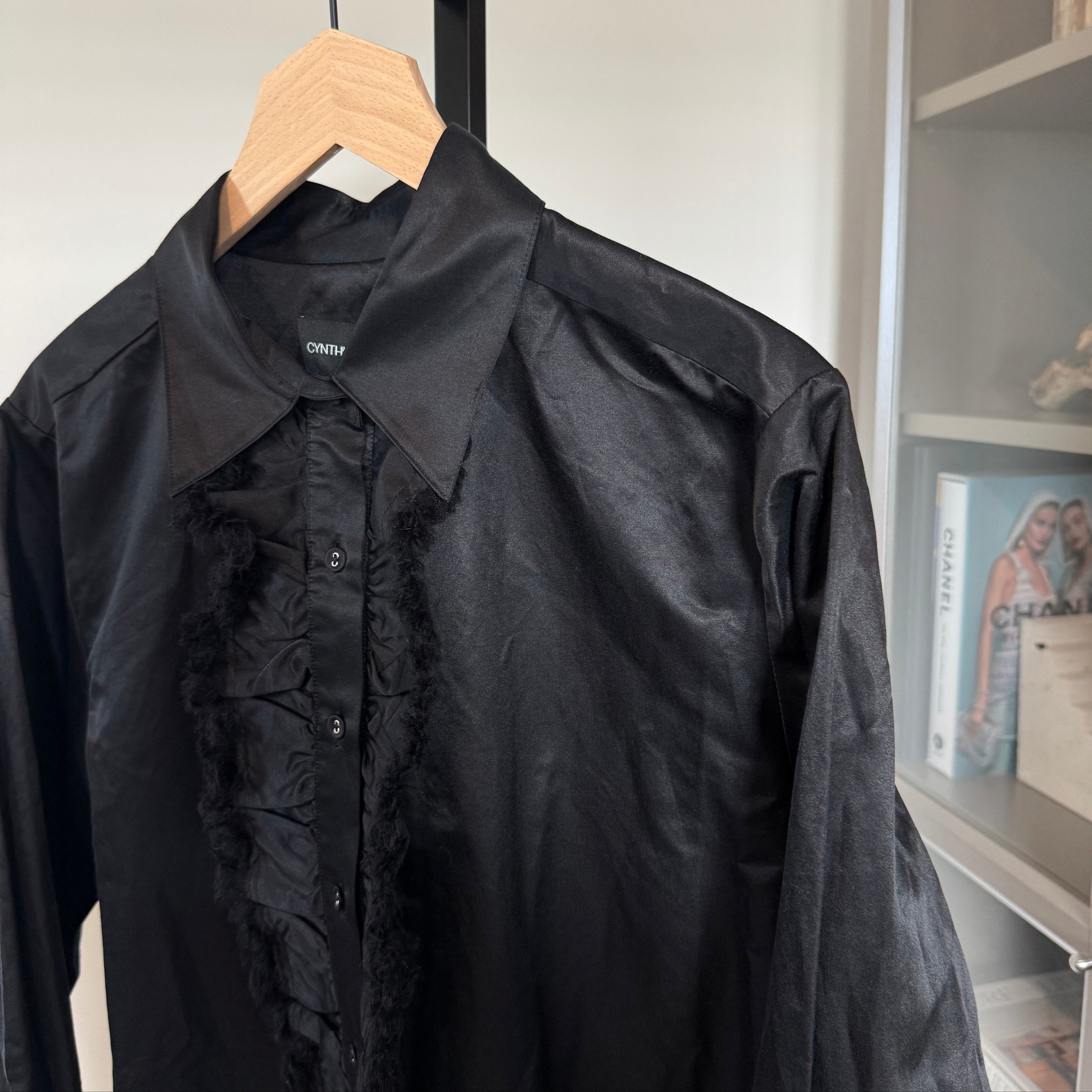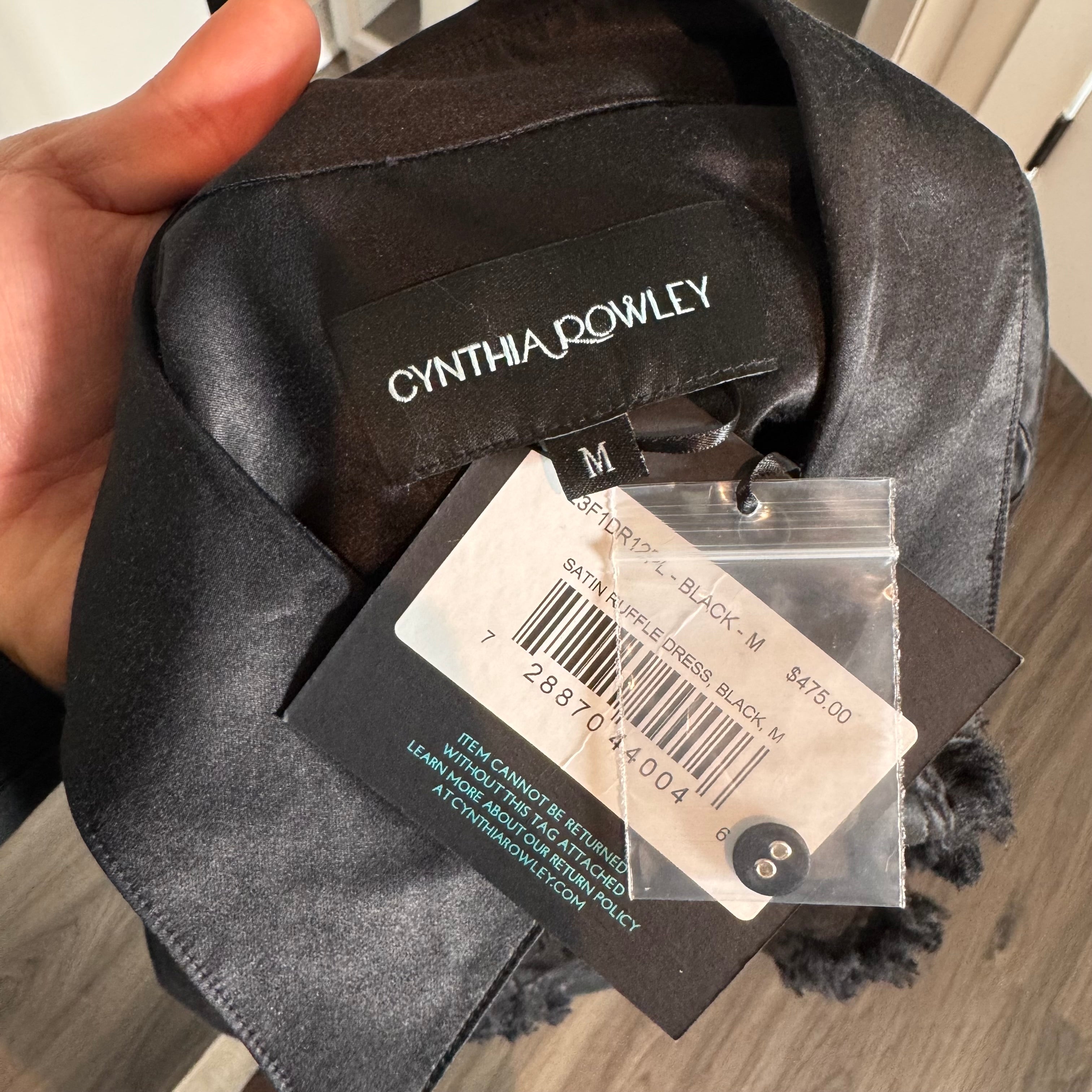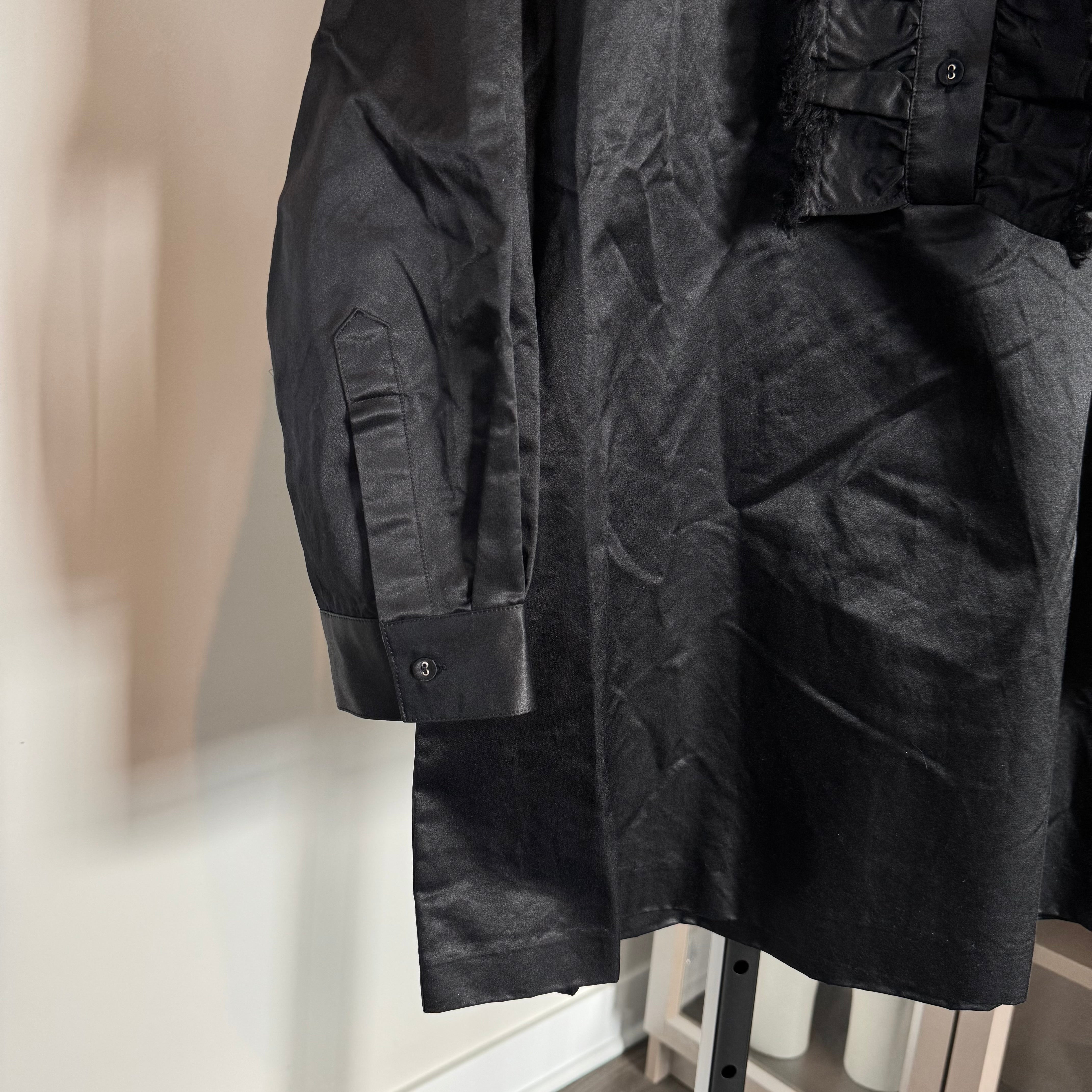 Cynthia Rowley Charlotte Black Satin Button Ruffle Bib Long Sleeve Mini Dress