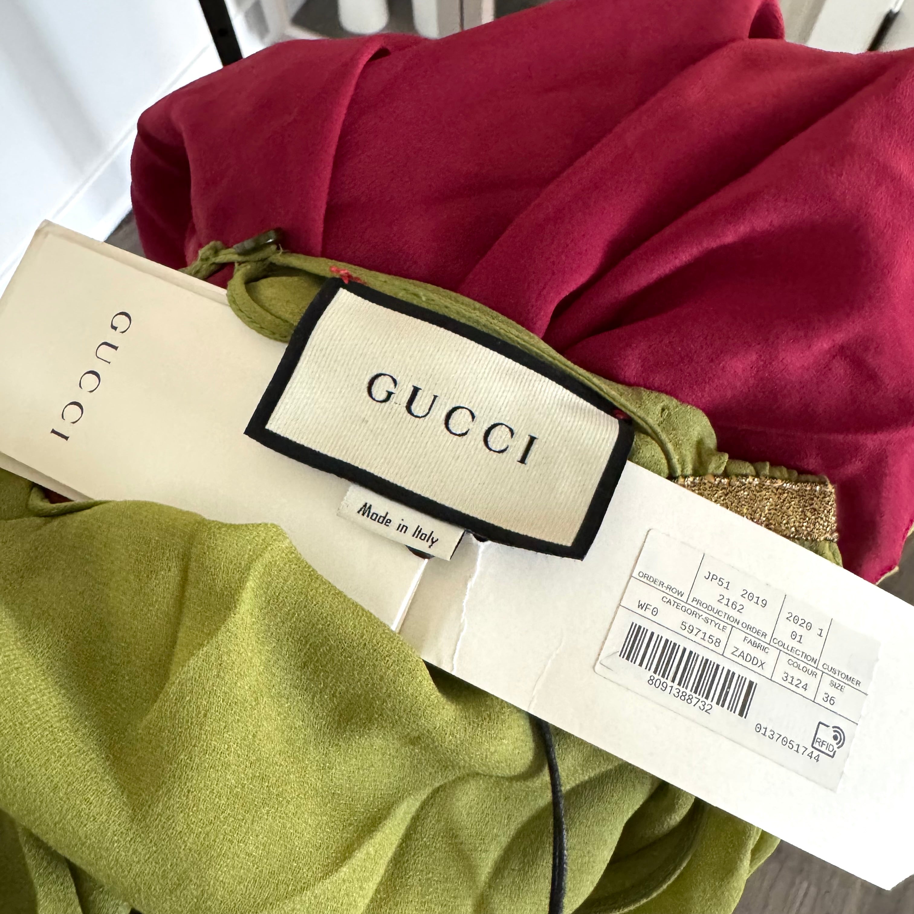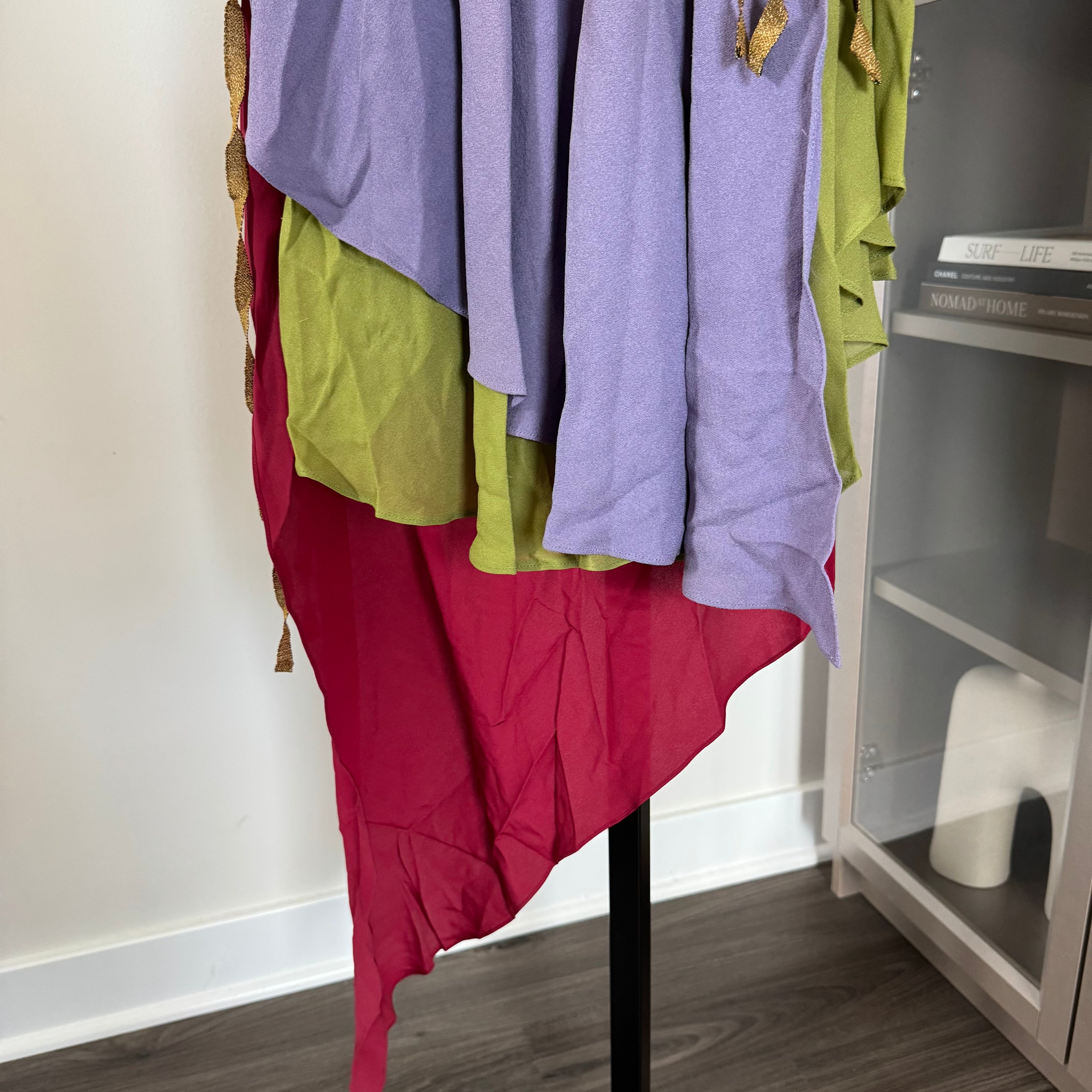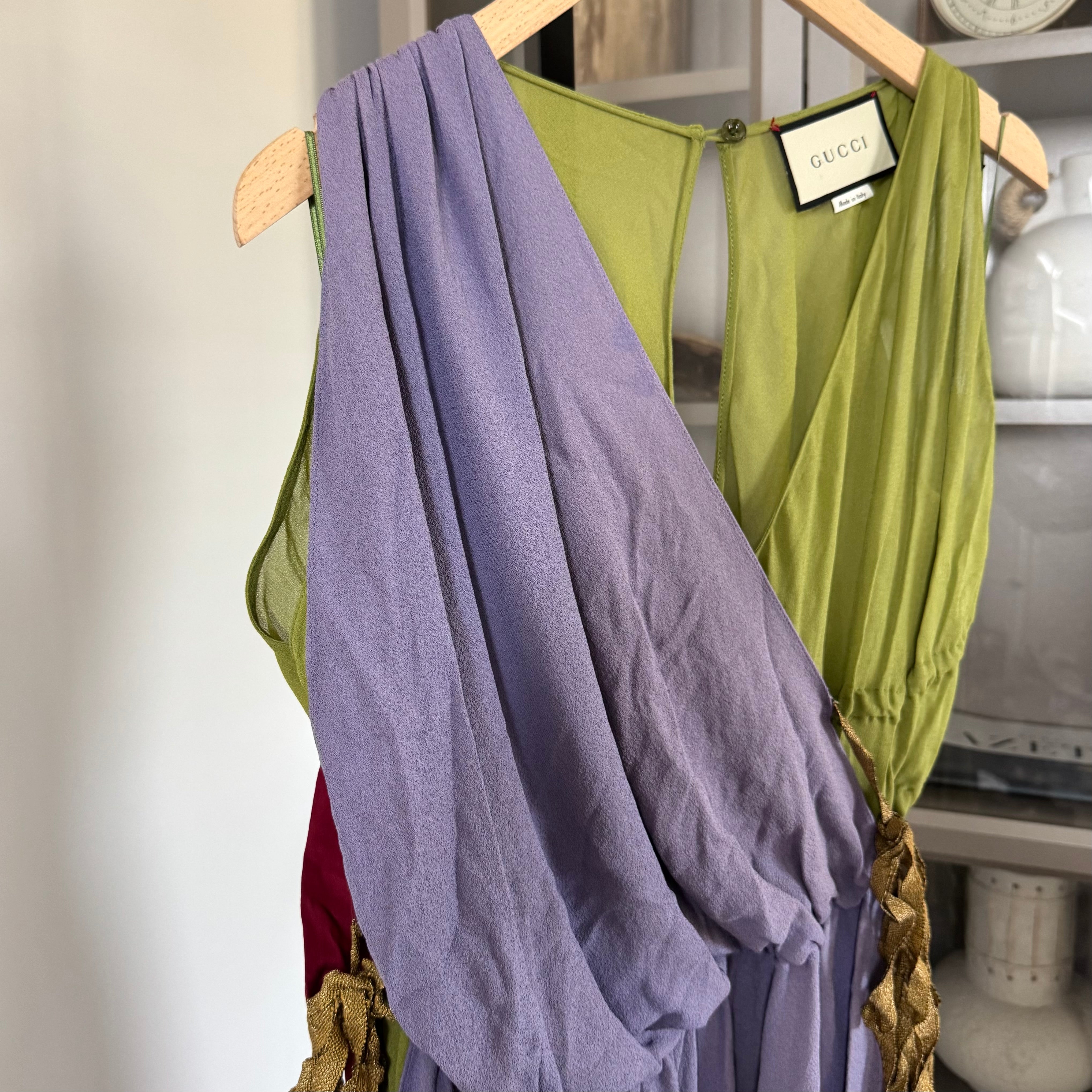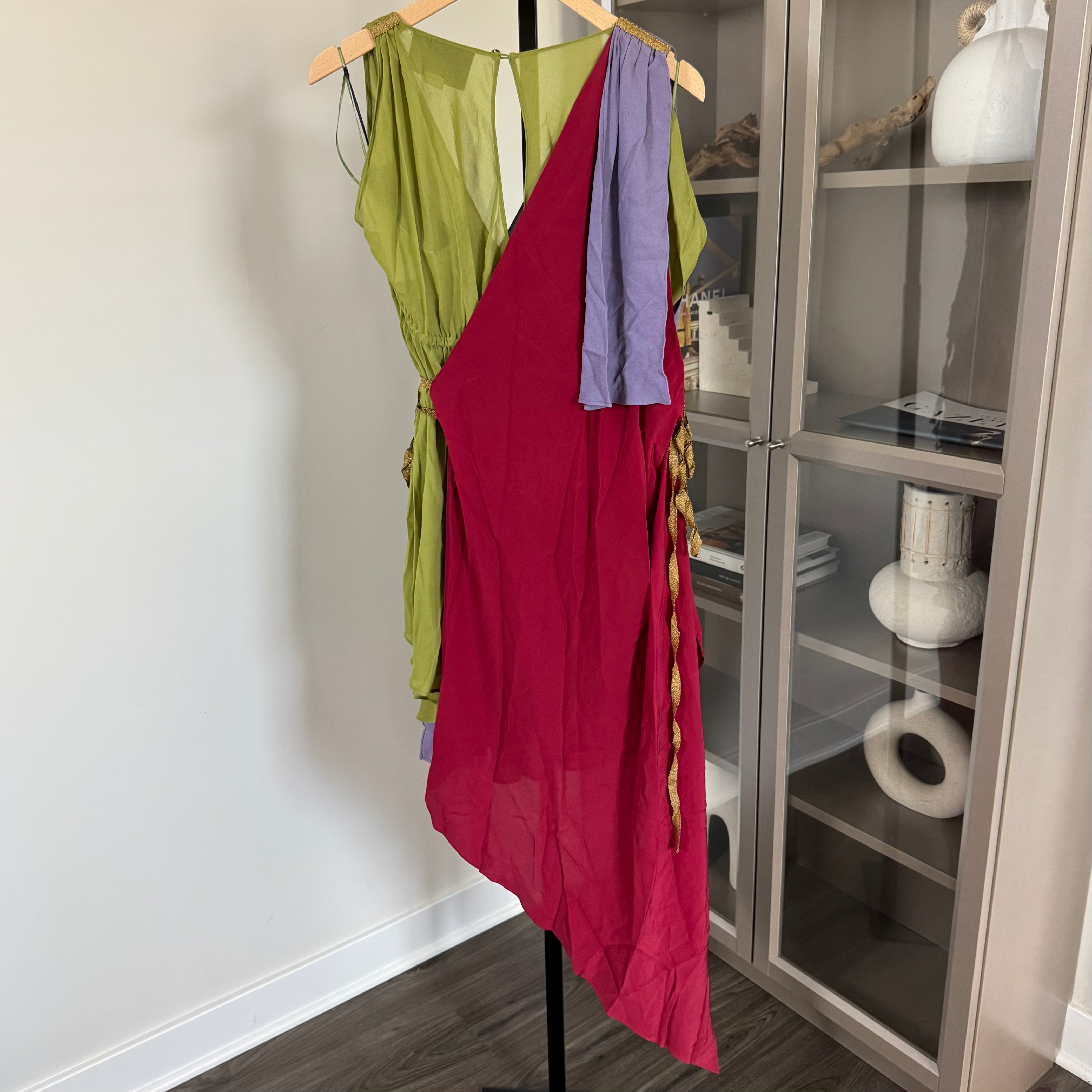 Gucci Multicolor Silk Sleeveless Asymmetrical Gold Metallic Ribbon Dress