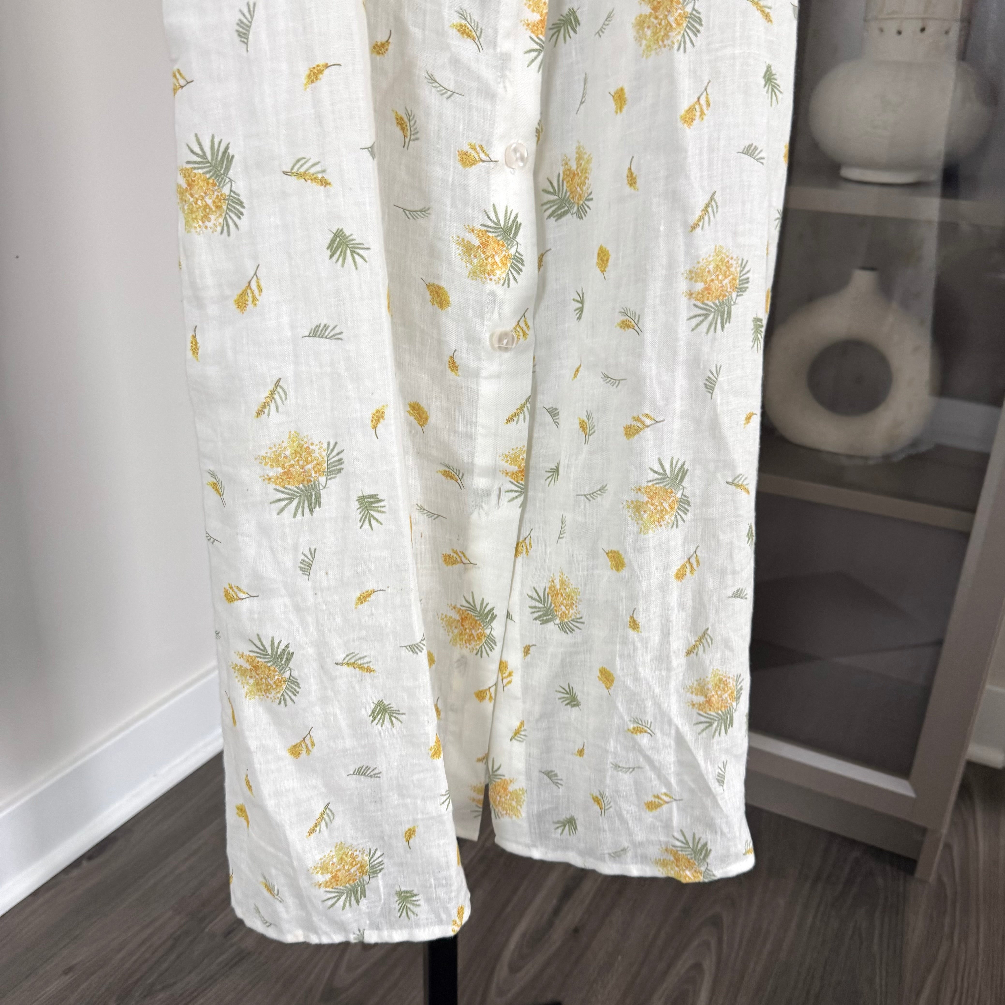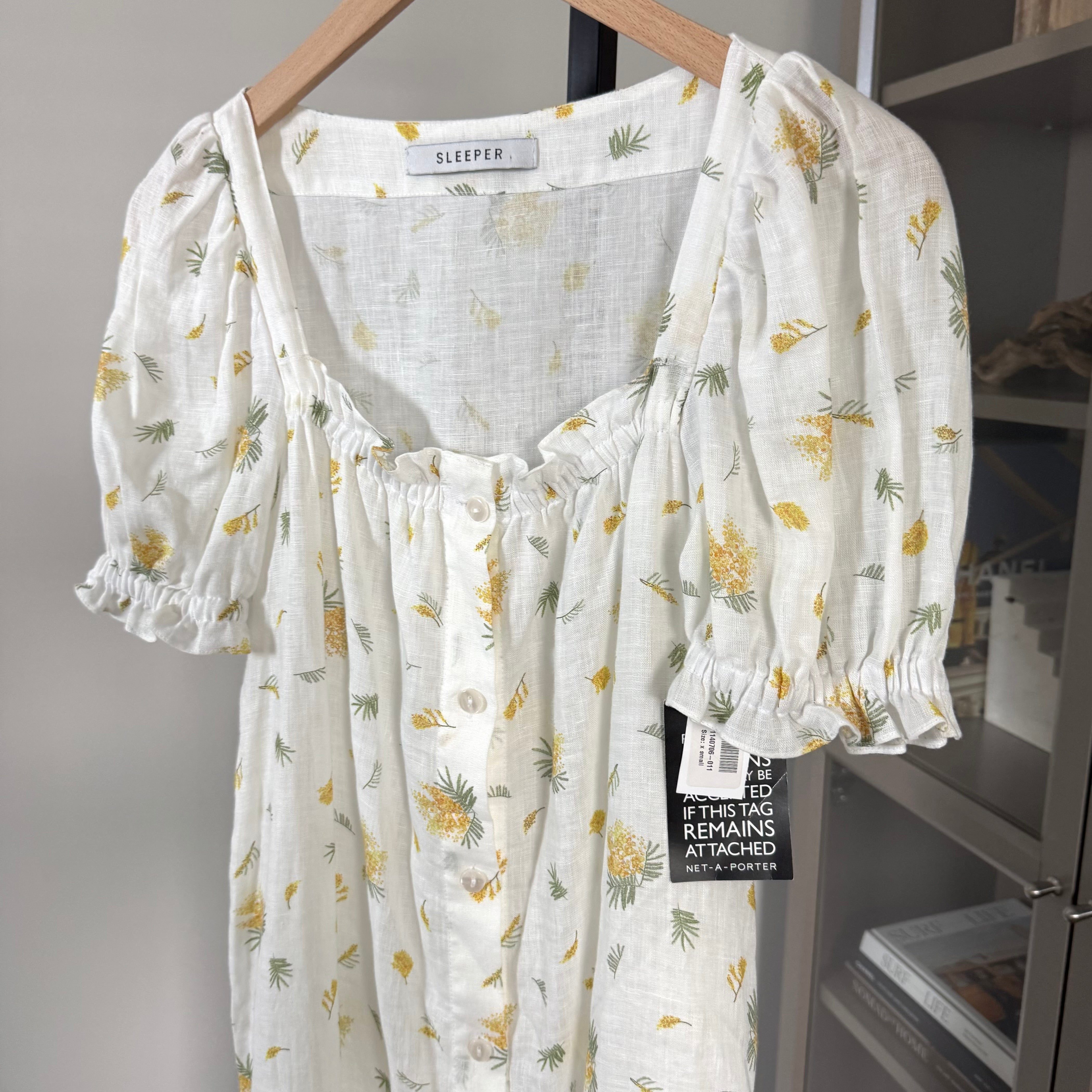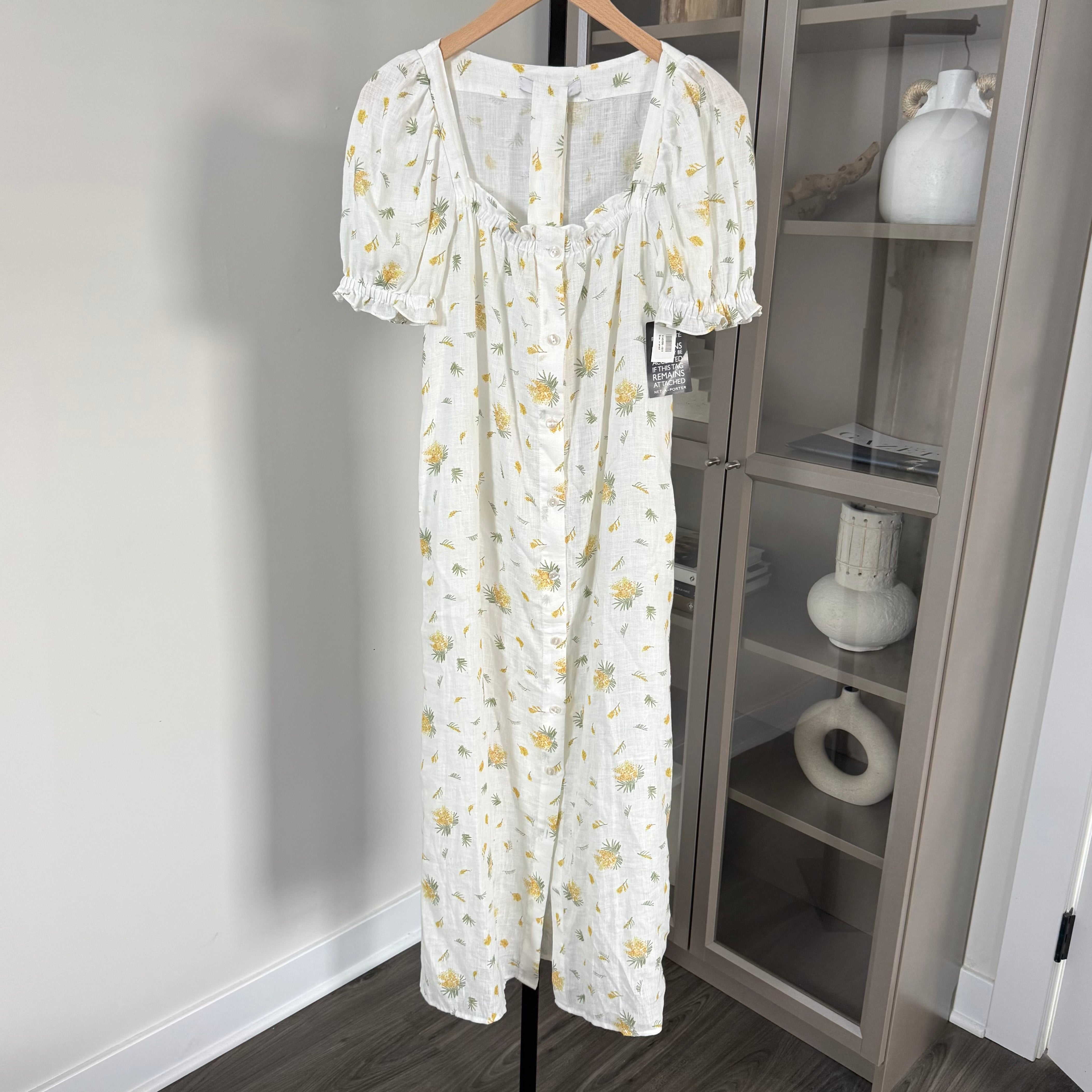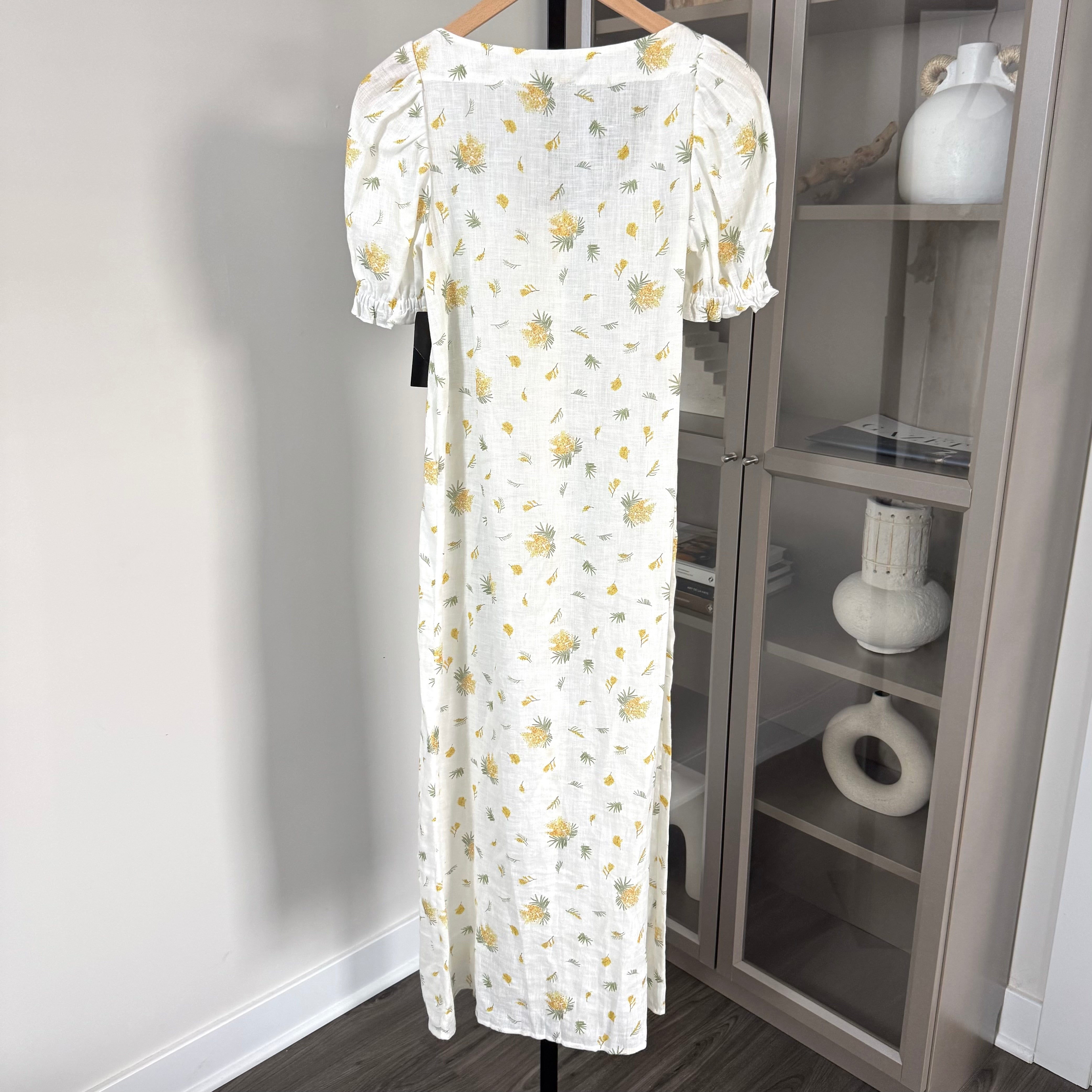 Sleeper Brigitte Linen White Yellow Floral Mimosa Puff Sleeve Midi Dress
