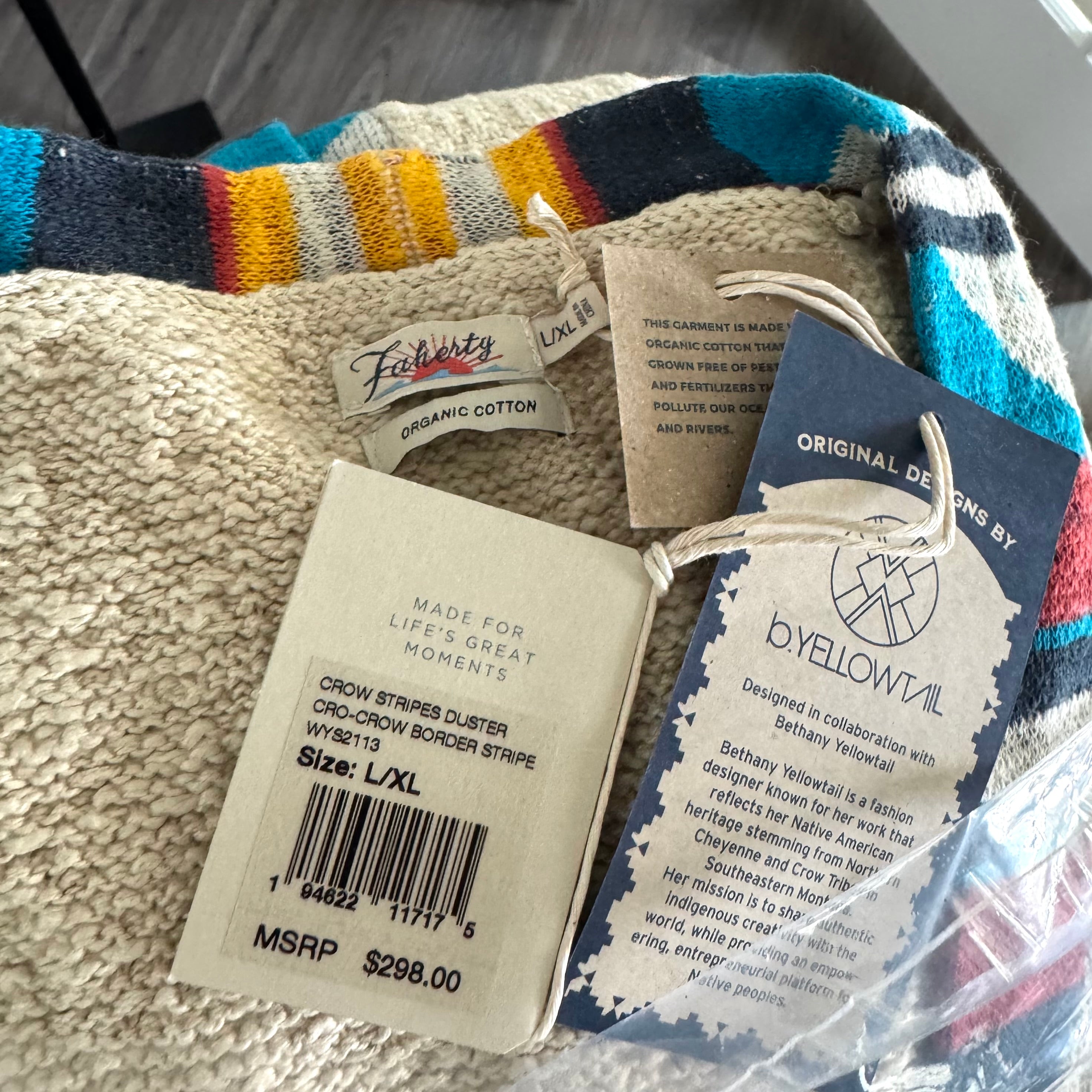 Faherty Crow Stripe Organic Cotton Multicolor Tie Belt Fringe Trim Duster Cardigan