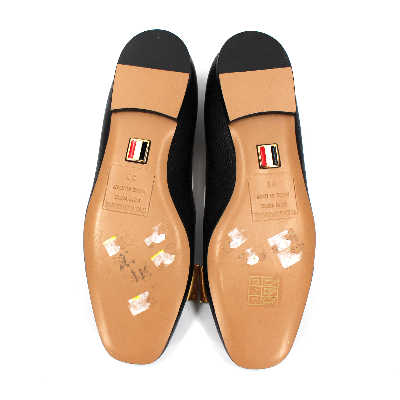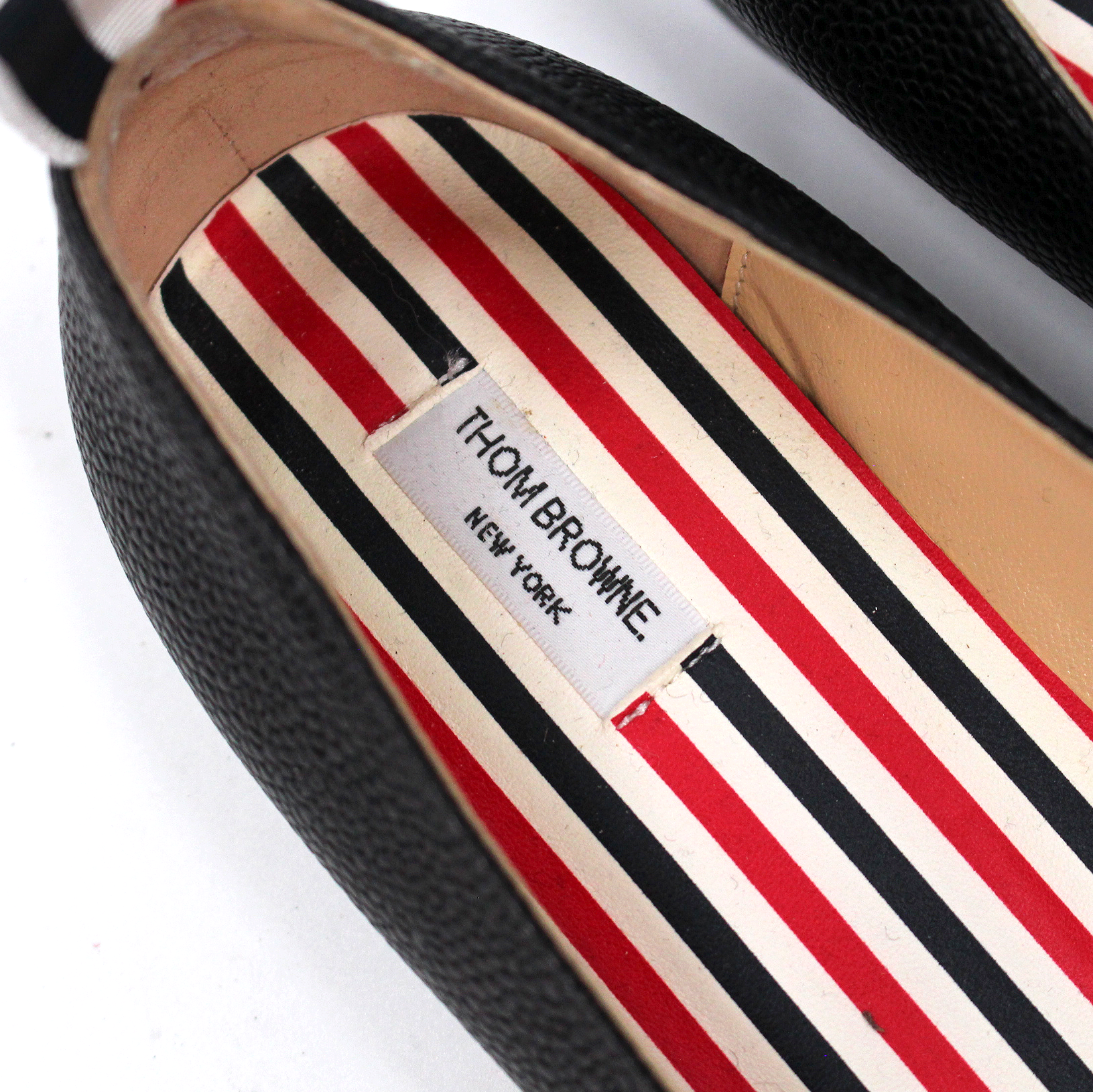 Thom Browne Apron Toe Black Pebbled Leather Striped Gold Tone Bow Flats