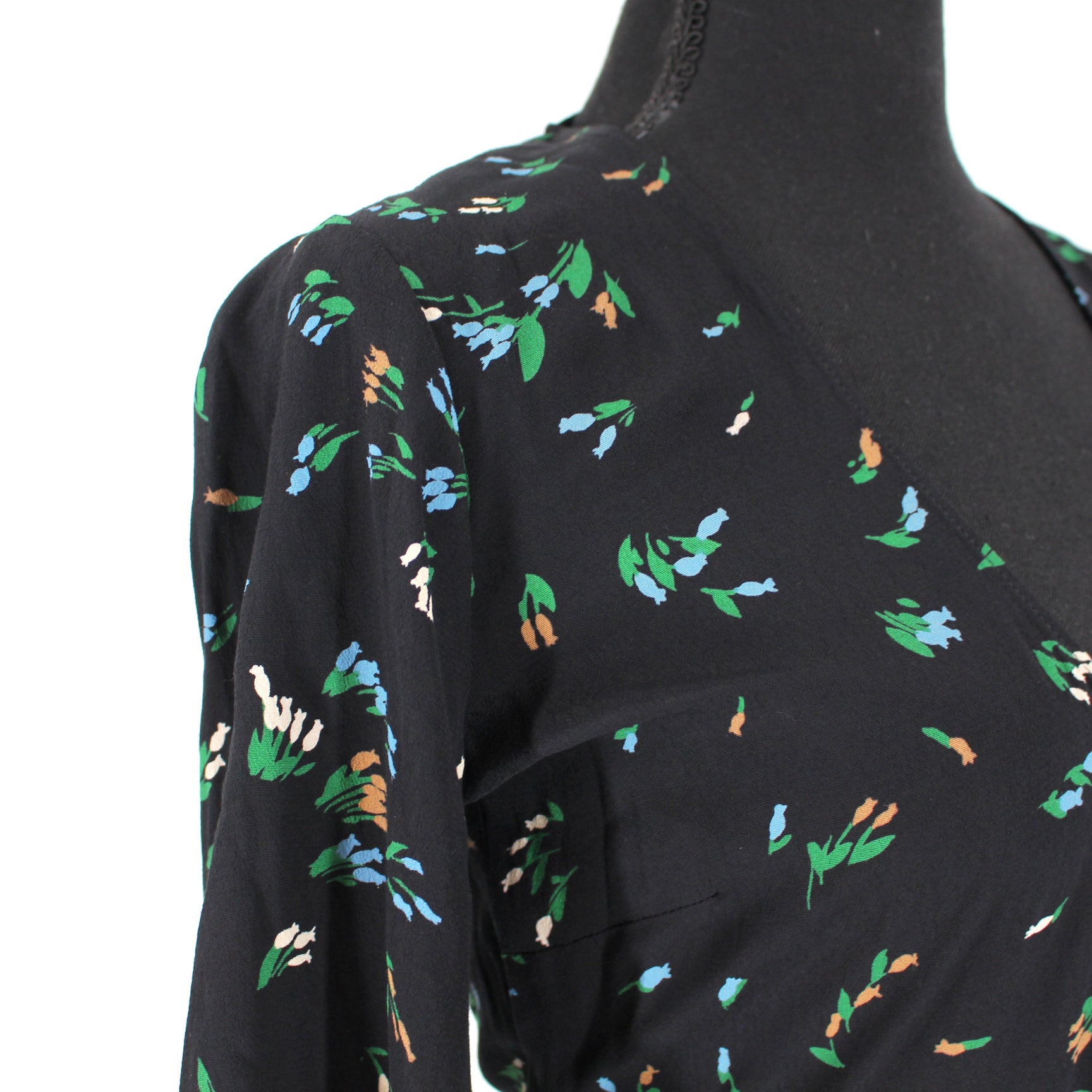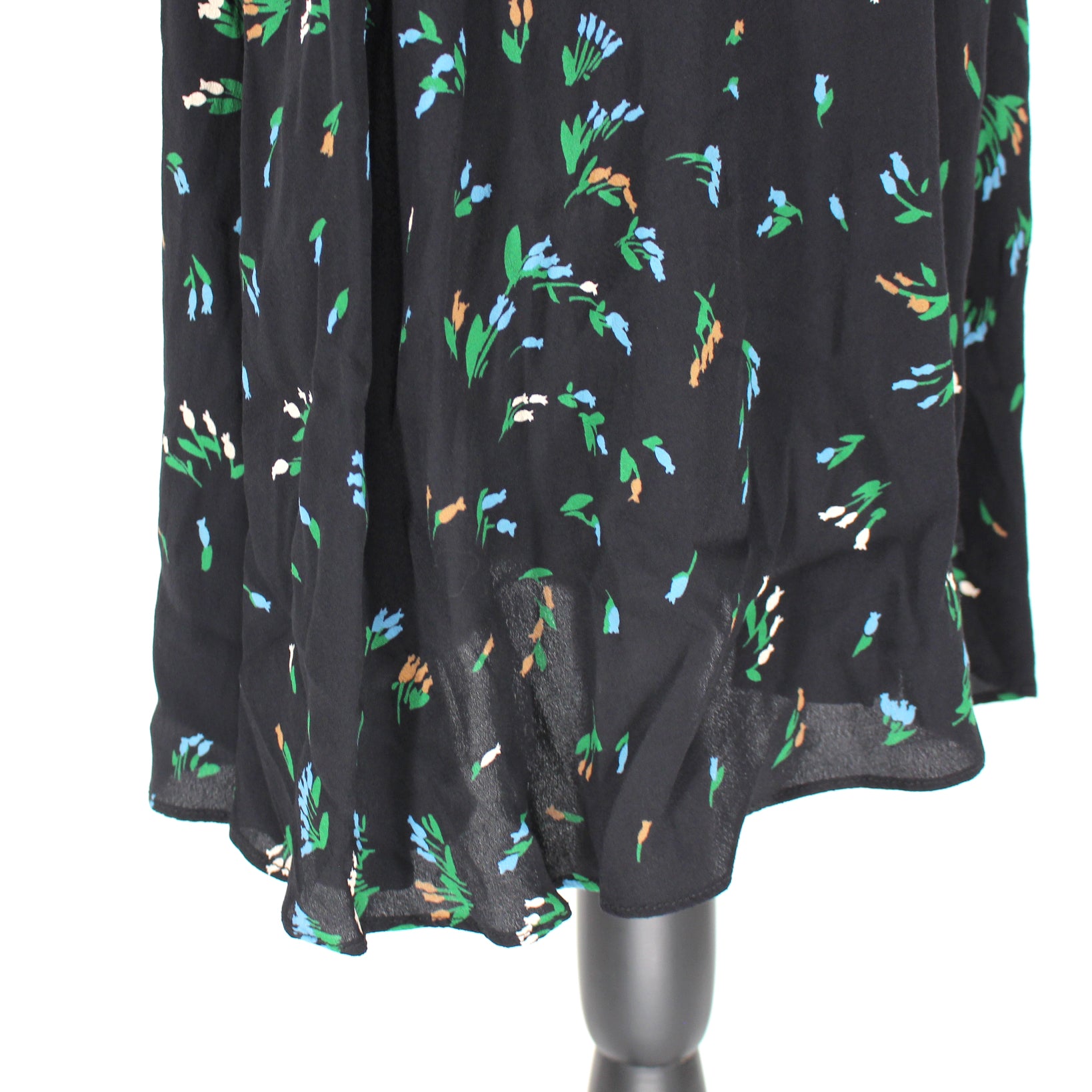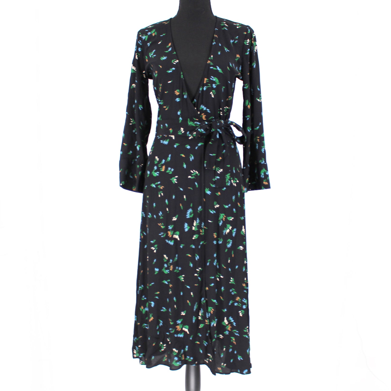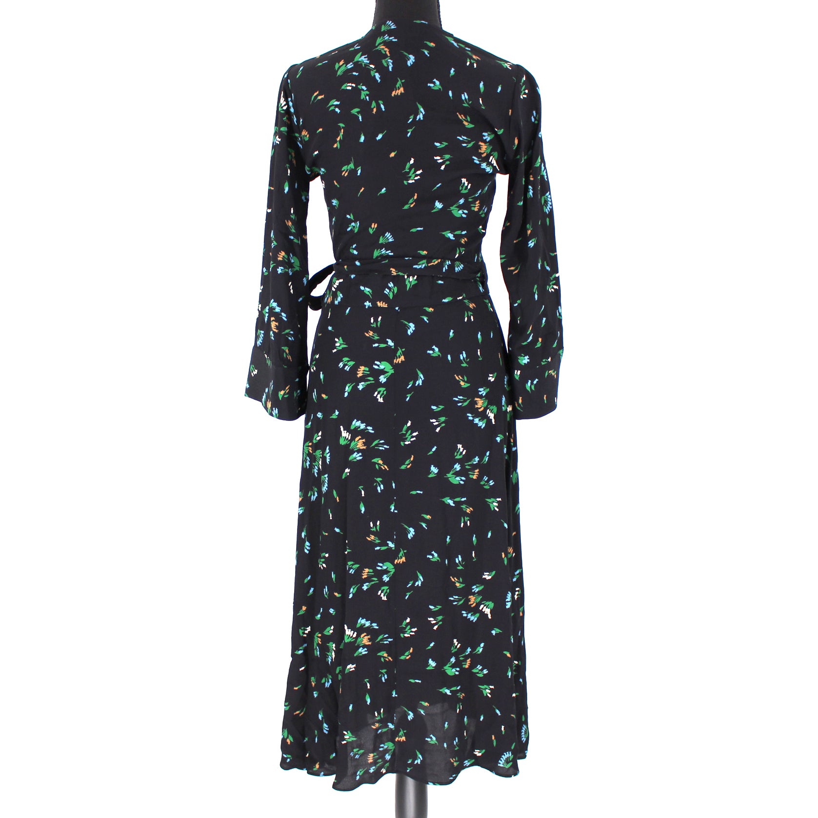 Ganni Black Viscose Floral Print Sash Tie True Wrap Midi Dress