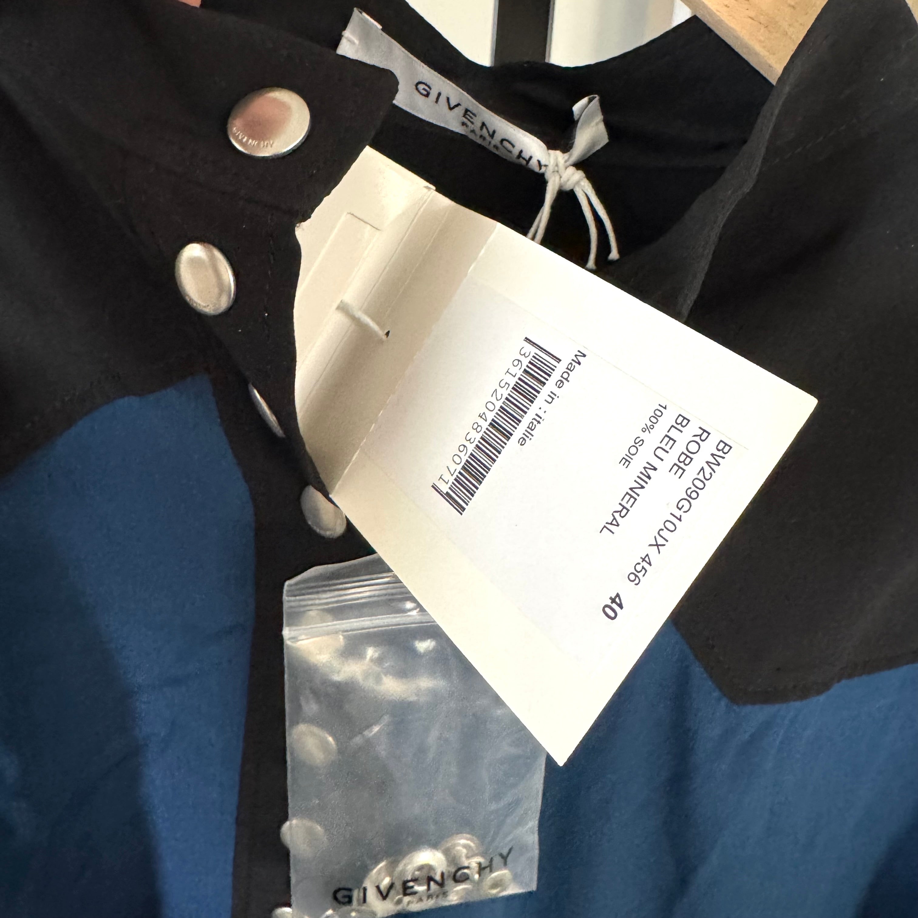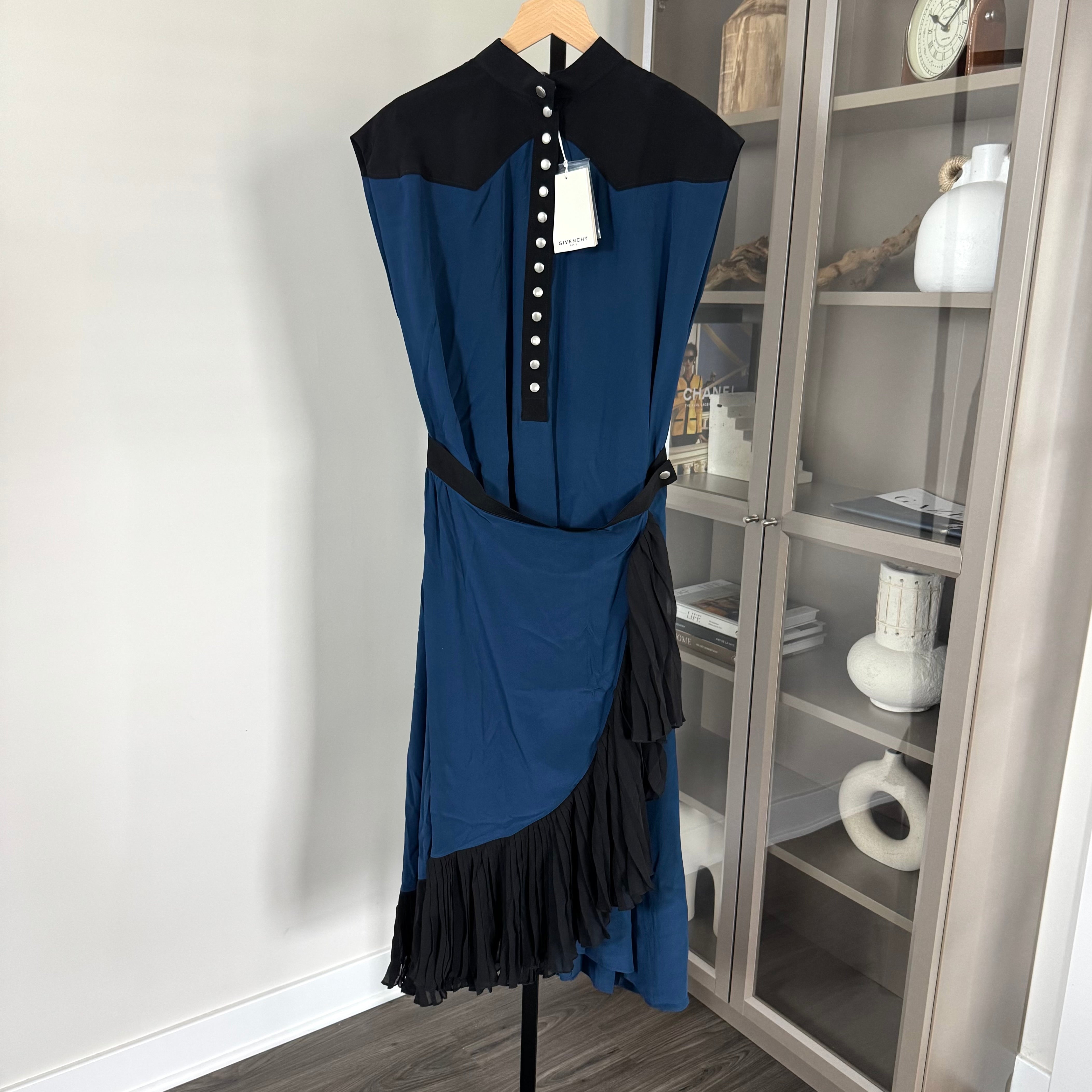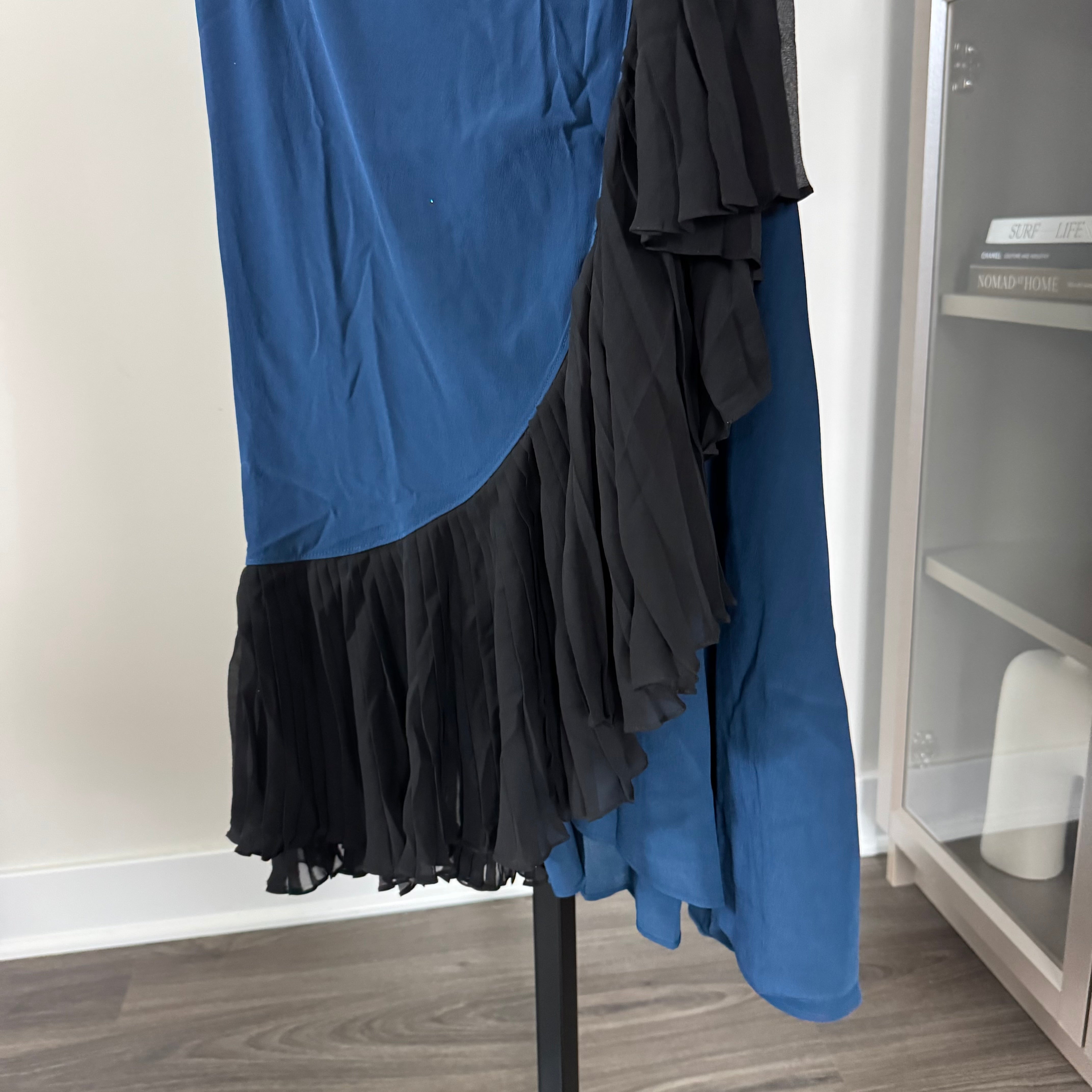 Givenchy Silk Color Block Black Blue Mineral Pleated Ruffle Wrap Midi Dress