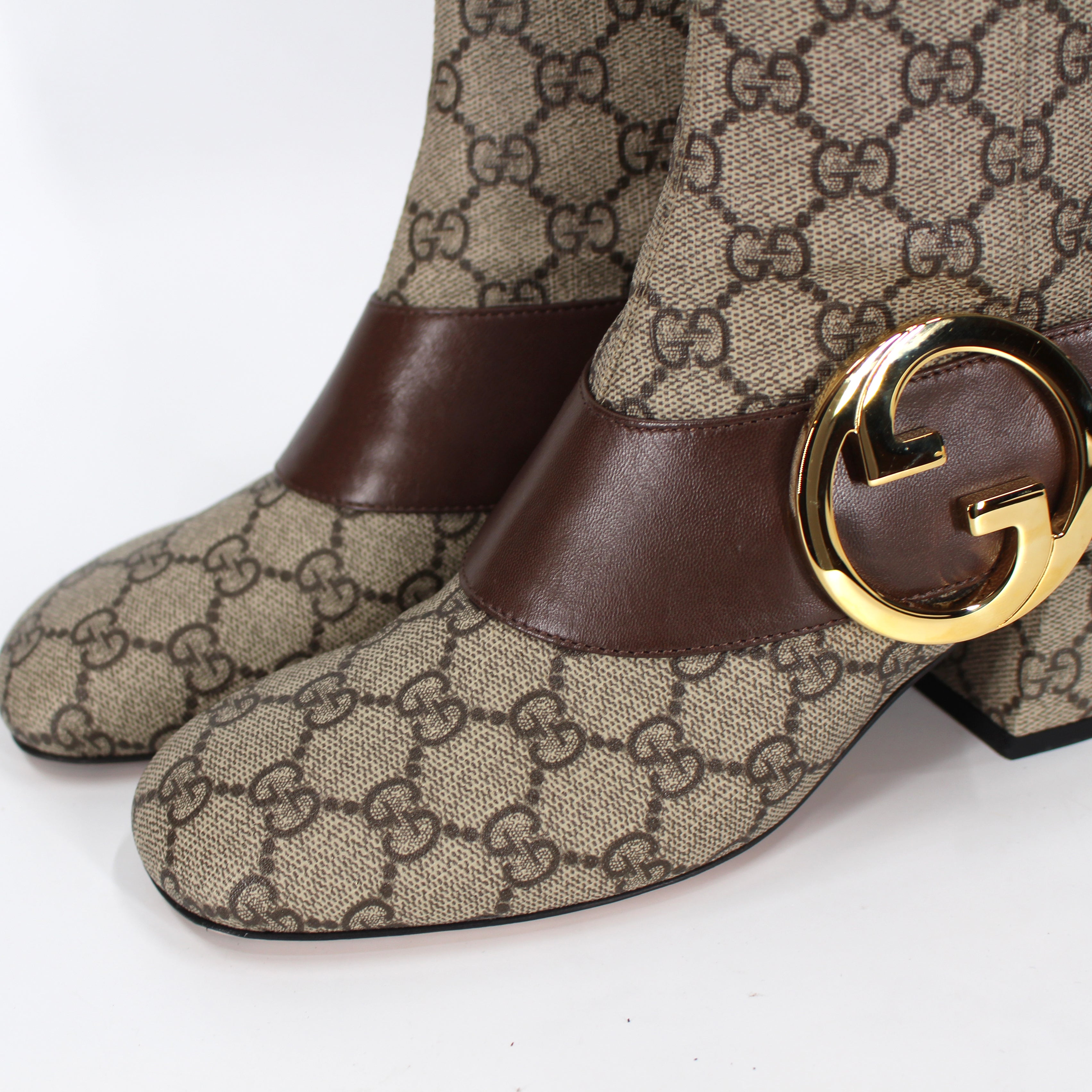GUCCI Blondie GG Supreme Beige Brown Leather Trim Canvas Ankle Booties