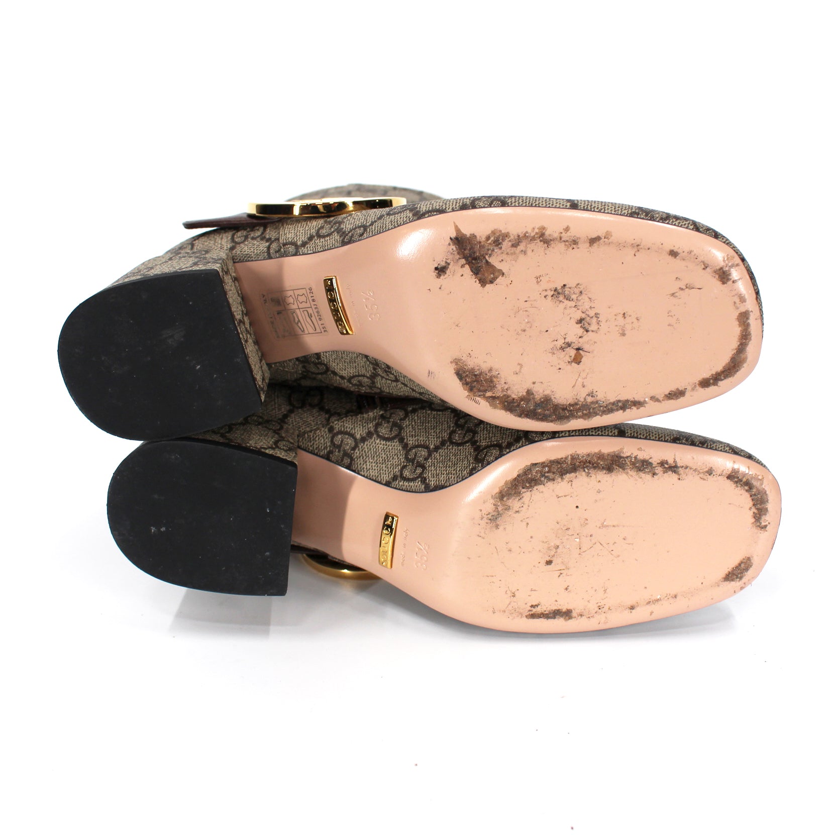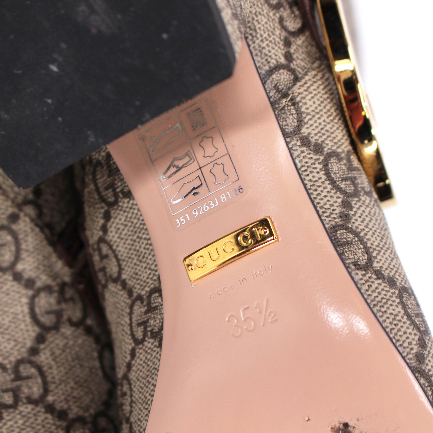 - Leather strap across vamp with gold tone monogram plaque