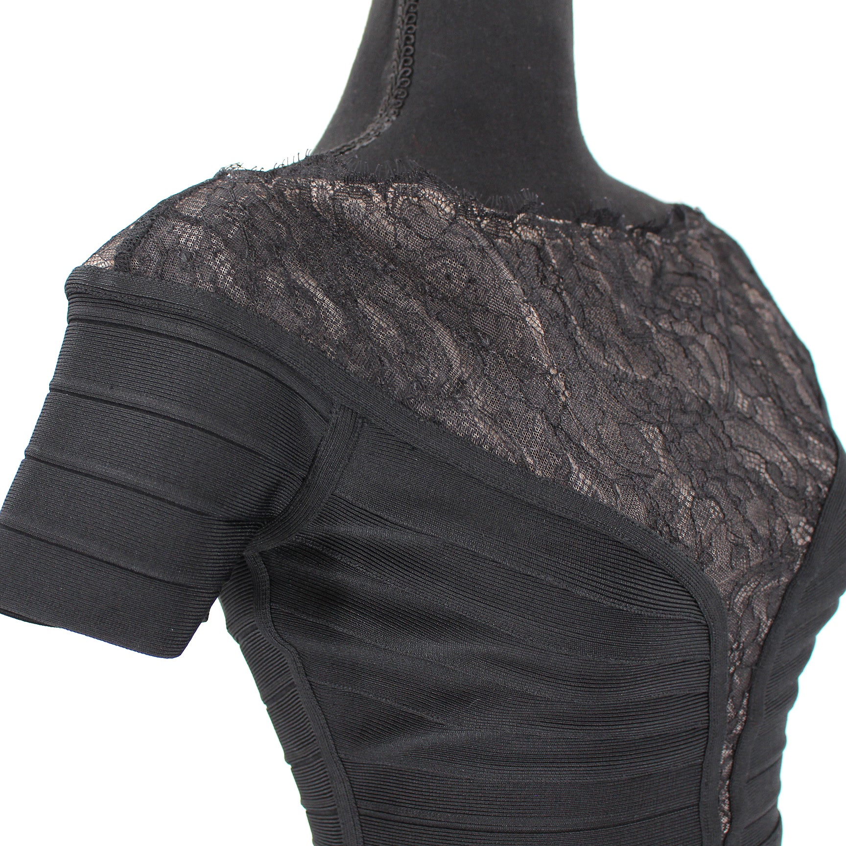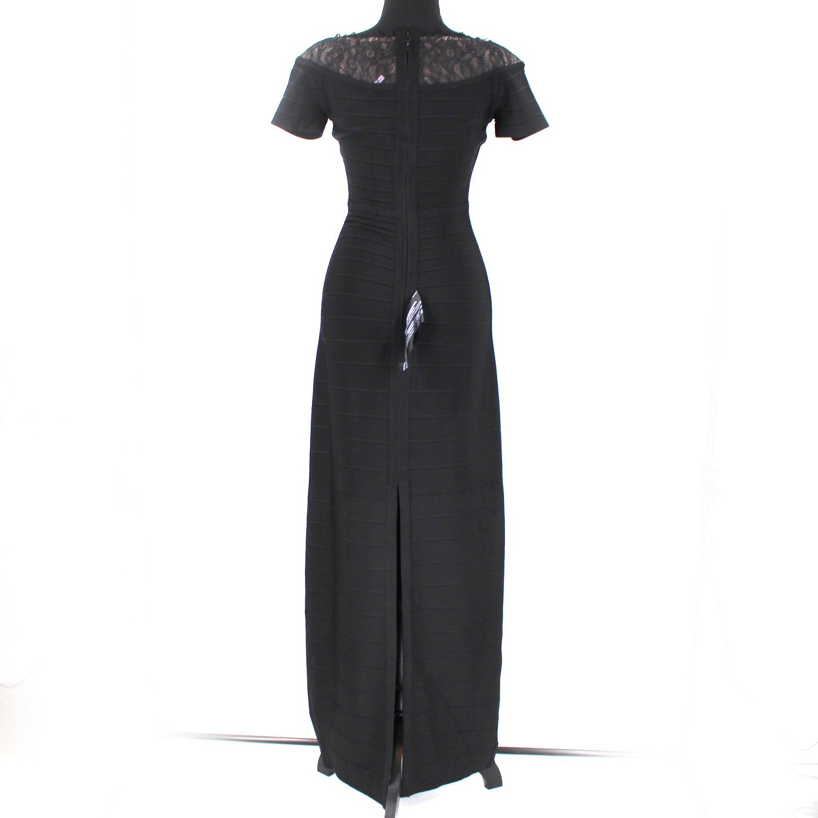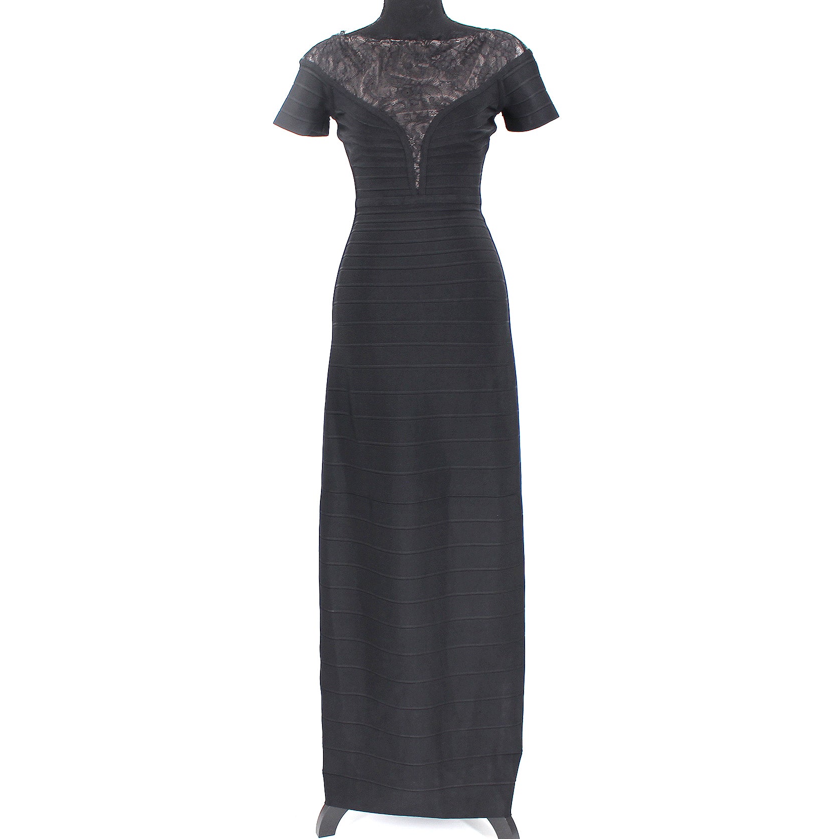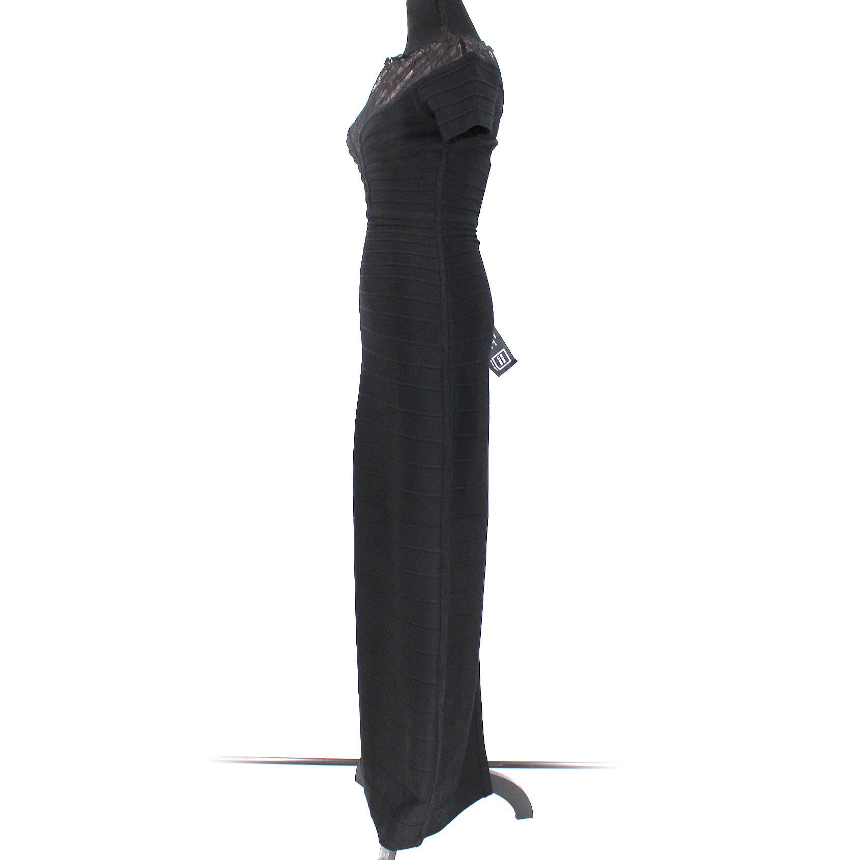 Herve Leger Black Lace Trim Short Sleeve Boatneck Bodycon Evening Gown.