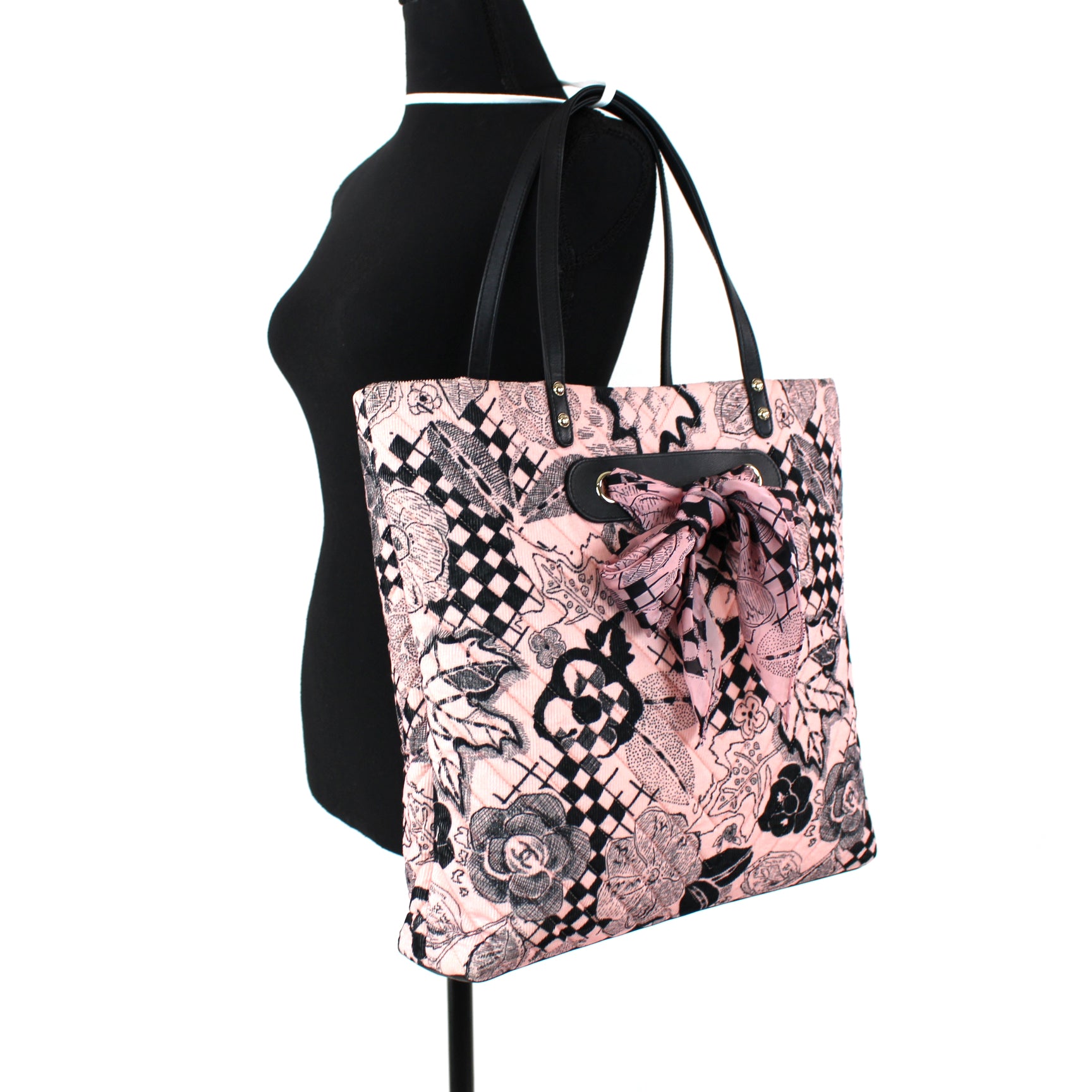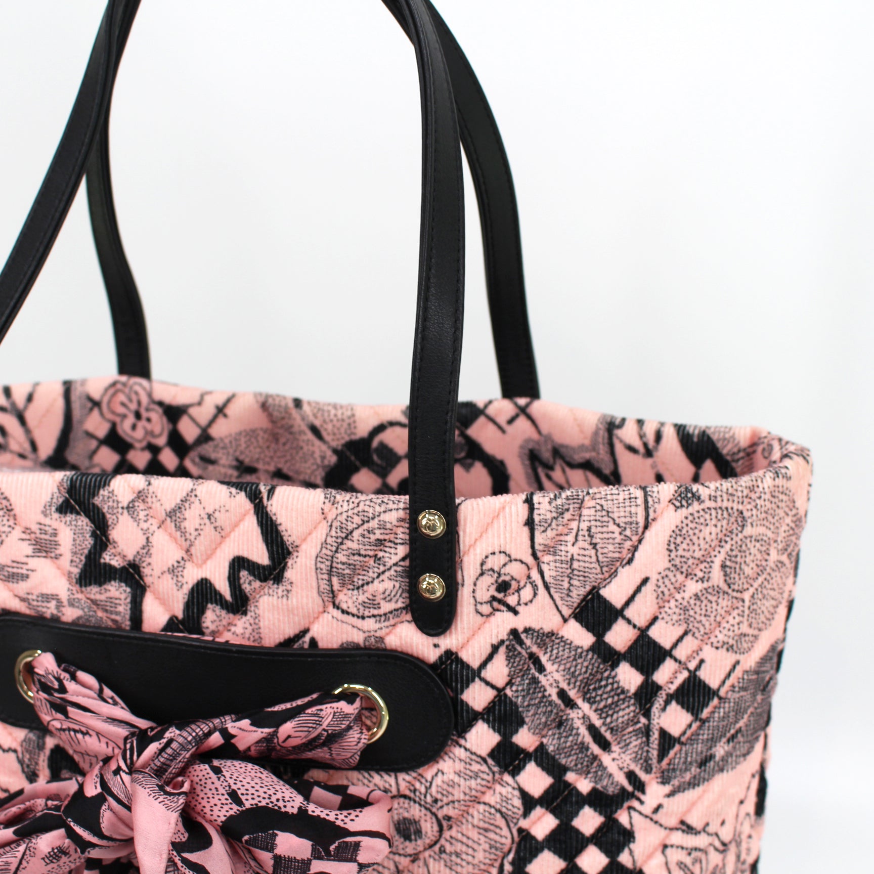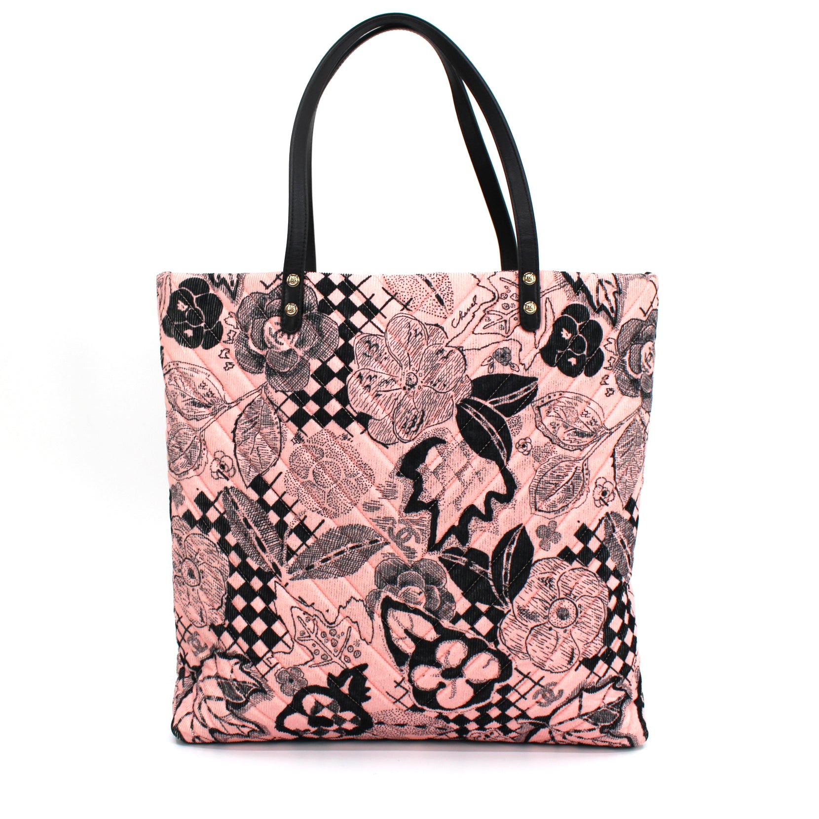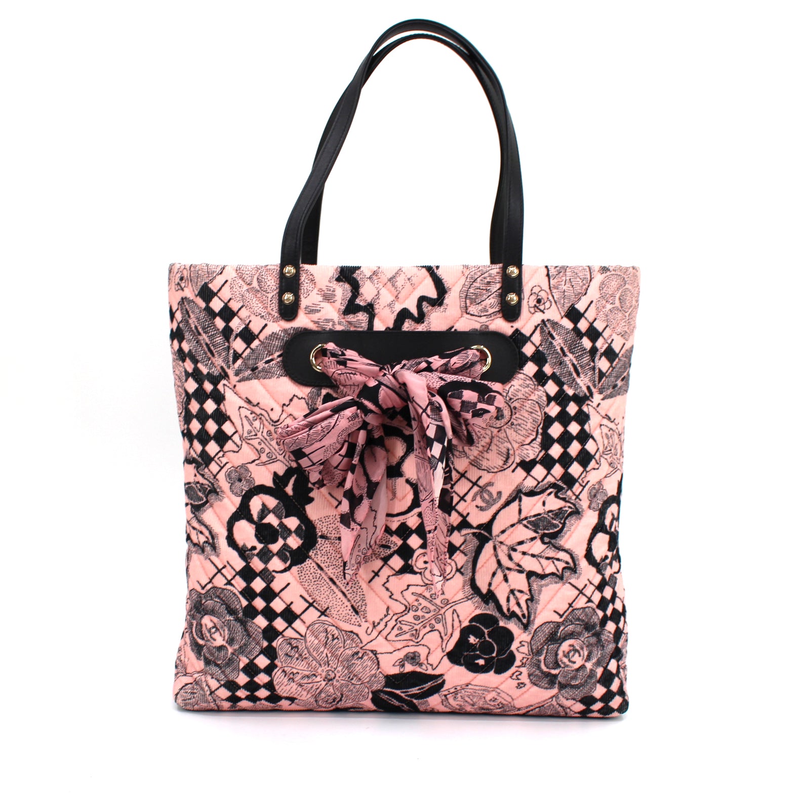 Chanel Scarf Tote Pink Corduroy Black Camellia Pattern Leather Handle Bag