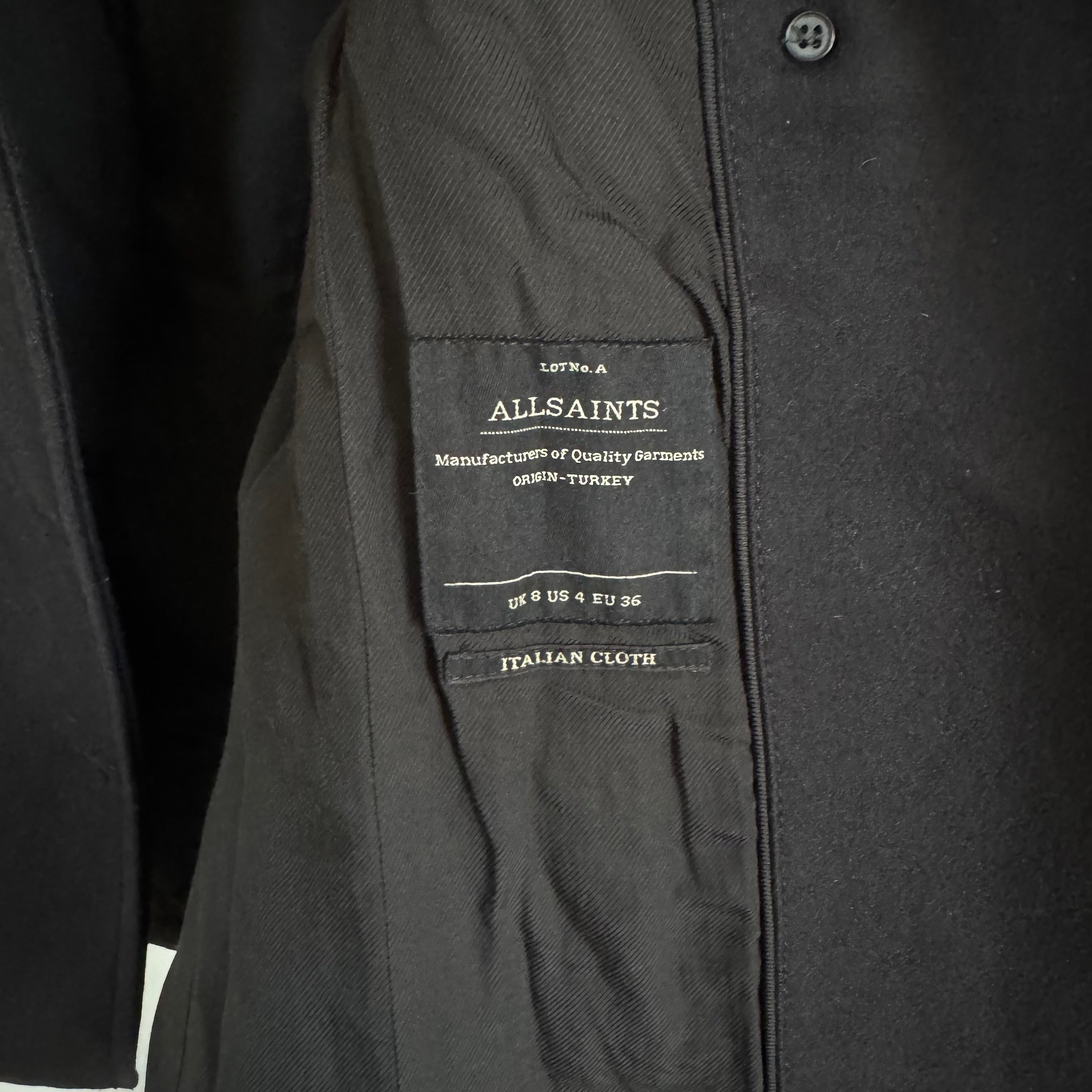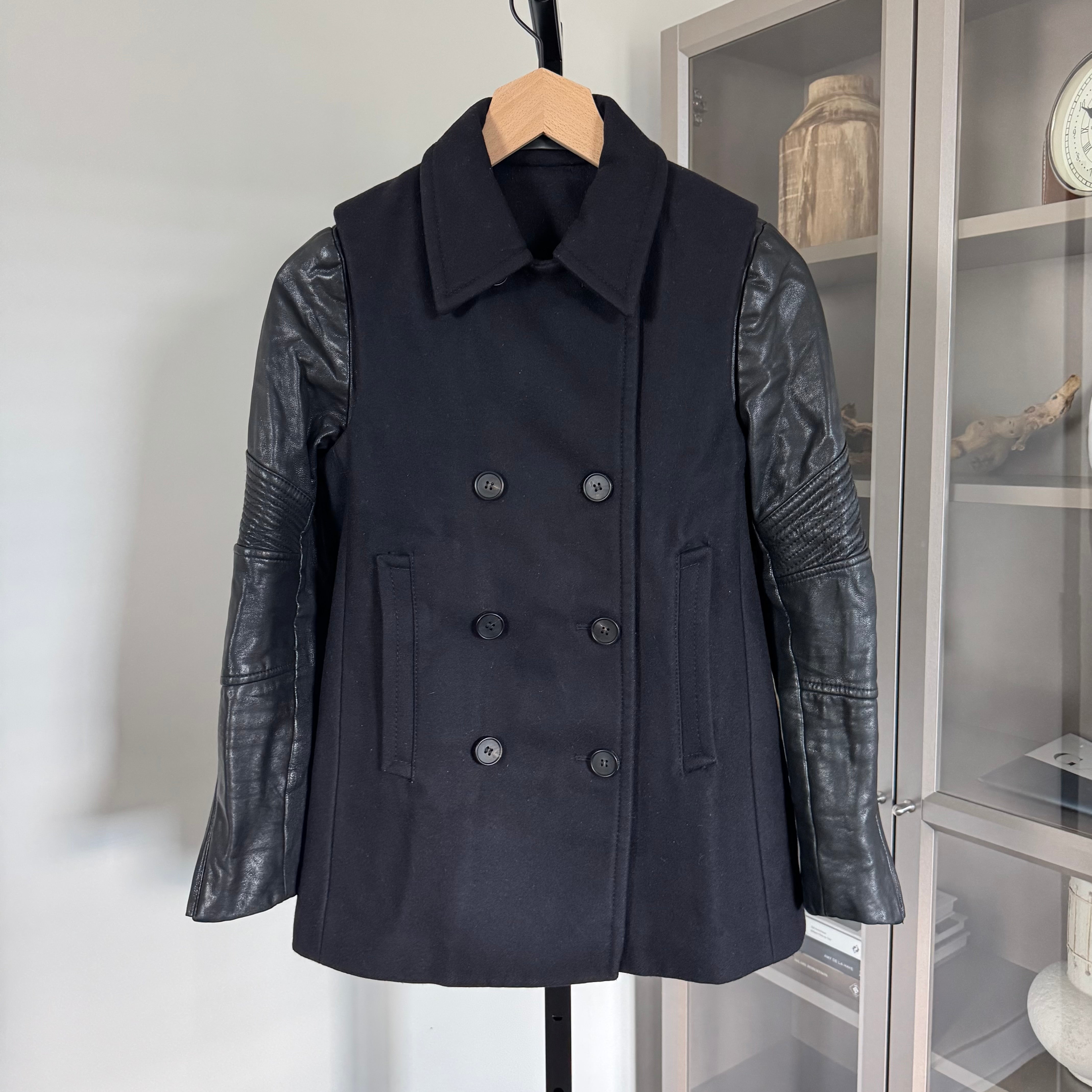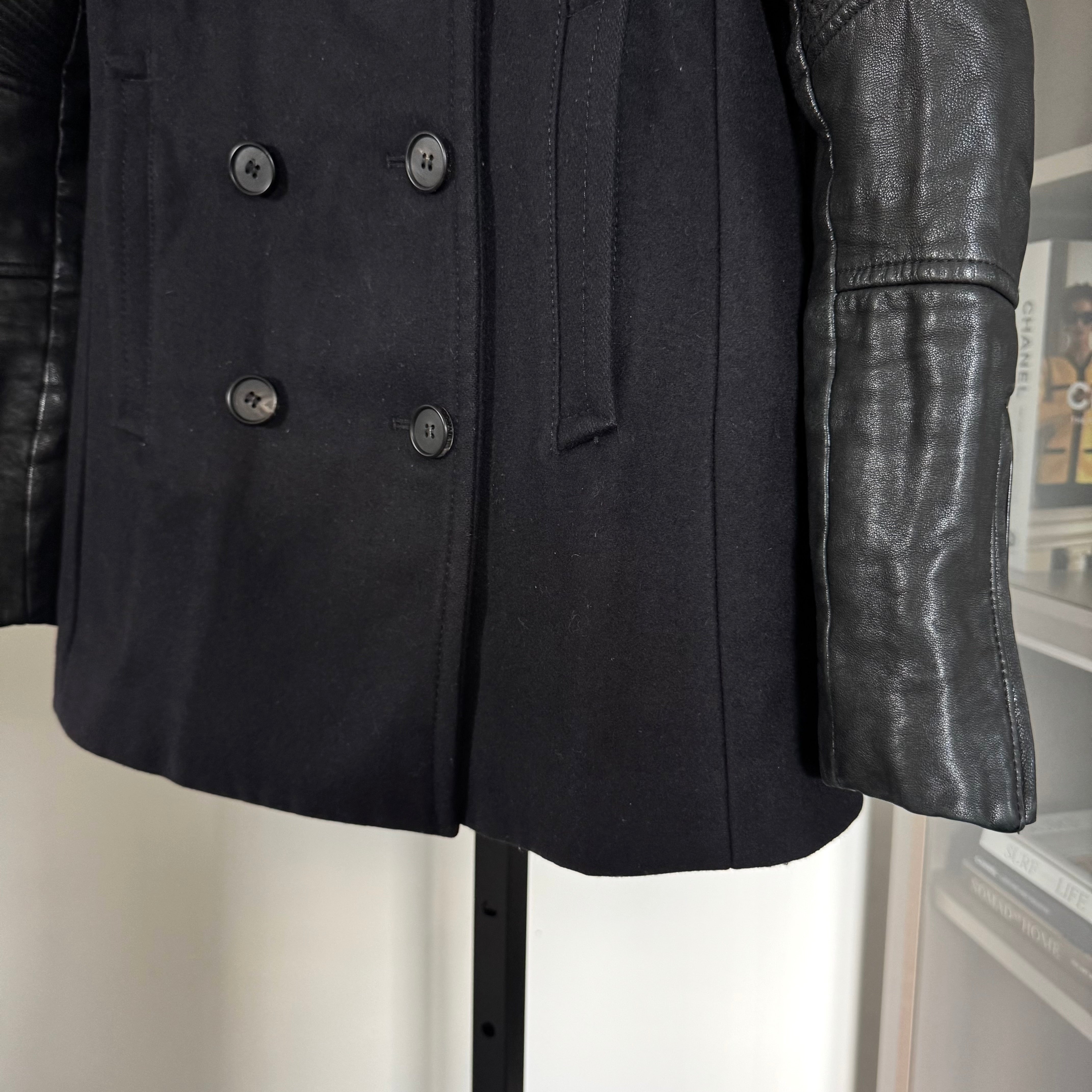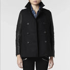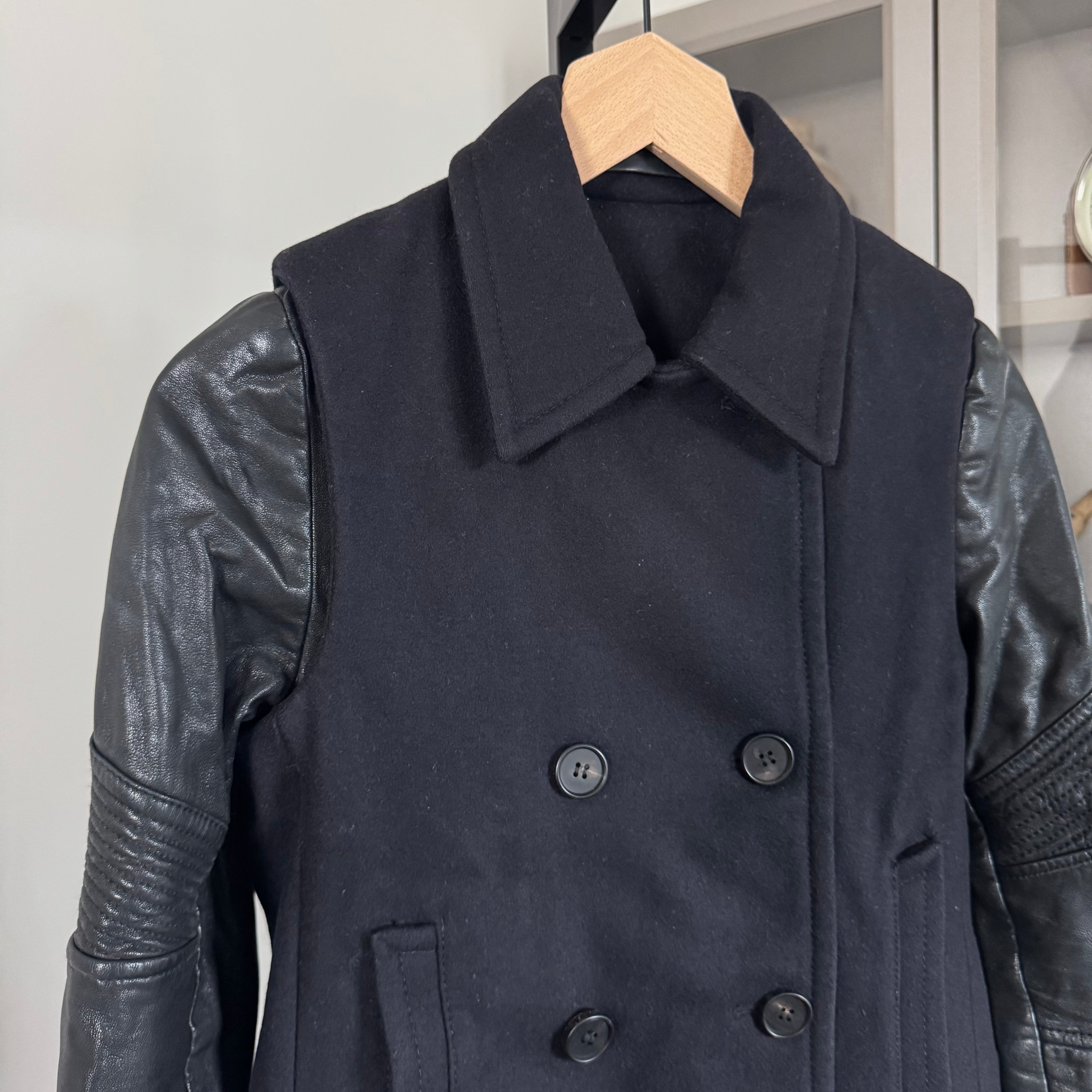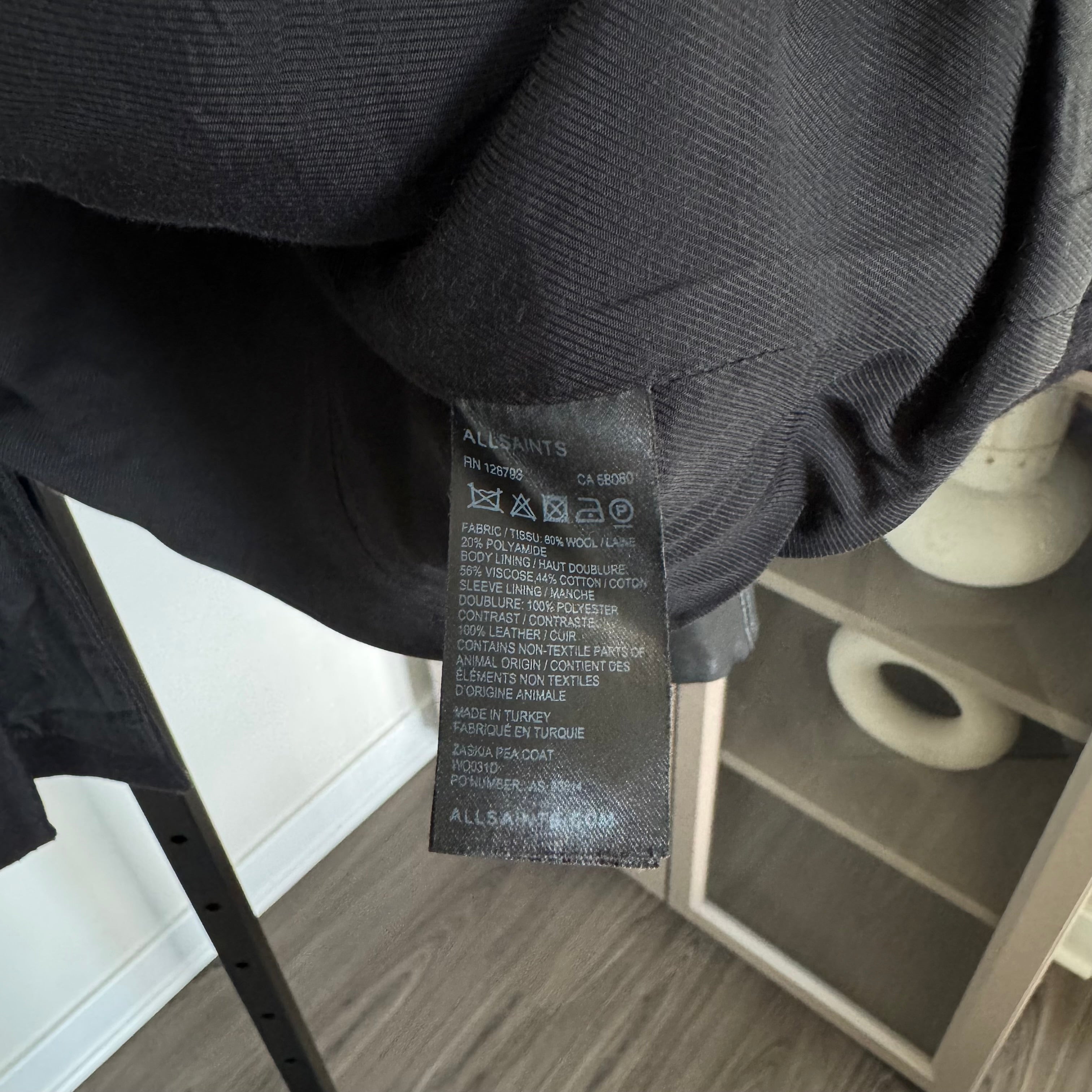 All Saints Zaskia Black Wool Leather Sleeve Double Breasted Peacoat