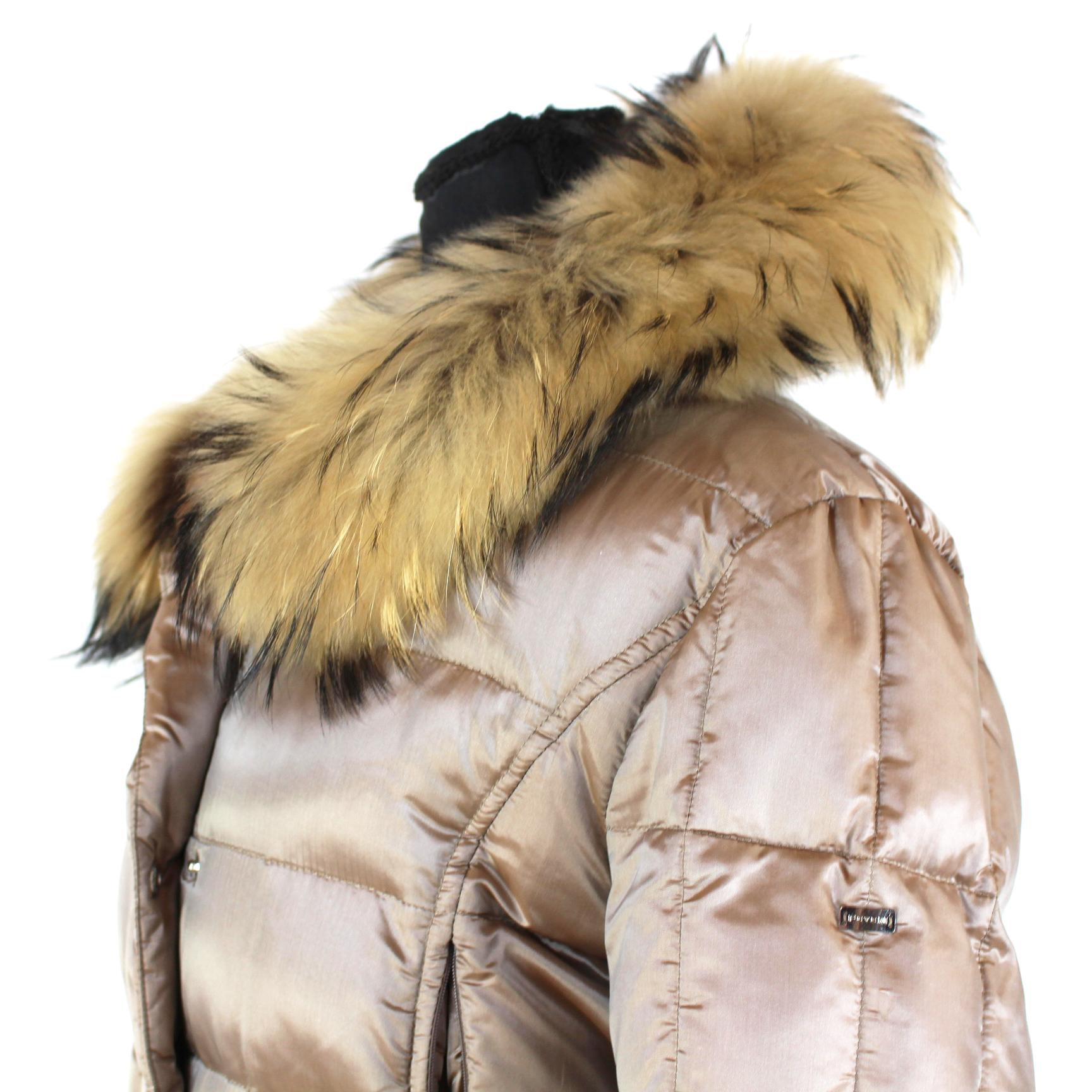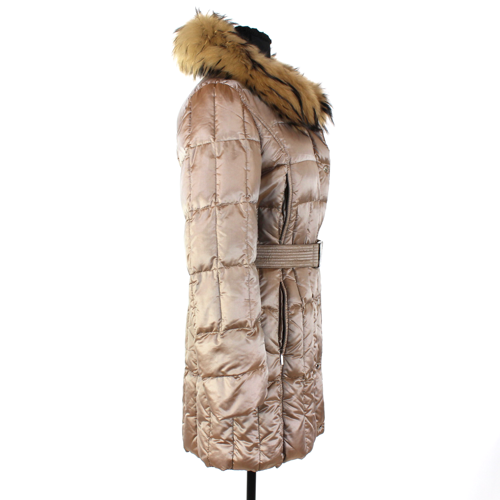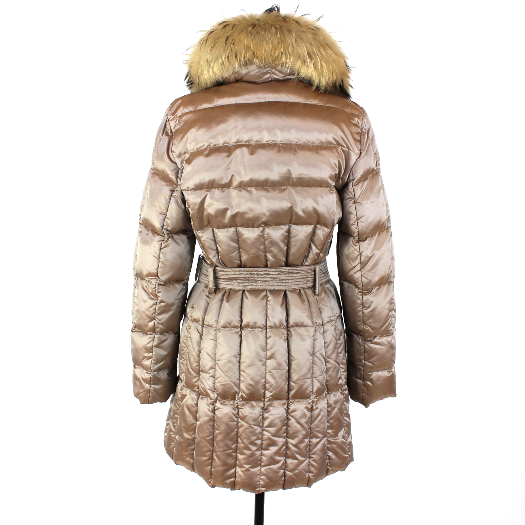 Feyem Goose Down Insulated Fur Trim Rose Shimmer Belted Puffer Coat