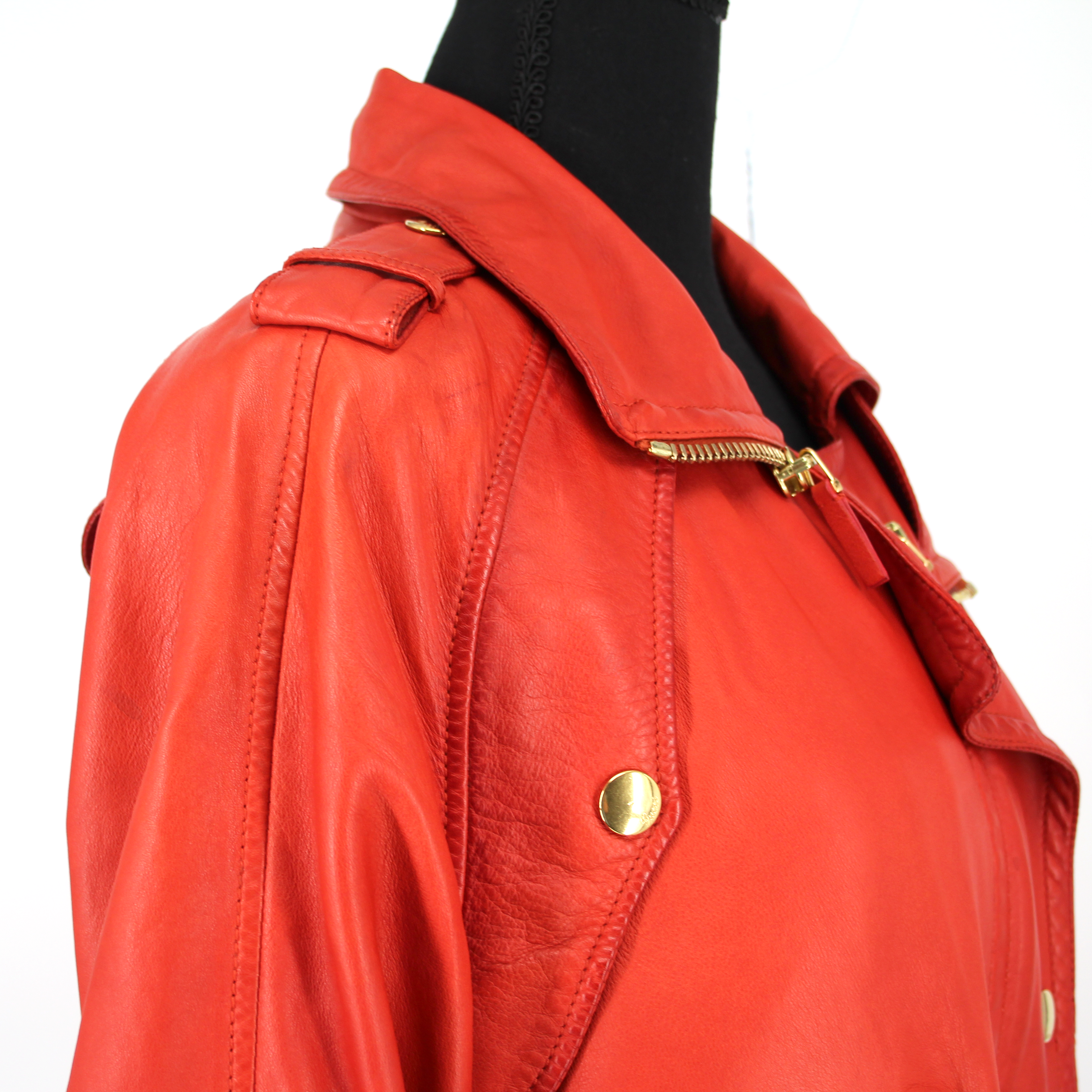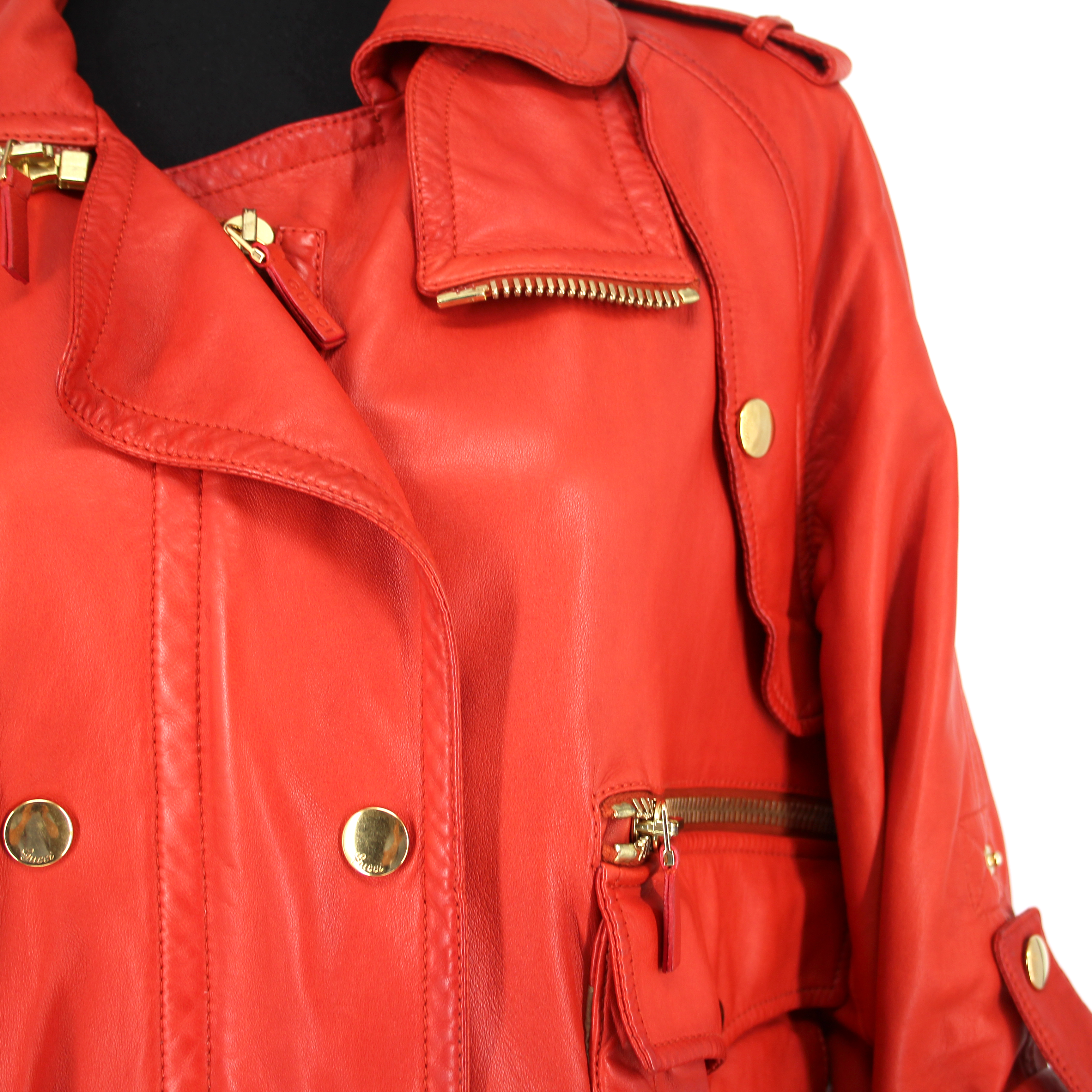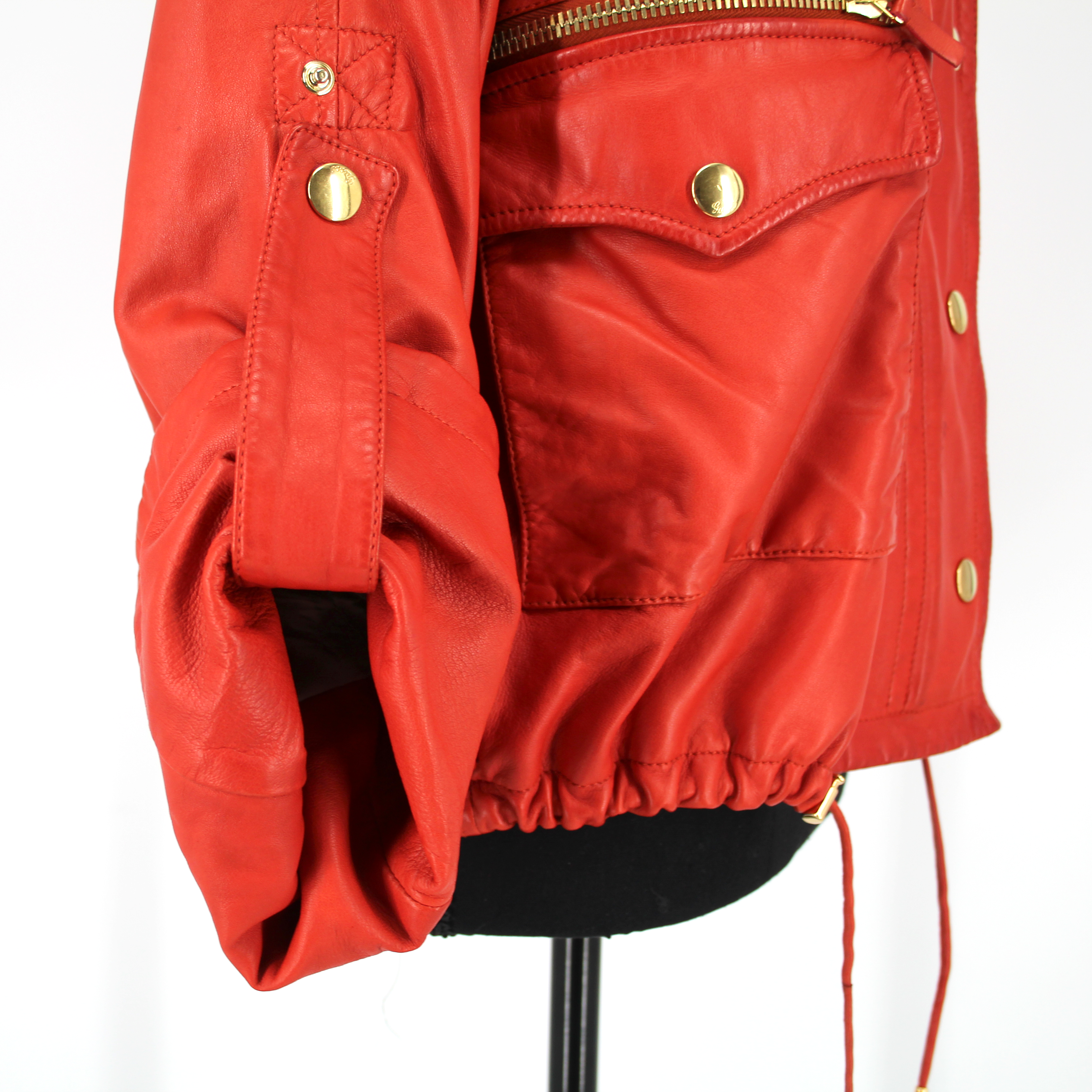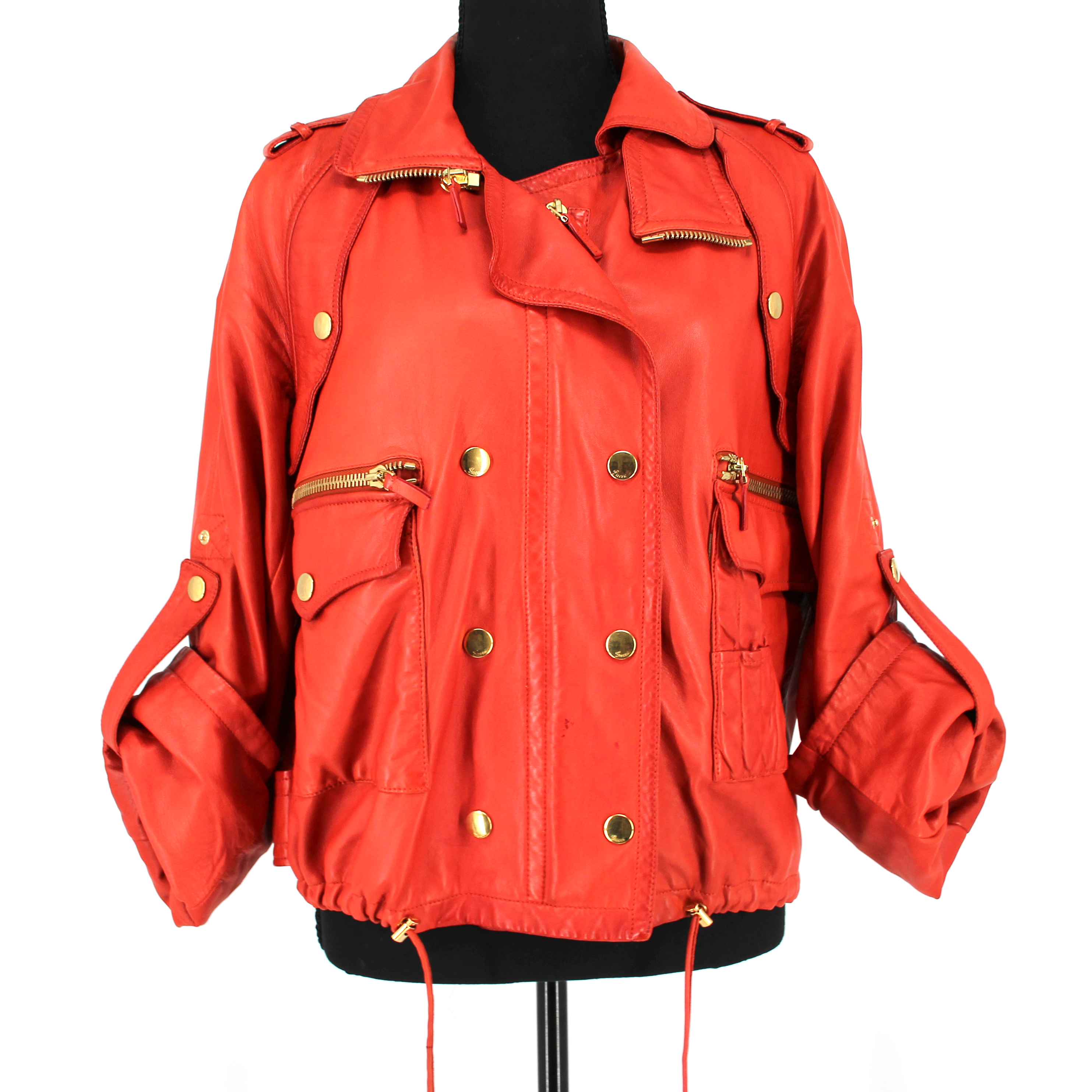 GUCCI Orange Leather Gold Zip Up Rolled Long Sleeves Moto Jacket.