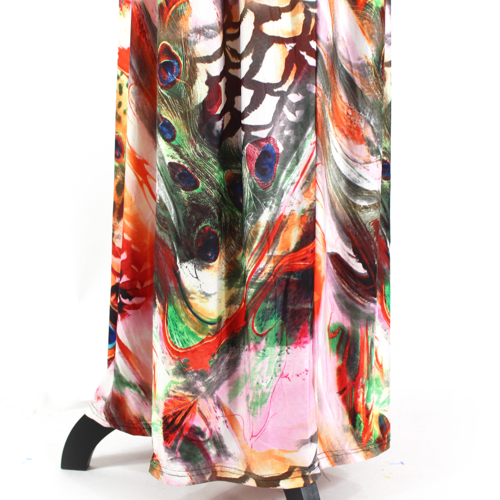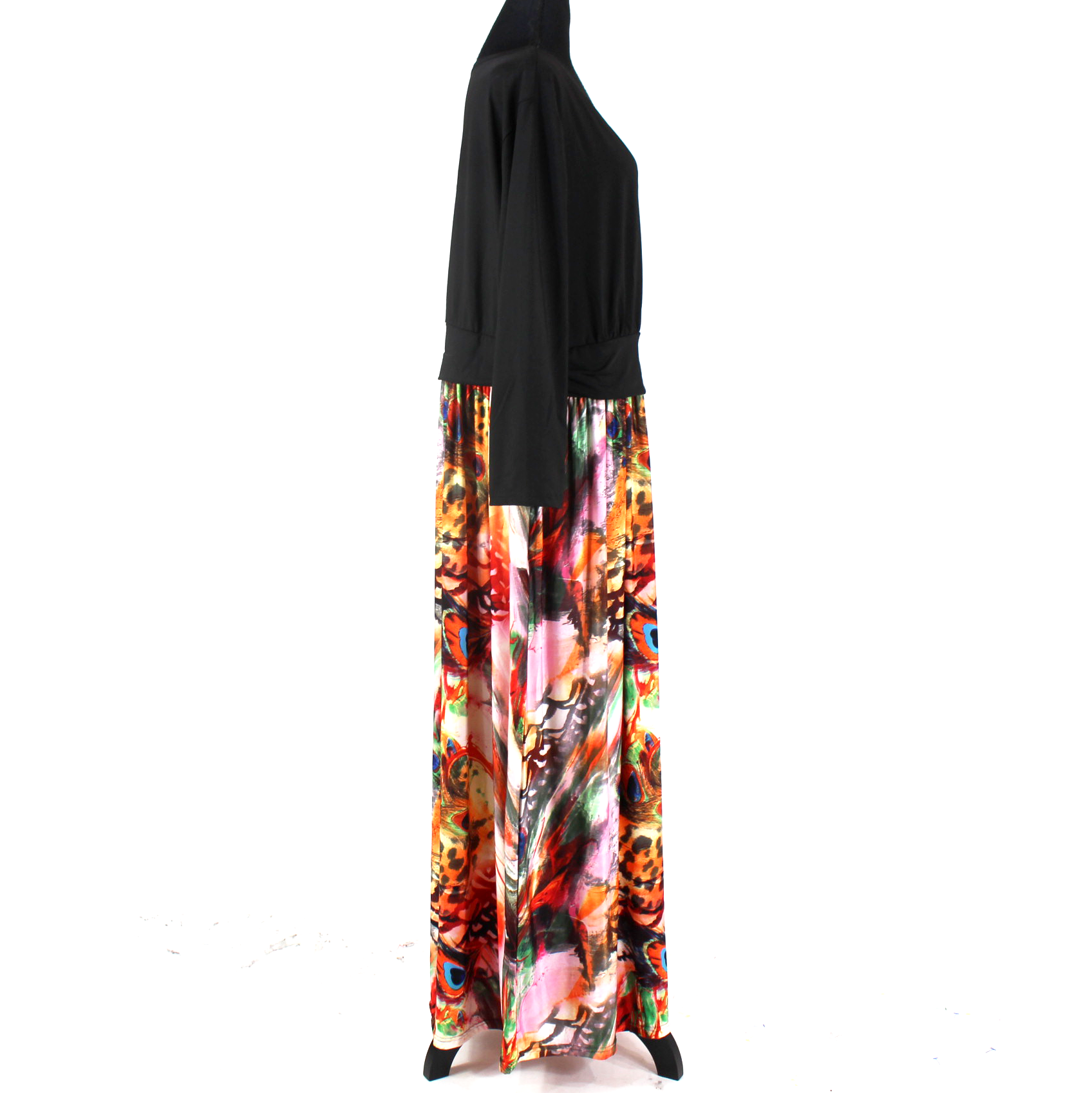Kaimilan Majestic Peacock Black Surplice Neckline Multicolor Sheath Maxi Dress
