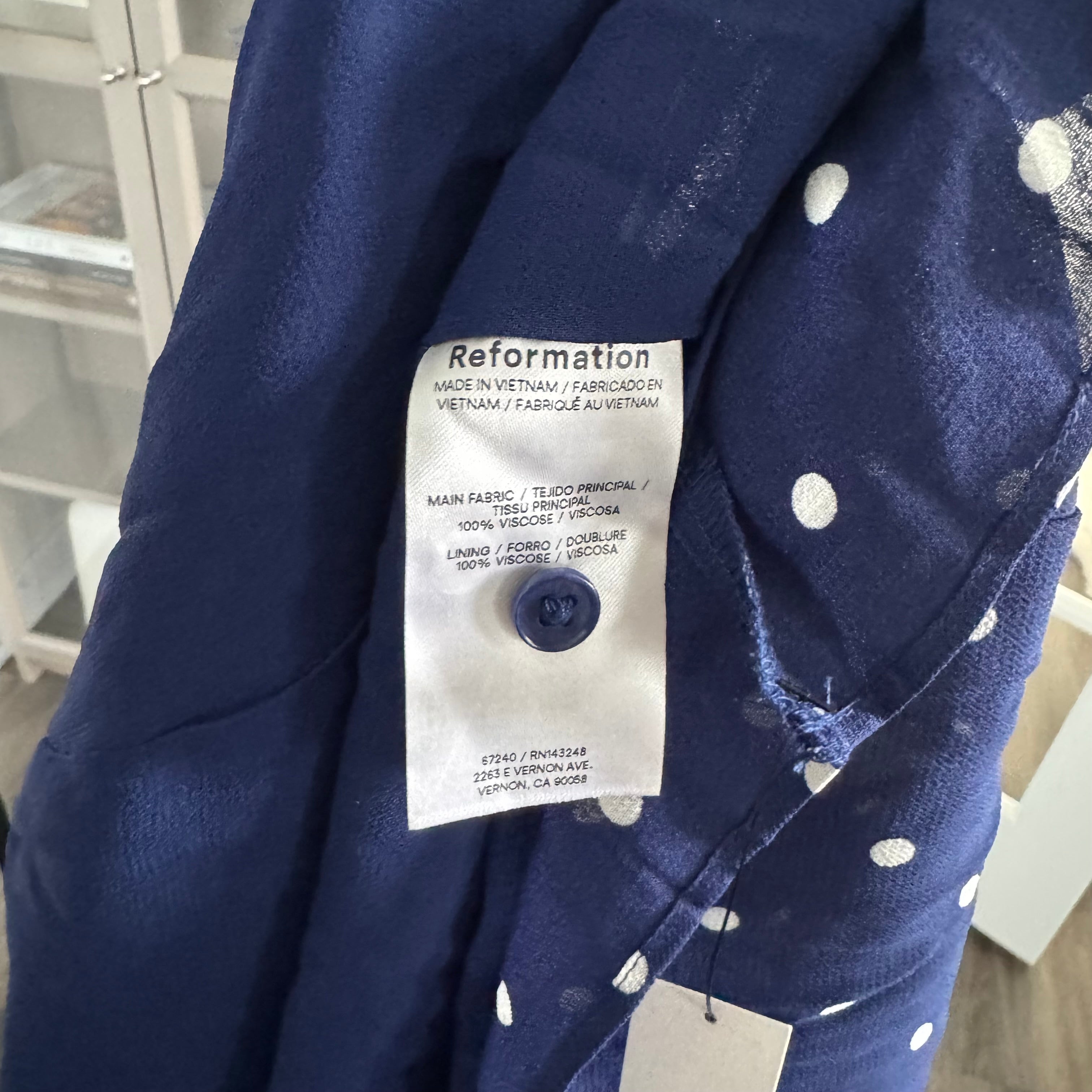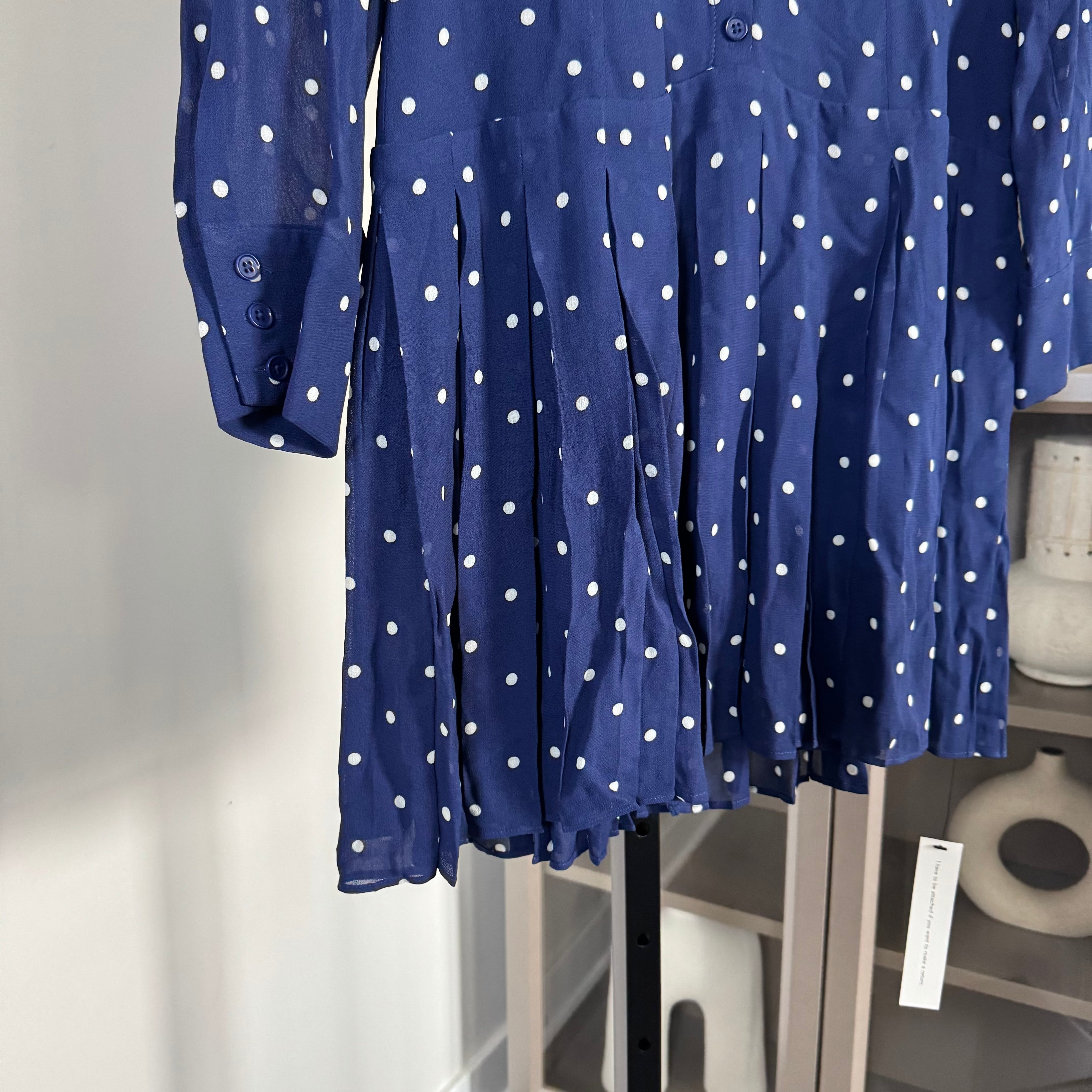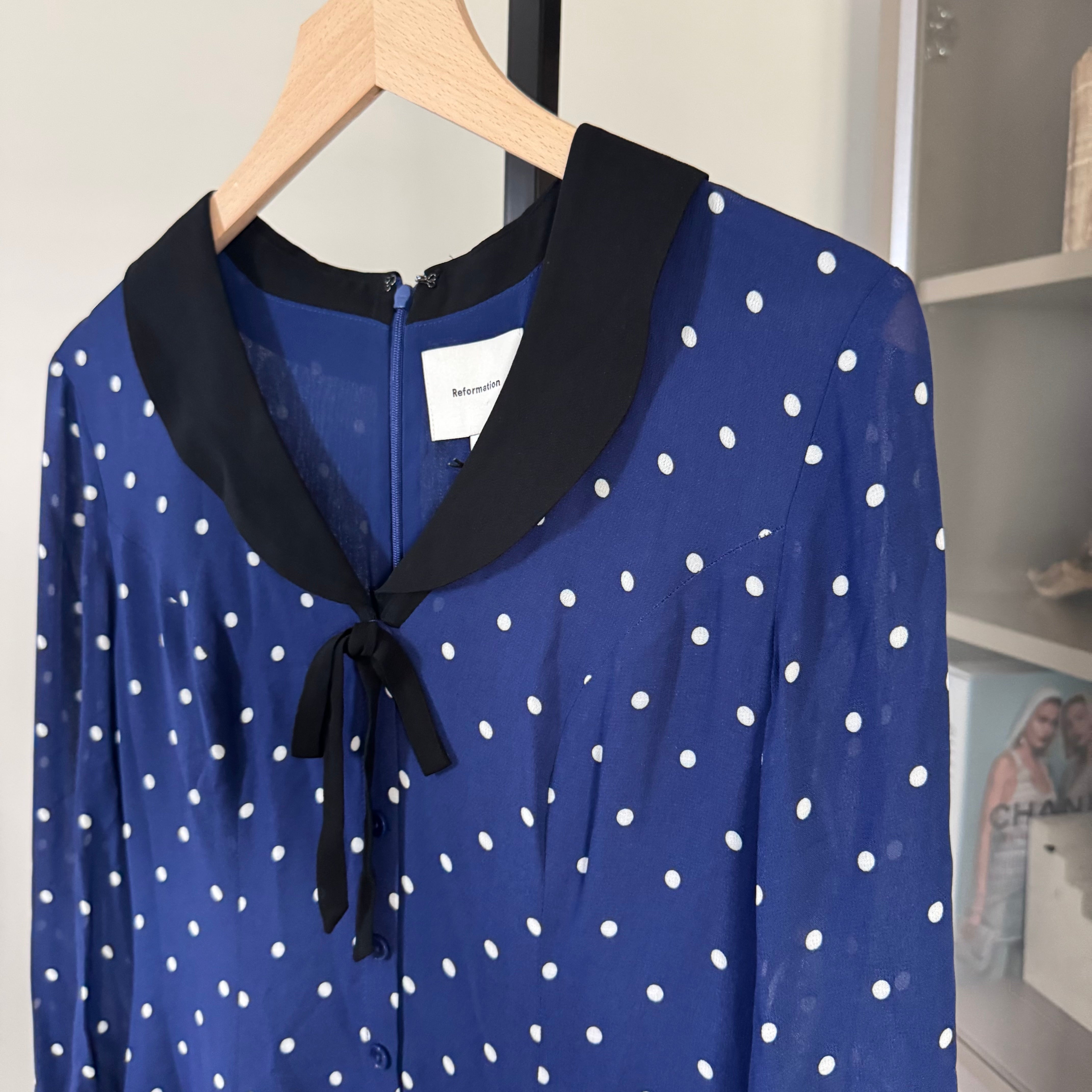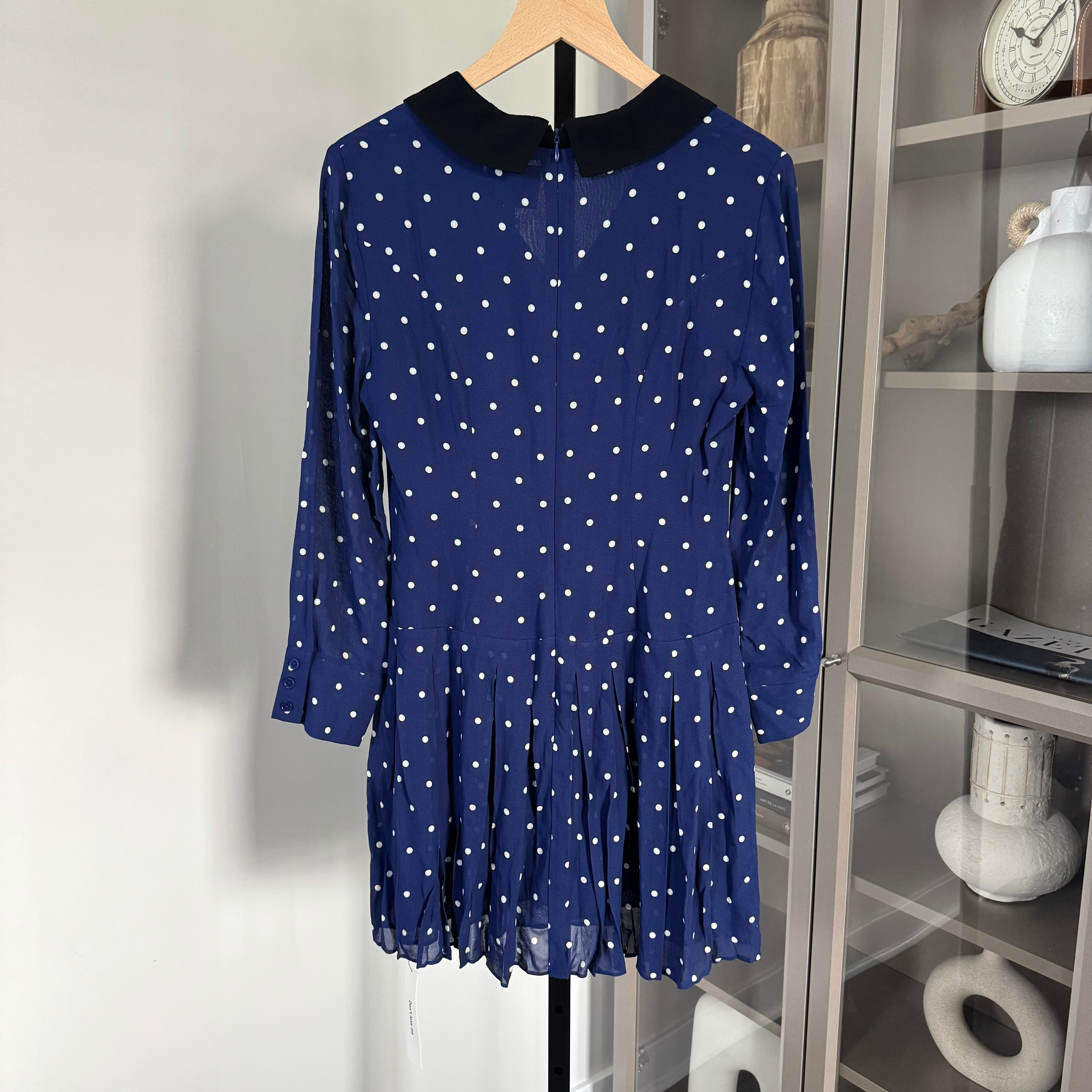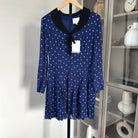 Reformation Tamia Navy Danube Dot Black Collar V-Neck Pleated Short Dress
