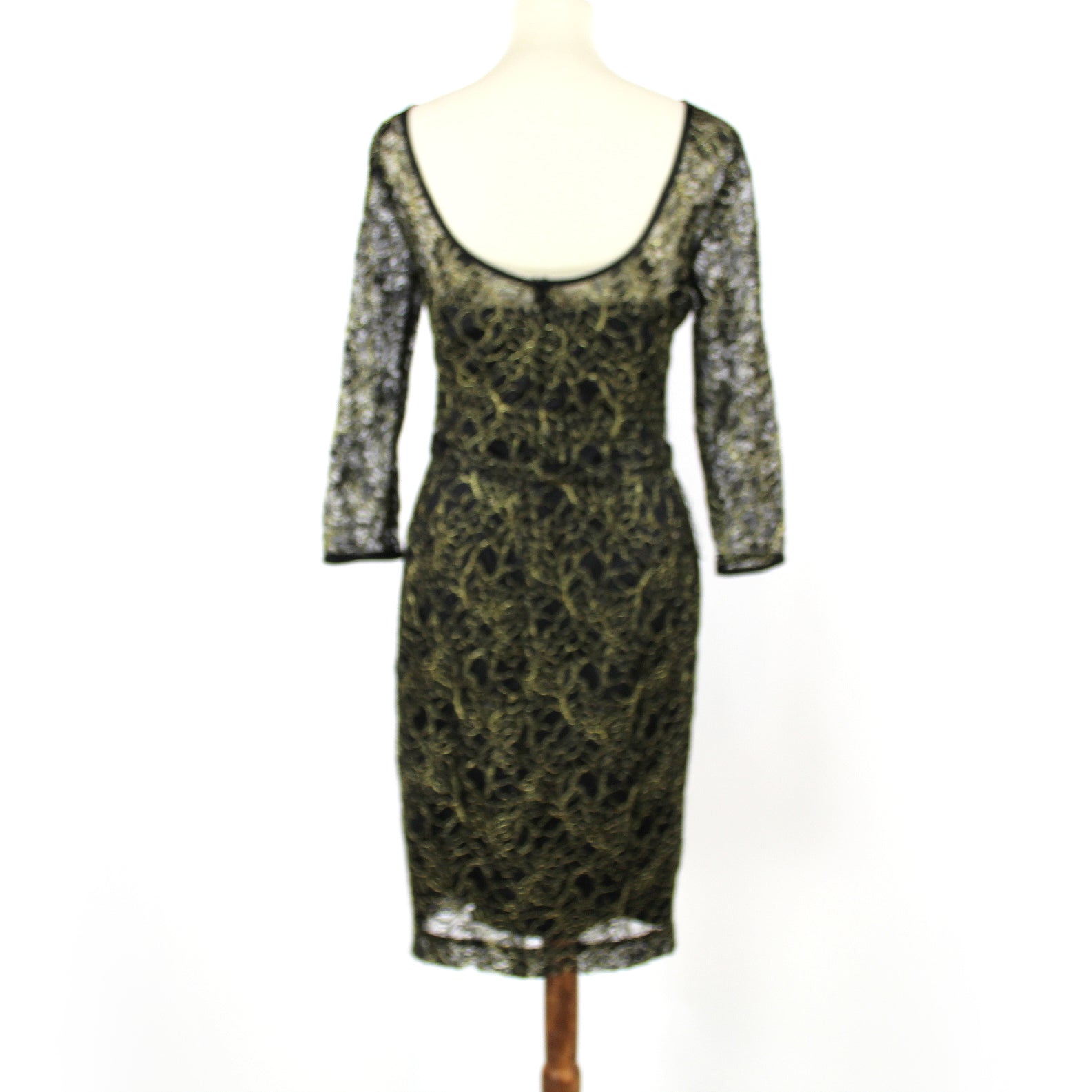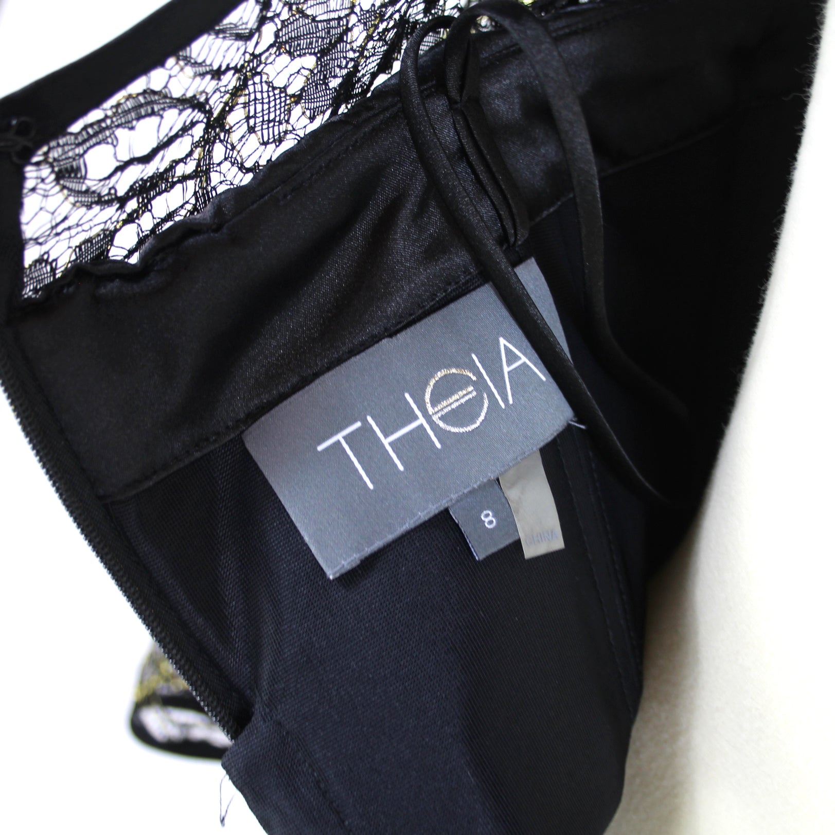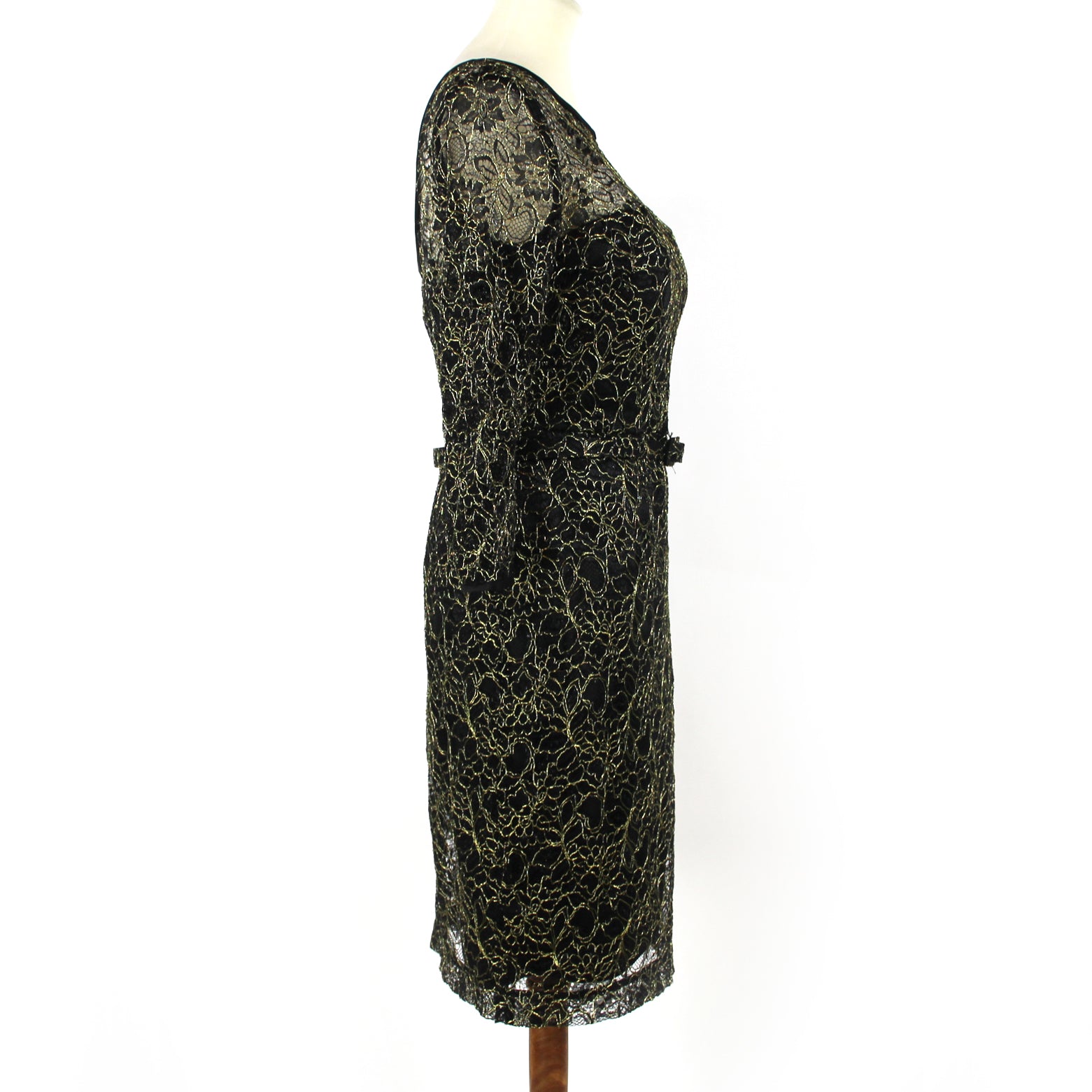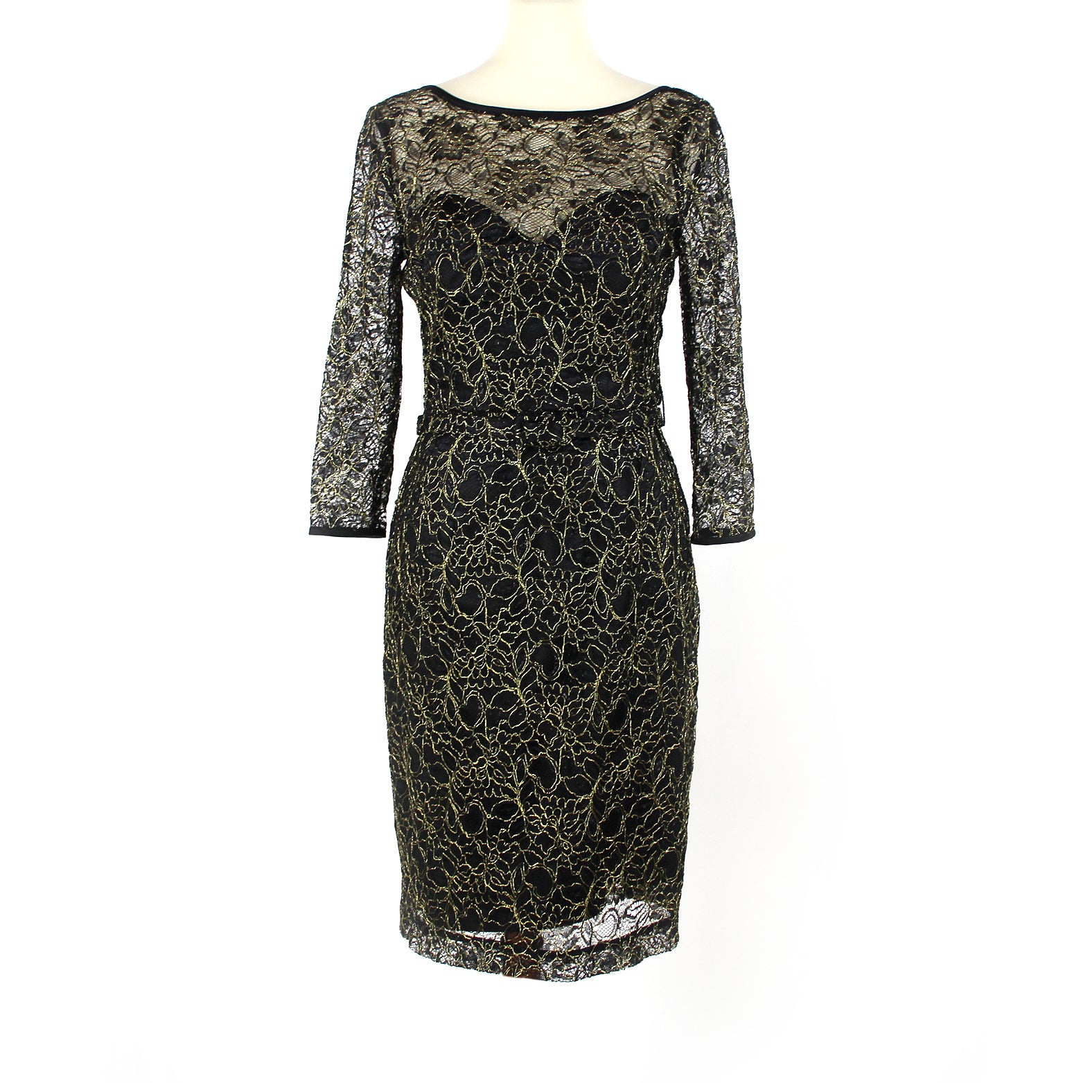 Theia Black Gold Floral Lace Covered Belted Boat Neck Cocktail Dress