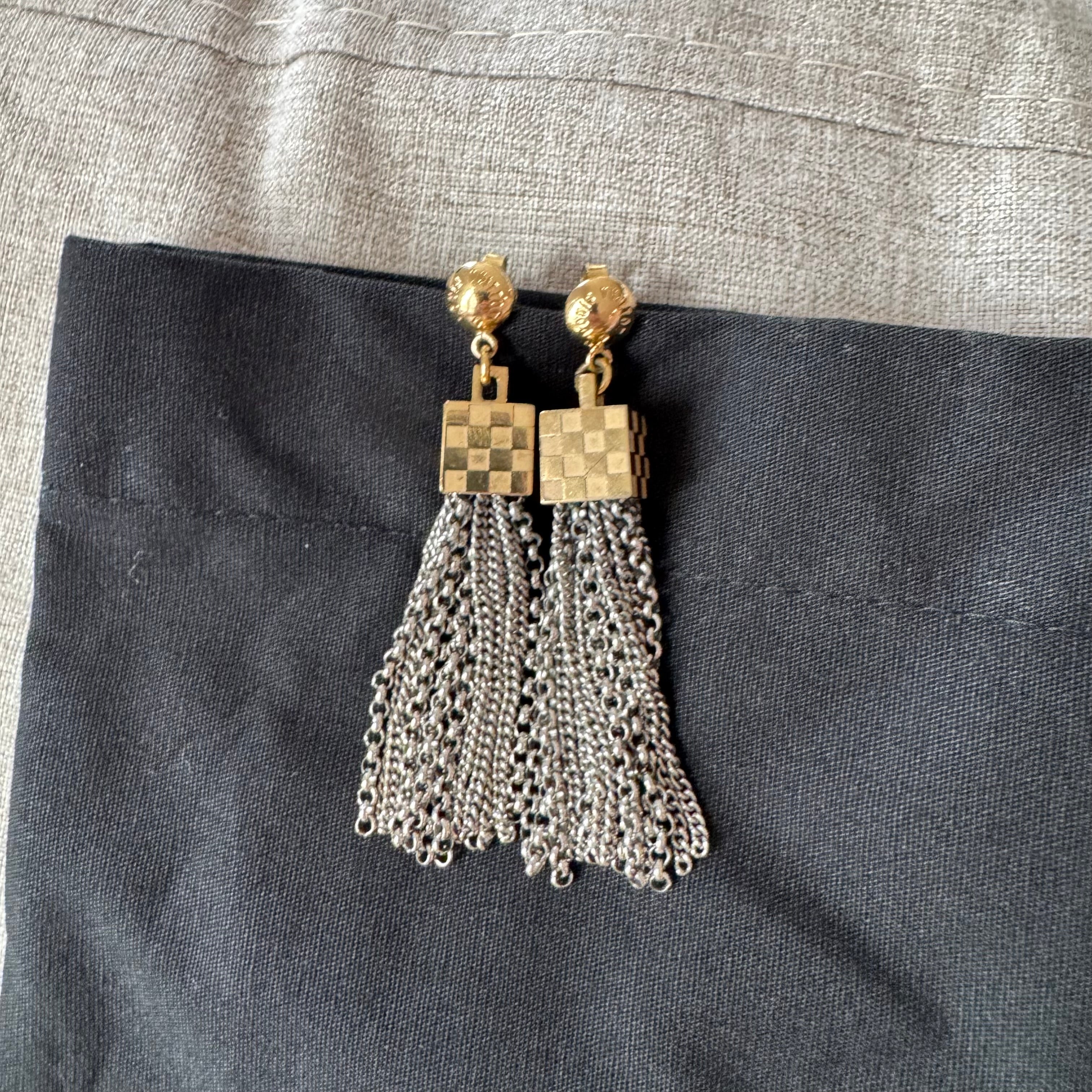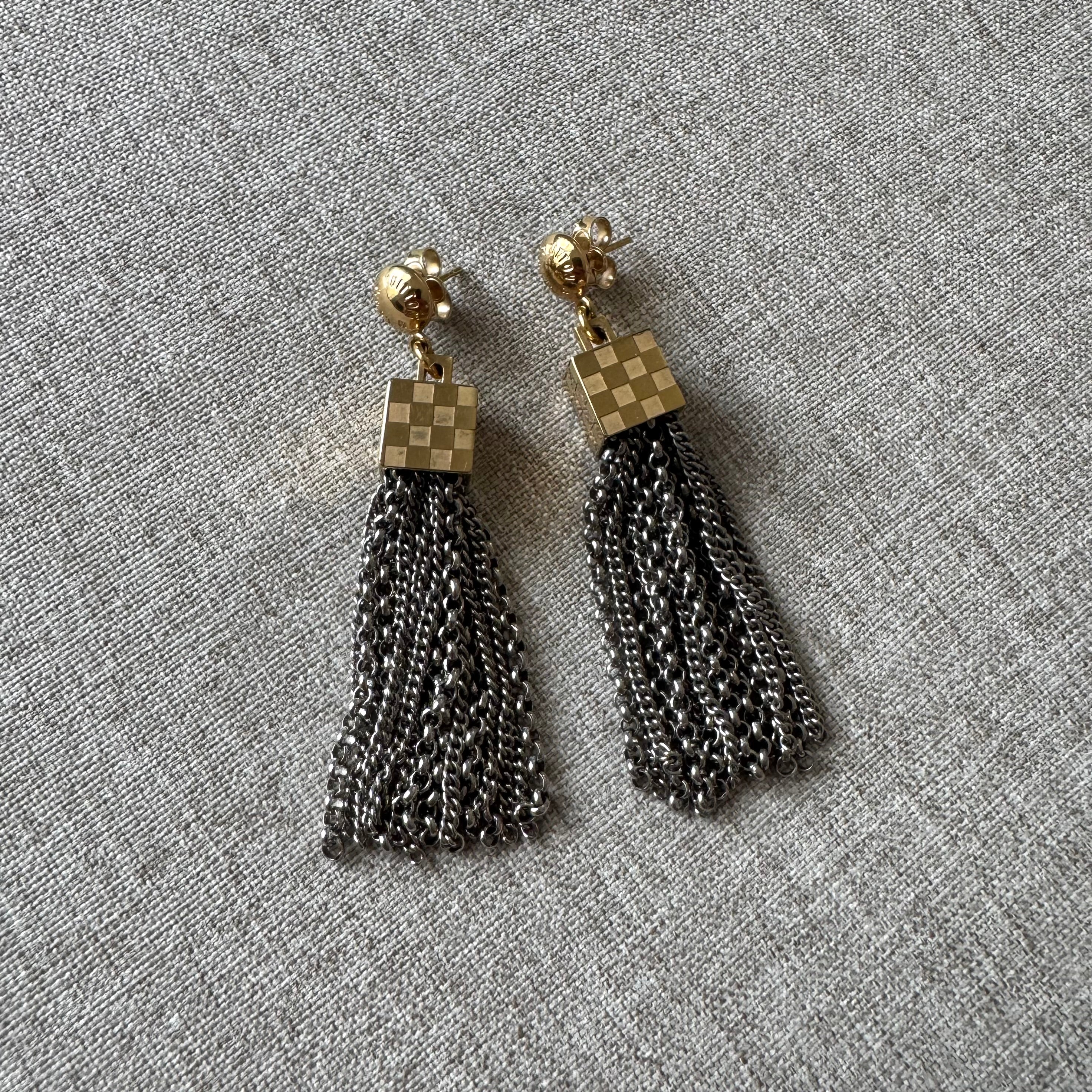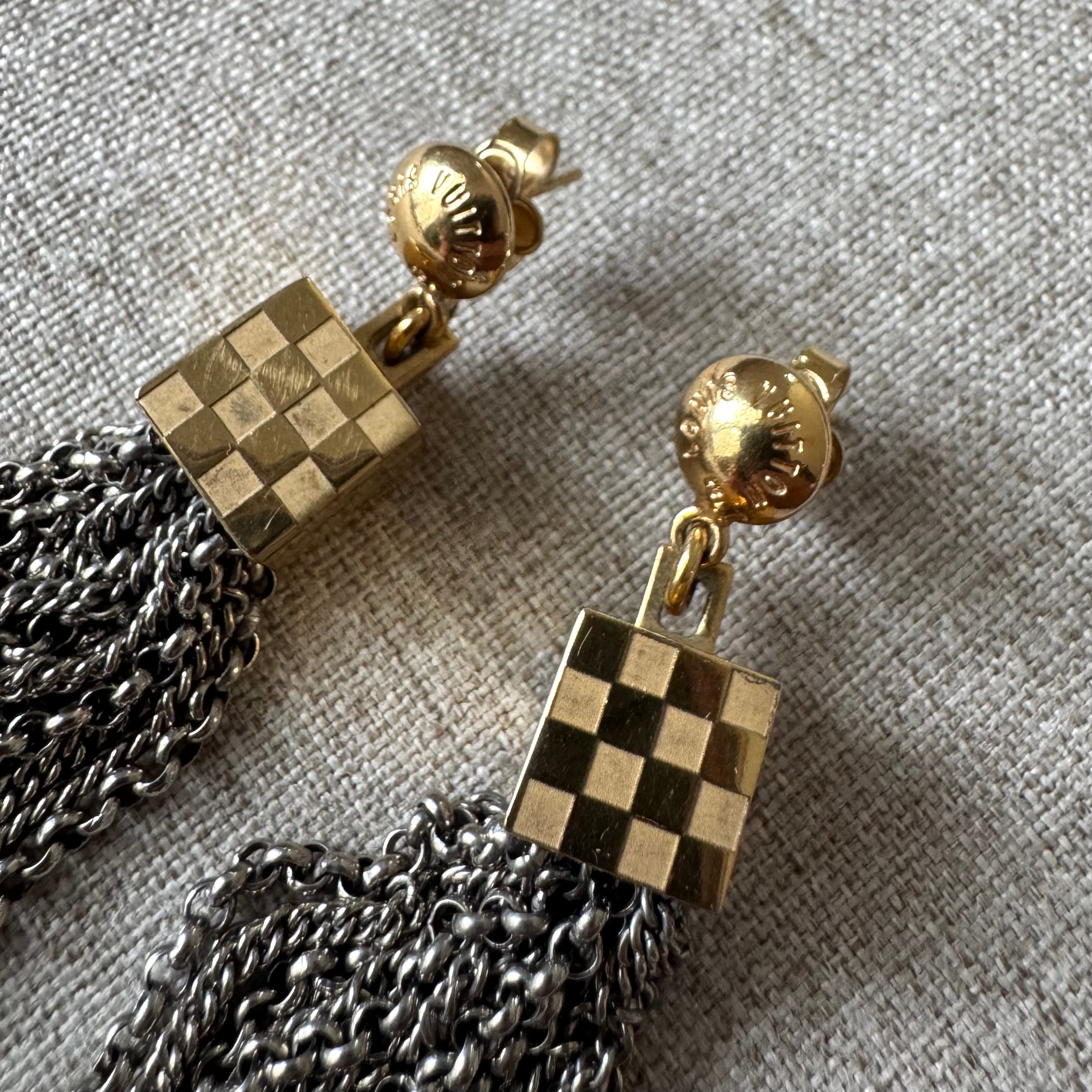 Louis Vuitton Damier Charlie Drop Tassel Two Tone Brass Earrings