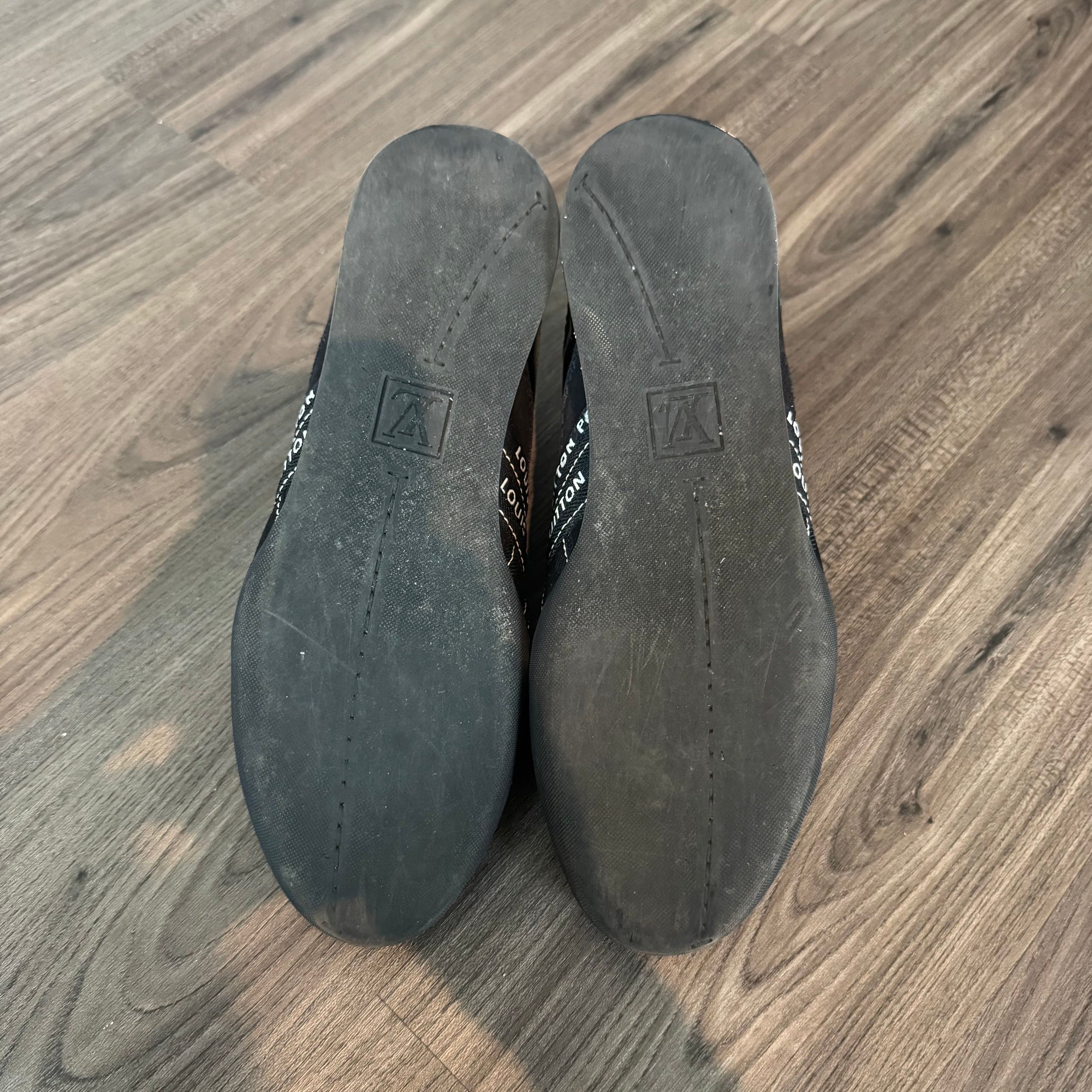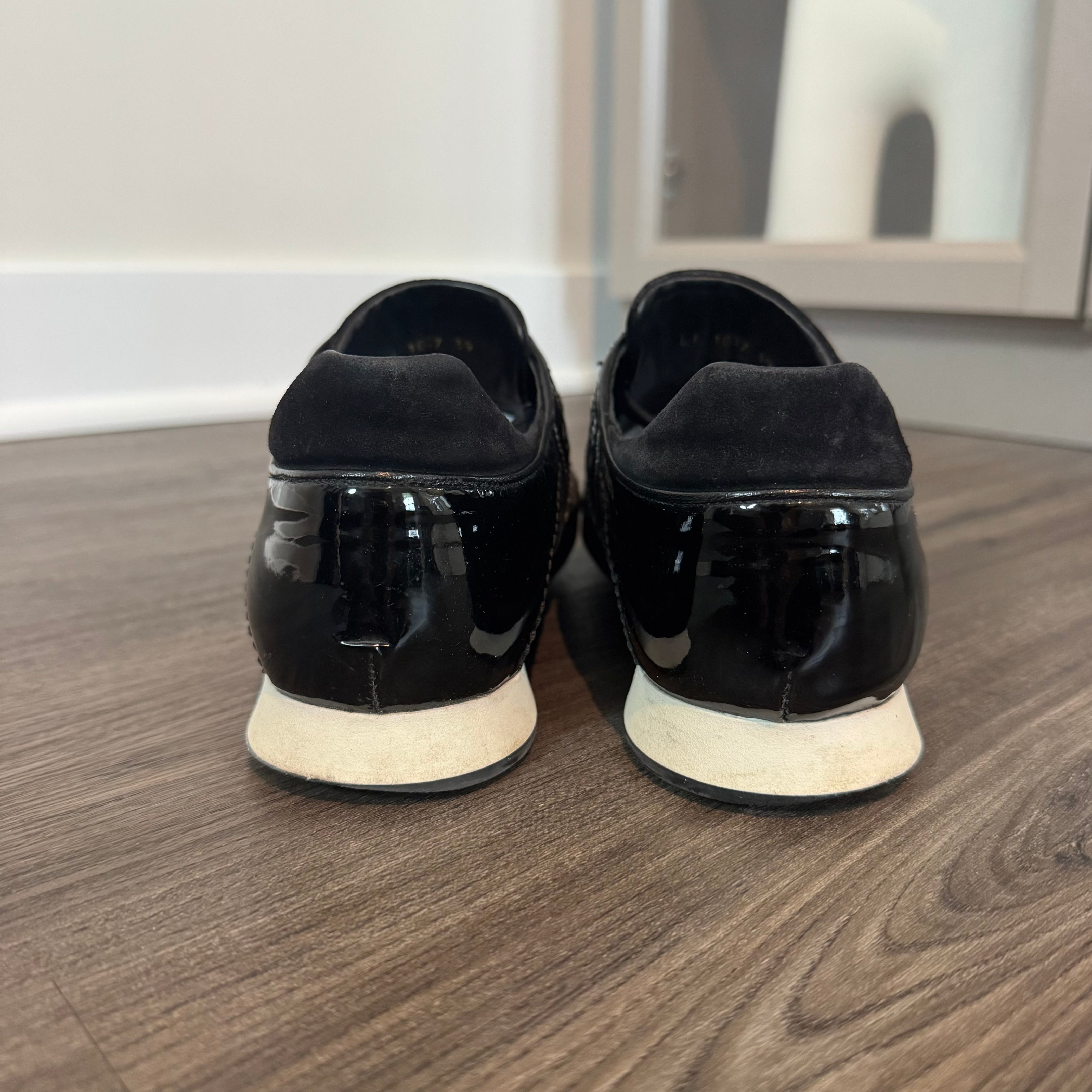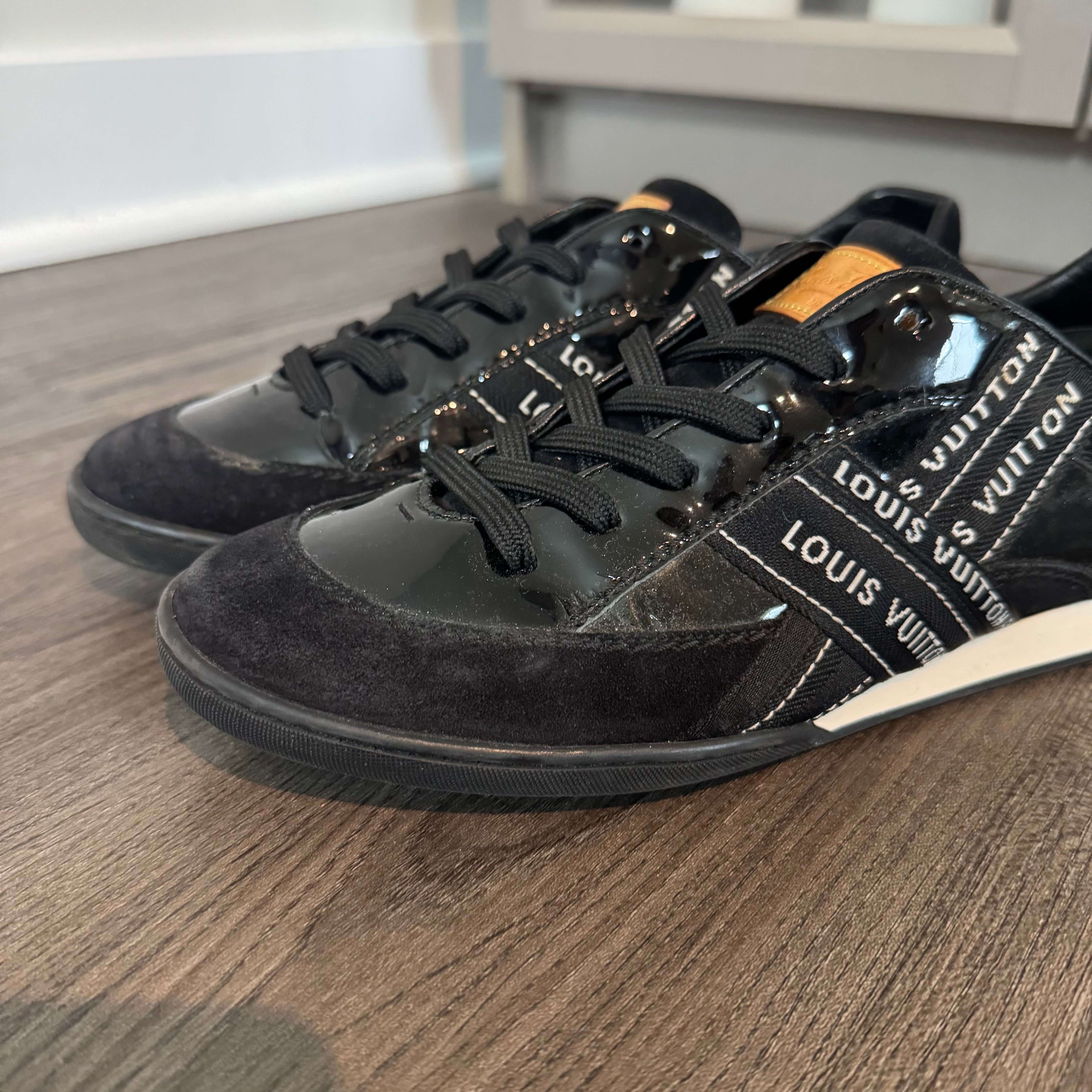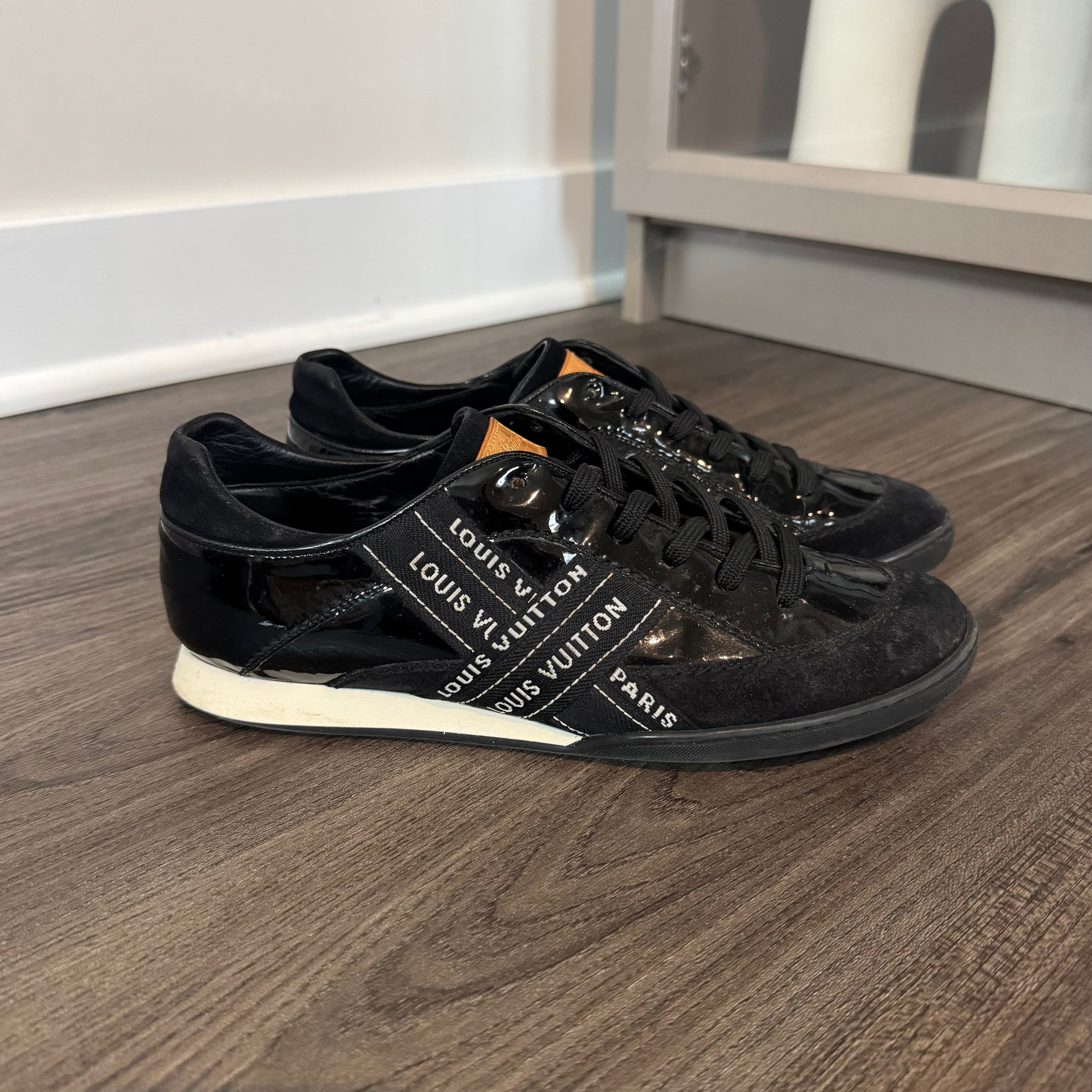 Louis Vuitton Lesley Black Patent Leather Suede Embroidered Grey Logo Sneakers