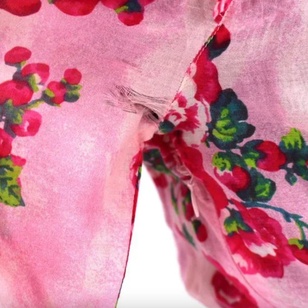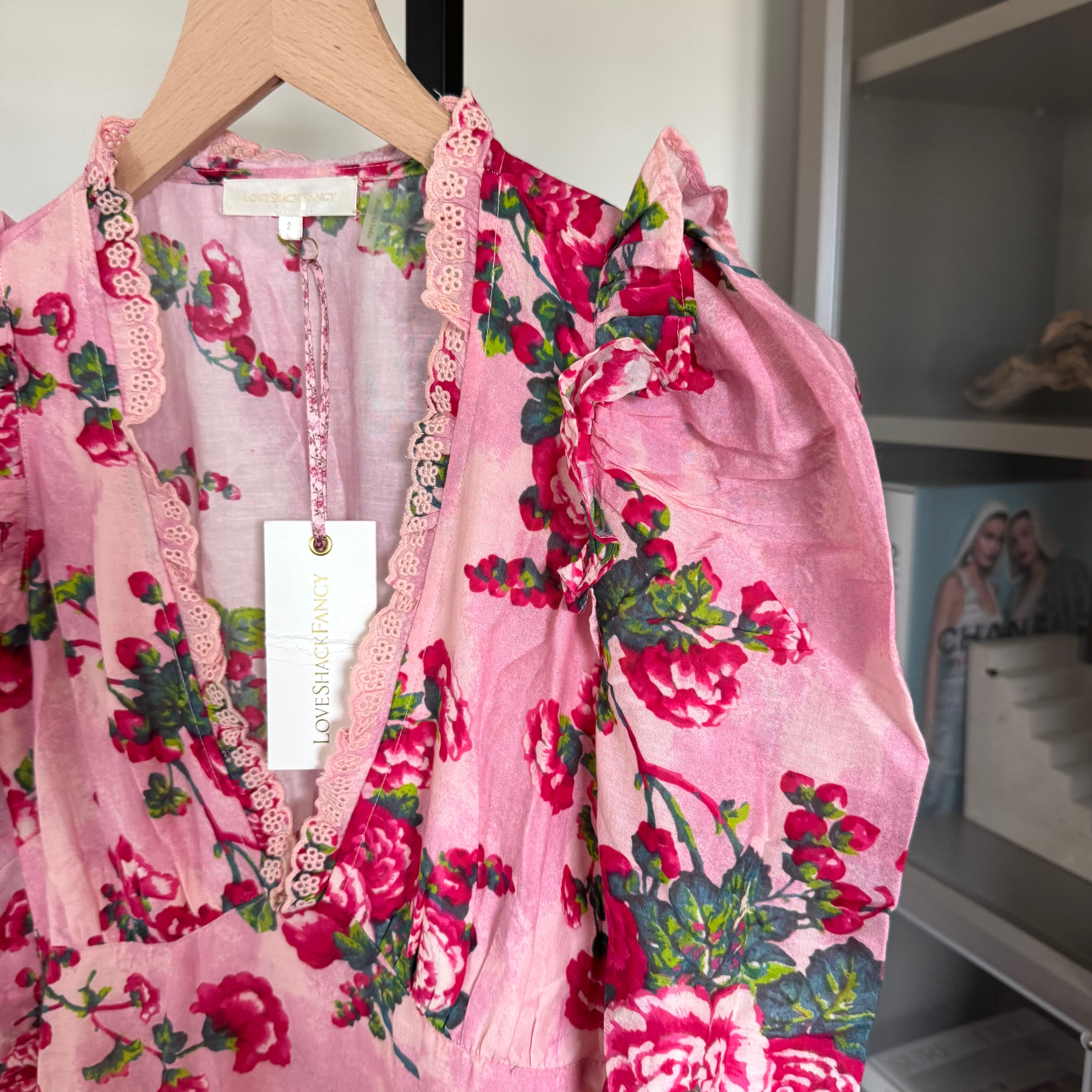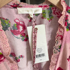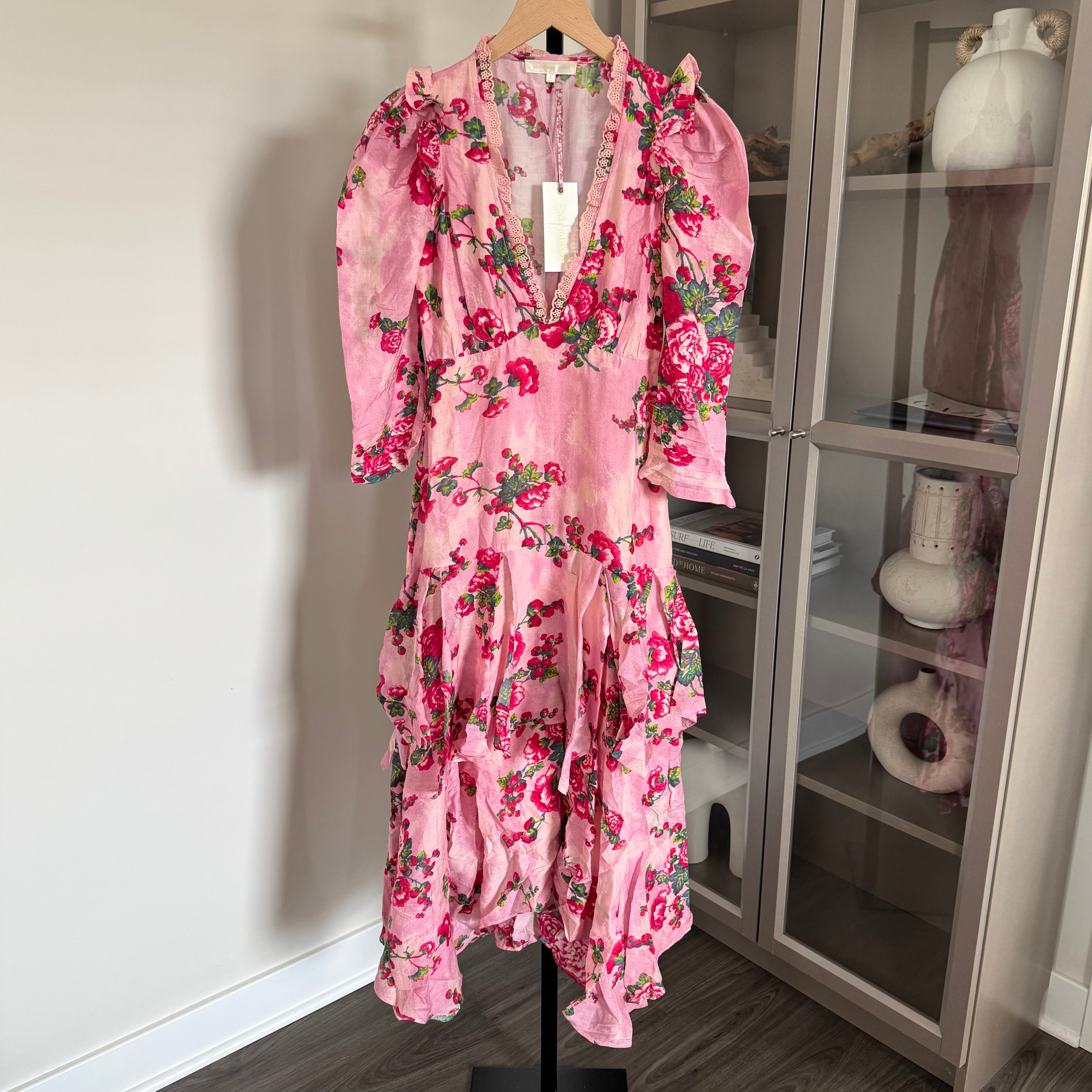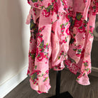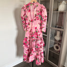 LoveShackFancy Salima Pink Floral Short Sleeve Tiered Asymmetrical Midi Dress