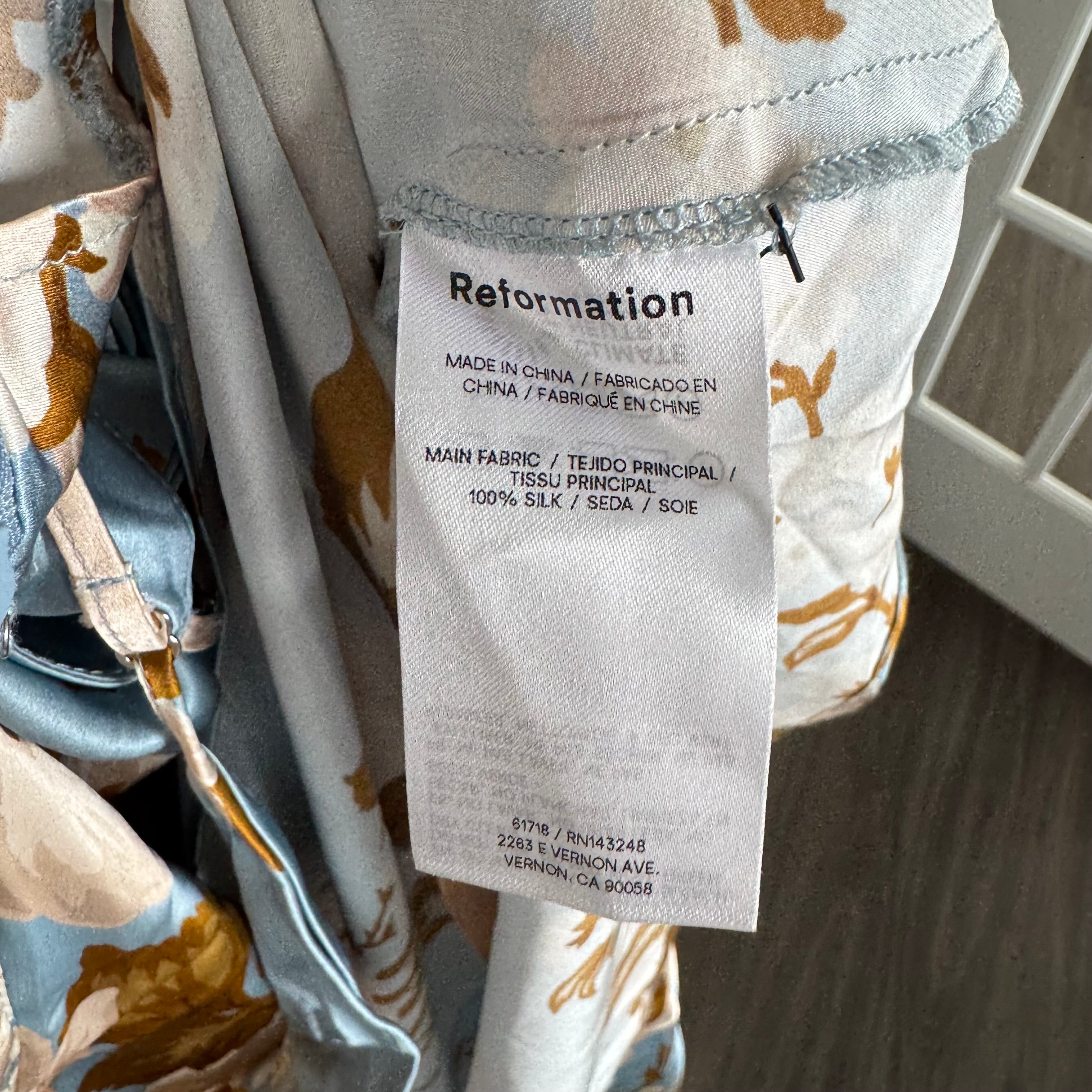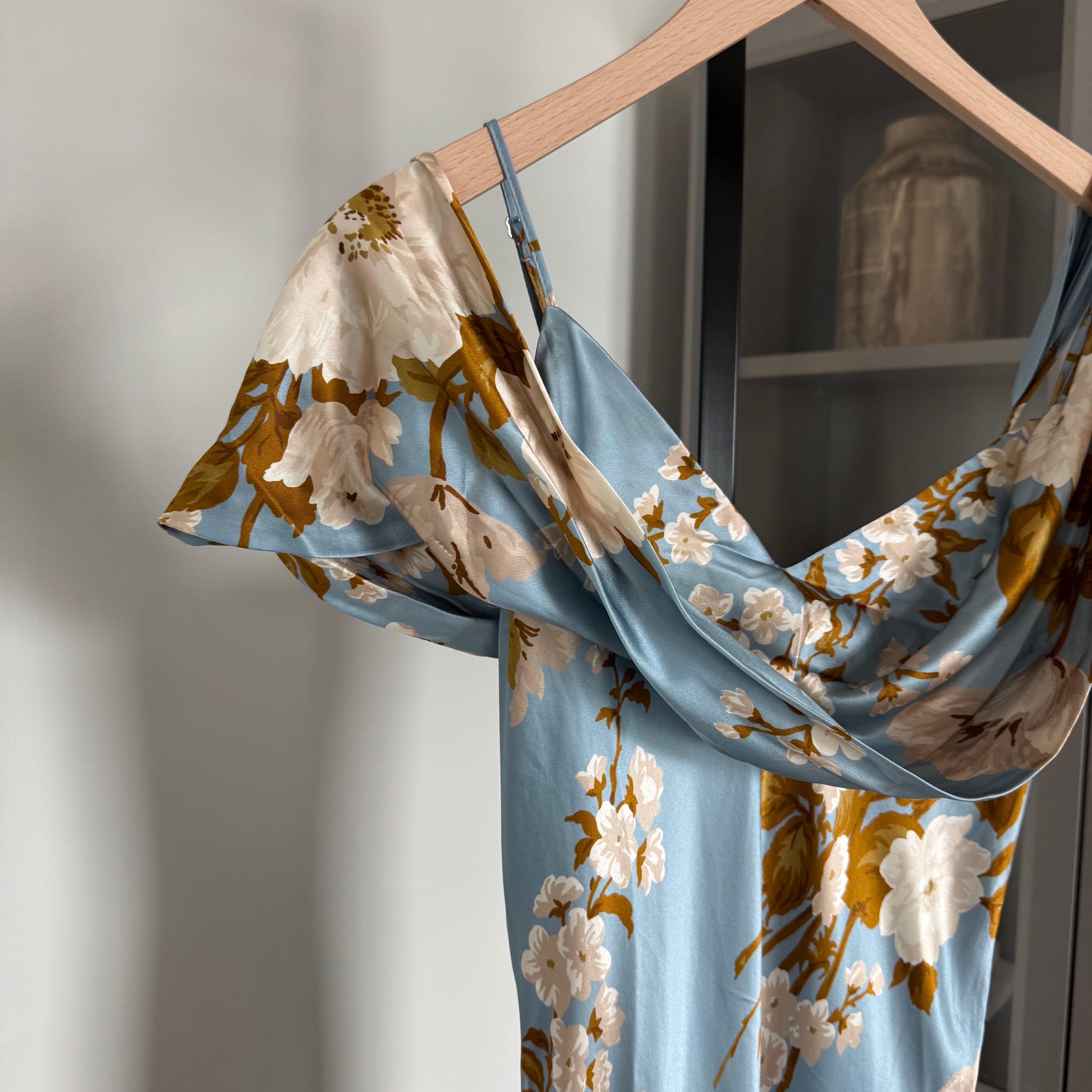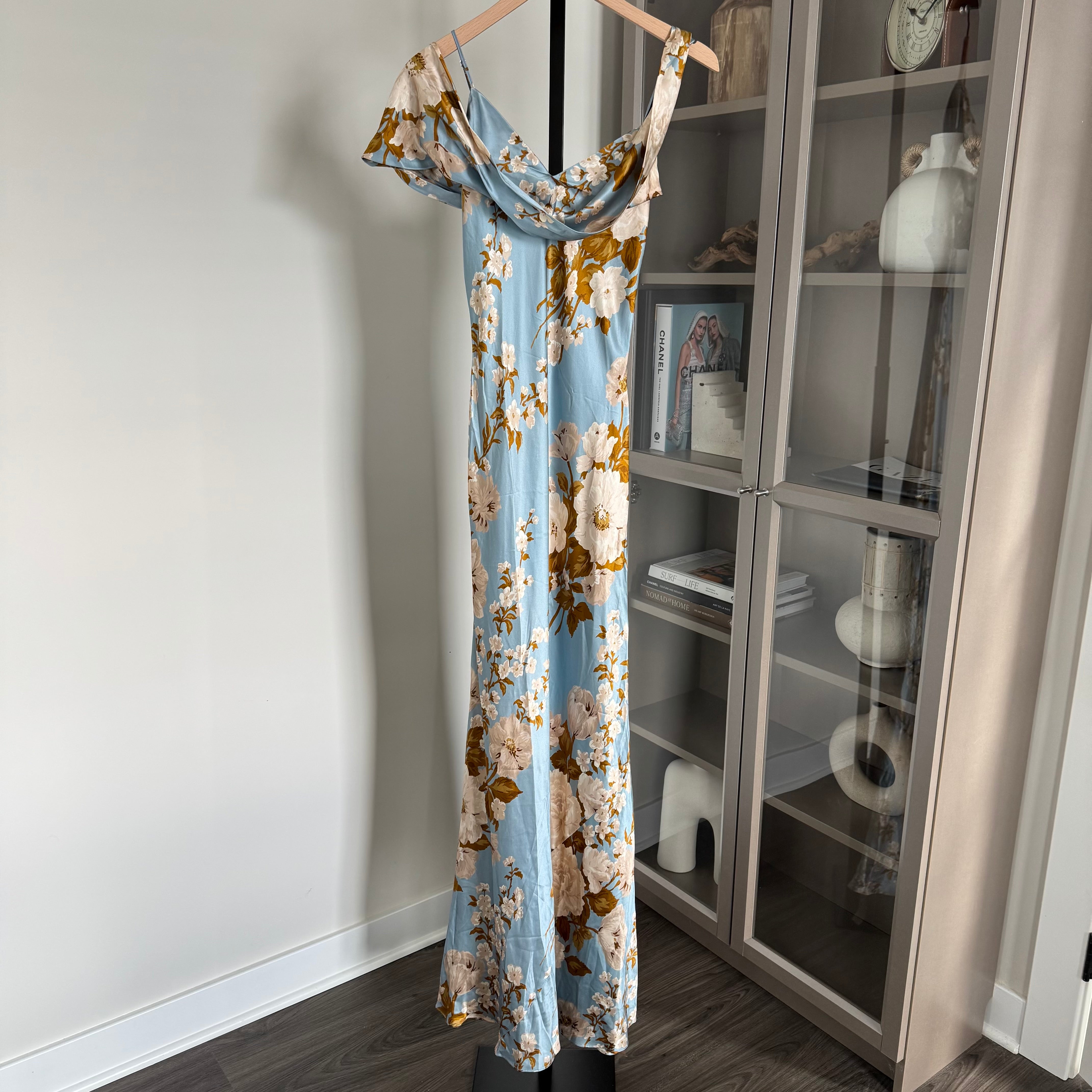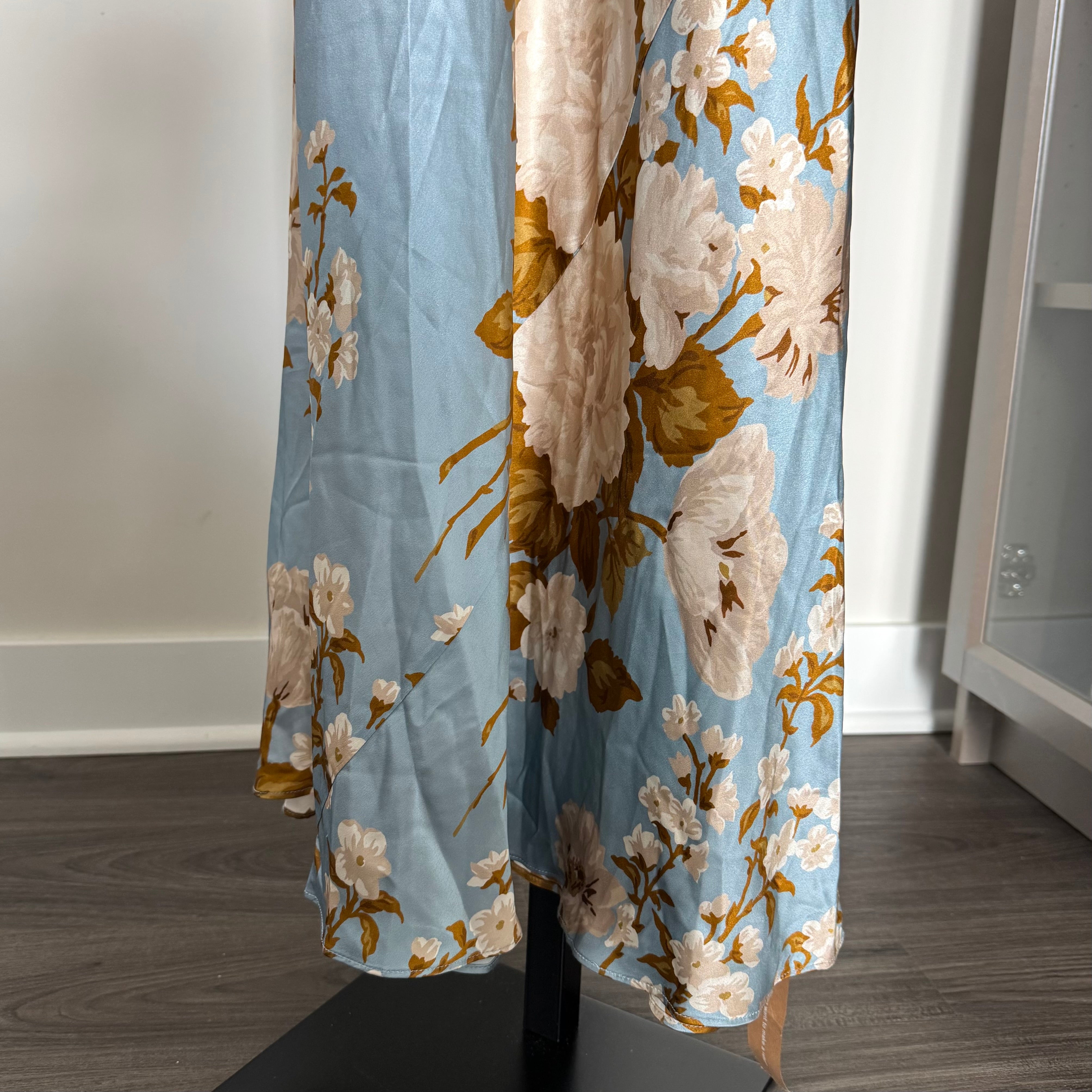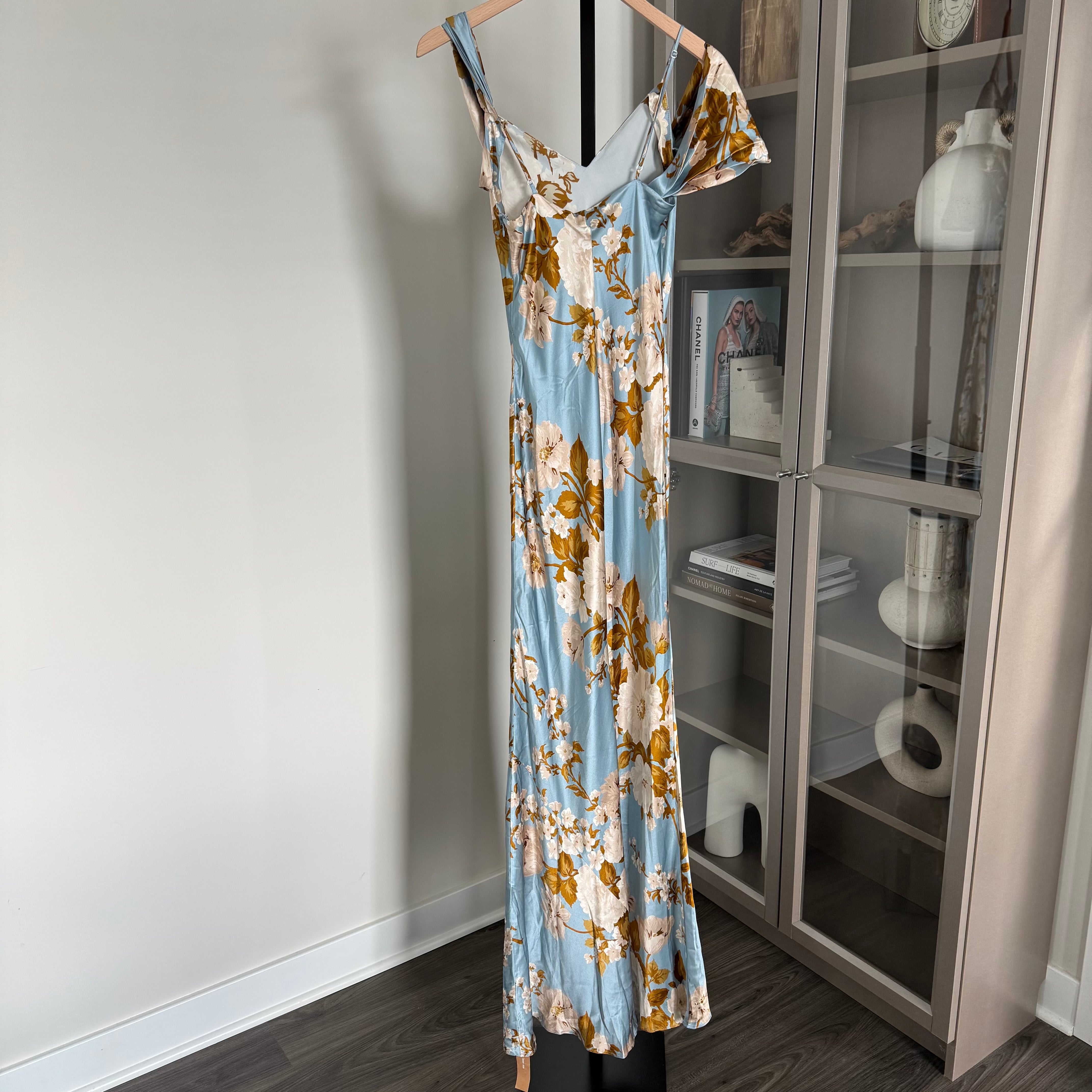 Reformation Ronda Serene Blue Brown Floral Cowl Neckline Silk Maxi Dress