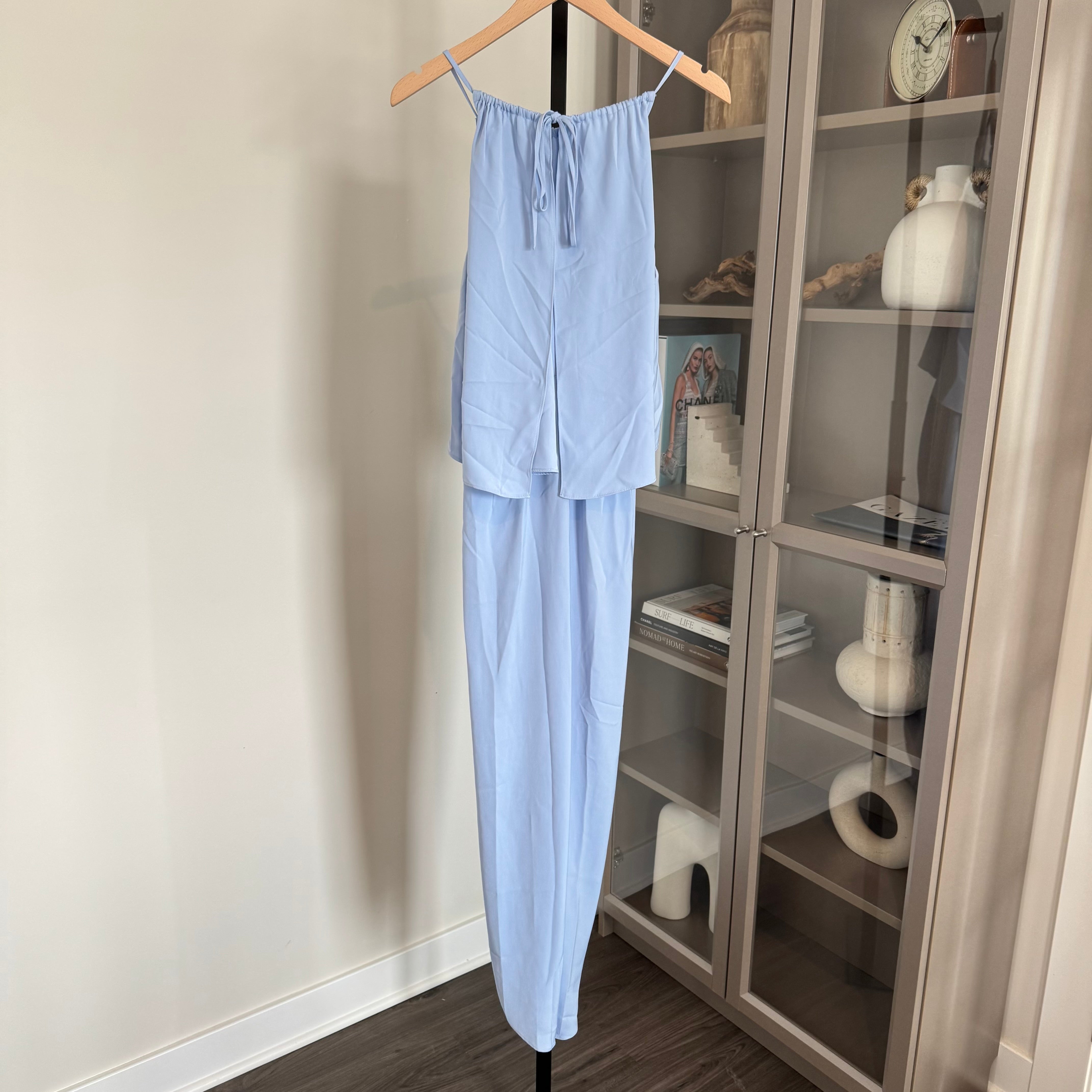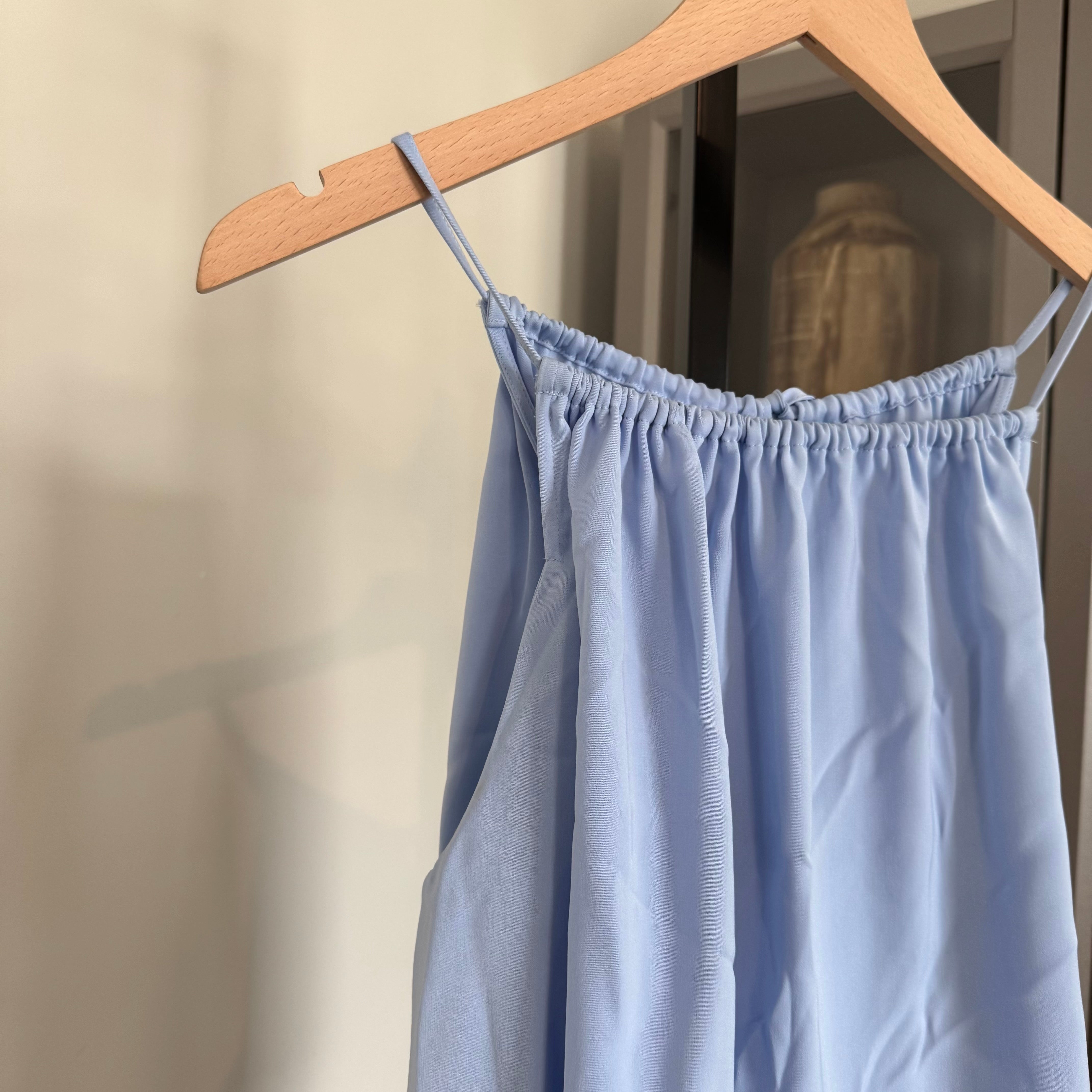 - Gathered self tie adjustable back neckline