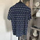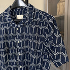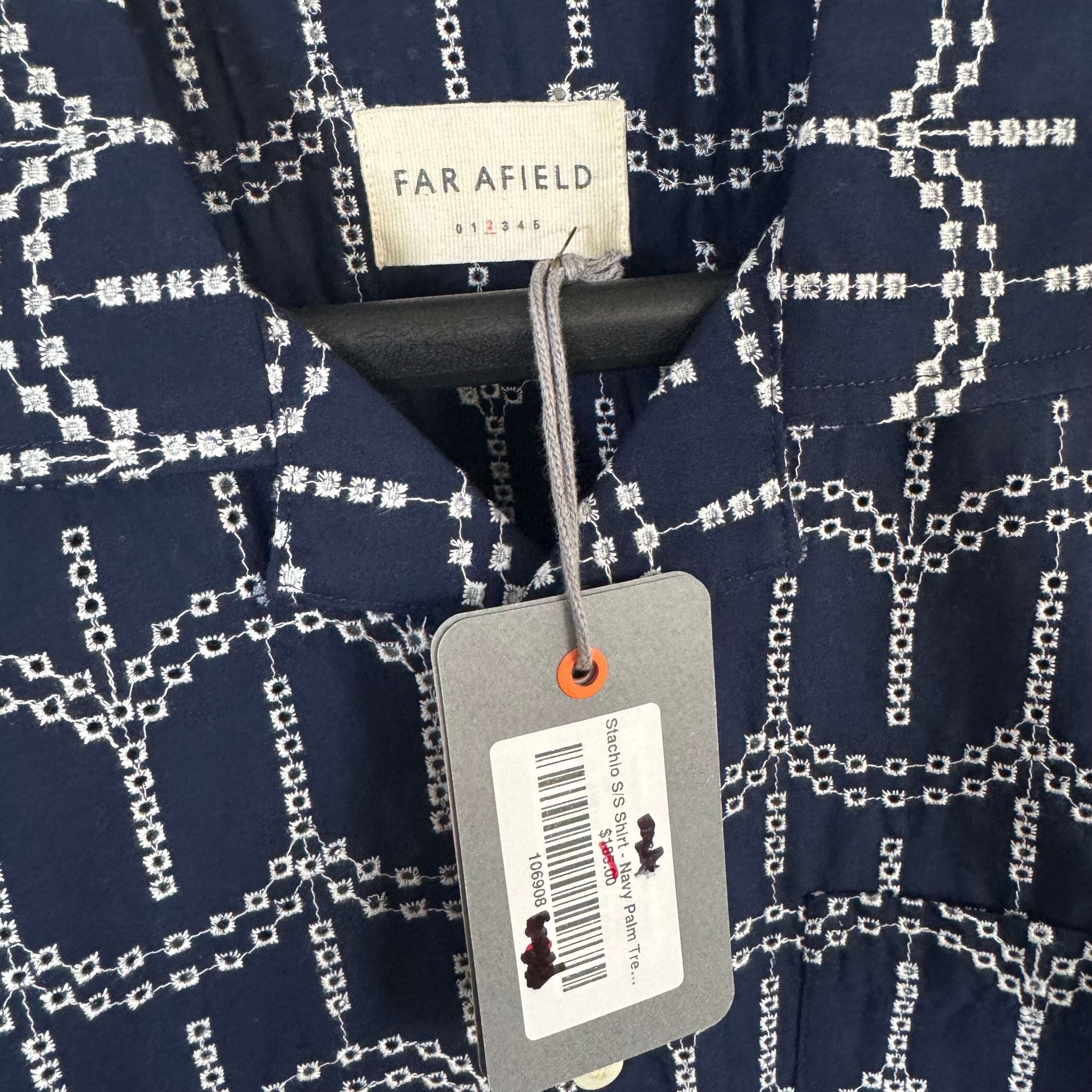 Far Afield Stachio Navy White Pin Dot Palm Tree Short Sleeve Camp Shirt