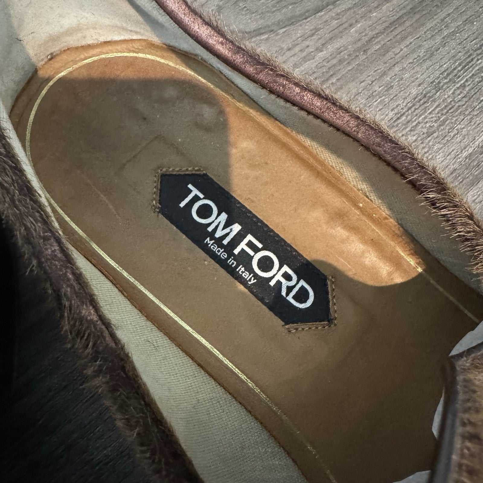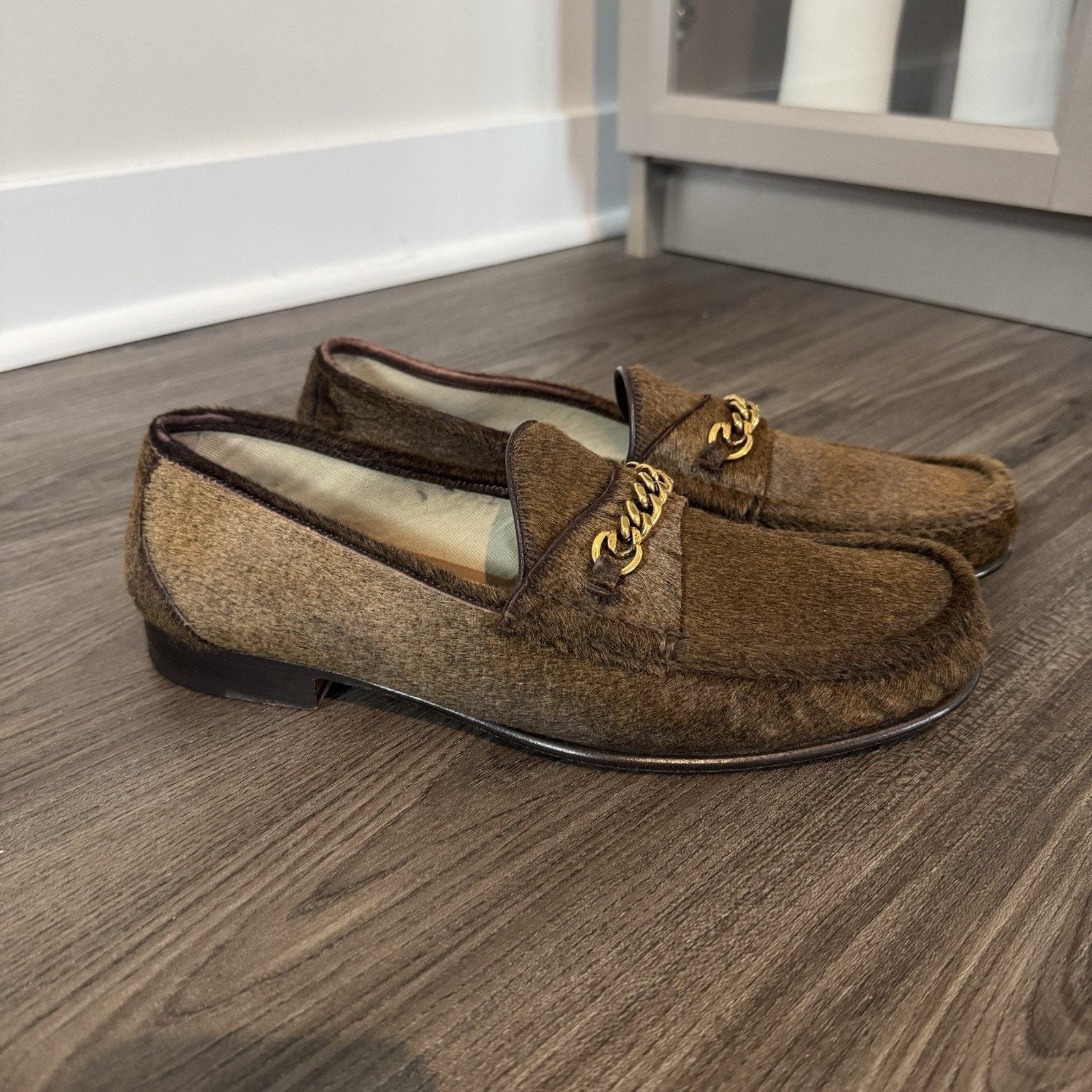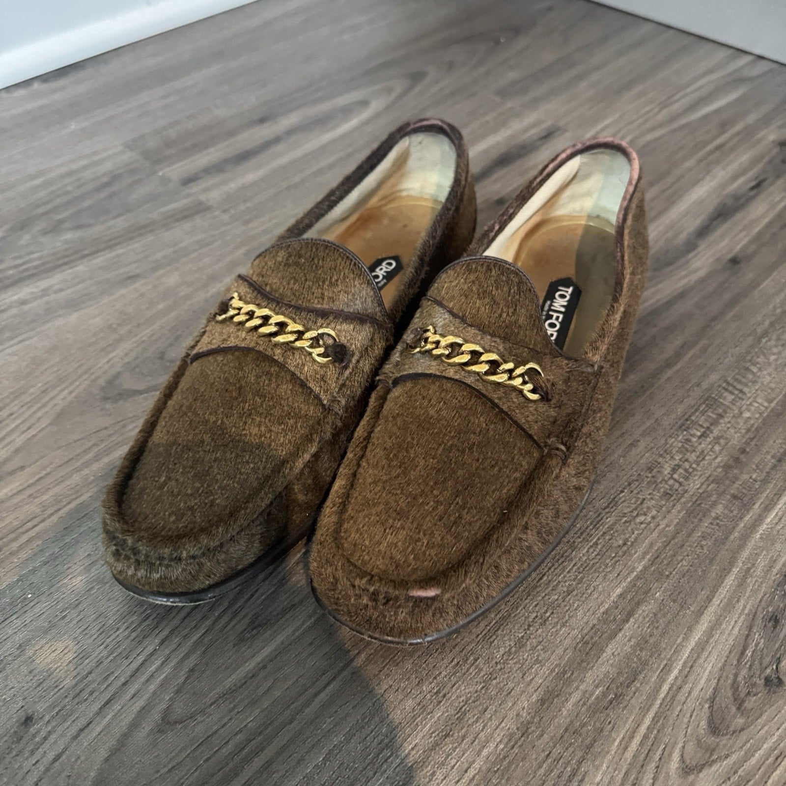 Men’s Tom Ford Brown Pony Hair Gold Tone Chainlink Moccasin Slip On Loafers