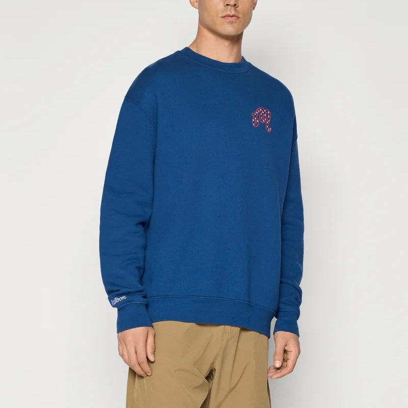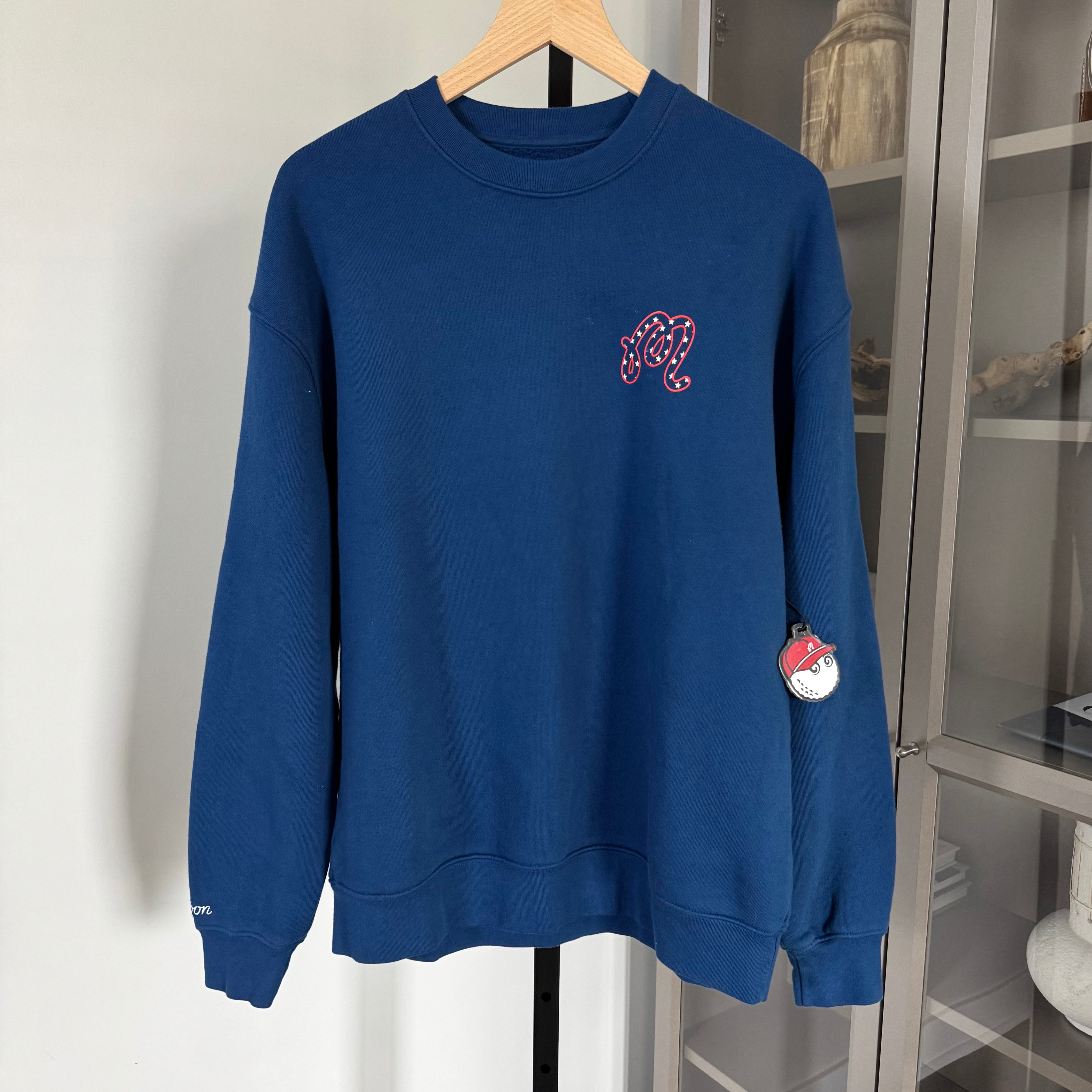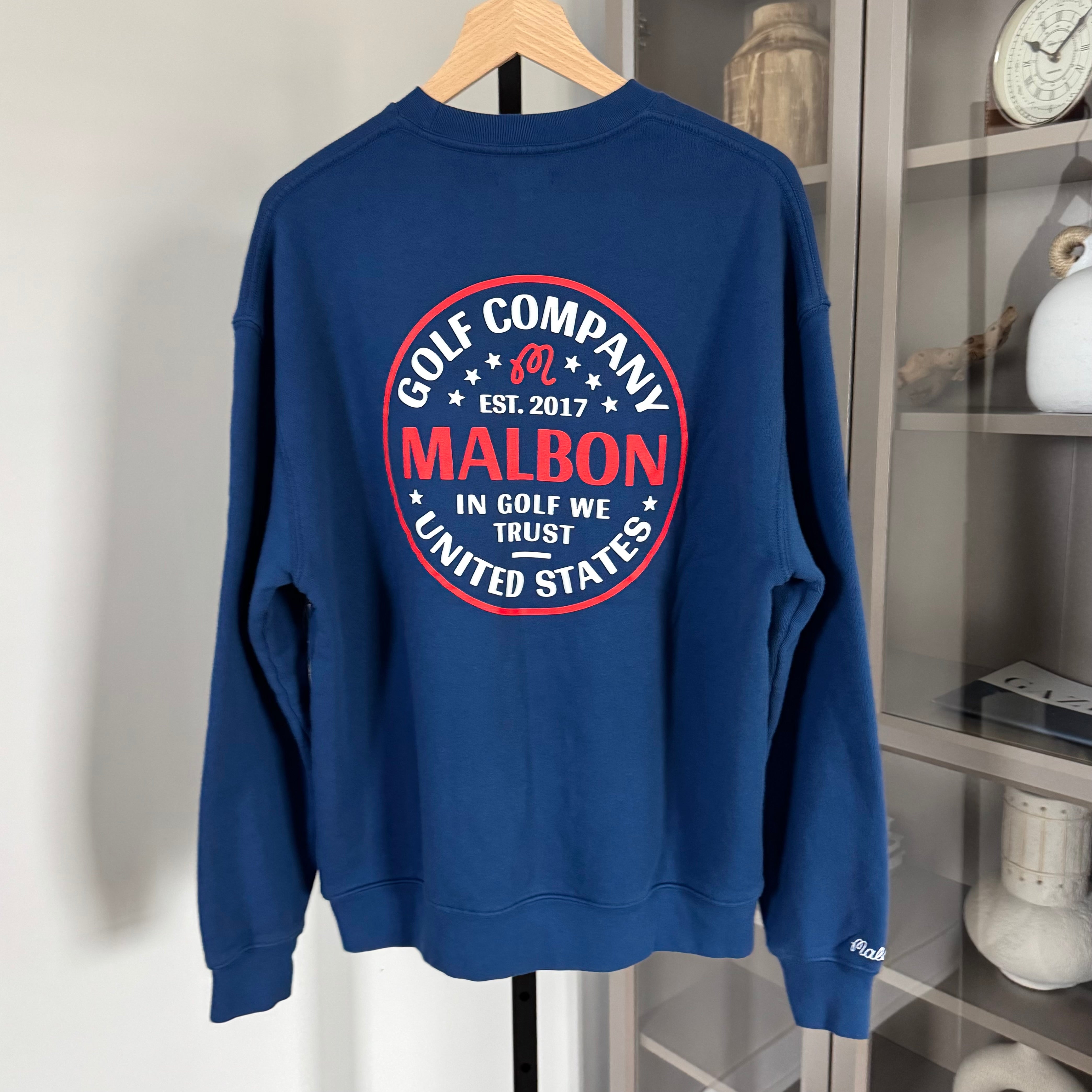 Malbon In Golf We Trust Blue Crewneck Red Script Logo Chest Sweatshirt