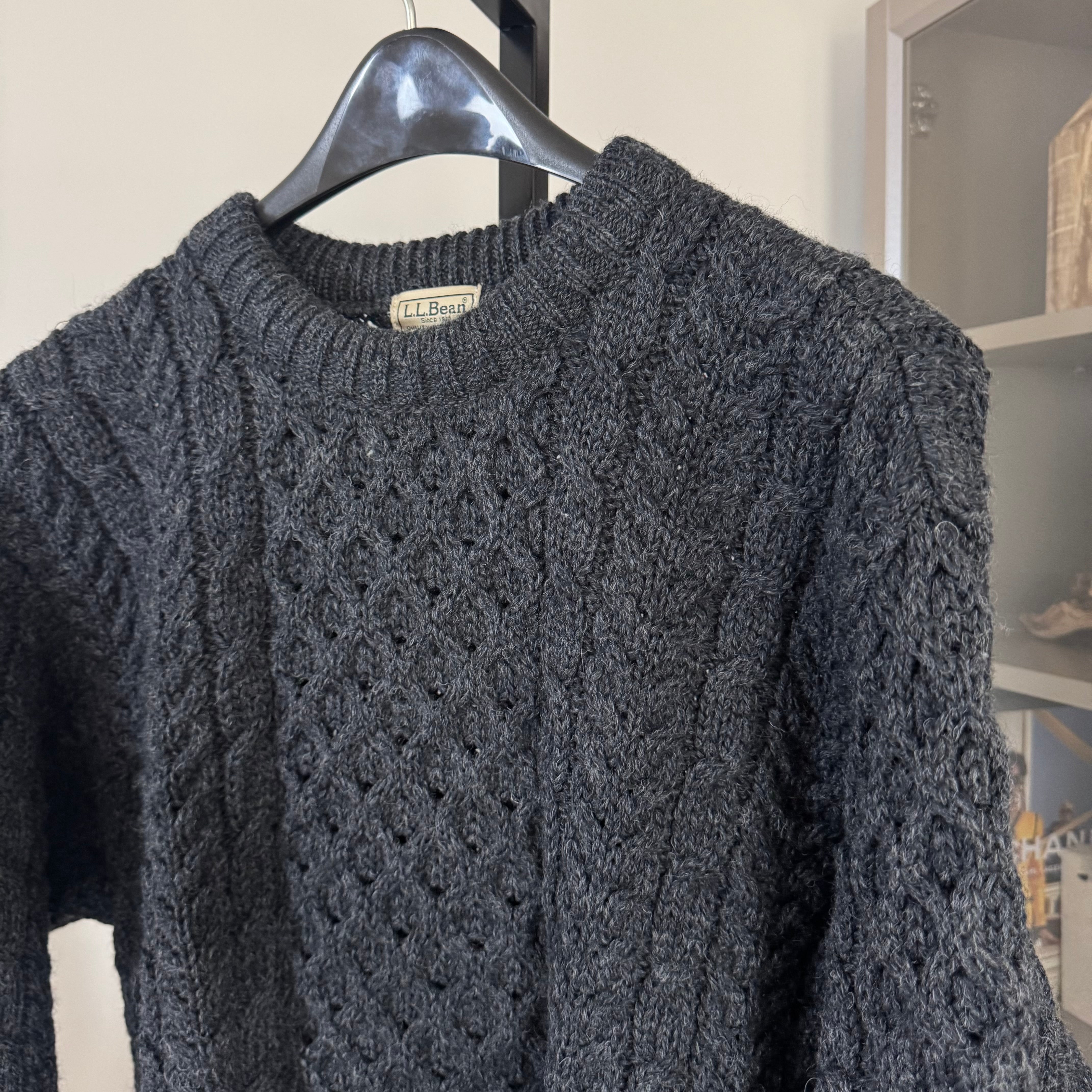 VTG L.L. Bean Wool Fisherman Cable Honeycomb Knit Charcoal Grey Sweater